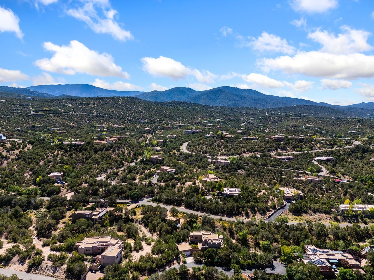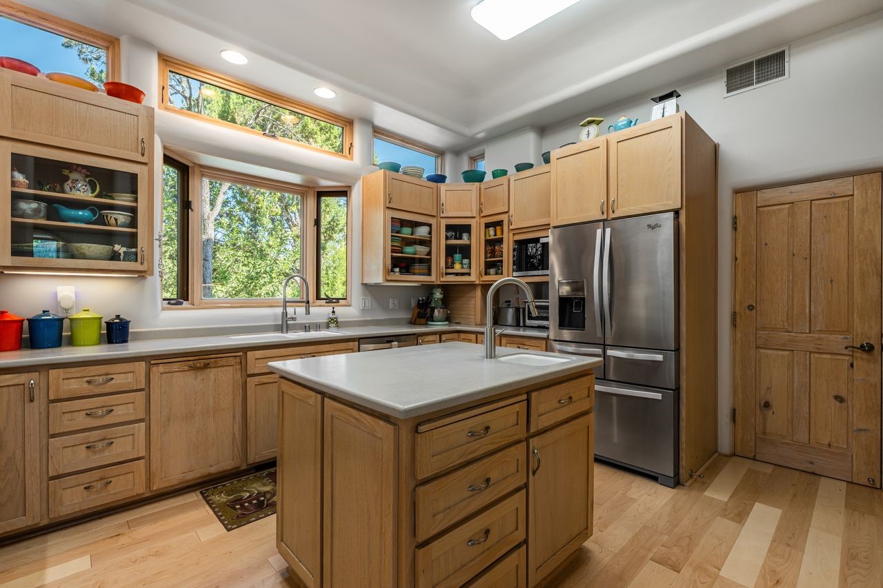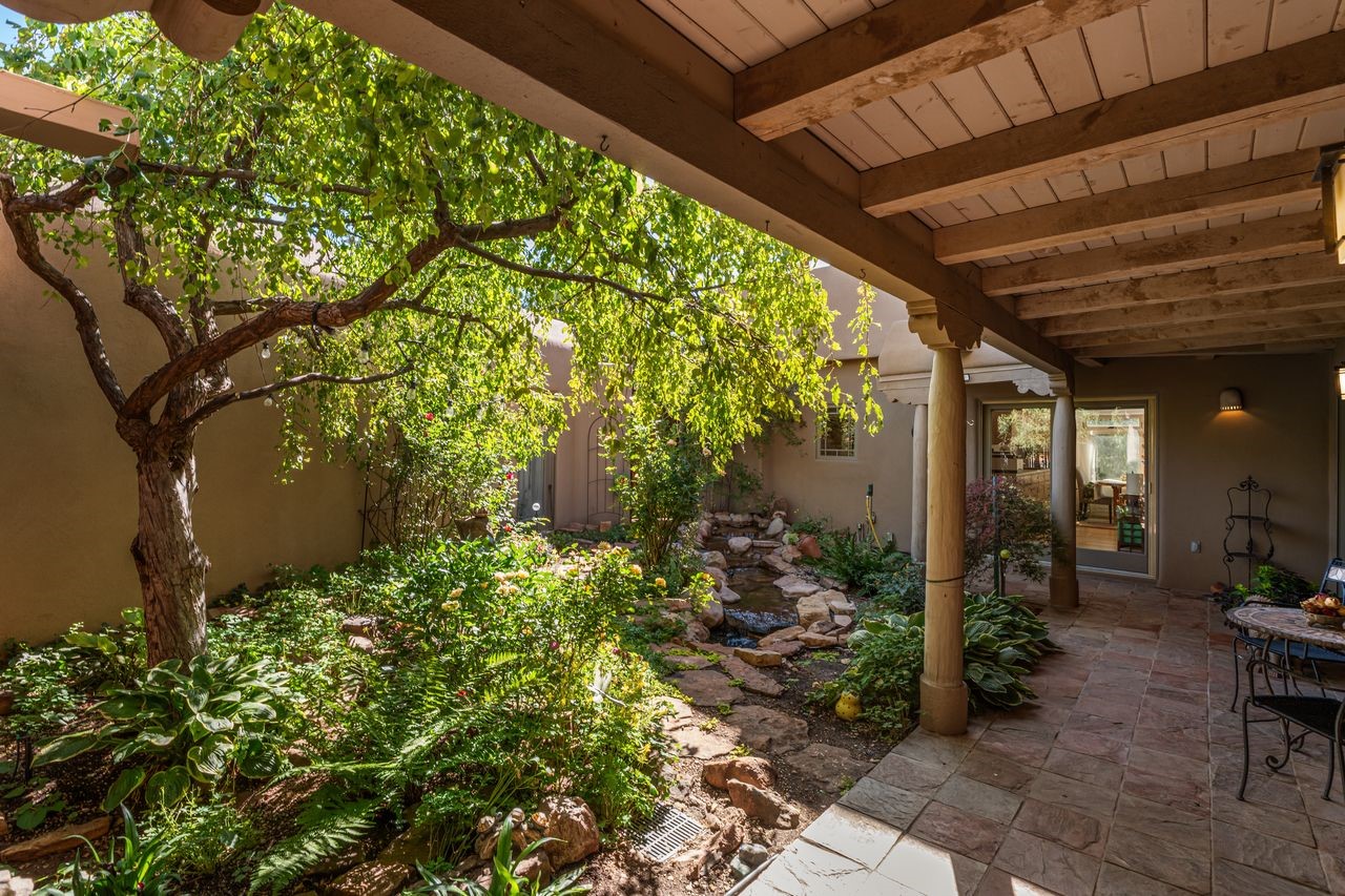 Beautifully built home overlooking the arroyo and with stellar views over downtown Santa Fe to the south! The home has a lovely private courtyard with water feature greeting you as you step in. All the living areas on the first floor: Living room, dining room, kitchen, full bathroom, and laundry room. the back of the home has a full suite that is currently being used as a working artist studio. This space is easily converted and designed to be a one-bedroom suite on the first floor. Upstairs is the primary suite with two walk-in closets and primary bath. There are two more bedrooms with a full bath. The two-car garage is off the courtyard. There are two 2nd story balconies, and lovely portal off the living room, and wonderful landscaping around the home. Bonus** full unfinished basement! Four off-street parking spots available for your guests. Please make sure you make plans to see this lovely home is Seirra Del Norte!