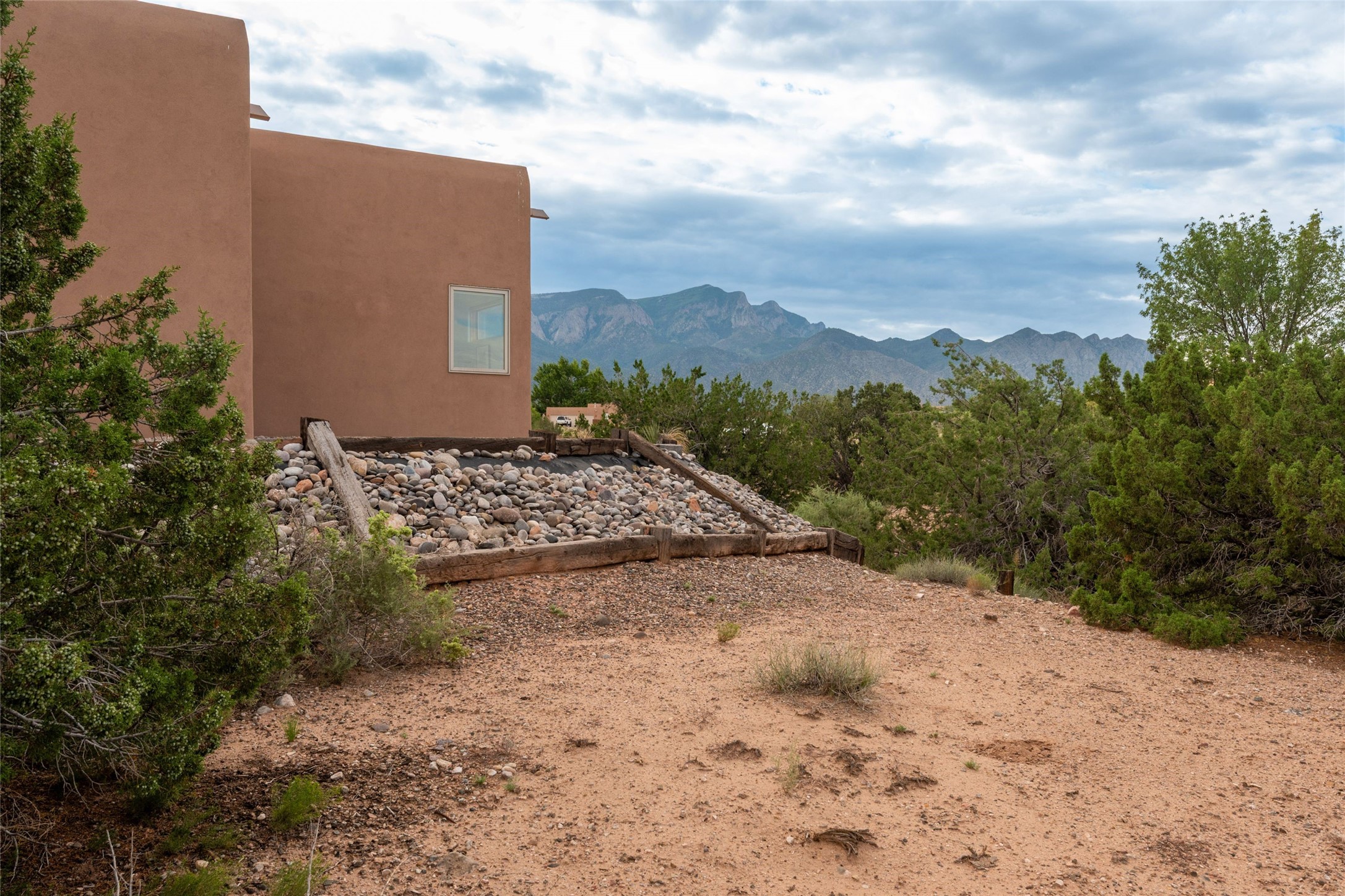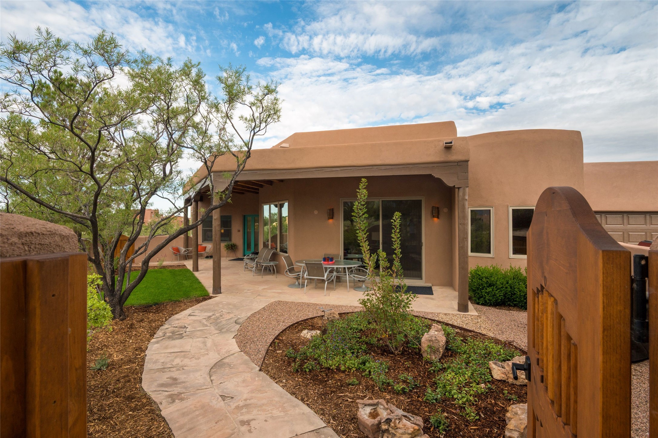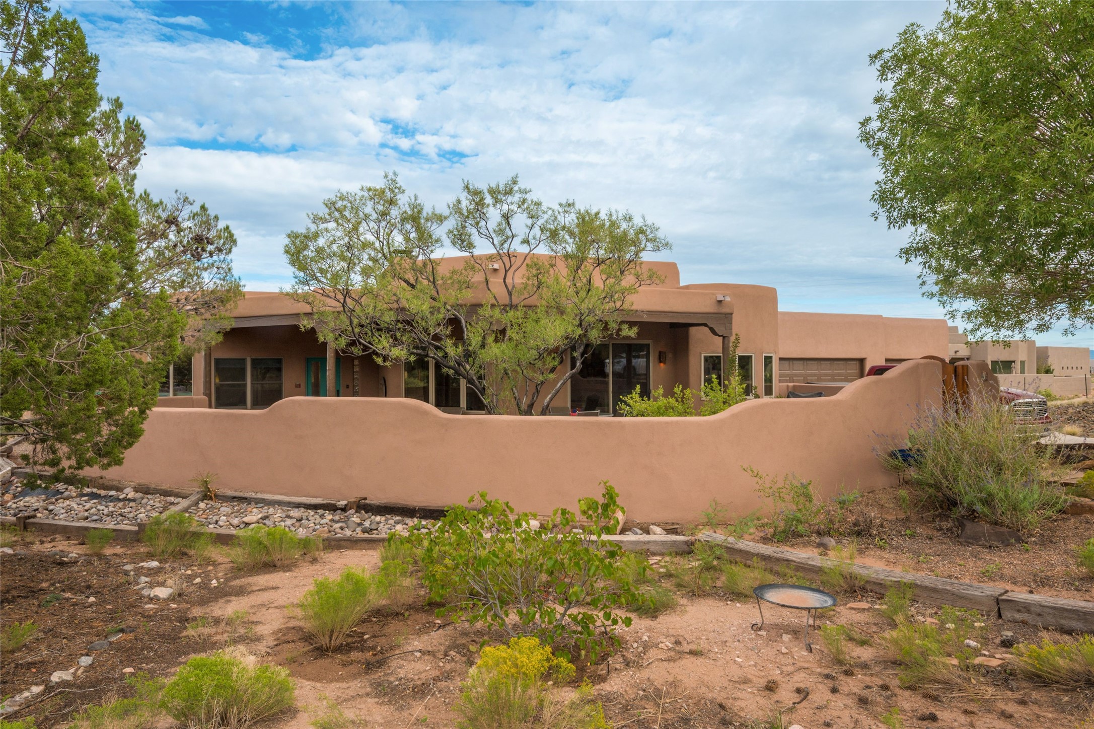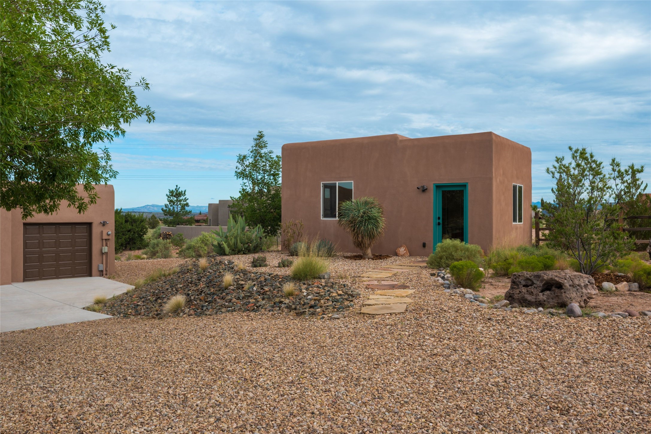 Discover the perfect Placitas home that offers peace, stunning views, charm, and an ideal location. This meticulously maintained single-level residence features 3 bedrooms and 2 bathrooms, with an updated kitchen including a Wolf cooktop. The spacious 3-car garage is ideal for parking or a workshop, and a separate 351 sq ft heated and cooled building provides versatile space as an office, studio, or craft room. Located at the end of a quiet road, it's just a 35-minute drive to Santa Fe, close to the RailRunner, grocery stores, golf, and amenities. The home boasts beautiful stone floors throughout, with brick flooring and a large walk-in closet in the primary suite. The landscaped front courtyard and covered patio offers breathtaking mountain views, perfect for relaxing and entertaining.