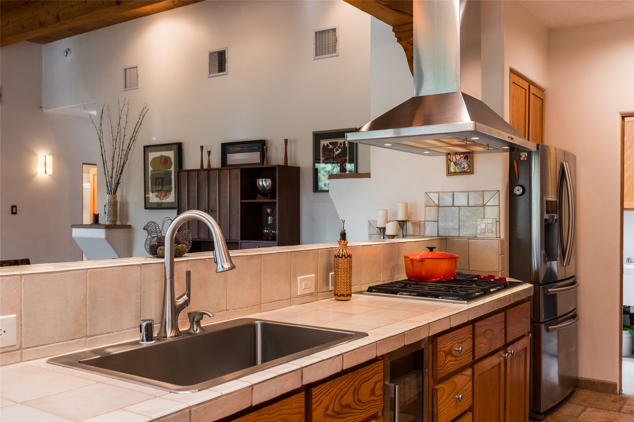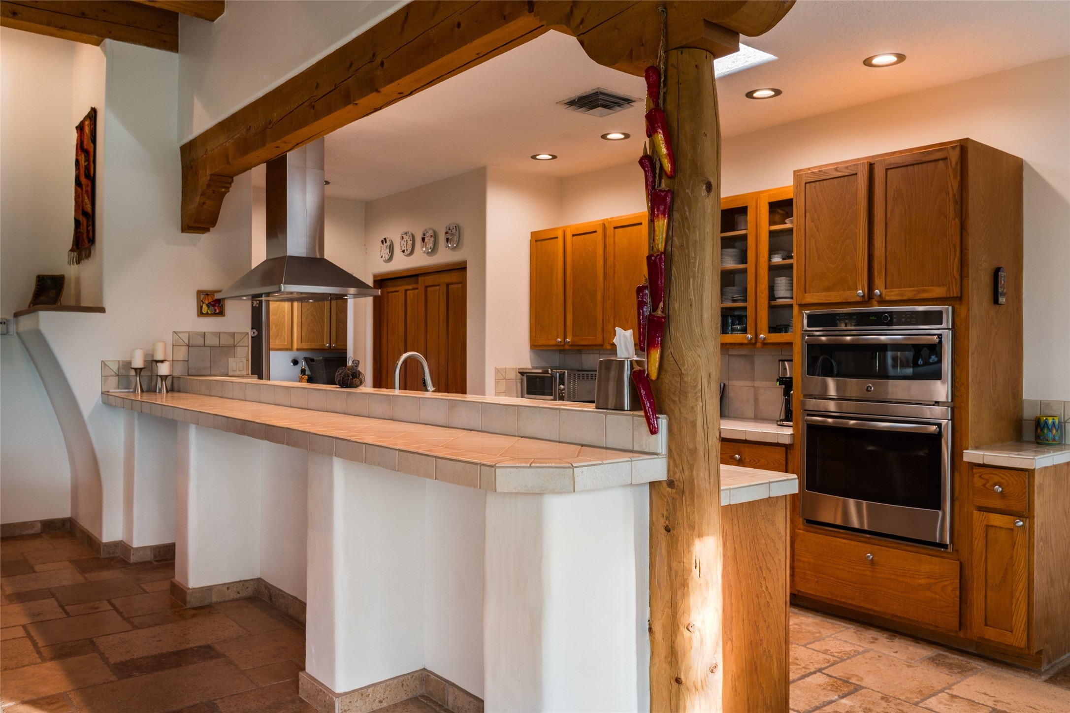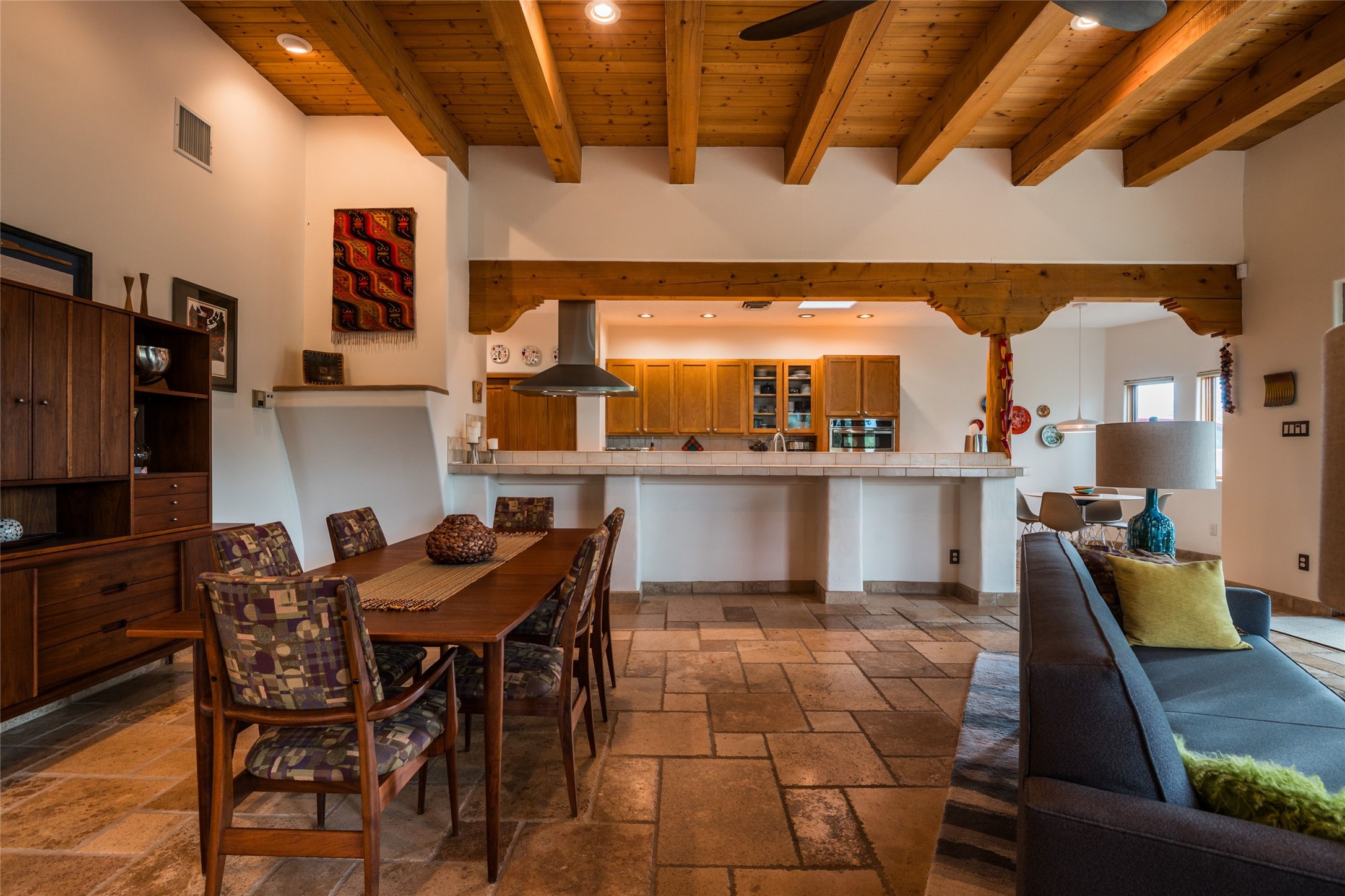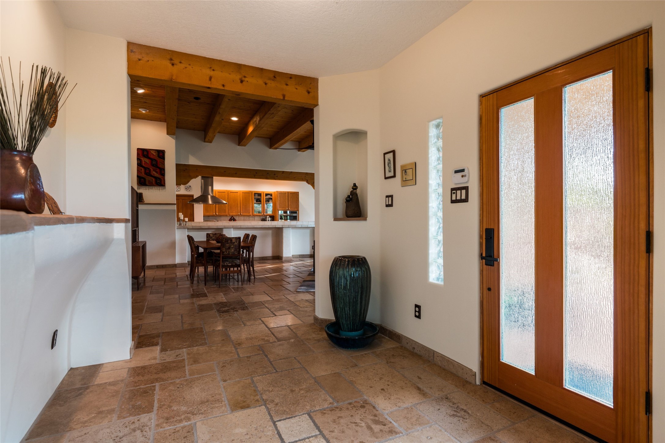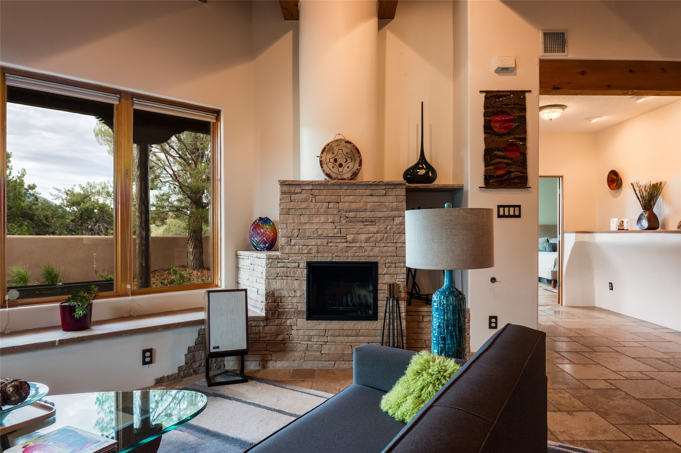 Discover the perfect Placitas home that offers peace, stunning views, charm, and an ideal location. This meticulously maintained single-level residence features 3 bedrooms and 2 bathrooms, with an updated kitchen including a Wolf cooktop. The spacious 3-car garage is ideal for parking or a workshop, and a separate 351 sq ft heated and cooled building provides versatile space as an office, studio, or craft room. Located at the end of a quiet road, it's just a 35-minute drive to Santa Fe, close to the RailRunner, grocery stores, golf, and amenities. The home boasts beautiful stone floors throughout, with brick flooring and a large walk-in closet in the primary suite. The landscaped front courtyard and covered patio offers breathtaking mountain views, perfect for relaxing and entertaining.