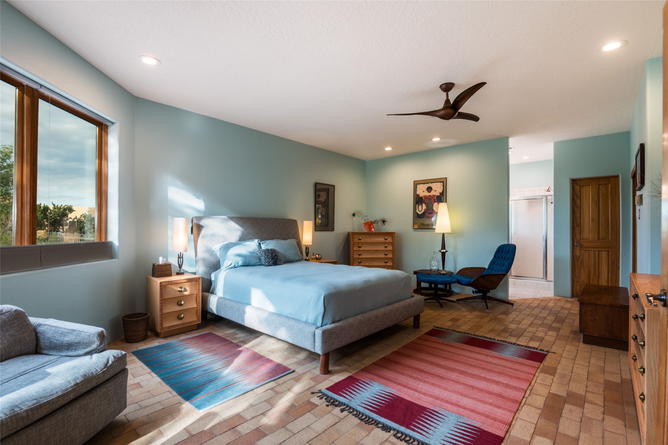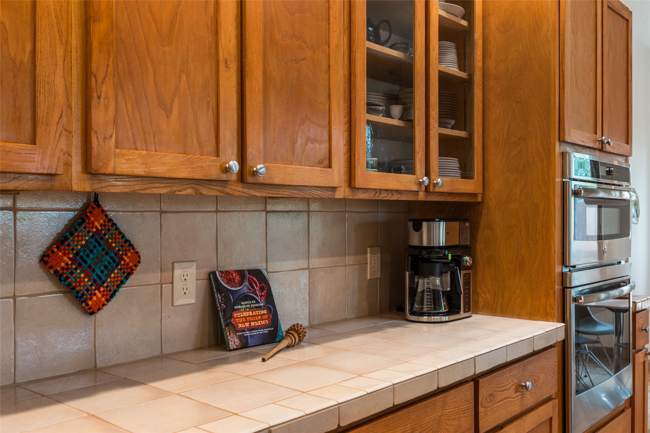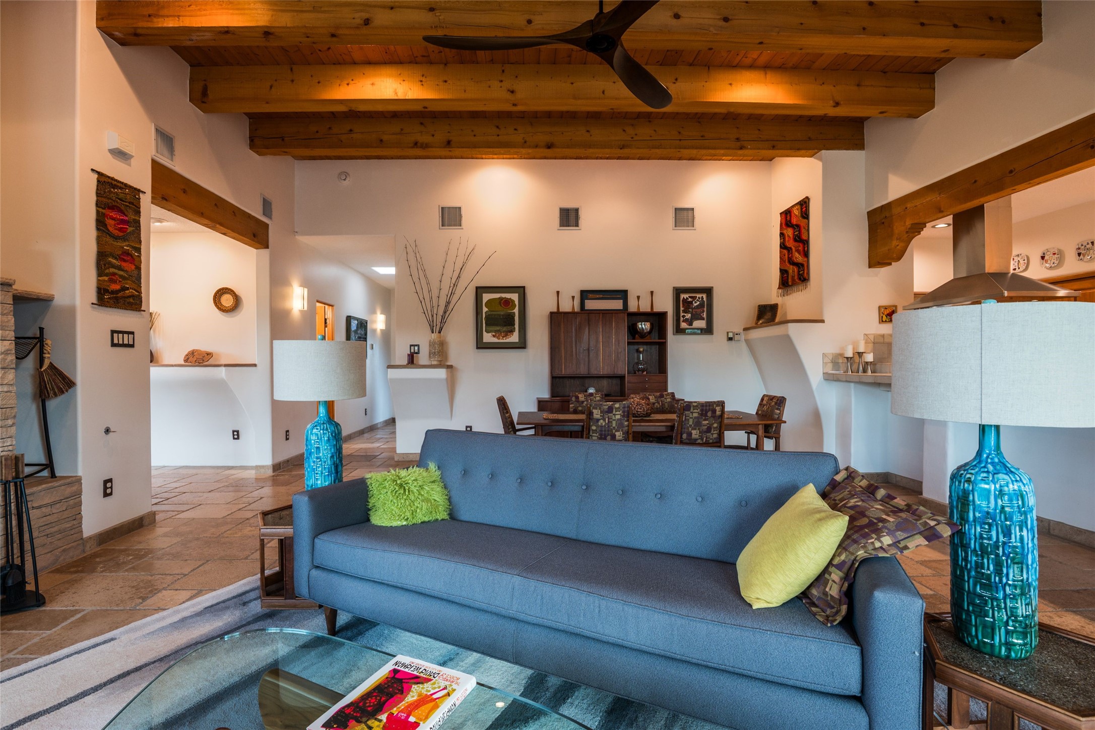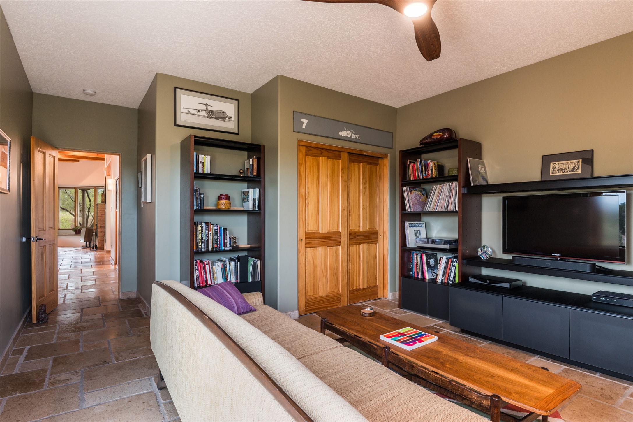 Discover the perfect Placitas home that offers peace, stunning views, charm, and an ideal location. This meticulously maintained single-level residence features 3 bedrooms and 2 bathrooms, with an updated kitchen including a Wolf cooktop. The spacious 3-car garage is ideal for parking or a workshop, and a separate 351 sq ft heated and cooled building provides versatile space as an office, studio, or craft room. Located at the end of a quiet road, it's just a 35-minute drive to Santa Fe, close to the RailRunner, grocery stores, golf, and amenities. The home boasts beautiful stone floors throughout, with brick flooring and a large walk-in closet in the primary suite. The landscaped front courtyard and covered patio offers breathtaking mountain views, perfect for relaxing and entertaining.