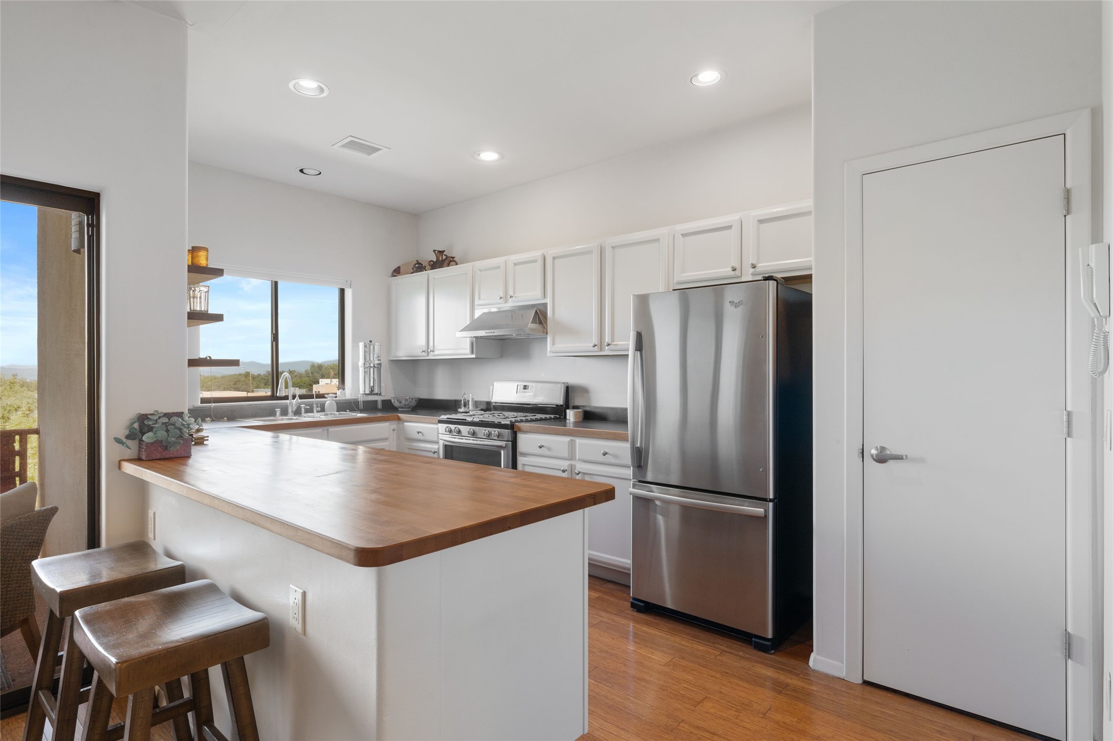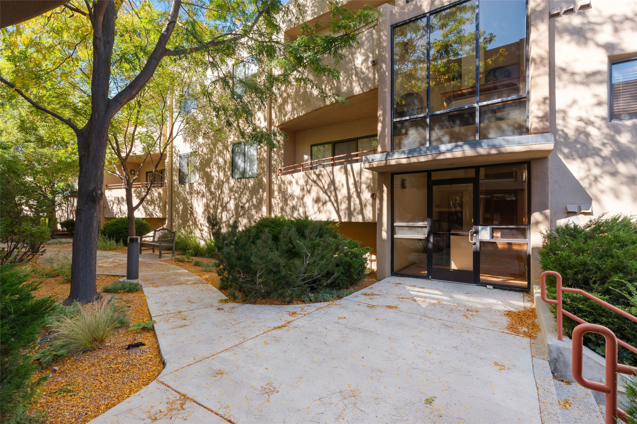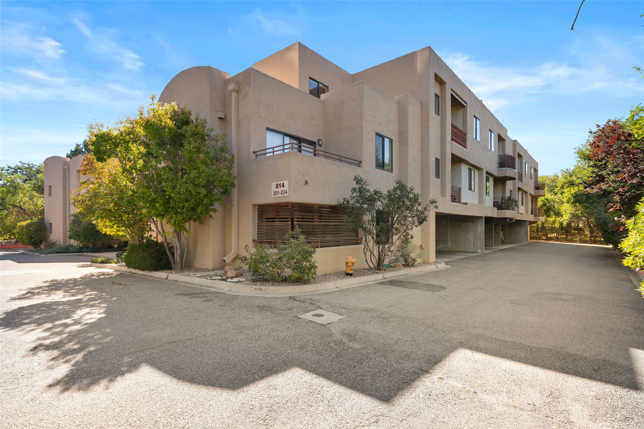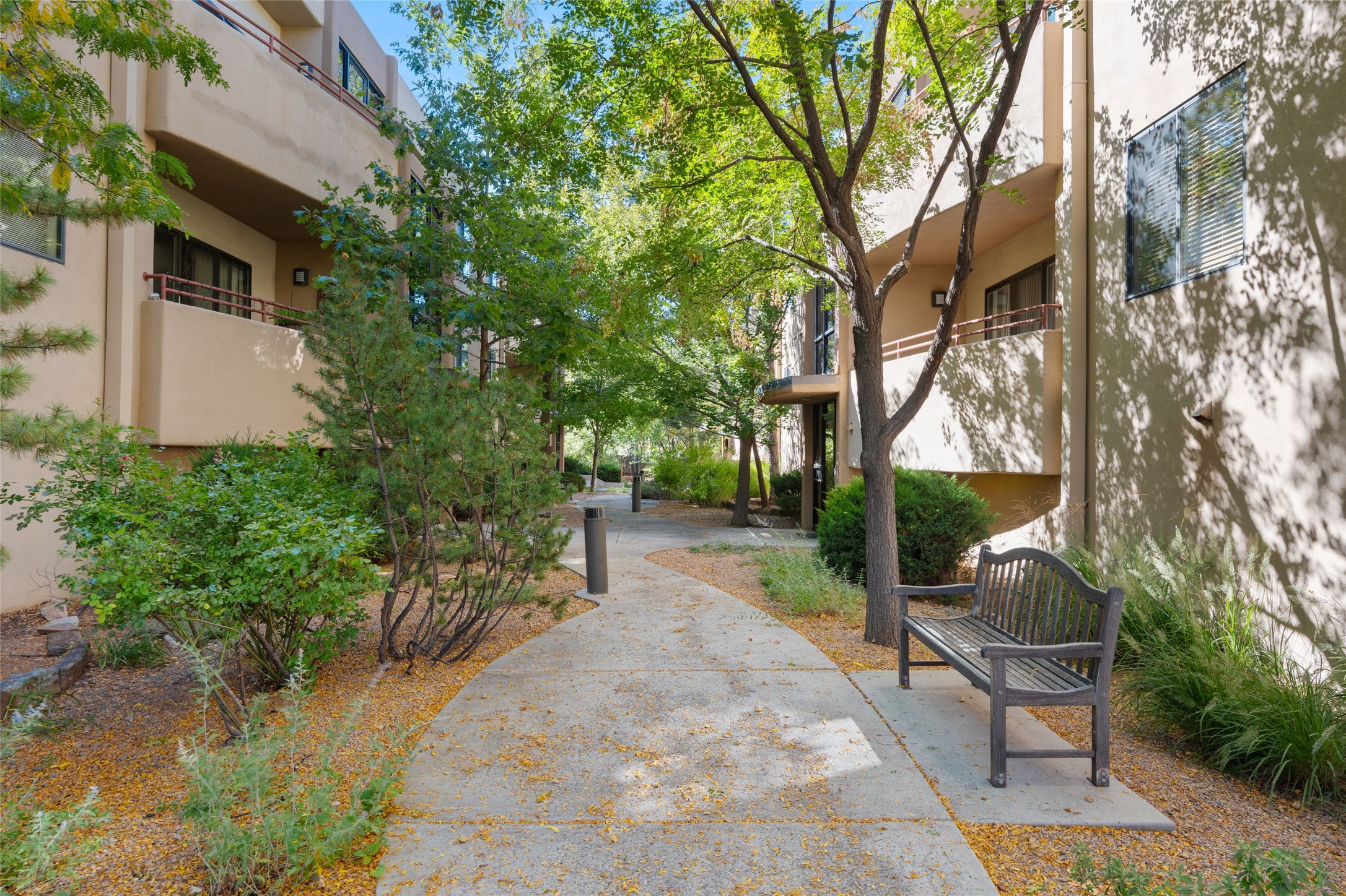 Classic urban oasis surrounded by mature trees, La Remuda Condominium is located on the edge of Midtown where you can walk to relaxed eateries featuring global cuisine and local flair. Not far from theRailyard, quick stops to Trader Joe's and Whole Foods. The central location is convenientfor a fast commute to Los Alamos or I-25. This bright and airy condo features an open floor plan with sliding glass doors at each end of the living/dining rooms with access to the 2 balconies. The kitchen is well designed, with exceptional storage, high quality stainless steel appliances, butcher block on one side of the counter and Italian tile on the other. Other features include: central air conditioning and heating installed in 2023, 9 foot ceilings, beautiful bamboo floors, custom drapes, custom dividedclosets, custom cabinets in living room and office, private storage: 5.5' x 17', Asko washer and dryer, whole house water filtration system installed in 2025, 2 under cover designated parking spots with direct entrance to the secure building, upper floor unit with no interior steps, new roof in 2024 and refreshed stucco in 2025. One of the two only units at La Remuda with 3 bedrooms. This condo is on the second floor and stairs are required to access it.