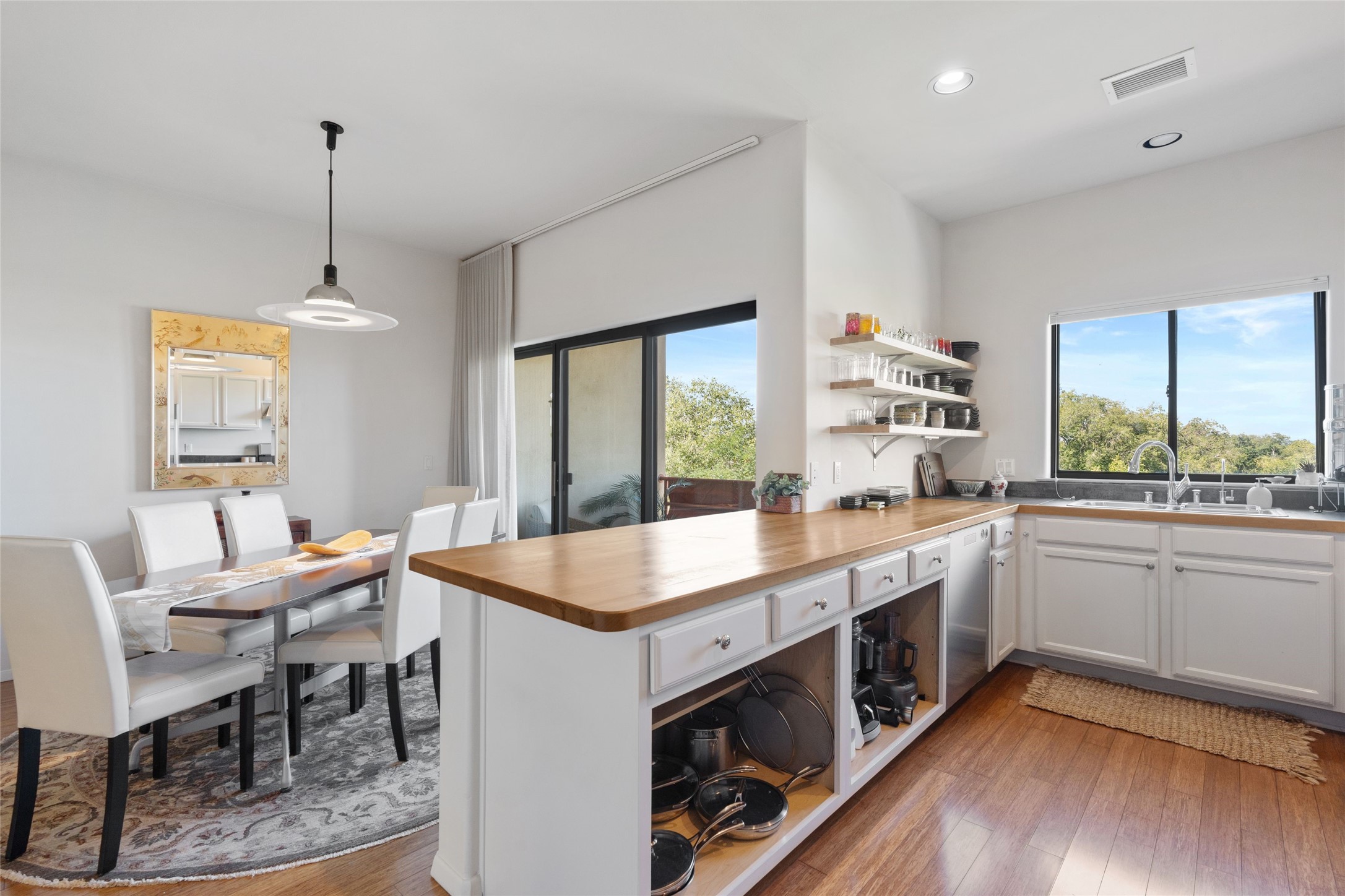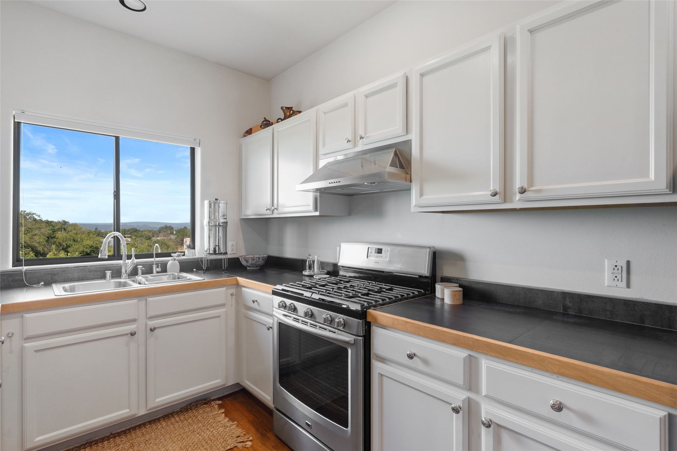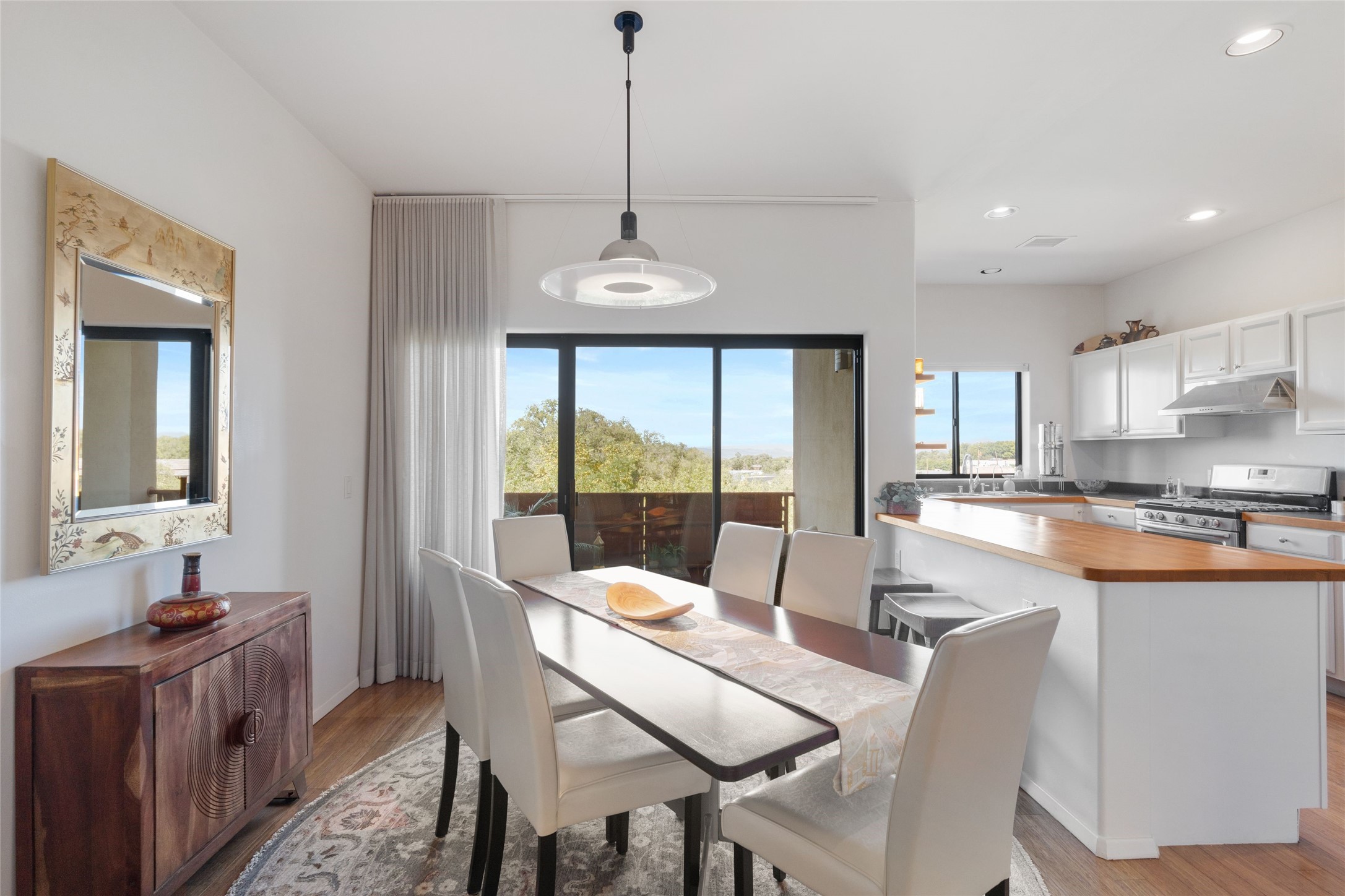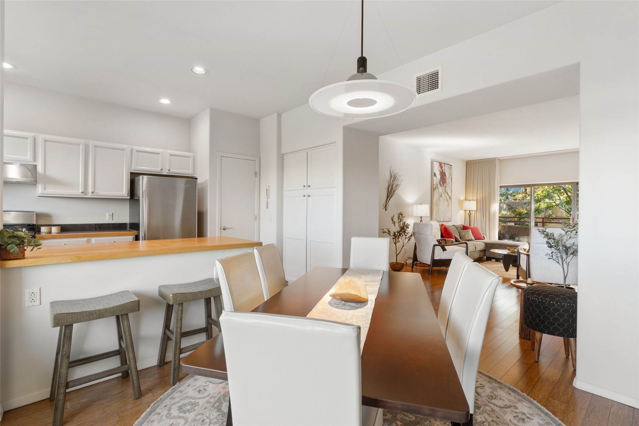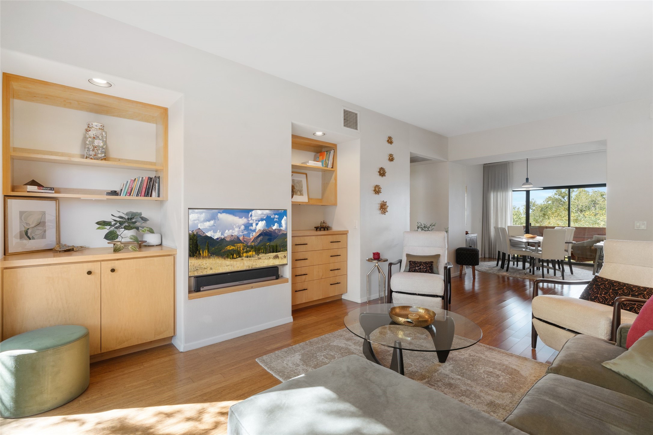 Classic urban oasis surrounded by mature trees, La Remuda Condominium is located on the edge of Midtown where you can walk to relaxed eateries featuring global cuisine and local flair. Not far from theRailyard, quick stops to Trader Joe's and Whole Foods. The central location is convenientfor a fast commute to Los Alamos or I-25. This bright and airy condo features an open floor plan with sliding glass doors at each end of the living/dining rooms with access to the 2 balconies. The kitchen is well designed, with exceptional storage, high quality stainless steel appliances, butcher block on one side of the counter and Italian tile on the other. Other features include: central air conditioning and heating installed in 2023, 9 foot ceilings, beautiful bamboo floors, custom drapes, custom dividedclosets, custom cabinets in living room and office, private storage: 5.5' x 17', Asko washer and dryer, whole house water filtration system installed in 2025, 2 under cover designated parking spots with direct entrance to the secure building, upper floor unit with no interior steps, new roof in 2024 and refreshed stucco in 2025. One of the two only units at La Remuda with 3 bedrooms. This condo is on the second floor and stairs are required to access it.