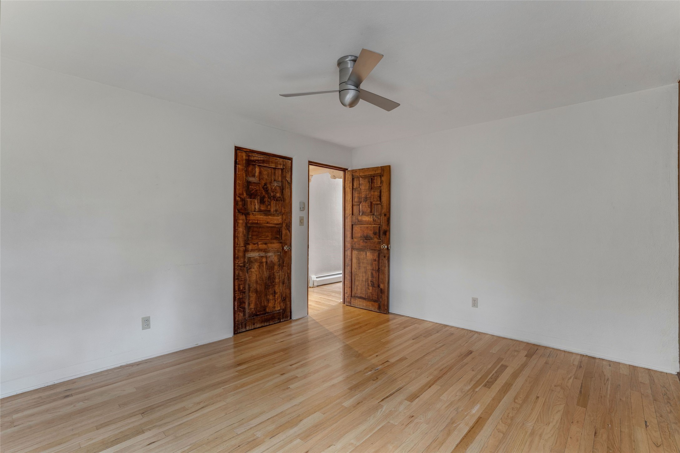 South Capital Gem with Modern Upgrades and Timeless Charm. This beautifully maintained single-level home blends classic Santa Fe character with thoughtful modern updates. The brand-new modern kitchen features sleek finishes and opens seamlessly to a spacious dining area with a classic wood-burning fireplace, creating a warm and inviting atmosphere for gatherings. Natural light fills the home through the charming wood sunroom, leading into a generous living area perfect for relaxing or entertaining. The primary suite offers a private retreat with an additional flex room ideal for an office or reading nook, along with a stylish bath featuring a stone countertop. A comfortable guest bedroom and library or media room share a beautifully updated three-quarter bath. Outside, enjoy the shady front lawn, covered porch, and private backyard surrounded by mature fruit trees and lush vegetation, offering both privacy and a tranquil garden setting. Solar panels provide energy efficiency and long-term savings. Located in one of Santa Fe's most desirable neighborhoods, this home offers peace and quiet while being just minutes from the Plaza, restaurants, and galleries. Classic style meets modern living in this South Capital treasure.