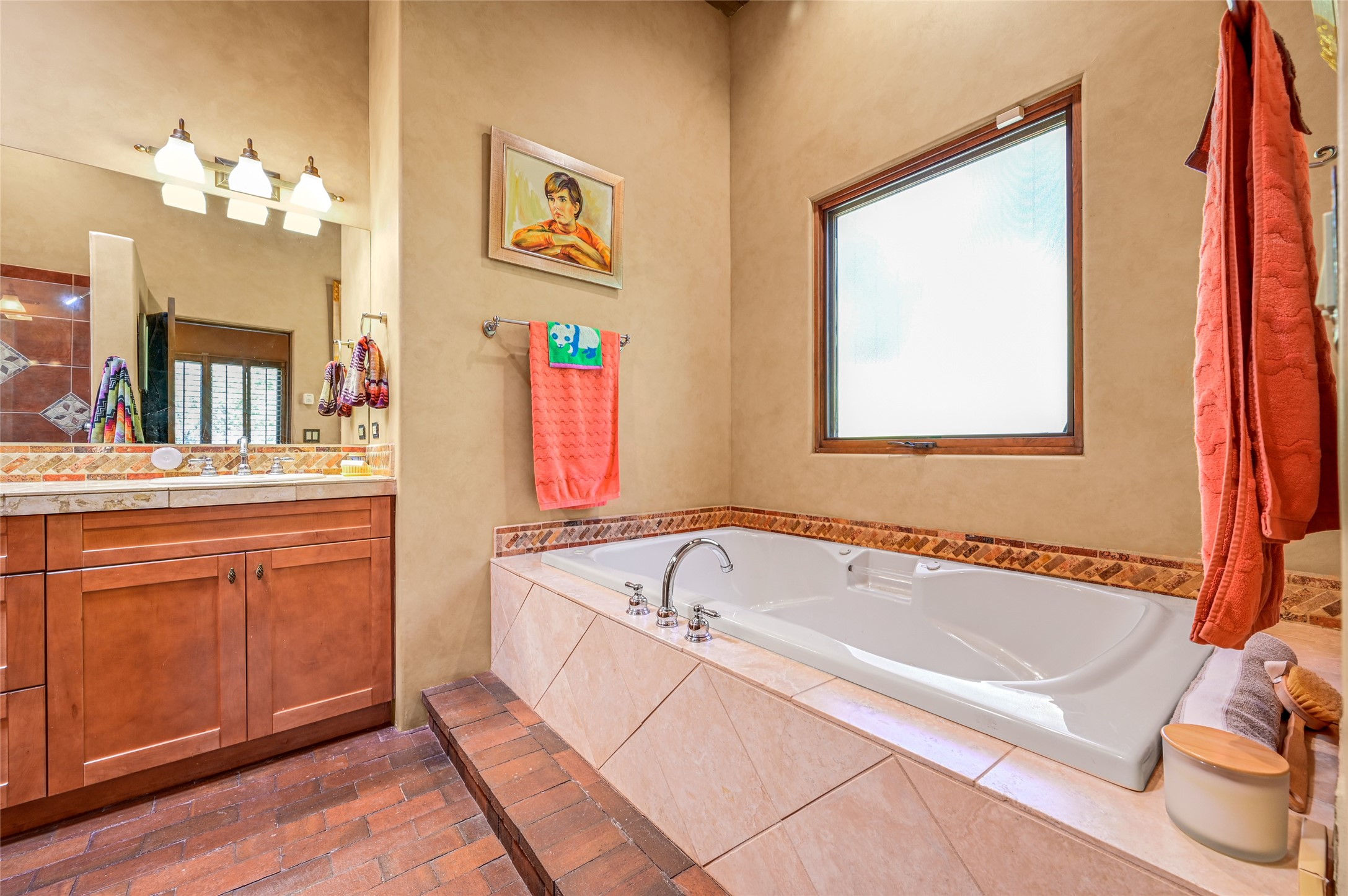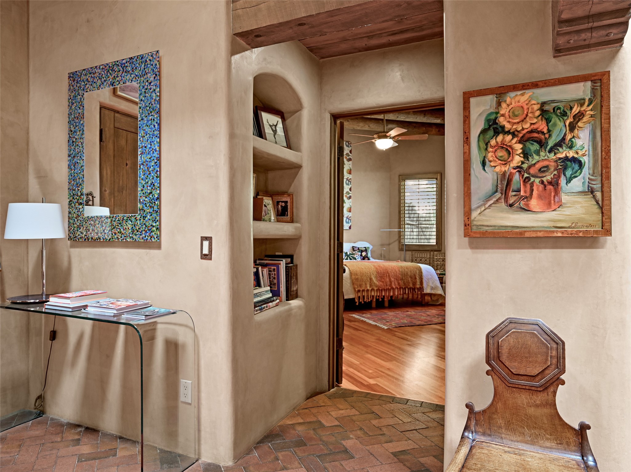 A sophisticated single level home on Santa Fe's Northside. Nestled on a generous lot just minutes from the plaza, this 4 bedroom home boasts high ceilings with brick and wood floors. The 3 bathrooms include a generous soaking tub and steam shower. The gourmet kitchen is large with a breakfast sitting area, high end appliances and ample storage for the cook in the family. 2 fireplaces and diffused natural light are not only attractive, but make for light and bright living spaces. The outdoor living features a private patio and Jacuzzi hot tub. The grounds are professionally landscaped and the backyard is fully enclosed. This home has an attached 2 car garage.