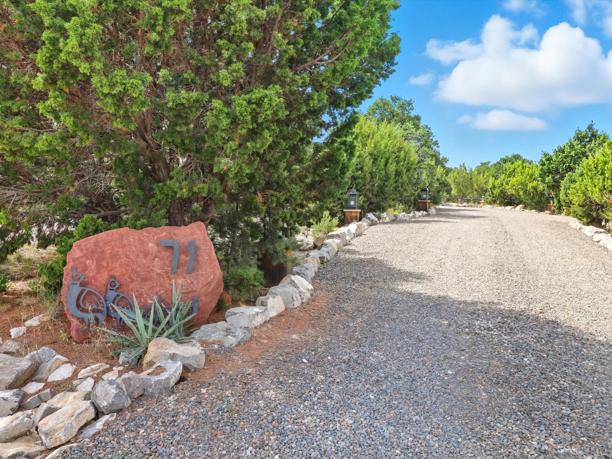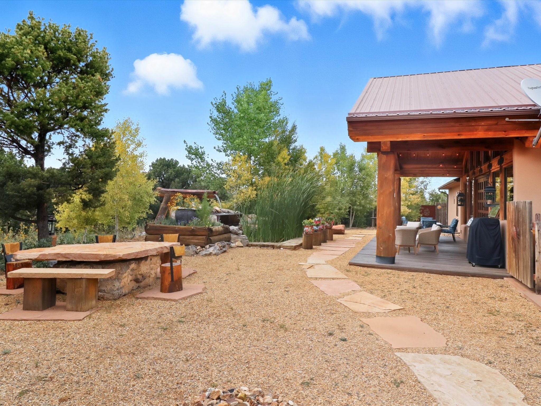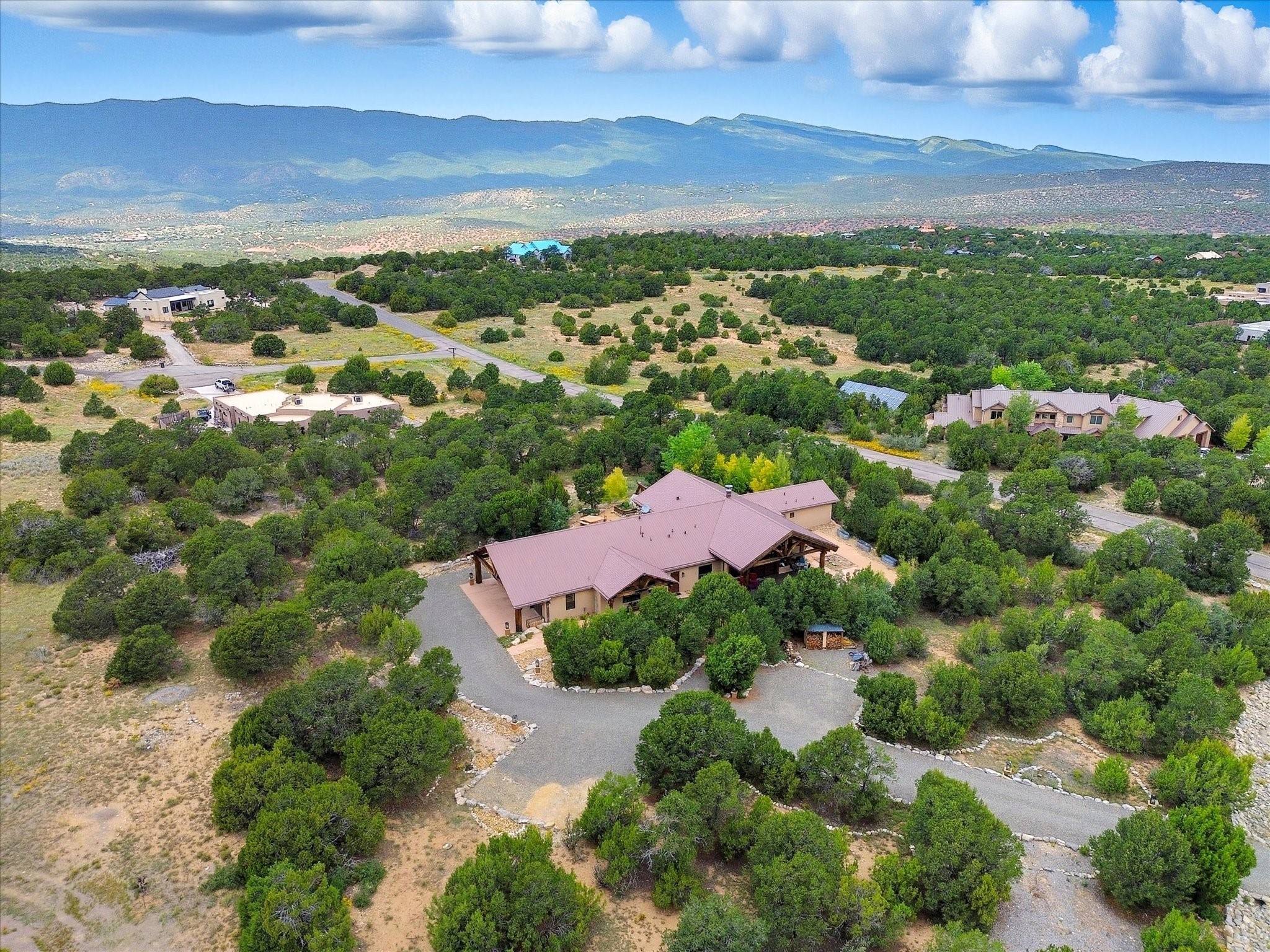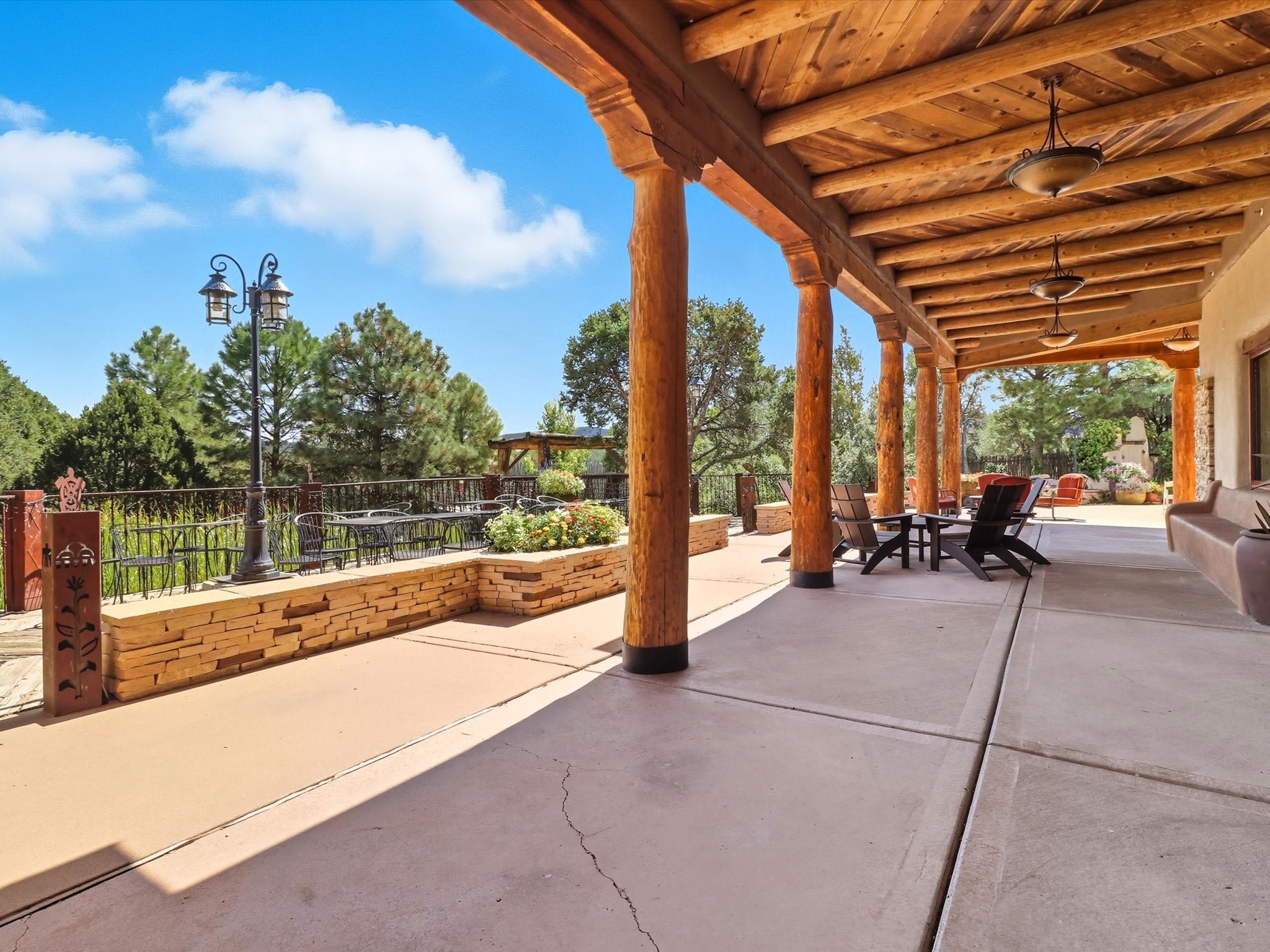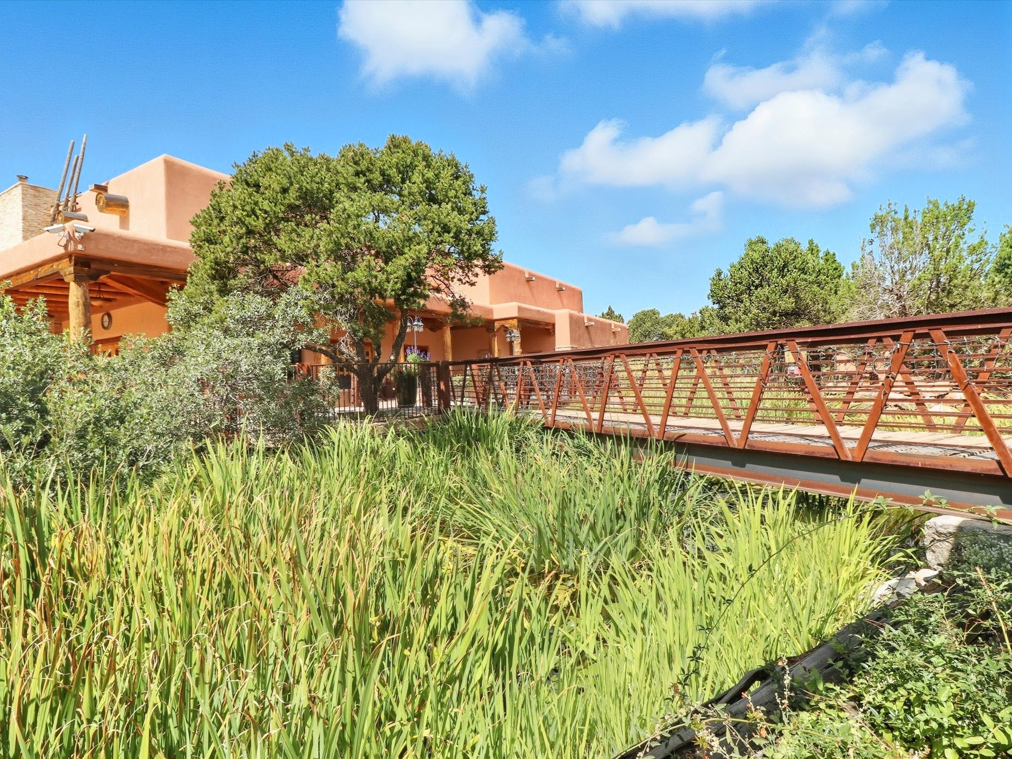 Country Lodge-Style Home in Gated CommunityCasually elegant lodge-style home in a country setting, designed to highlight 4 seasons with walls of windows, 20-foot wood ceilings, and massive trusses in the great room. Two living areas are divided by a two-way stacked stone fireplace, with a striking water feature inside the front entry.Interior features include concrete radiant-heated floors, wood vigas, and a chef's kitchen with 2 ranges, dishwasher, wine cooler, built-in refrigerator, rainforest quartz island, copper hood and backsplash, and a large pantry. A built-in china hutch adds to the custom design.The main suite includes a Jacuzzi tub, fireplace, and a large walk-in closet. Additional amenities feature a 1,369 sq. ft. 3+ car garage/workshop with shelving, porches at the front and back, and an outdoor hot tub. Backyard has a large koi pond with a water feature.Located in a gated, paved community with clubhouse amenities including walking trails, indoor pool, outdoor hot tub, sauna, gym, basketball, racquetball and tennis courts. Approximately 20 minutes east of Albuquerque.