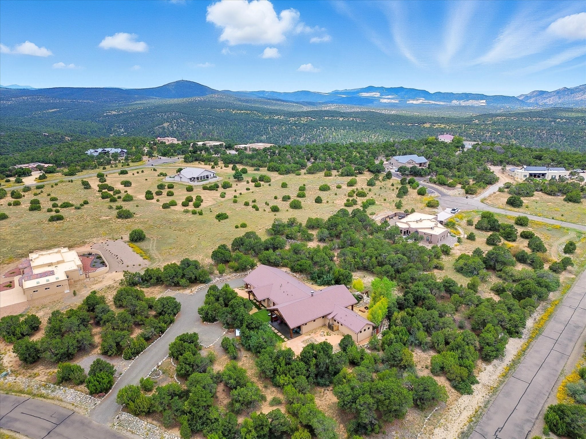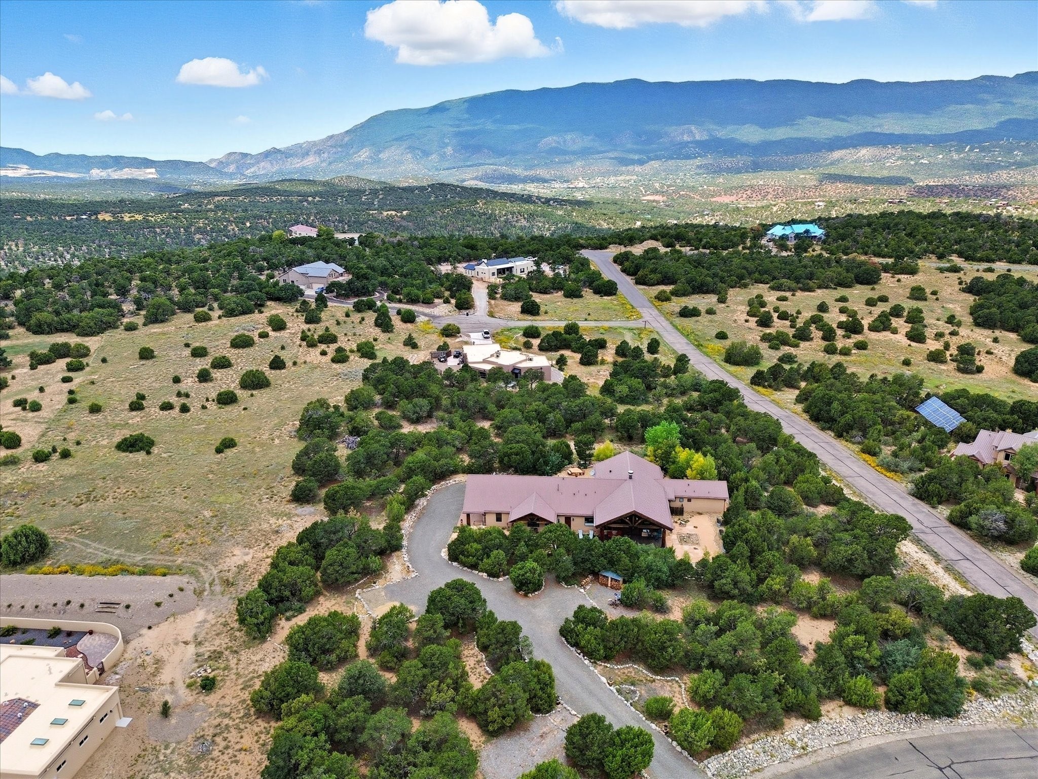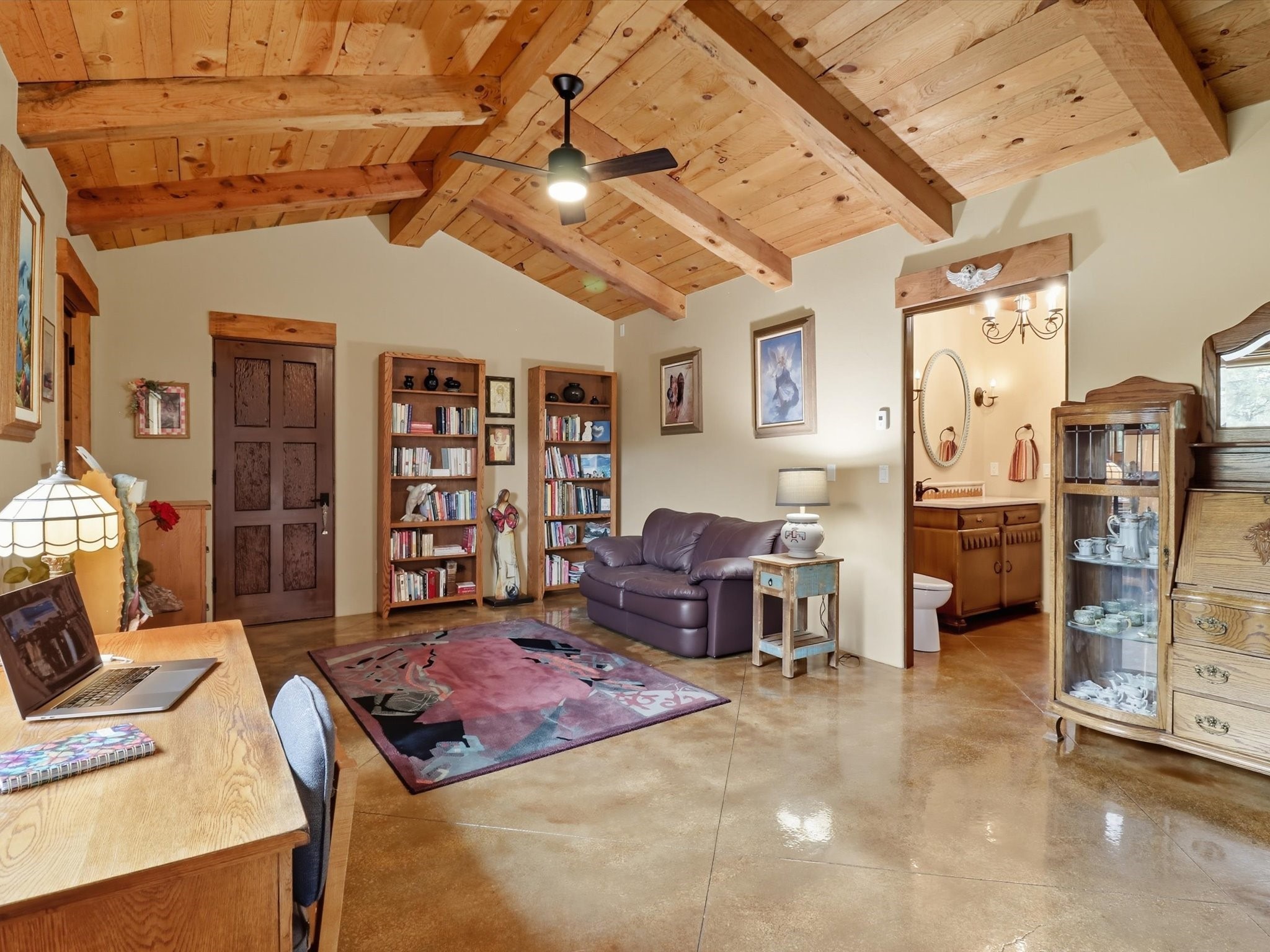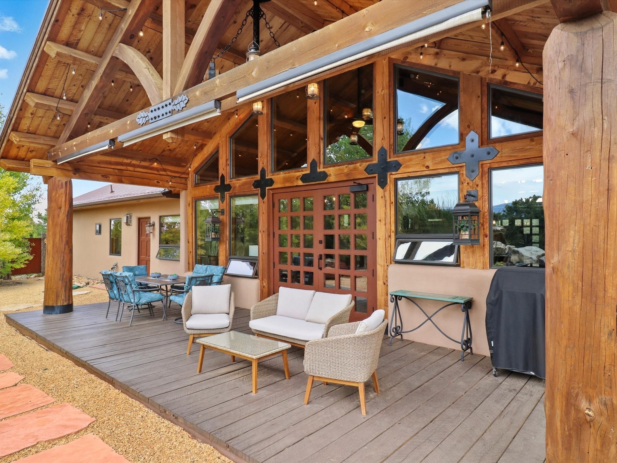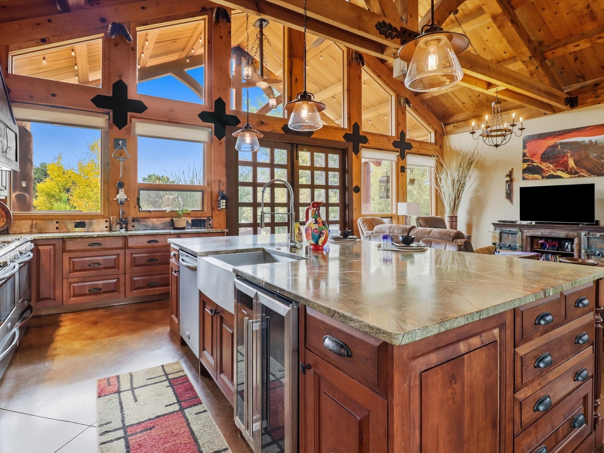 Country Lodge-Style Home in Gated CommunityCasually elegant lodge-style home in a country setting, designed to highlight 4 seasons with walls of windows, 20-foot wood ceilings, and massive trusses in the great room. Two living areas are divided by a two-way stacked stone fireplace, with a striking water feature inside the front entry.Interior features include concrete radiant-heated floors, wood vigas, and a chef's kitchen with 2 ranges, dishwasher, wine cooler, built-in refrigerator, rainforest quartz island, copper hood and backsplash, and a large pantry. A built-in china hutch adds to the custom design.The main suite includes a Jacuzzi tub, fireplace, and a large walk-in closet. Additional amenities feature a 1,369 sq. ft. 3+ car garage/workshop with shelving, porches at the front and back, and an outdoor hot tub. Backyard has a large koi pond with a water feature.Located in a gated, paved community with clubhouse amenities including walking trails, indoor pool, outdoor hot tub, sauna, gym, basketball, racquetball and tennis courts. Approximately 20 minutes east of Albuquerque.