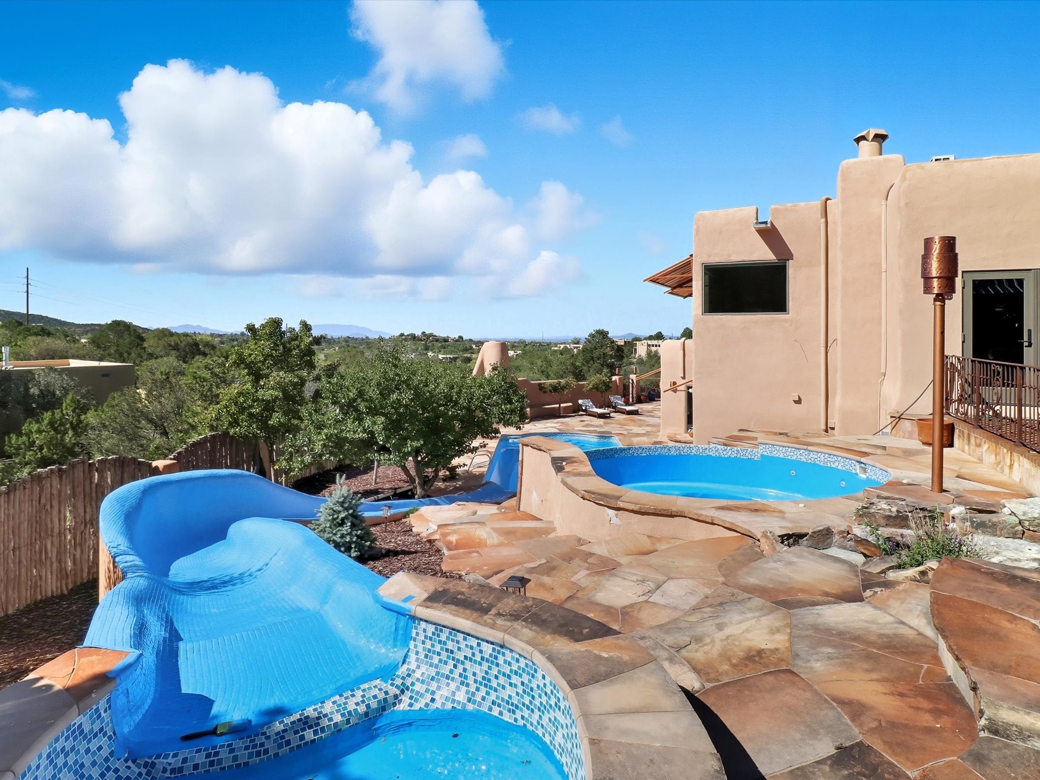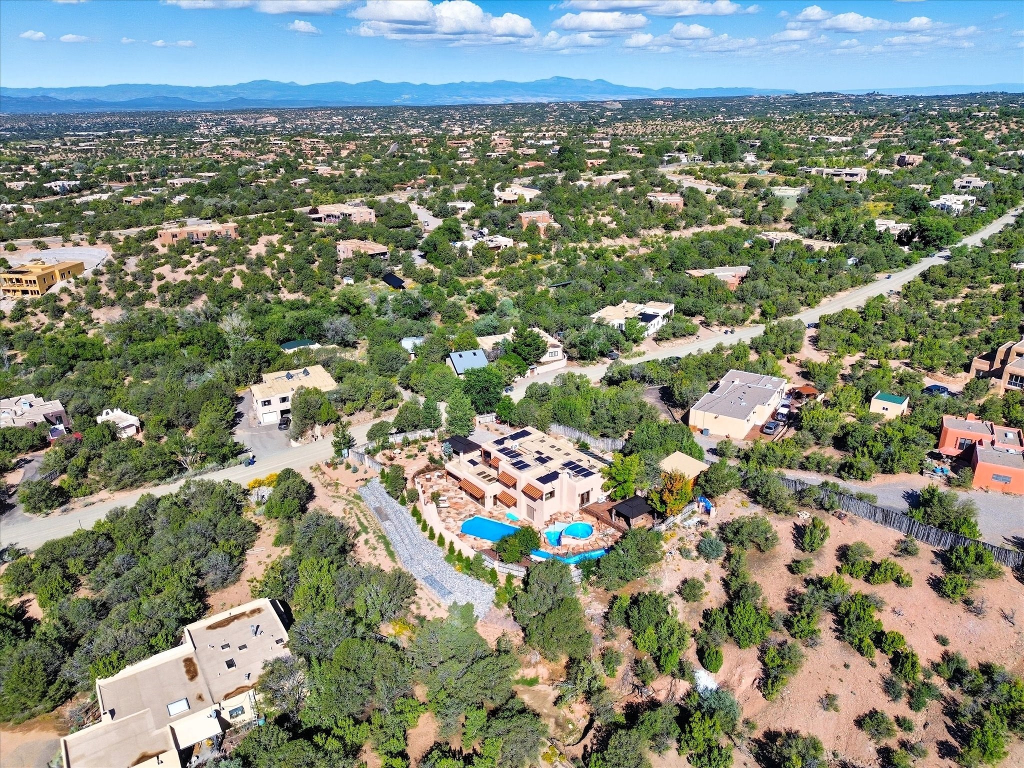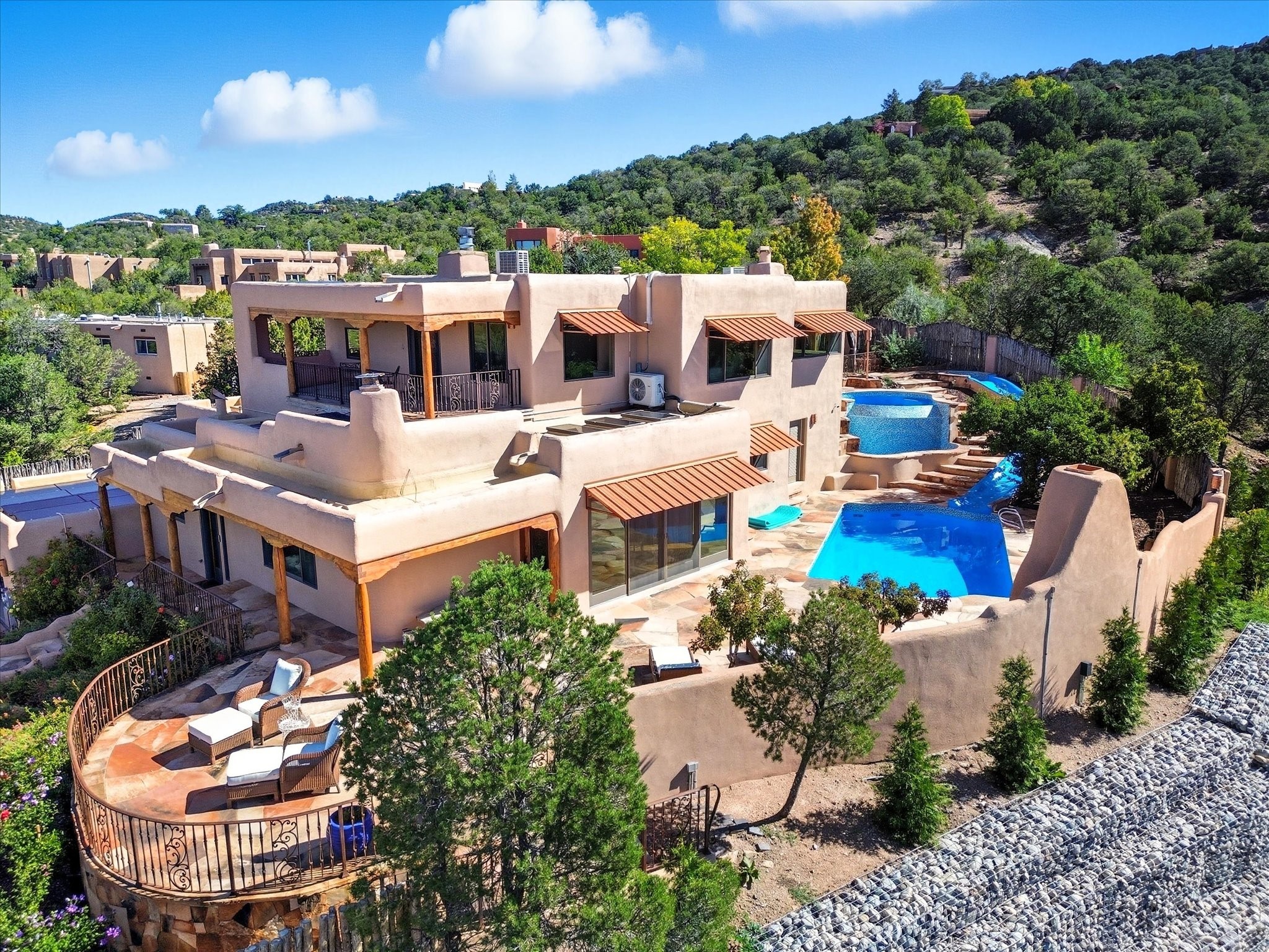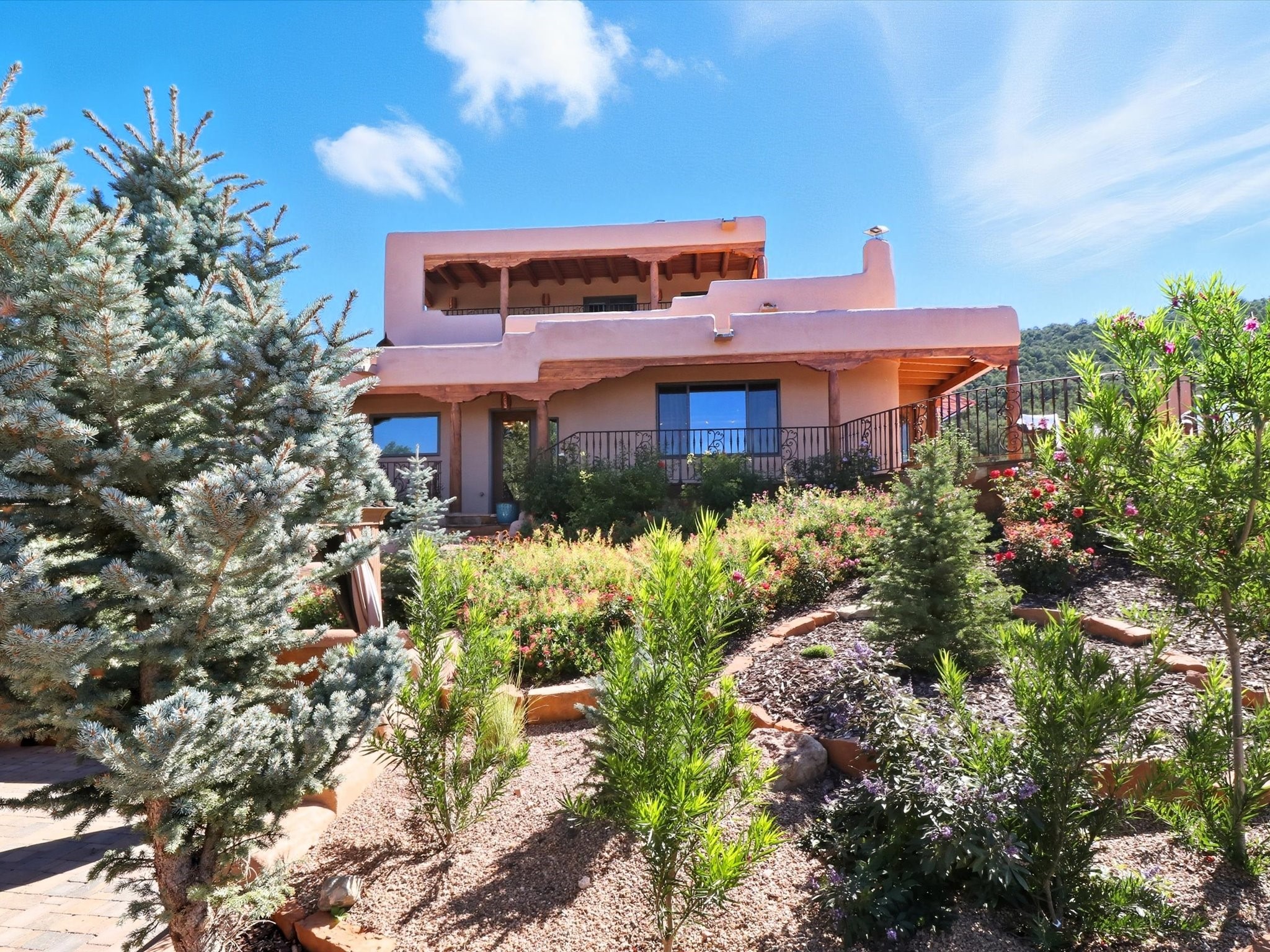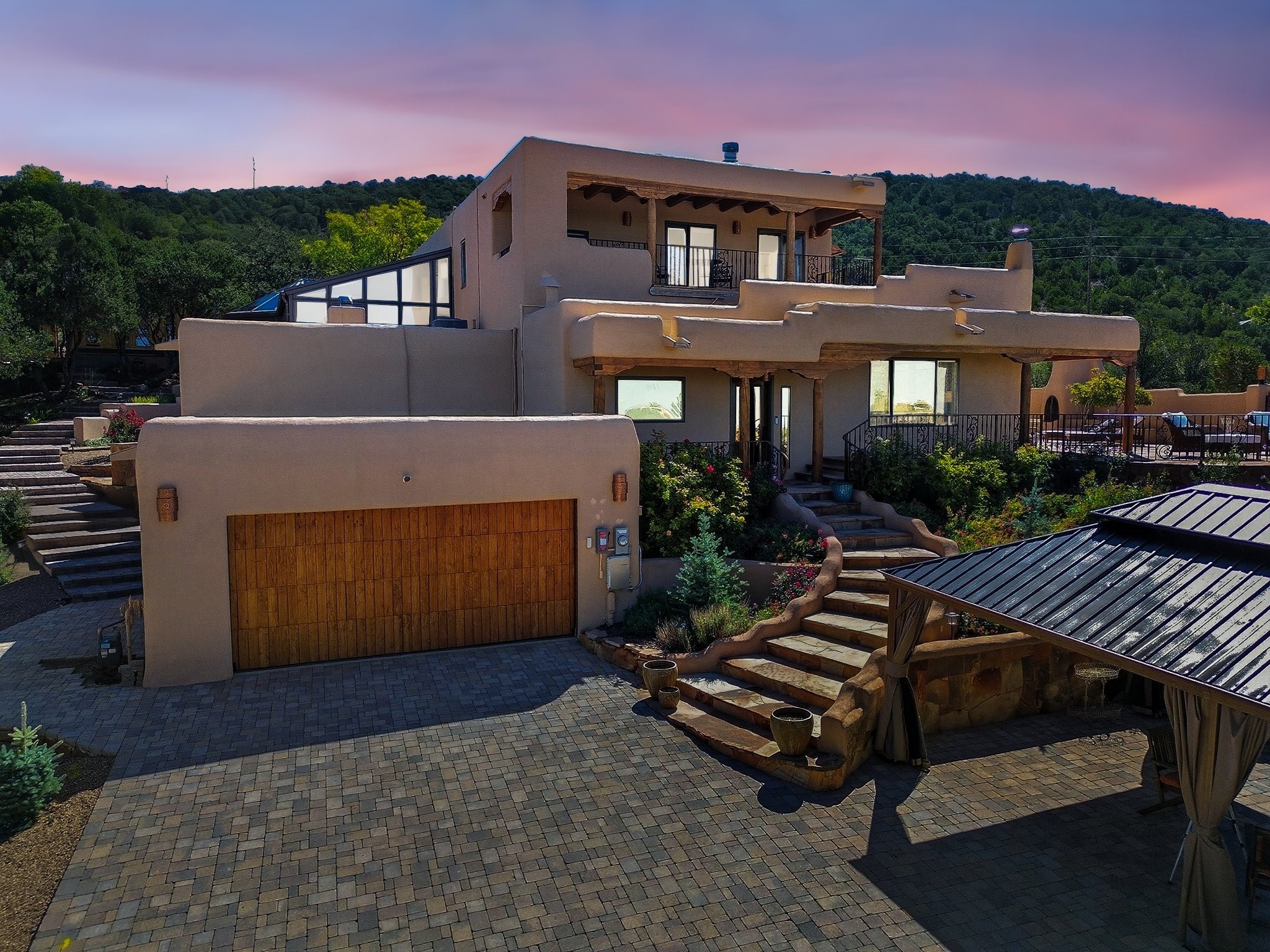 WANTED: A New Owner With a Taste for the Extraordinary! Be prepared to be inspired--inspired to live effortlessly in a mountain escape where Old World charm meets modern-day refinement. This elevated estate isn't just a home, it's a sanctuary, a hideaway, a place where sunsets stretch for miles and every corner whispers character. Step through newly designed gardens with stone walkways and an elegant driveway that sets the stage for what's within. Inside, custom wood accents, artisan ironwork, walnut floors, and hand-troweled plaster walls warm the soul. Two living areas -- plus a sunlit, heated, and cooled solarium with a sauna off to the side -- offer spaces to gather and relax. The primary suite is its own retreat, with custom entry doors, a sitting area anchored by a kiva fireplace, and direct access to a private deck where sunsets put on their nightly show. The owners have thoughtfully elevated this property with recent upgrades: a transformed garden landscape, extensive stonework, Anderson windows and doors, and major enhancements to the arroyo. Outdoors, the amenities read like a resort--solar panels, a pool with two hot tubs and a waterslide, plus all-new heating systems to keep each pool zone comfortable year-round. And there's more: an amazing shed ready for conversion to living space, plus the possibility of adding a casita at the top of the lot--perfect for guests or creative ventures. This isn't just a property. It's a rare opportunity to claim your own mountain retreat, one where history, craftsmanship, and modern comfort converge.REWARD: Unmatched views, inspired living, and the chance to call this mountain haven your own.