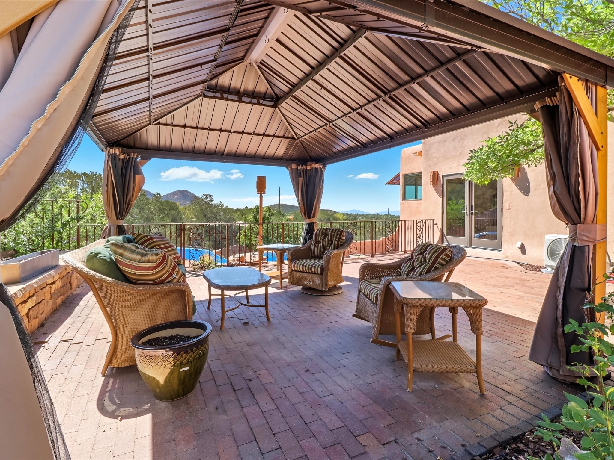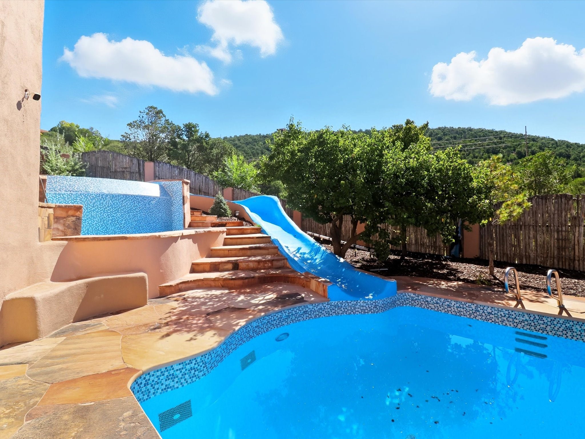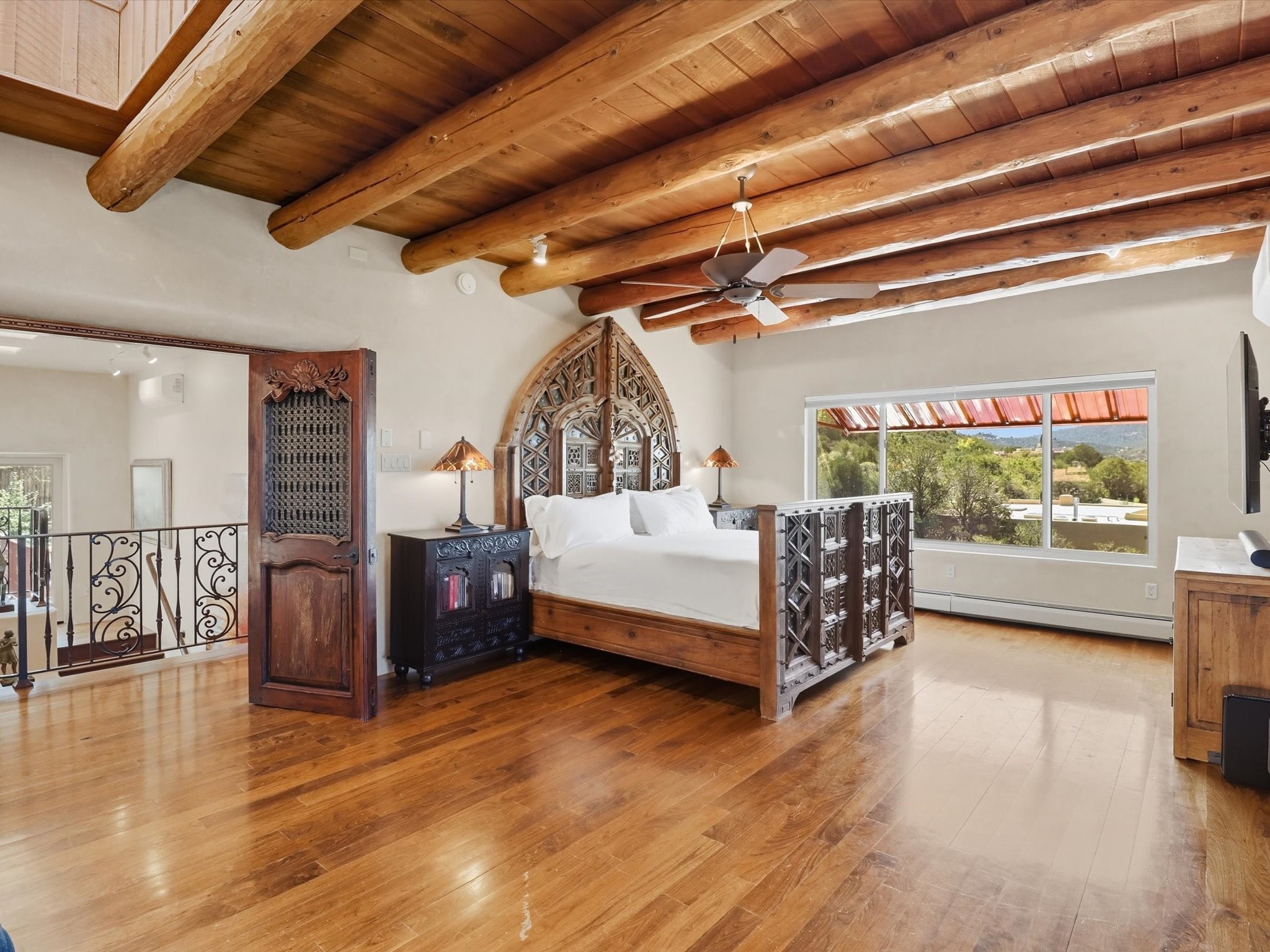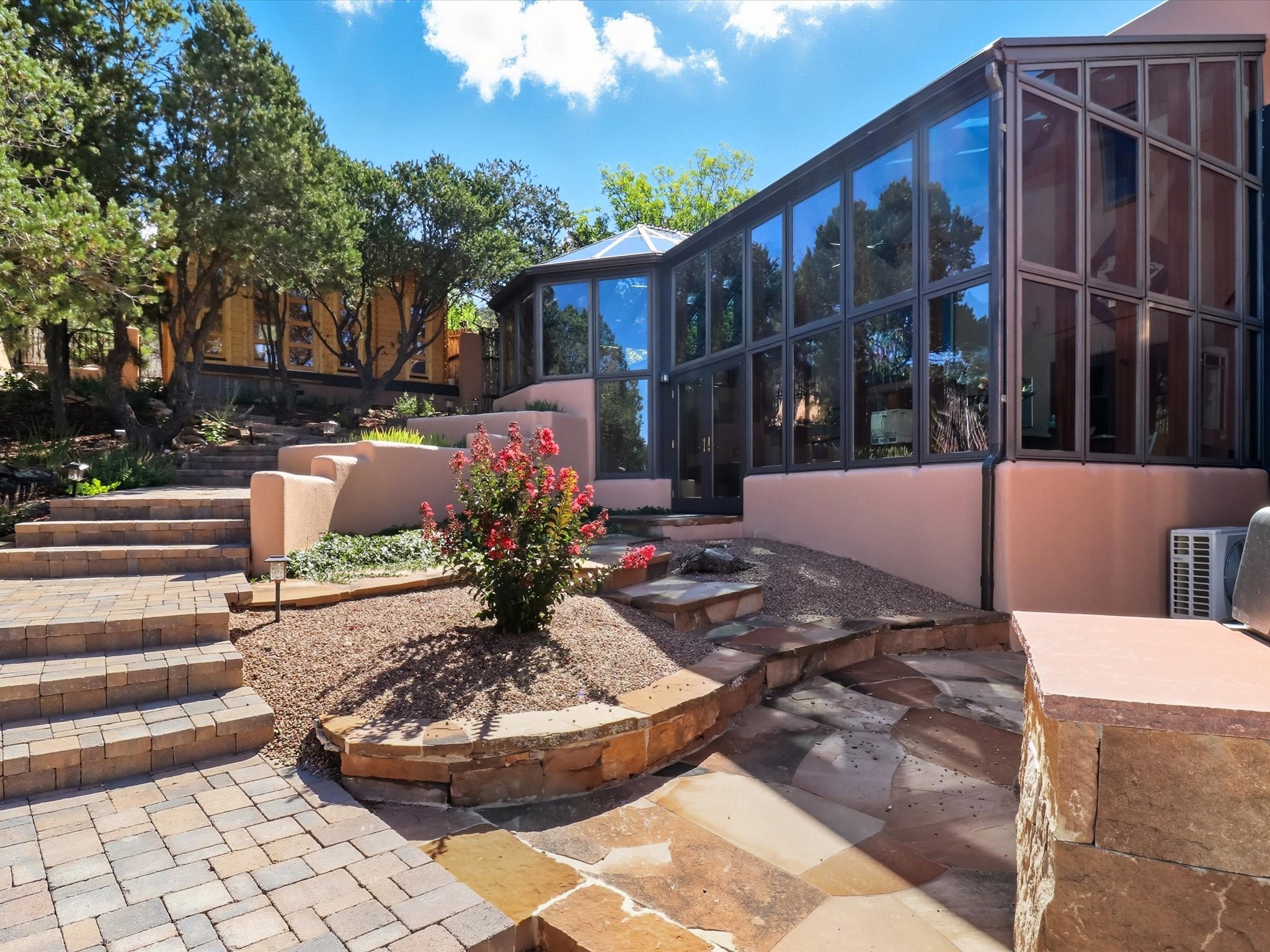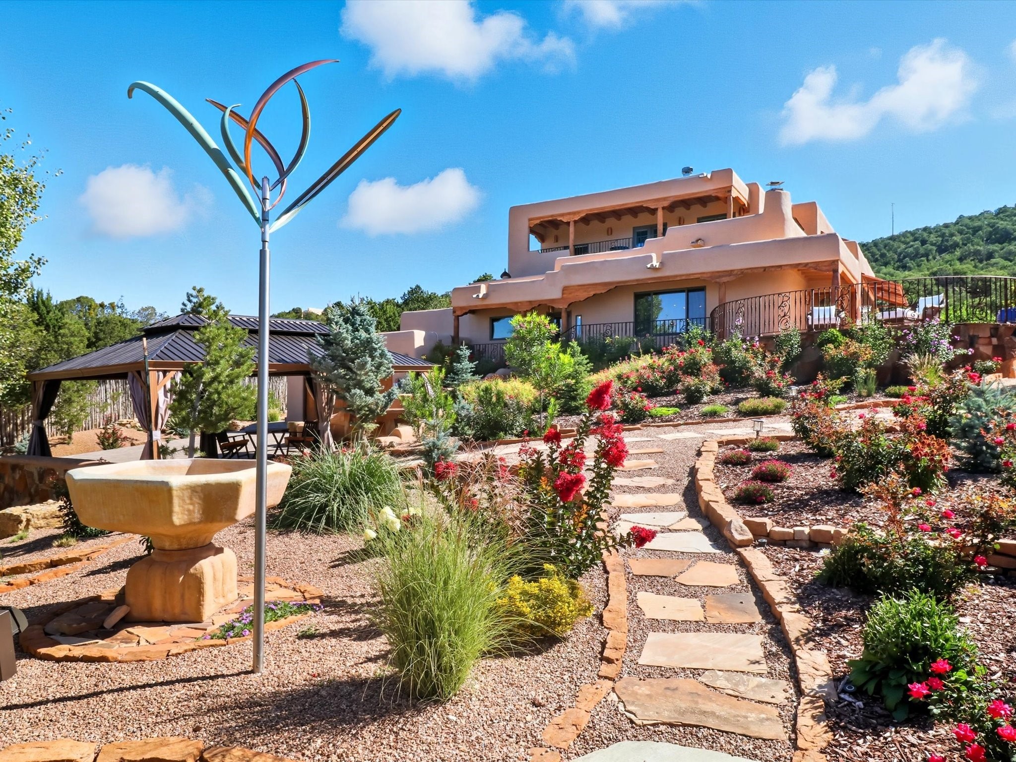 WANTED: A New Owner With a Taste for the Extraordinary! Be prepared to be inspired--inspired to live effortlessly in a mountain escape where Old World charm meets modern-day refinement. This elevated estate isn't just a home, it's a sanctuary, a hideaway, a place where sunsets stretch for miles and every corner whispers character. Step through newly designed gardens with stone walkways and an elegant driveway that sets the stage for what's within. Inside, custom wood accents, artisan ironwork, walnut floors, and hand-troweled plaster walls warm the soul. Two living areas -- plus a sunlit, heated, and cooled solarium with a sauna off to the side -- offer spaces to gather and relax. The primary suite is its own retreat, with custom entry doors, a sitting area anchored by a kiva fireplace, and direct access to a private deck where sunsets put on their nightly show. The owners have thoughtfully elevated this property with recent upgrades: a transformed garden landscape, extensive stonework, Anderson windows and doors, and major enhancements to the arroyo. Outdoors, the amenities read like a resort--solar panels, a pool with two hot tubs and a waterslide, plus all-new heating systems to keep each pool zone comfortable year-round. And there's more: an amazing shed ready for conversion to living space, plus the possibility of adding a casita at the top of the lot--perfect for guests or creative ventures. This isn't just a property. It's a rare opportunity to claim your own mountain retreat, one where history, craftsmanship, and modern comfort converge.REWARD: Unmatched views, inspired living, and the chance to call this mountain haven your own.