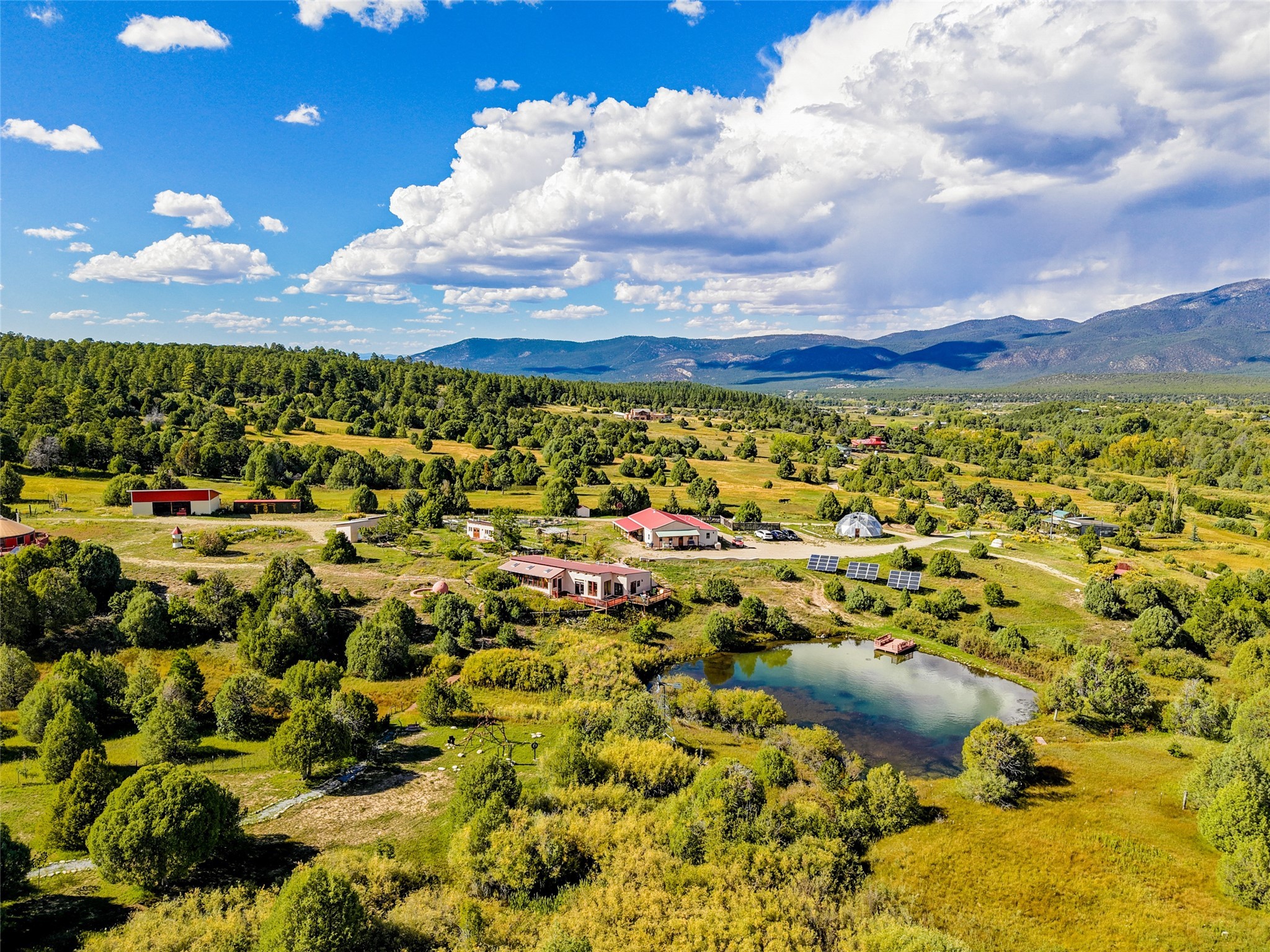 A truly rare 34-acre mountain retreat awaits, nestled in the Sangre de Cristo Mountains with stunning views of Jicarita Peak and Truchas Peaks. This exceptional, self-sufficient, and sustainably developed property is perfect for a small family business, equestrian estate, or serene retreat center.The total living space of 4,100 sq ft includes a charming 1,600 sq ft earth-bermed 2-bedroom home featuring custom stone floors, vigas, radiant in-floor heat in the kitchen and master suite, and an updated kitchen with a Wolf Stove and granite countertops. The home is designed for energy efficiency, maximizing solar gain, and has a wrap-around deck with captivating pond and mountain views.The property also boasts a 2,225 sq ft office/mixed-use building (zoned for cottage industry, previously a successful institute), a 275 sq ft studio/guest house with a half-bath, and a 30' insulated yurt with off-grid solar, ideal for meditation or a classroom--offering immense flexibility and separate spaces for living, working, and gathering.Outside, find unparalleled amenities dedicated to Earth Stewardship and conservation: 10 irrigated acres with water rights for farming or grazing. Rustic 3-stall horse barn and tack room, horse fencing throughout property. 33' geodesic Growing Dome for year-round production. A comprehensive water catchment system utilizing heavy-duty roof guttering on all buildings and multiple cisterns. A quarter-acre pond with a Trex deck, fed by wetlands and springs, and aerated by a windmill. A vast network of maintained trails on forested acres (thinned and managed), offering direct access to the Carson National Forest.Additional features include an owned grid-tied solar array, a root cellar, a 40' cargo container, and extensive landscaping with drip irrigation. This property is a rare gem, beautifully developed, and ready for its next steward.
