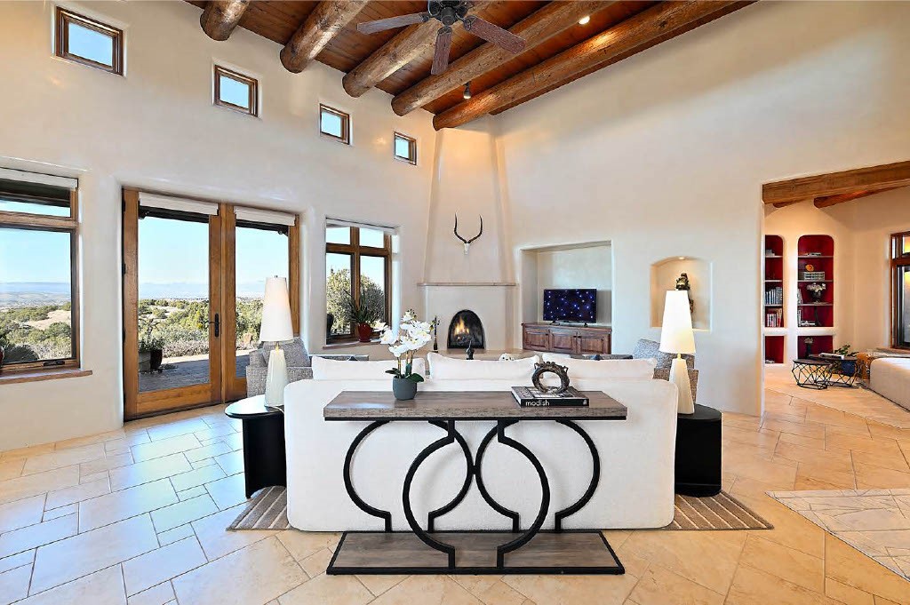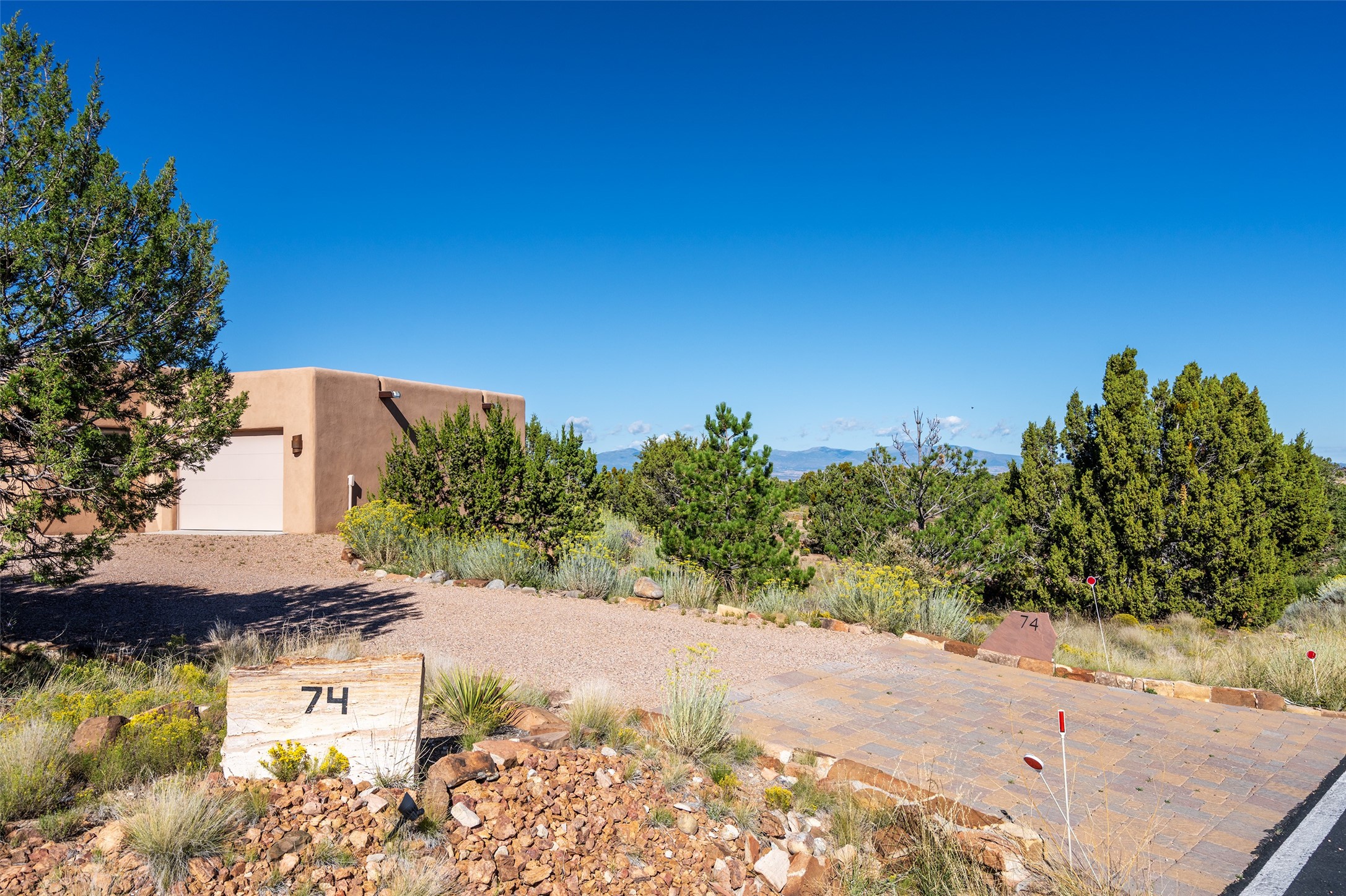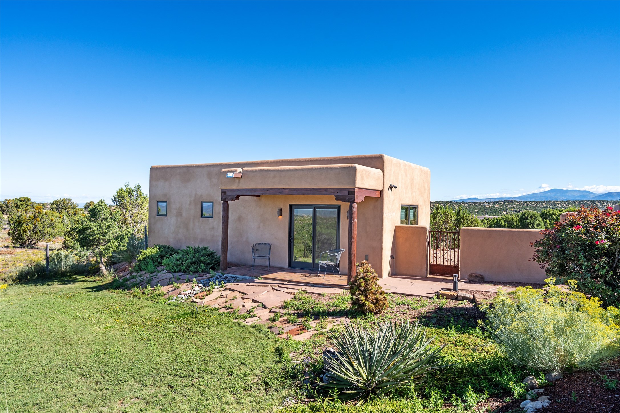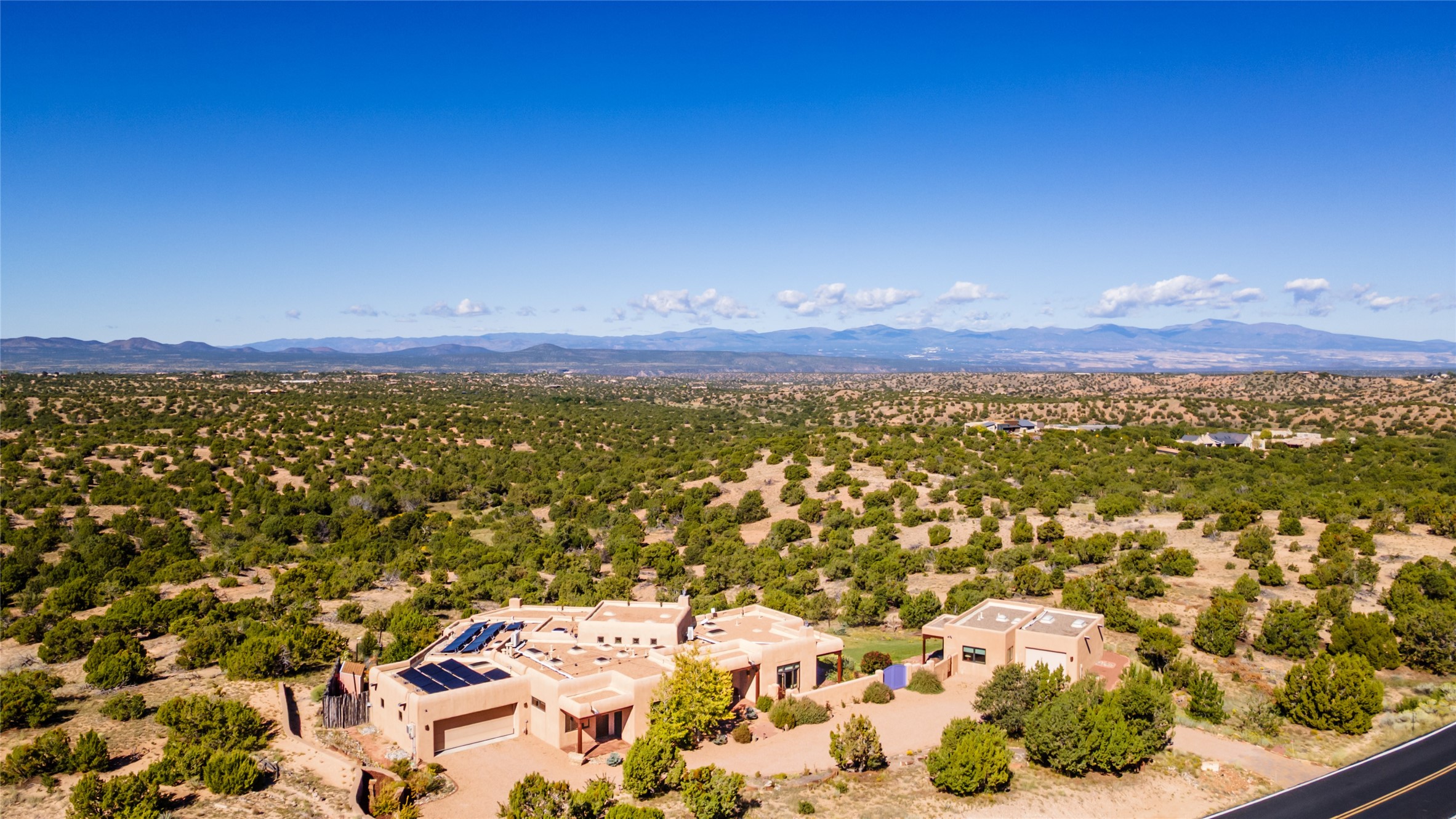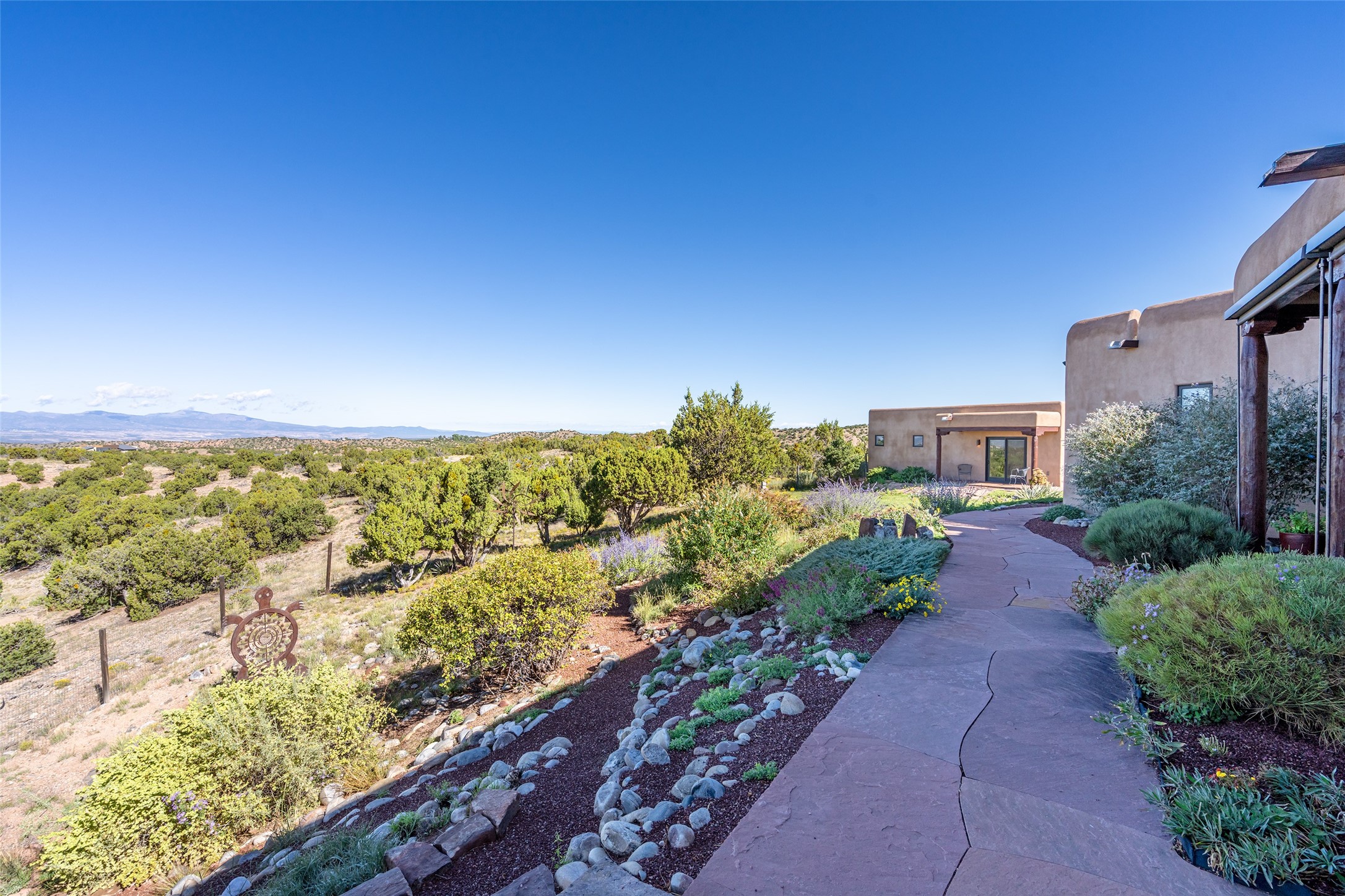 BREATHTAKING SANTA FE STYLE WITH SUNSET VIEWS. Perched on 2.5 acres with unobstructed views of the Western Jemez Mountains, this home was designed with PATTERN LANGUAGE principles in mind including multiple arches that visually repeat throughout the home. This 4-bedroom, 4-bathroom residence (including detached guest house built in 2016) offers the best of Southwestern living with intentional design. Prull Custom Builders built this residence in 2009 for the current owners and the home is sited perfectly to capture glorious sunsets and the dramatic New Mexico landscape, all while blending seamlessly into its natural surroundings. The floor plan ensures excellent separation between the primary suite and guest room, with soaring ceilings, vigas & beams, plastered walls, and abundant natural light throughout. The spacious living room flows to a large sunny gourmet kitchen with multiple granite countertops, a huge island, generous cabinetry, and vistas of the mountains beyond. Radiant in-floor heating and mini-splits provide year-round comfort, while a fully paid Positive Energy solar system keeps electricity costs minimal! The main garage is equipped with EV charging support. Outdoor living is equally inviting with covered portals, brick paver patios, a fireplace, and flagstone paths leading to the guest house - complete with its own garage for added privacy. The landscaped grounds include a fenced backyard for pets and a charming side garden, offering a balance of beauty and function. Free from HOA restrictions, with a newer paved road, privacy and coveted location, this property is an exceptional blend of style, sustainability, and Santa Fe charm.