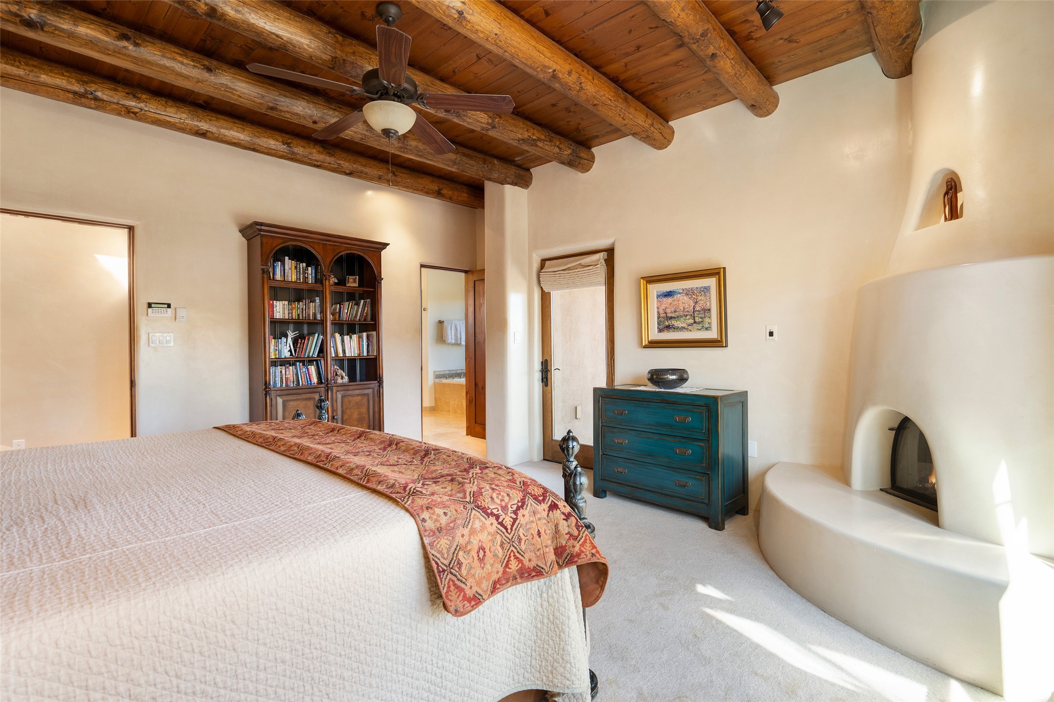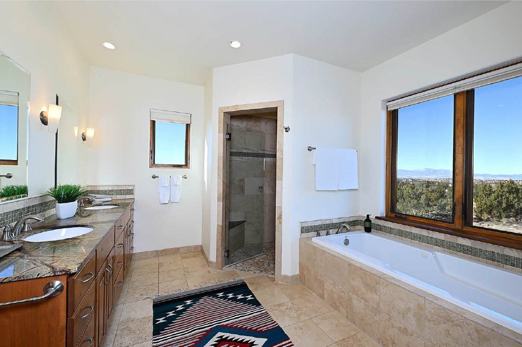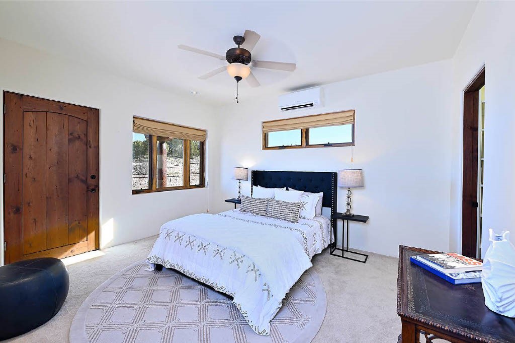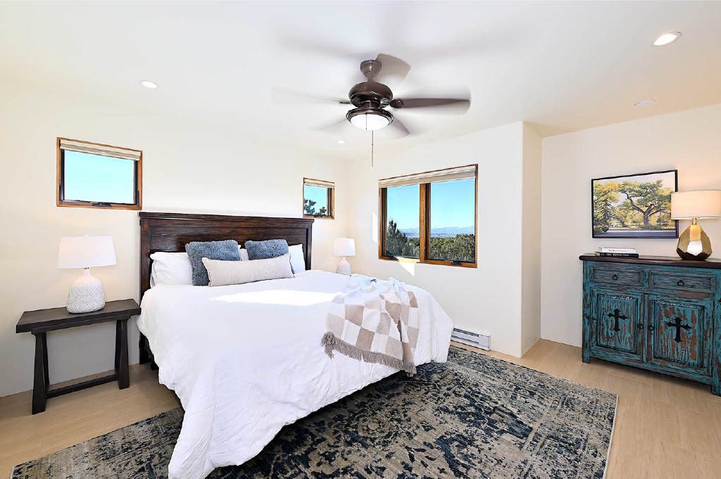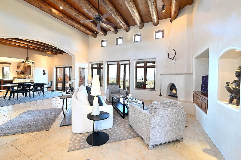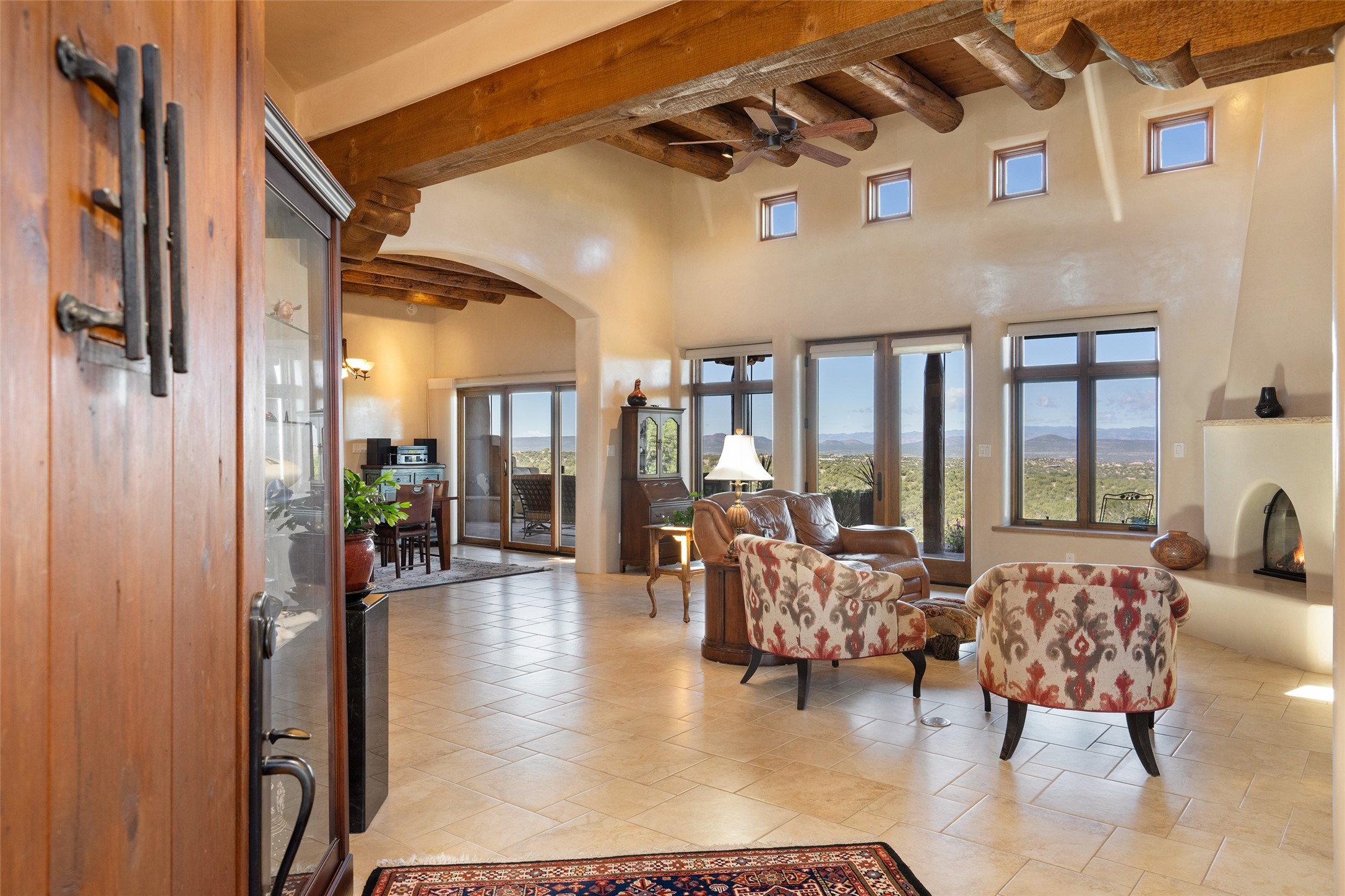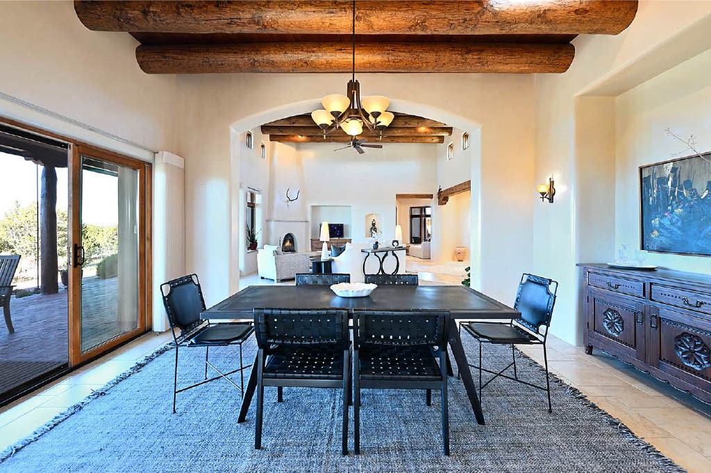 BREATHTAKING SANTA FE STYLE WITH SUNSET VIEWS. Perched on 2.5 acres with unobstructed views of the Western Jemez Mountains, this home was designed with PATTERN LANGUAGE principles in mind including multiple arches that visually repeat throughout the home. This 4-bedroom, 4-bathroom residence (including detached guest house built in 2016) offers the best of Southwestern living with intentional design. Prull Custom Builders built this residence in 2009 for the current owners and the home is sited perfectly to capture glorious sunsets and the dramatic New Mexico landscape, all while blending seamlessly into its natural surroundings. The floor plan ensures excellent separation between the primary suite and guest room, with soaring ceilings, vigas & beams, plastered walls, and abundant natural light throughout. The spacious living room flows to a large sunny gourmet kitchen with multiple granite countertops, a huge island, generous cabinetry, and vistas of the mountains beyond. Radiant in-floor heating and mini-splits provide year-round comfort, while a fully paid Positive Energy solar system keeps electricity costs minimal! The main garage is equipped with EV charging support. Outdoor living is equally inviting with covered portals, brick paver patios, a fireplace, and flagstone paths leading to the guest house - complete with its own garage for added privacy. The landscaped grounds include a fenced backyard for pets and a charming side garden, offering a balance of beauty and function. Free from HOA restrictions, with a newer paved road, privacy and coveted location, this property is an exceptional blend of style, sustainability, and Santa Fe charm.