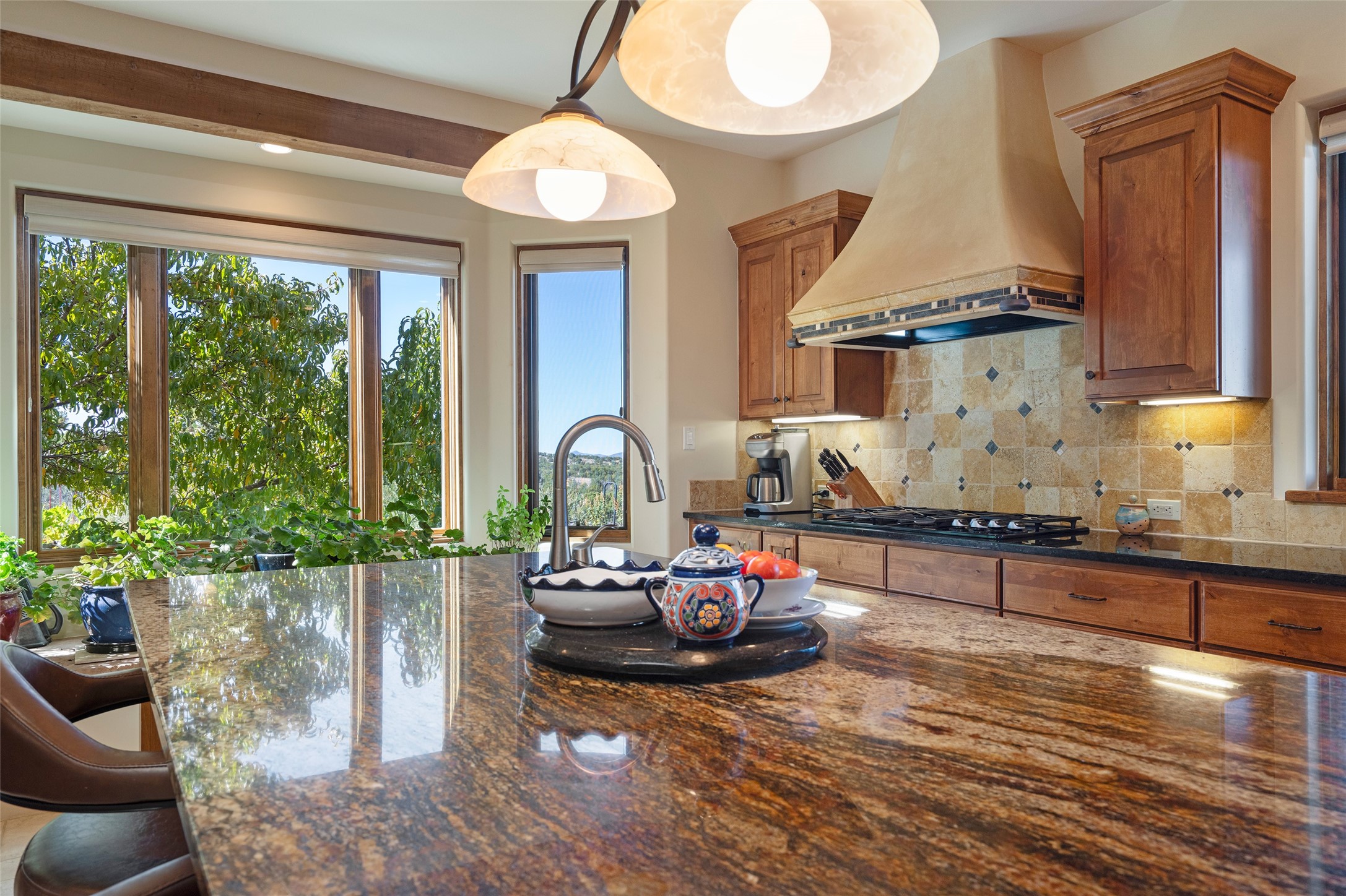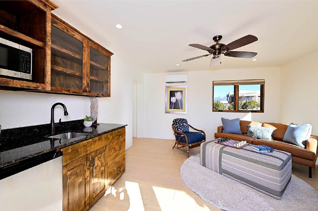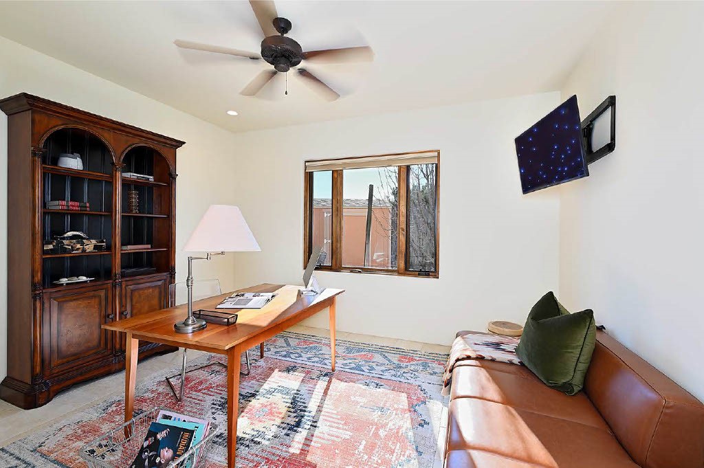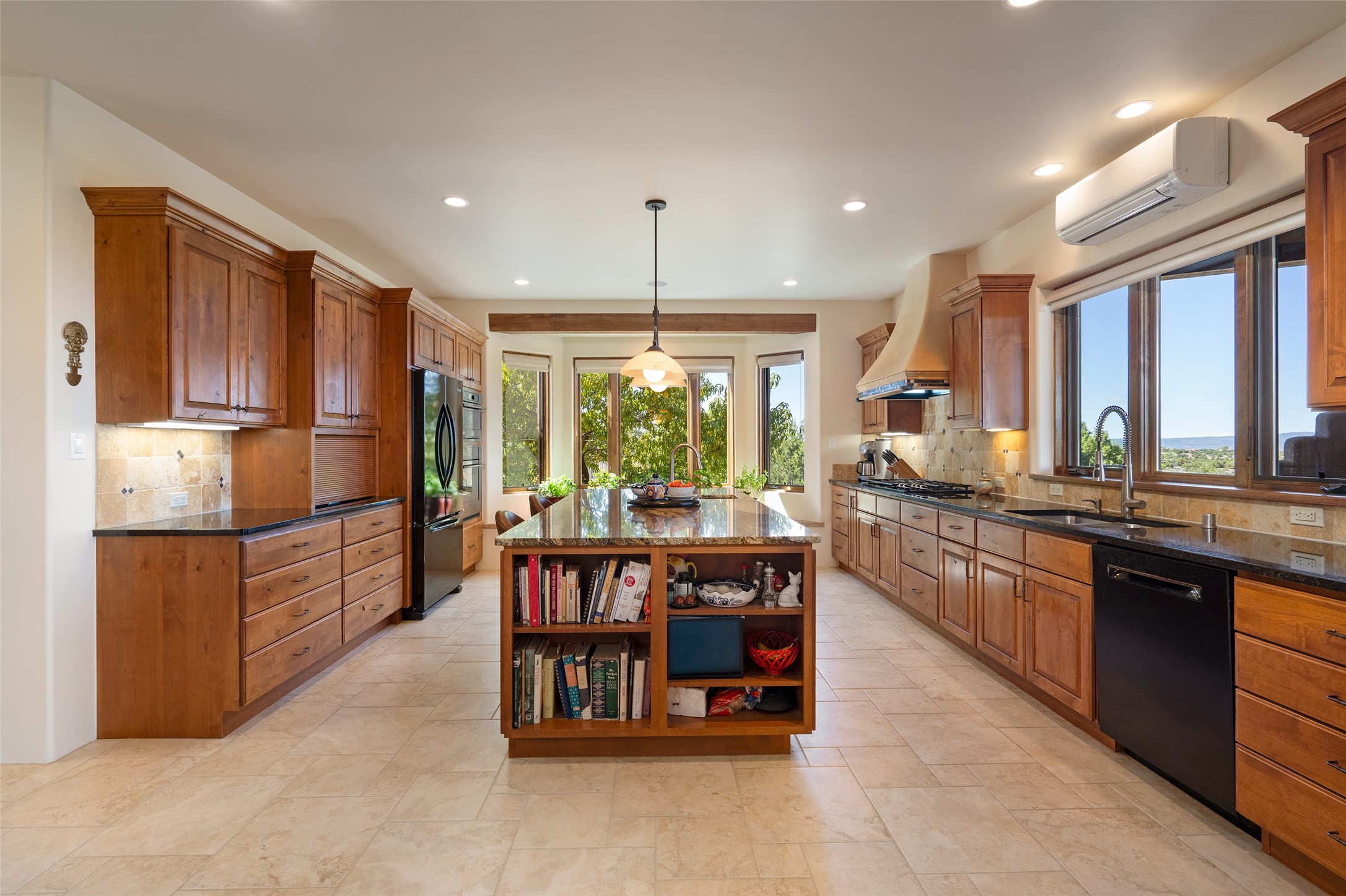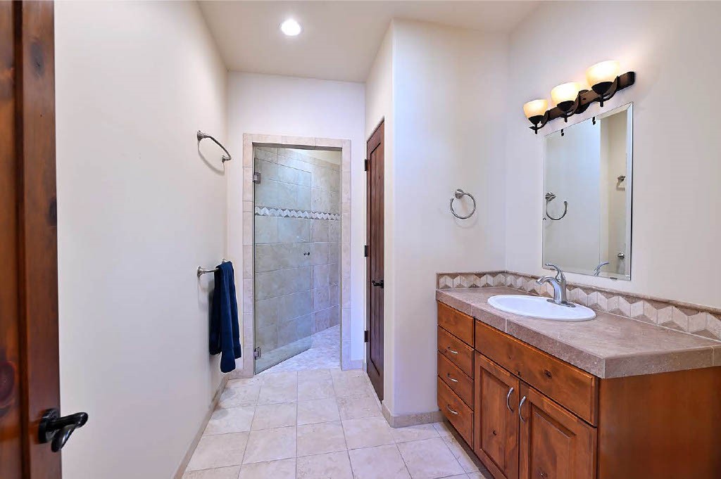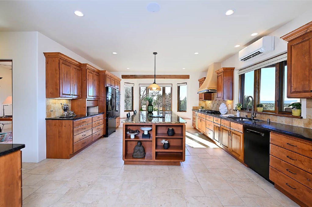 BREATHTAKING SANTA FE STYLE WITH SUNSET VIEWS. Perched on 2.5 acres with unobstructed views of the Western Jemez Mountains, this home was designed with PATTERN LANGUAGE principles in mind including multiple arches that visually repeat throughout the home. This 4-bedroom, 4-bathroom residence (including detached guest house built in 2016) offers the best of Southwestern living with intentional design. Prull Custom Builders built this residence in 2009 for the current owners and the home is sited perfectly to capture glorious sunsets and the dramatic New Mexico landscape, all while blending seamlessly into its natural surroundings. The floor plan ensures excellent separation between the primary suite and guest room, with soaring ceilings, vigas & beams, plastered walls, and abundant natural light throughout. The spacious living room flows to a large sunny gourmet kitchen with multiple granite countertops, a huge island, generous cabinetry, and vistas of the mountains beyond. Radiant in-floor heating and mini-splits provide year-round comfort, while a fully paid Positive Energy solar system keeps electricity costs minimal! The main garage is equipped with EV charging support. Outdoor living is equally inviting with covered portals, brick paver patios, a fireplace, and flagstone paths leading to the guest house - complete with its own garage for added privacy. The landscaped grounds include a fenced backyard for pets and a charming side garden, offering a balance of beauty and function. Free from HOA restrictions, with a newer paved road, privacy and coveted location, this property is an exceptional blend of style, sustainability, and Santa Fe charm.