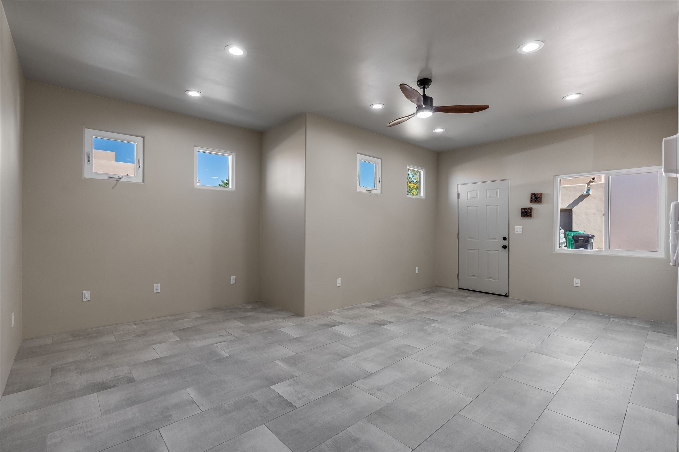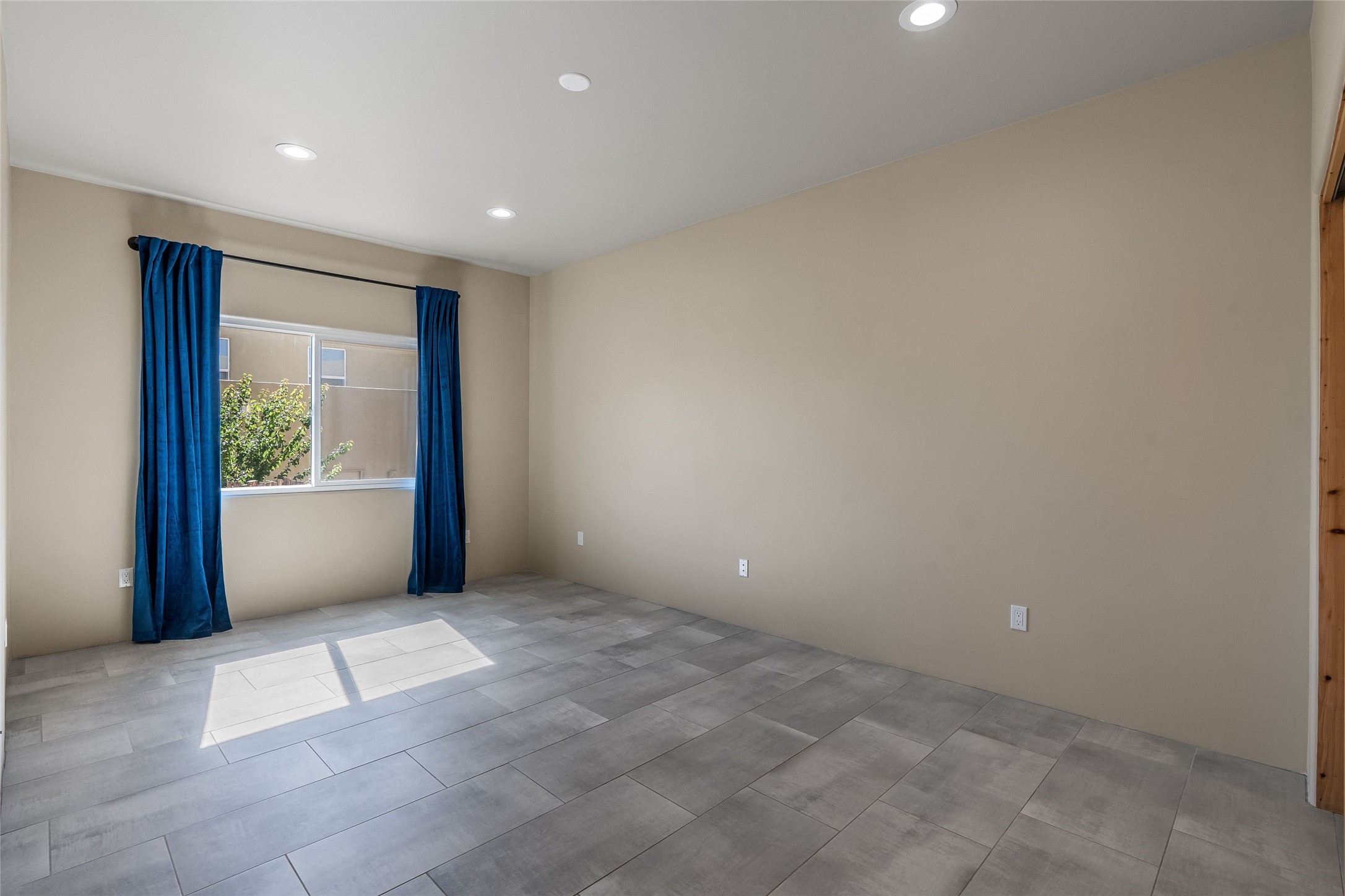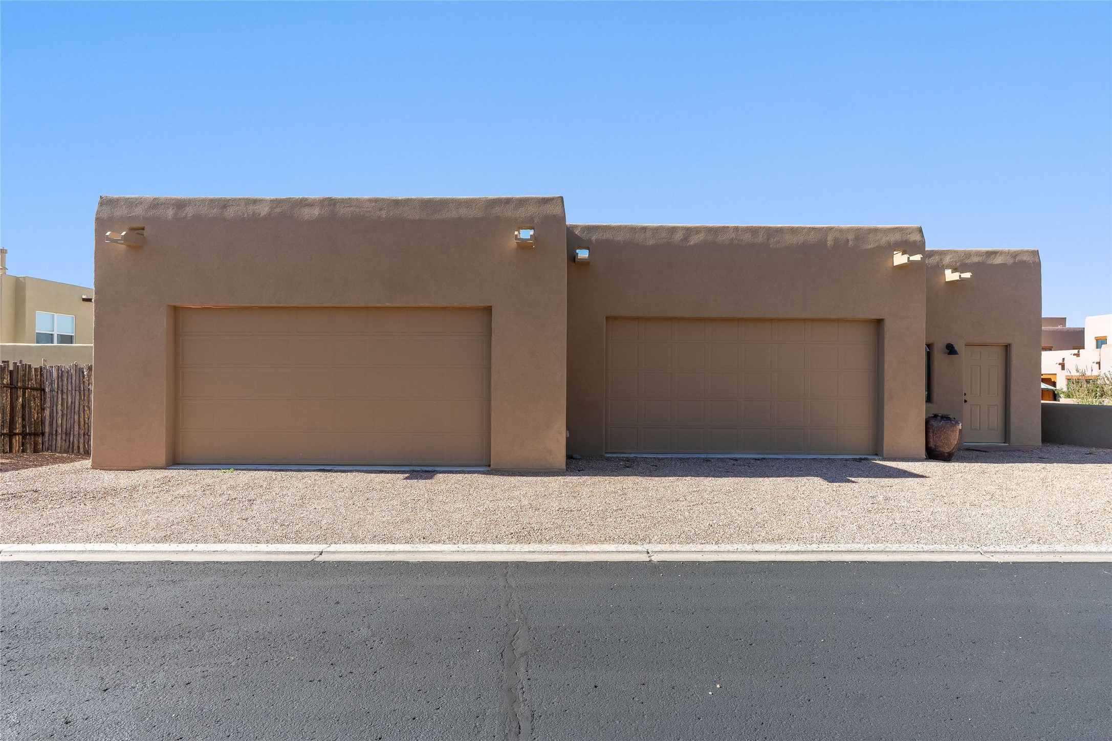 Sophistication meets Santa Fe charm at 32 Calle Lemita, an elegant residence in the coveted Aldea de Santa Fe community. This 3-bed, 3-bath home offers refined living on a 0.16-acre lot with stunning natural light and partial sunset views. The open, airy floor plan highlights soaring ceilings, rich finishes, and seamless flow between living, dining, and kitchen--perfect for stylish entertaining. The expansive living room offers a stacked stone fireplace, high ceilings and traditional Vigas. Plaster walls throughout the main living area. The chef's kitchen boasts premium cabinetry with soft close drawers, generous counter space with quartz countertops, designer tile backsplash and high-end stainless steel appliances. Massive pantry/storage room off the kitchen. The luxurious primary suite offers a spa-inspired bath, one of the most custom walk-in closets you will ever view, plus separate shower and jacuzzi tub. Two additional oversized bedrooms provide versatility for guests or a home office. Laundry room with sink and built-in cabinetry. Whole house radiant cooling/heating system. Adjacent to the heated/cooled 4 car garage is a flex room, perfect for a home gym or studio space. Outdoor living shines with a private enclosed courtyard and elevated patio designed to capture Santa Fe's dramatic sunsets. Lots of wonderful upgrades, such as LED recessed lights, floor to ceiling tile in multiple bathrooms, carved stone sinks and much more. Located approximately 20 minutes from the historic Santa Fe plaza, Aldea de Santa Fe offers exclusive amenities including walking trails, pickleball/tennis/basketball, community gathering spaces, and easy access to fine dining, galleries, and world-class cultural events. This property is ideal as a sophisticated full-time residence or lock-and-leave retreat for discerning buyers seeking style, privacy, and connection to Santa Fe's vibrant lifestyle.