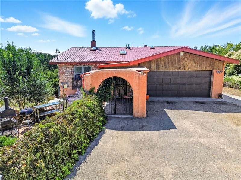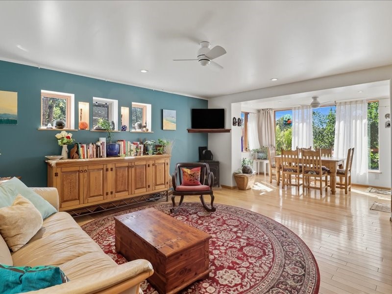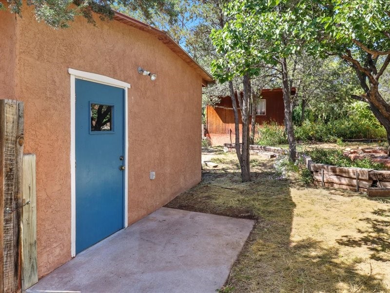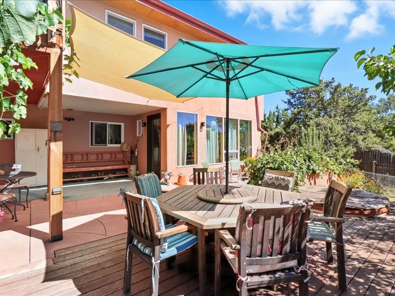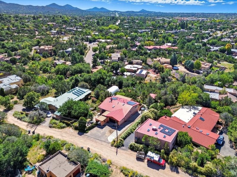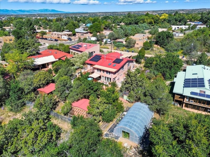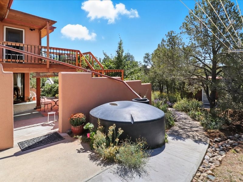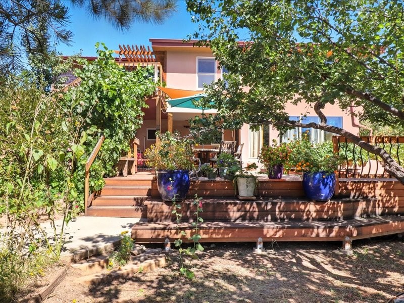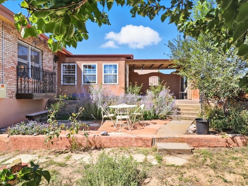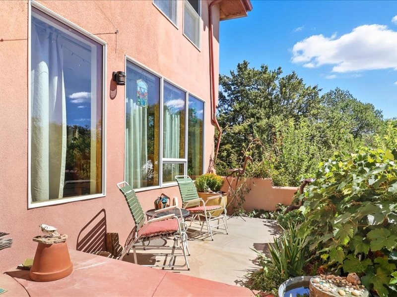 Welcome to this exceptional Santa Fe property, where classic brick construction meets timeless character and thoughtful updates. With 3242 sq ft of well-designed space, the property offers two connected but separate living quarters plus a charming studio, ideal for multigenerational living, rental income, or guest accommodations. Set on a lush, private lot, this is a true garden sanctuary, boasting a pitched metal roof, inviting brick exterior, fruit trees, greenhouse, water rights, and both city and well water. Multiple porches and patios extend the living space outdoors, perfect for enjoying Santa Fe's blue skies, and endless sunsets. A sustainable grey water system nourishes the gardens, while solar panels add efficiency. The upper 3-bedroom residence offers soaring ceilings with wood beams, recessed lighting, windows framing mountain views, and a striking interior rock wall with wood stove, brings rustic charm. Tile and laminate floors flow throughout. The primary suite features a full bath, while a second bath serves guests. A south-facing porch captures warmth and light.The lower 3-bedroom residence highlights warm wood details, butcher block and steel counters, and new windows. The primary suite has a walk-in closet, patio access, and en-suite bath. Multiple heating zones, gas stove, and ceiling fans ensure year-round comfort. Additional highlights include 6 heating zones, established rental history, and a flexible design perfect for live/rent or guest accommodations. A separate utility meter enhances rental potential. Completing the property is a detached studio, perfect for an artist studio or private retreat. With it's brick exterior, solar power, greenhouse, gardens, fruit trees, patios, hot tub, 2 car garage, ample storage, and mountain views, this home embodies the Santa Fe lifestyle. Whether envisioned as a family compound, income-producing property, or serene retreat, it offers unmatched character, flexibility, and lasting value.