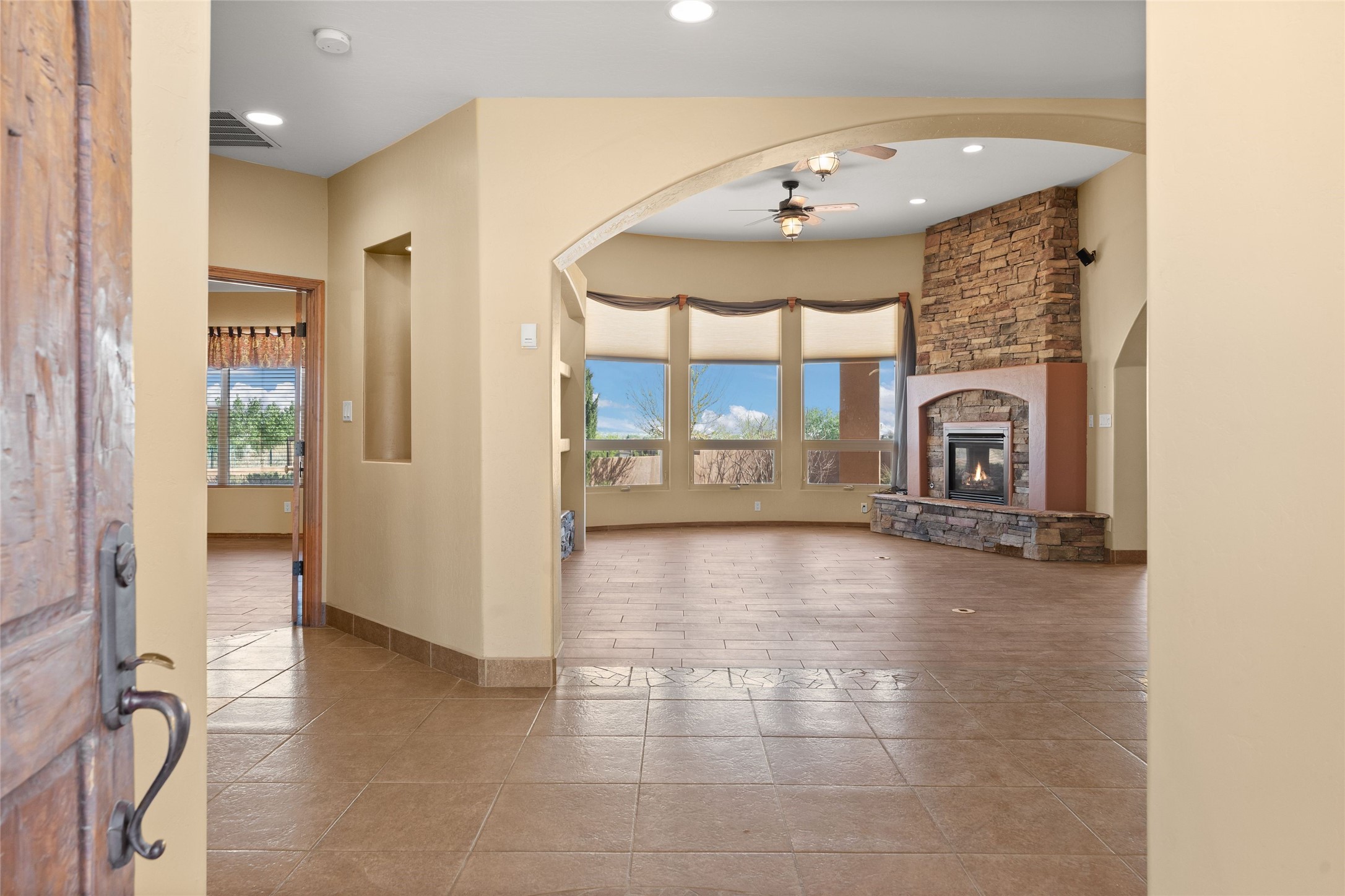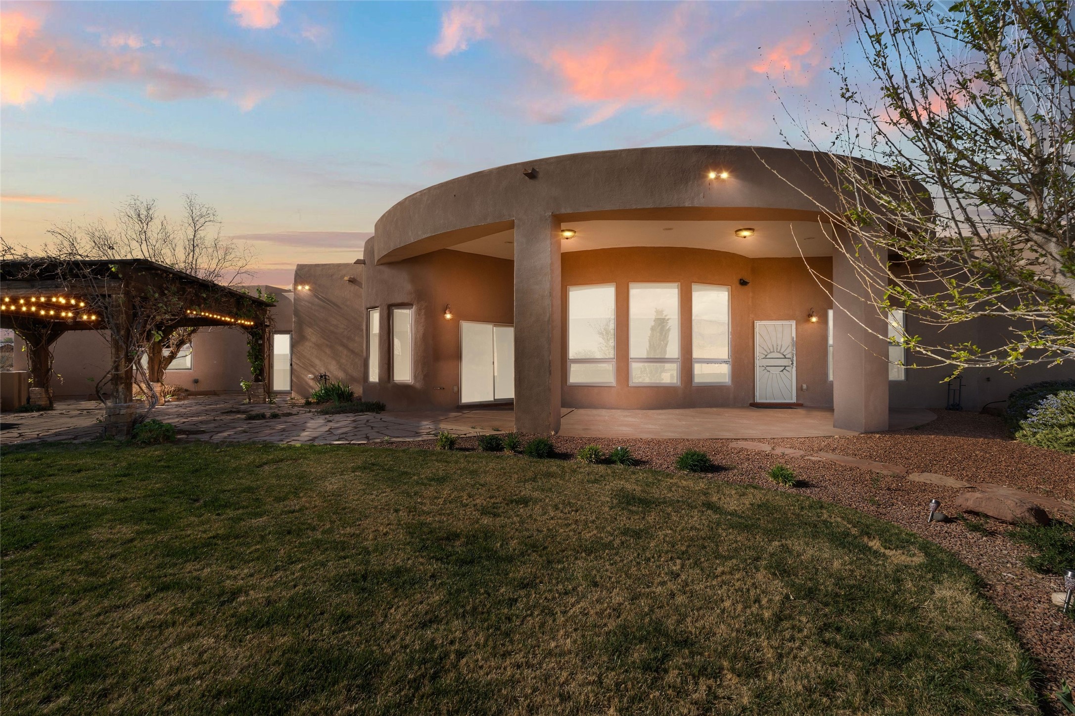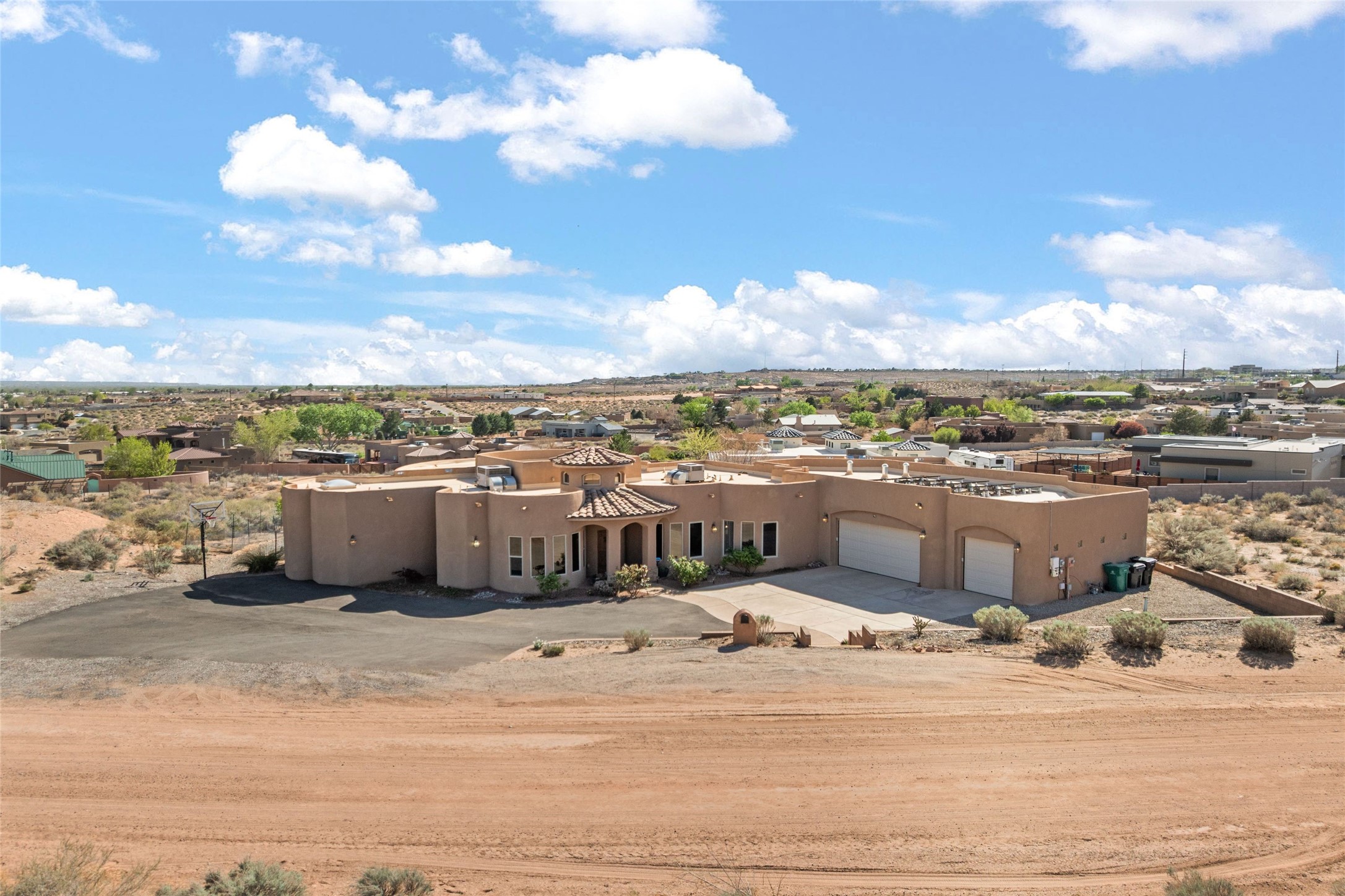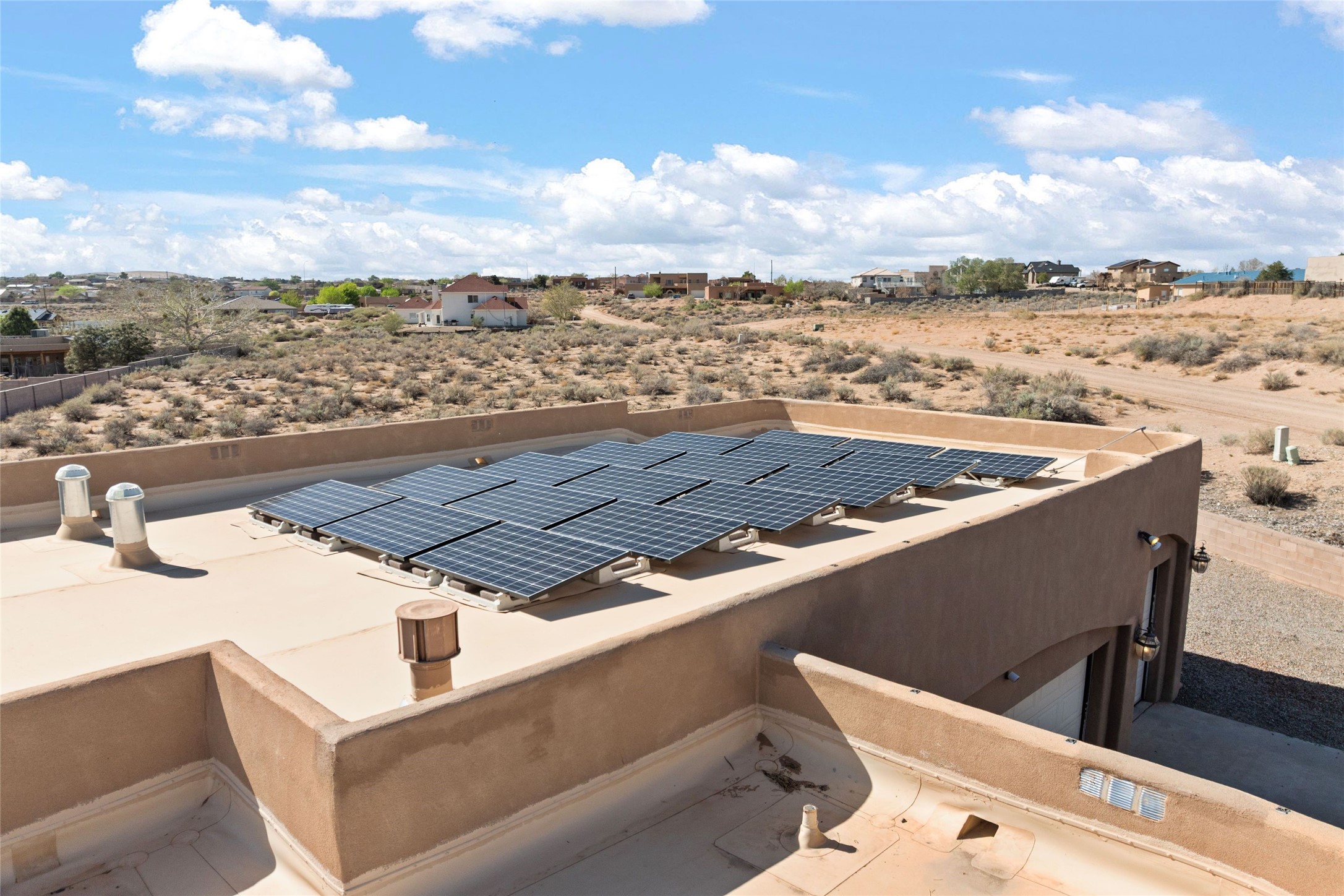 Seller owned solar and a private well! Enjoy the space without the high costs. Nestled on a lush and generous .52-acre lot in Rio Rancho, this property delivers expansive indoor-outdoor living, and countless features including a separate living area/casita. The home includes an oversized 3-car garage (1,488 SF) with extended depth, a dedicated hobby/game room, a 10x15 woodworking space, and a separate storage shed -- perfect for every project or pastime. The main house is designed with community and comfort in mind. The chef's kitchen boasts a gas cooktop, double convection ovens, dual sinks, a walk-in pantry, and flows effortlessly into the dining and living areas -- perfect for entertaining.A stacked stone custom gas log fireplace with banco seating adds cozy ambiance. The primary suite features southern views and private access to the extended covered back patio, a snail shower, garden tub, dual sinks, and a walk-in closet. Three additional bedrooms and two bathrooms provide ample room for children, guests, or office space.18-panel owned solar system installed in 2016. A central vacuum system adds further convenience. A standout feature is the spacious attached 800 SF casita, offering a full kitchen, living room, walk-in closet, and ensuite bathroom with linen storage. All on one level with no carpet, this private space is ideal for in-laws, guests, or even potential rental income.Outdoors, create unforgettable memories in the pergola-covered patio wrapped in grapevines, with a custom wood-burning fireplace and banco seating -- ideal for BBQs, al fresco dinners, and relaxing evenings. The property's mature vineyard includes Cabernet Sauvignon, Chardonnay, and more. Owners and past owners have previously had local farmers care for the grapes in exchange for the fruit at harvest time making this lush landscaping easy to enjoy.Edible landscaping surrounds you with fruit trees and raised garden beds for vegetables and herbs. New roof (2019).