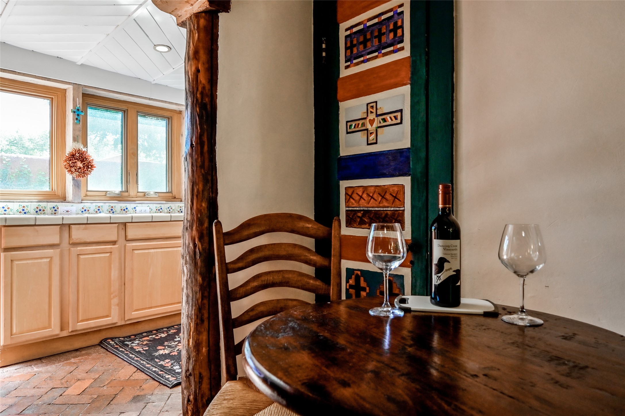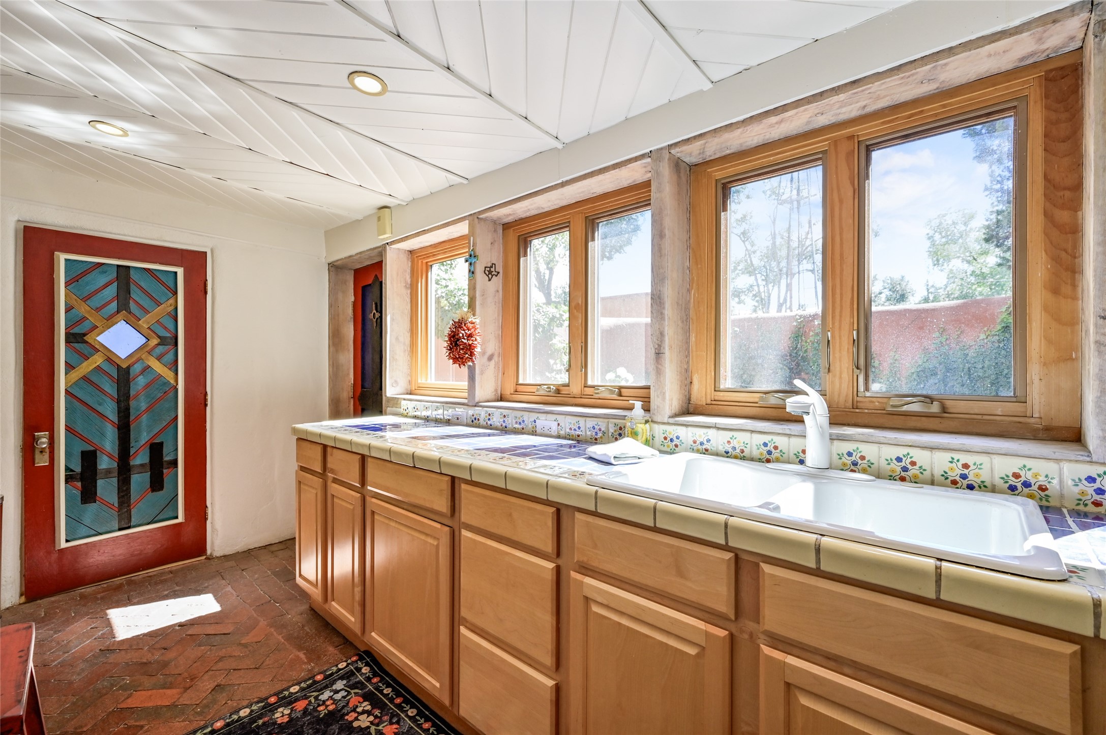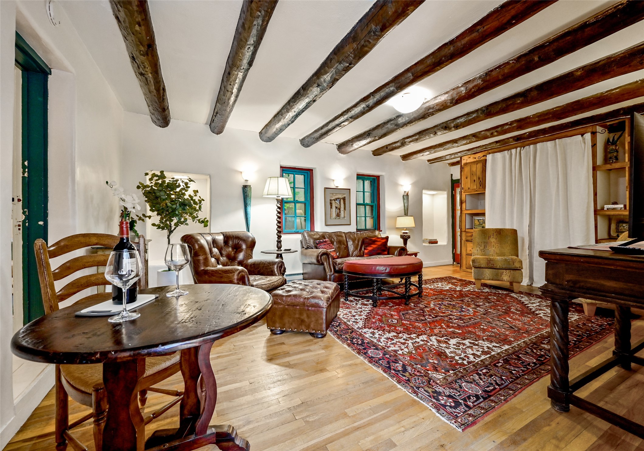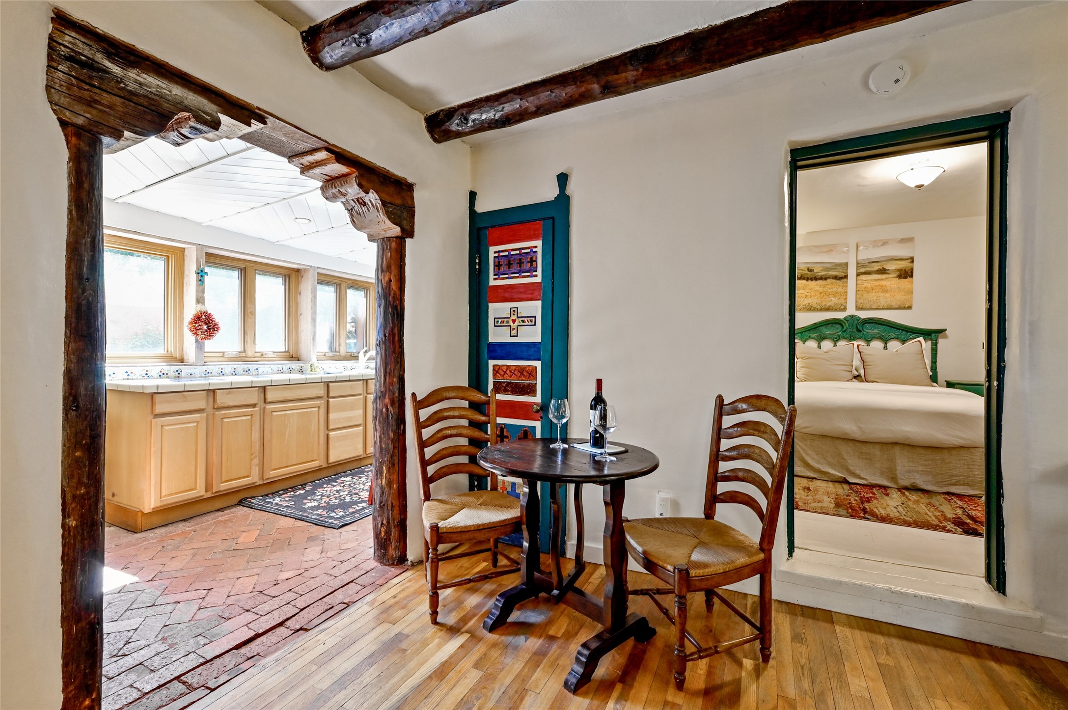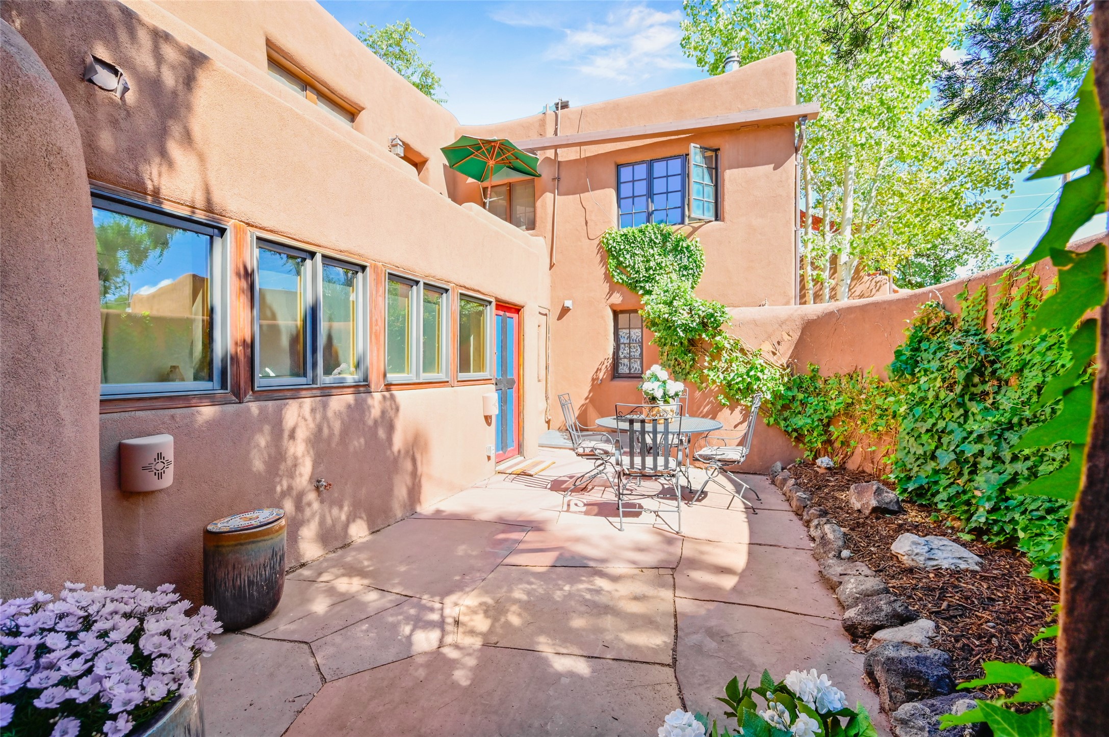 Step into Old World charm with this one-bedroom condo, part of a Pueblo-style adobe dating back to 1921. Outdoor private patio entrance greets you with south facing light. The four large windows bring warm sunlight to the tiled countertop and red bricked floor kitchen. Large dining and living room area offers beautiful old vigas and wood flooring. The pull-out Murphy bed, hidden in the living room, is perfect for those out of town guests or late night sleep-overs. Whimsical hand painted doors throughout pairs beautifully with the colorful mosaic fireplace in the bedroom. Just minutes from Kaune's and the historic Santa Fe Plaza, make this an ideal location for living the Santa Fe dream.