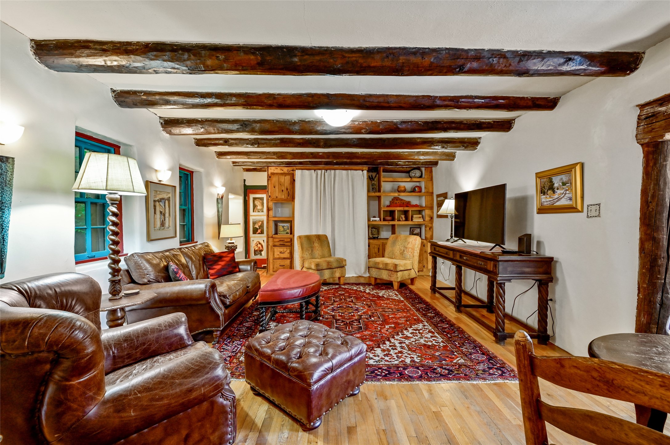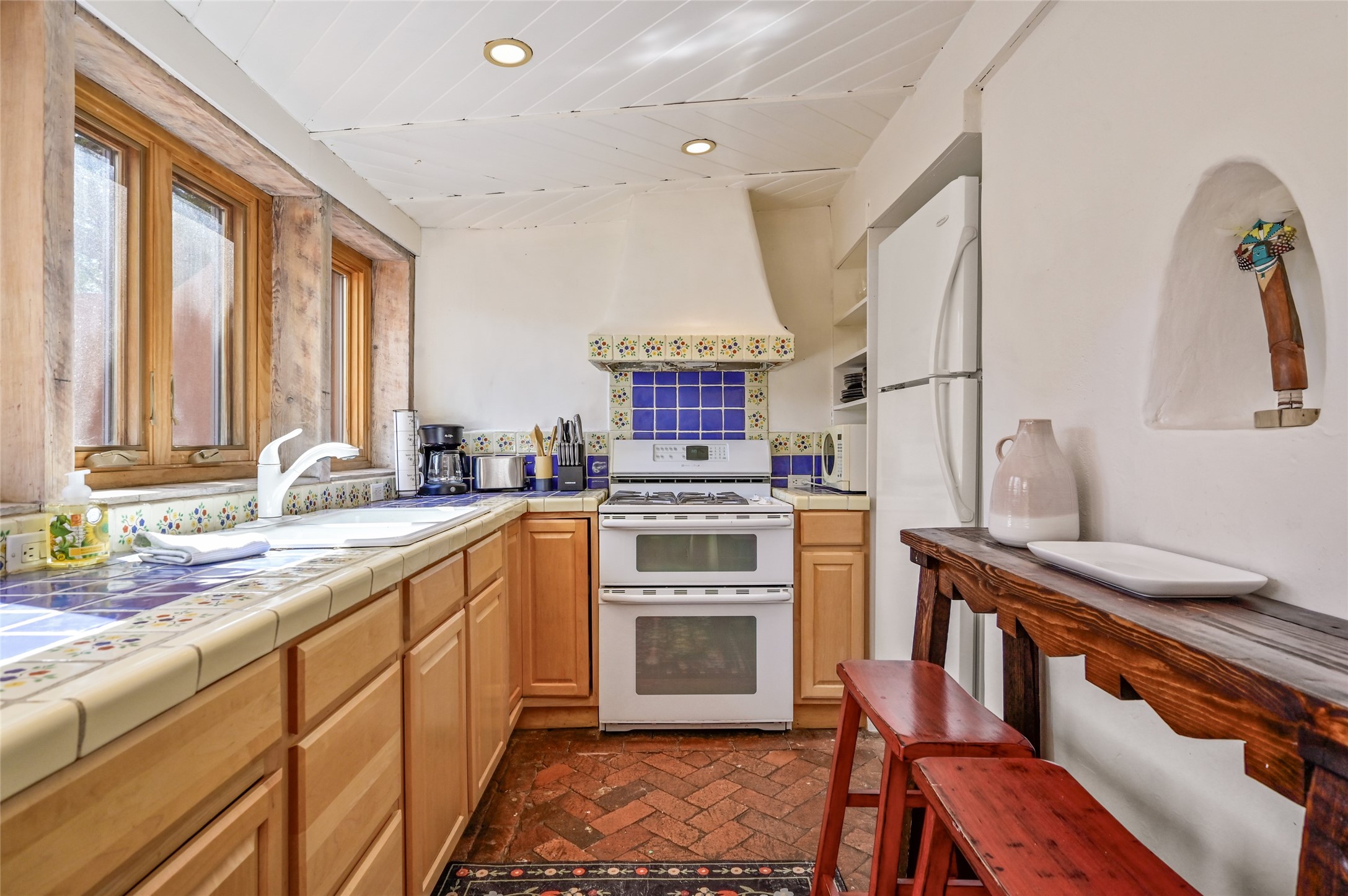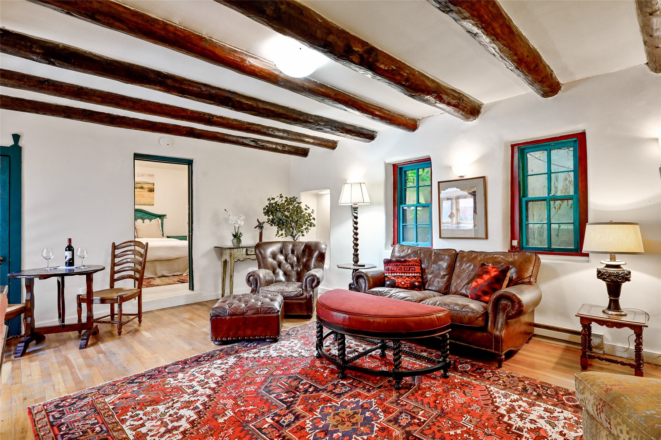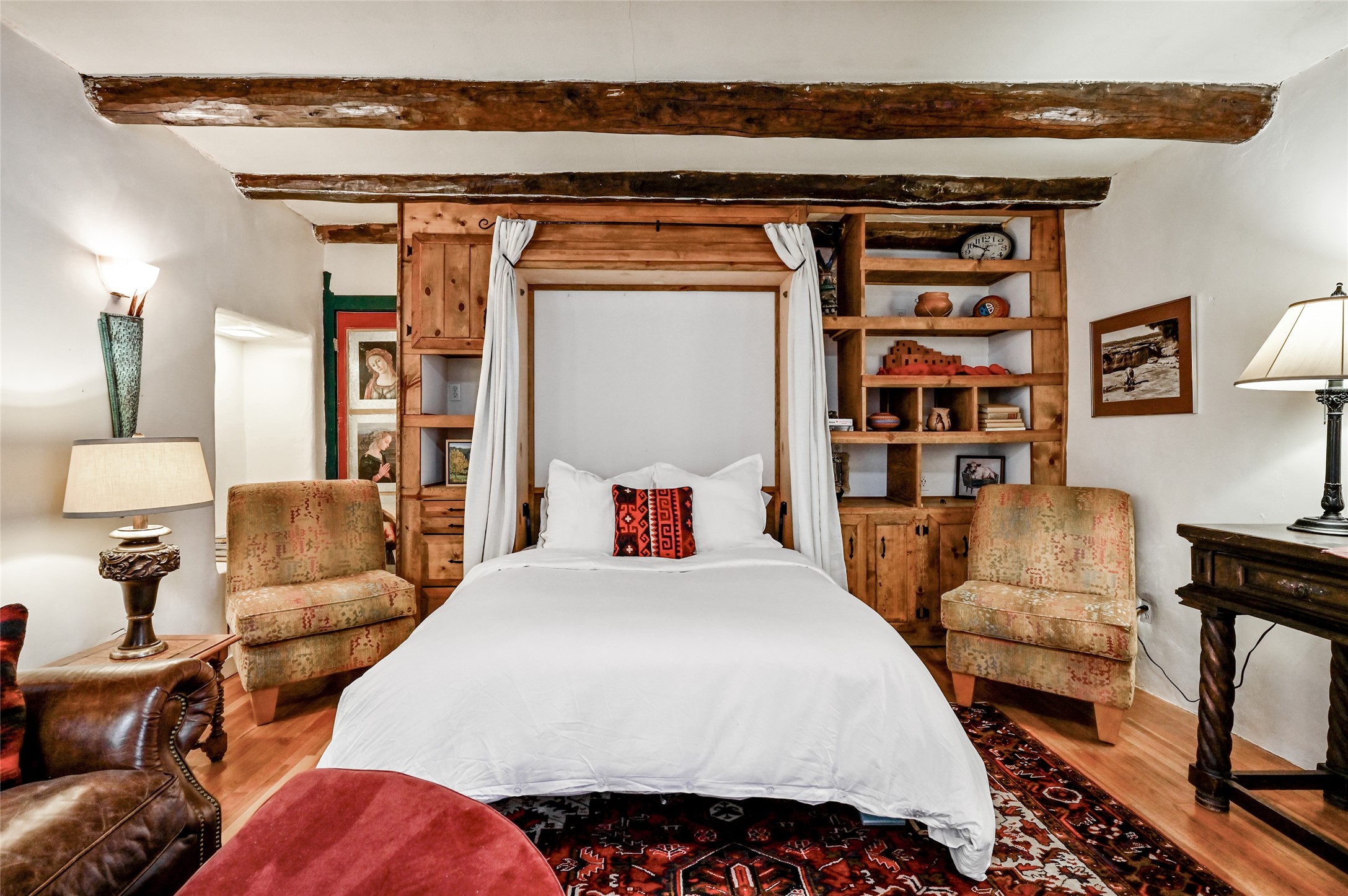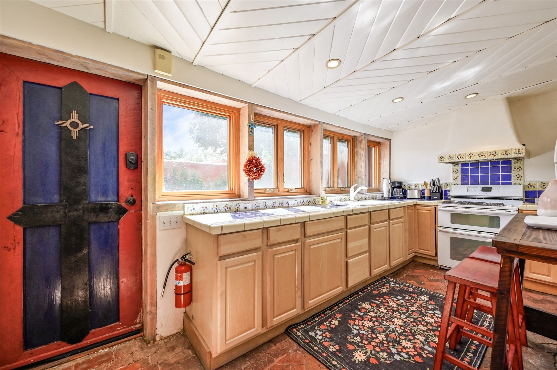 Step into Old World charm with this one-bedroom condo, part of a Pueblo-style adobe dating back to 1921. Outdoor private patio entrance greets you with south facing light. The four large windows bring warm sunlight to the tiled countertop and red bricked floor kitchen. Large dining and living room area offers beautiful old vigas and wood flooring. The pull-out Murphy bed, hidden in the living room, is perfect for those out of town guests or late night sleep-overs. Whimsical hand painted doors throughout pairs beautifully with the colorful mosaic fireplace in the bedroom. Just minutes from Kaune's and the historic Santa Fe Plaza, make this an ideal location for living the Santa Fe dream.