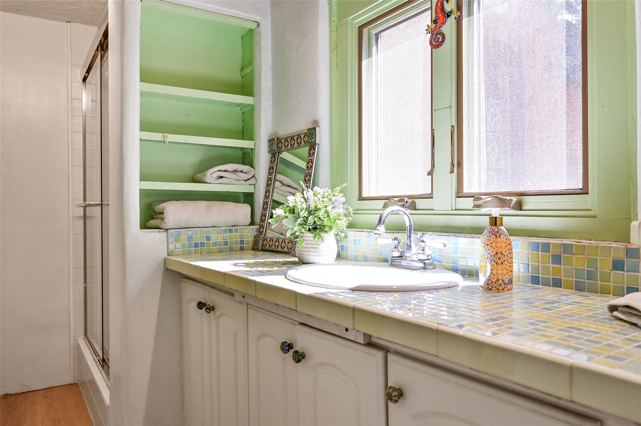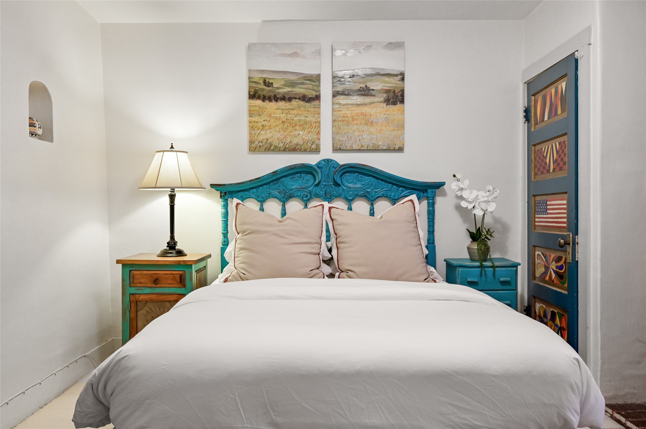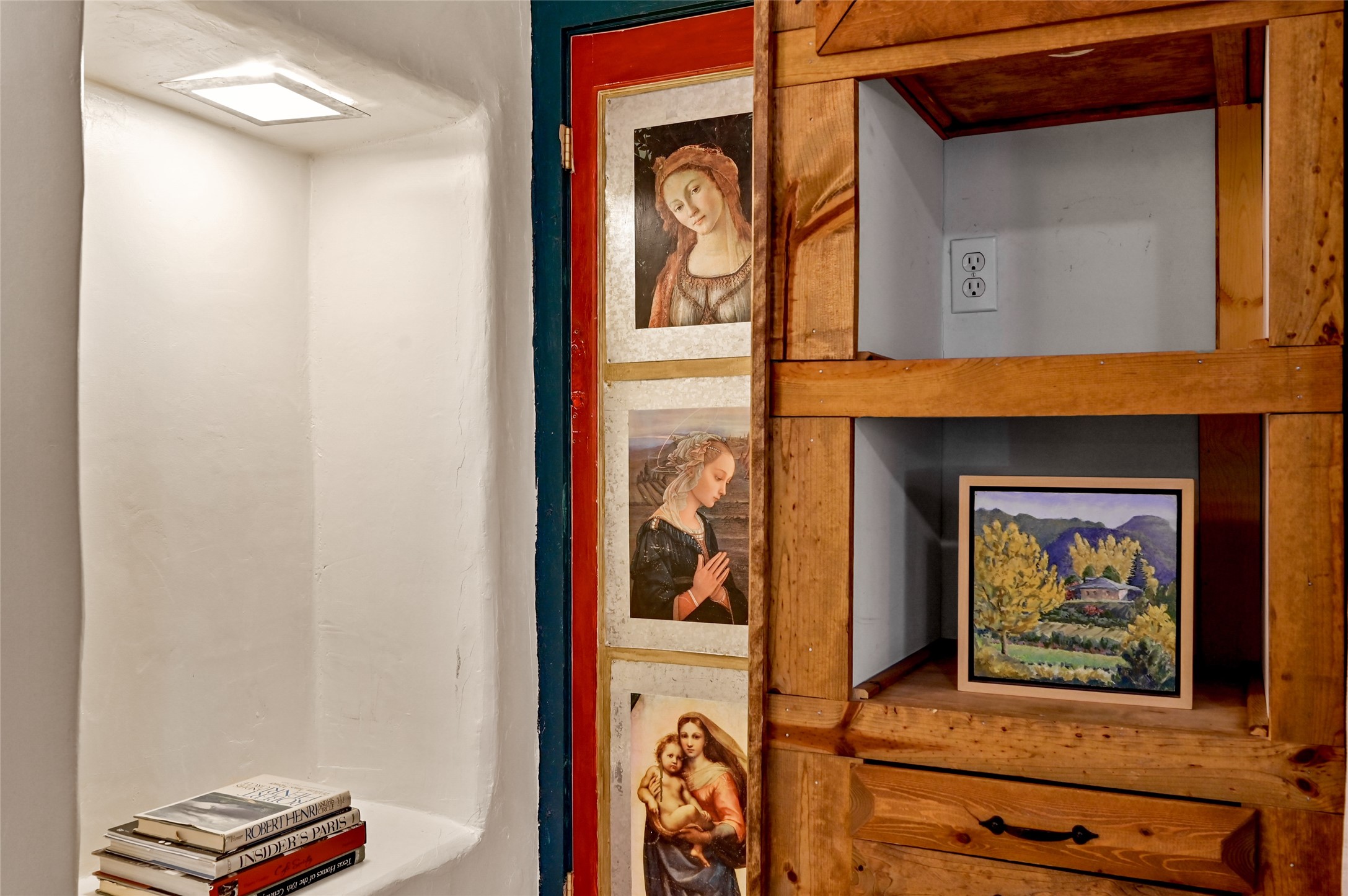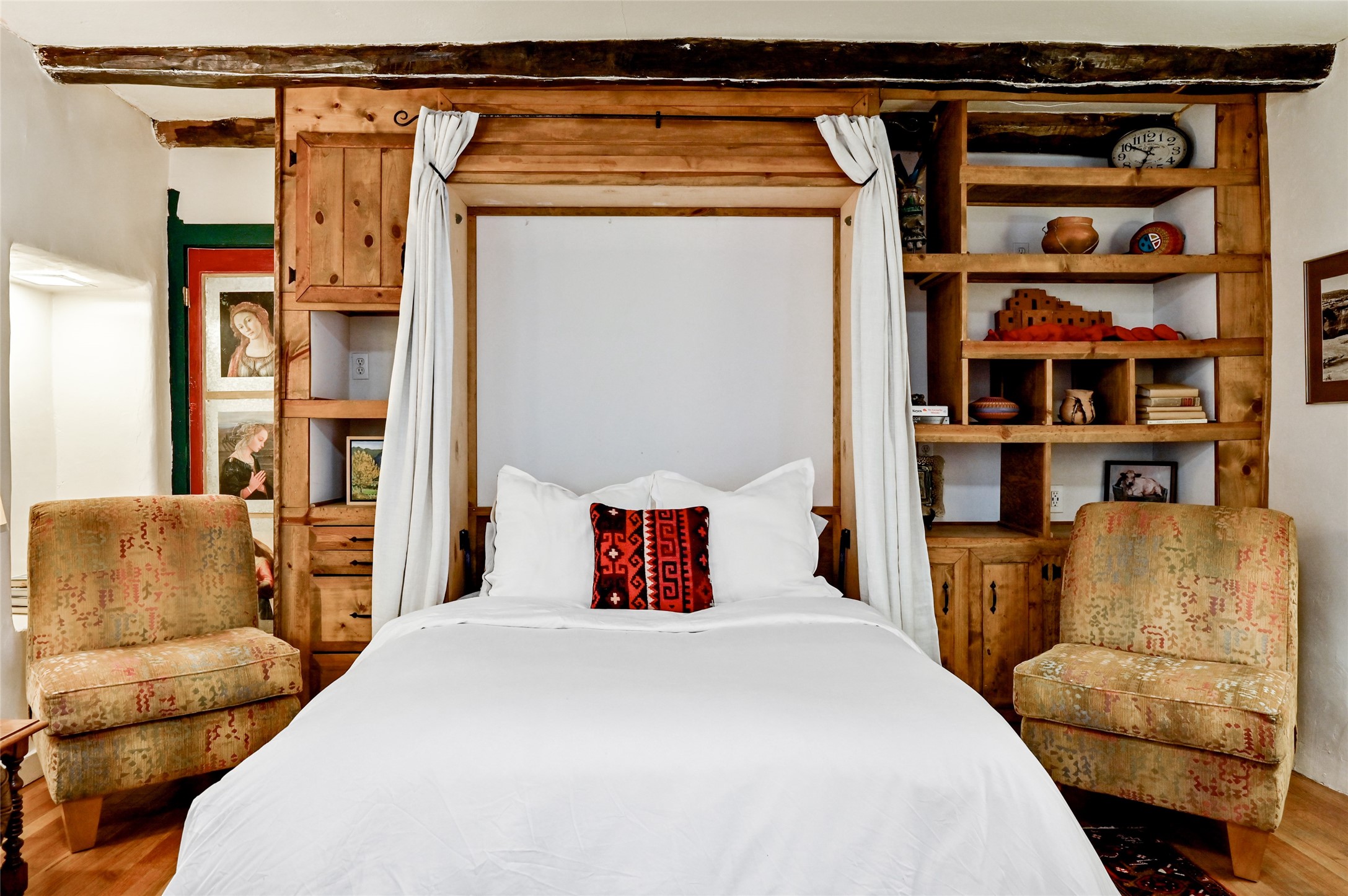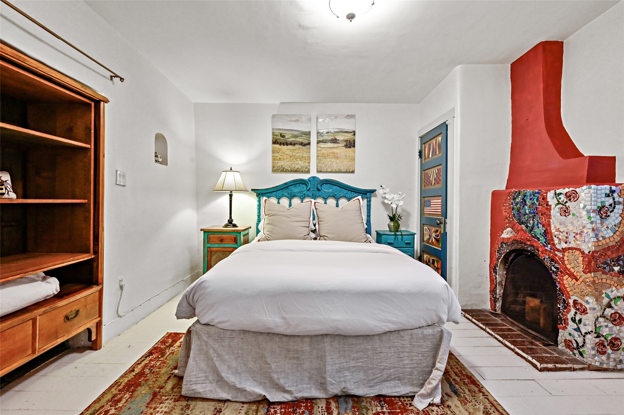 Step into Old World charm with this one-bedroom condo, part of a Pueblo-style adobe dating back to 1921. Outdoor private patio entrance greets you with south facing light. The four large windows bring warm sunlight to the tiled countertop and red bricked floor kitchen. Large dining and living room area offers beautiful old vigas and wood flooring. The pull-out Murphy bed, hidden in the living room, is perfect for those out of town guests or late night sleep-overs. Whimsical hand painted doors throughout pairs beautifully with the colorful mosaic fireplace in the bedroom. Just minutes from Kaune's and the historic Santa Fe Plaza, make this an ideal location for living the Santa Fe dream.