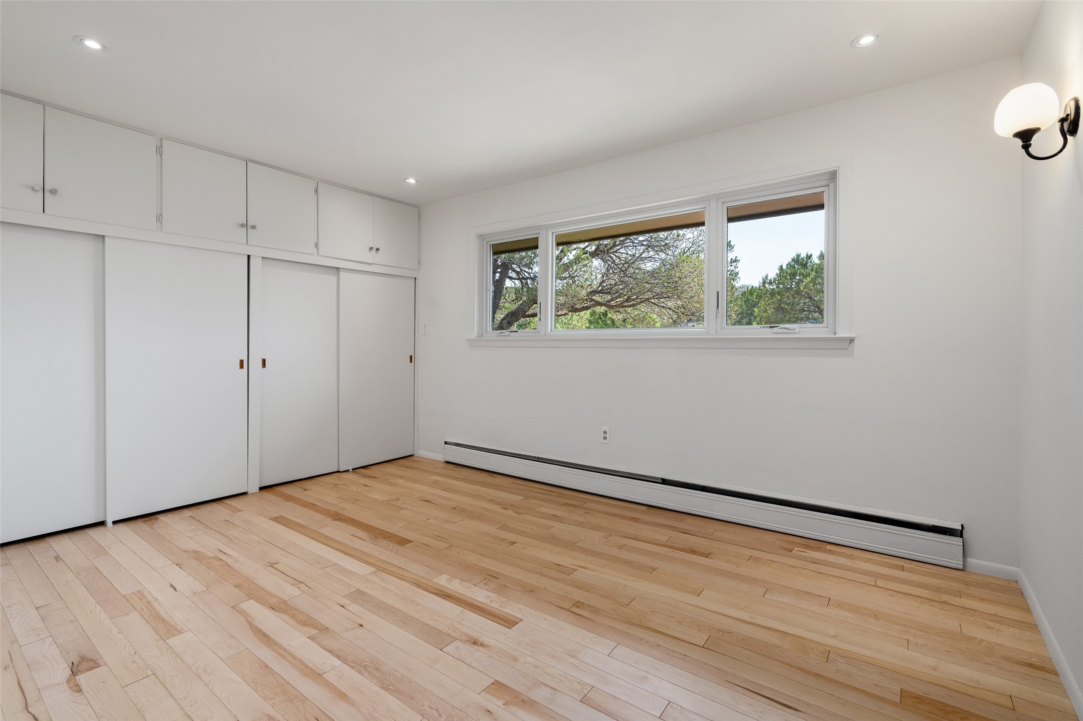 Set apart from the ordinary and just 2.5 miles from the Santa Fe Plaza, this striking custom Stamm home blends classic Northern New Mexico pitched-roof architecture with timeless Santa Fe charm. Sited on a generous 0.70-acre lot with expansive views of the foothills and Ortiz Mountains, this home offers a rare sense of space and privacy -- all while keeping you close to the heart of town. Thoughtfully renovated throughout, the main residence features three bedrooms, wood floors, and a warm, wood-plank ceiling with exposed beams. The living room centers around a charming brick fireplace flanked by custom bookcases, and the stylish kitchen boasts cool glass tile backsplash, great gas cook top, ample storage, and even a wood burning fireplace for ambiance. The sunlit primary suite includes California Closets and a beautifully modern bath with a large walk-in shower. A fully operational photovoltaic solar system helps keep energy costs low. A standout feature of the property is the detached 750-square-foot studio -- complete with its own 100-amp service, bath, soaring ceilings, custom wrought iron doors, and an upstairs loft (not included in the listed square footage). Whether you're an artist, entrepreneur, or simply seeking bonus flex space, this studio delivers. Recent improvements include a Propanel roof, new Anderson windows, high efficiency tankless water heater, remodeled bathrooms, new tile and wood flooring, updated kitchen countertops (2024), all-new interior lighting (2023), and fresh paint throughout (2025). This is a one-of-a-kind offering that feels private and peaceful -- yet is mere minutes from galleries, dining, and all the cultural vibrancy of downtown Santa Fe.