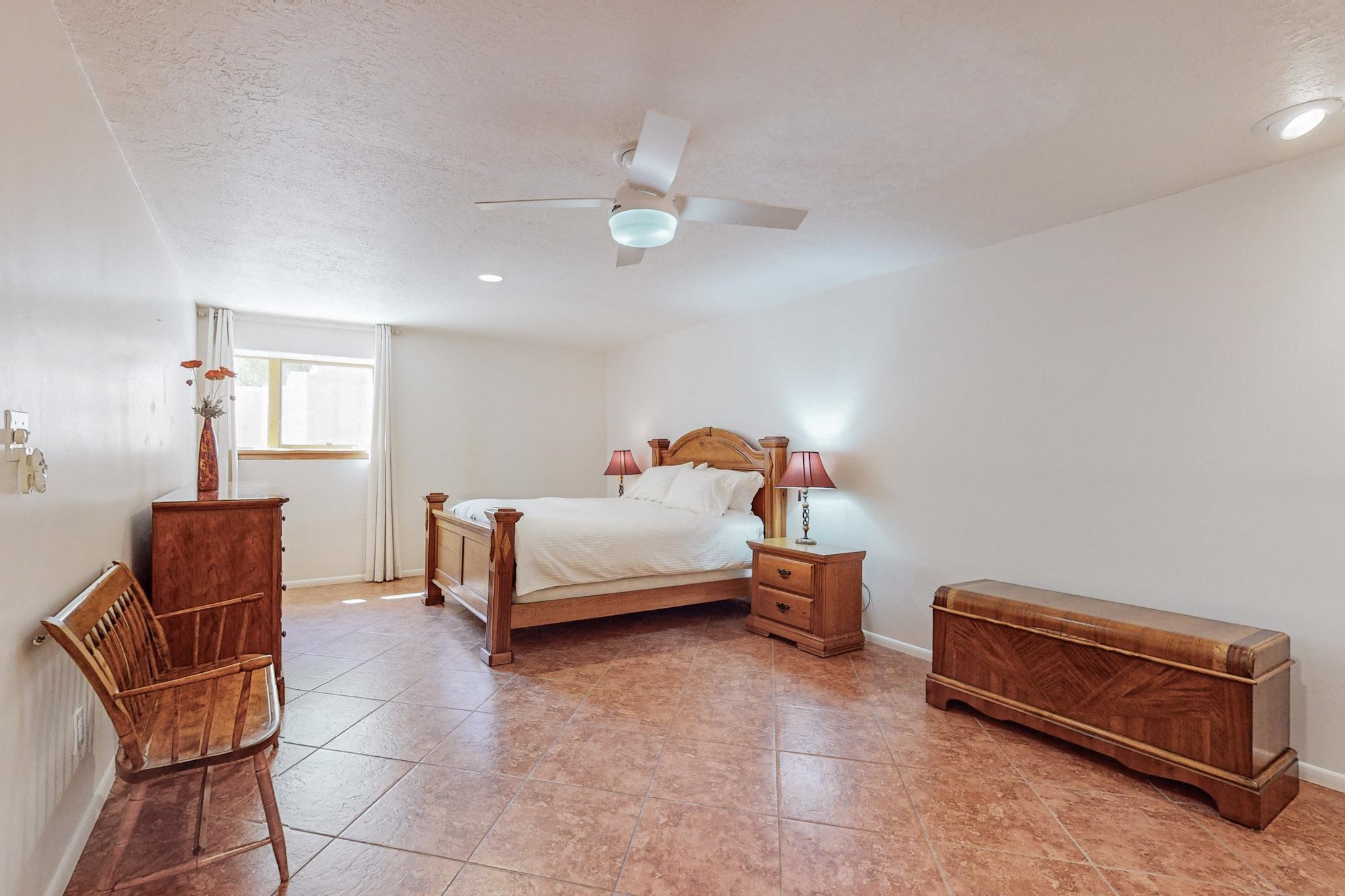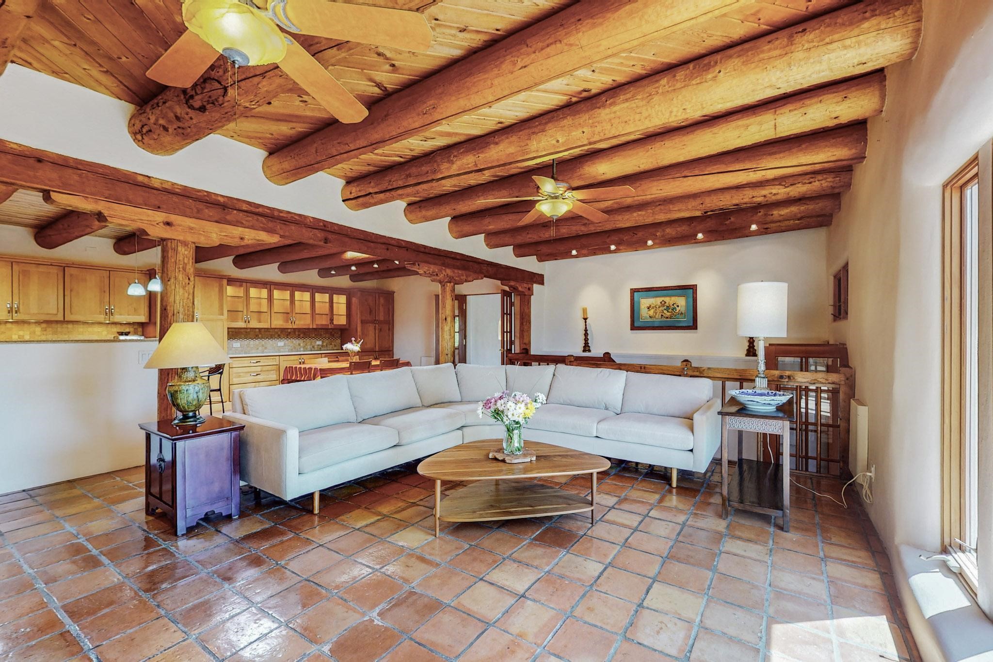 A rare offering in Northern Santa Fe County, this solar-powered berm home and guest house sit on two acres beside protected public land, where expansive views, established gardens, and access to nearby trails define the setting. Located approximately 30 minutes from Santa Fe and Los Alamos, the property blends Southwest architectural character with a thoughtfully cultivated landscape.Gardens lovingly tended for more than two decades surround the home with fruit trees, vegetables, flowering plants, and open skies. The property includes approximately 5,300 square feet of living space with a main residence and a separate guest house, offering a total of 7 bedrooms and 4 bathrooms. The guest house includes 3 bedrooms and 1 bath and may provide flexible use for guests, multi-generations, or as a rental.The south-facing main residence features an open-concept great room and kitchen with custom handmade cabinetry, skylights, traditional vigas, Saltillo tile flooring, a large walk-in pantry with full-size refrigerator, and a newer dishwasher. A spacious 700-square-foot studio/sunroom with high ceilings and 7-foot south-facing windows overlooks a courtyard garden.The main level includes one bedroom and one full bath, while the lower level offers three bedrooms, two bathrooms, and additional storage. The primary bath features a Jacuzzi tub.The main home was constructed as a solar-powered berm home which provides natural energy efficiency and stable interior temperatures throughout the year. Additional features include evaporative cooling, wall-mounted panel heaters, a Scandinavian wood stove, and a gas-powered Adobelite kiva fireplace.Outdoor spaces include expansive views, a rooftop seating area, and an established orchard and gardens supported by a 10,000-gallon rainwater catchment cistern with automated drip irrigation. A new septic tank and leach field were installed in August 2024. Zoned Traditional Community: potential for multiple dwellings or retreat center.