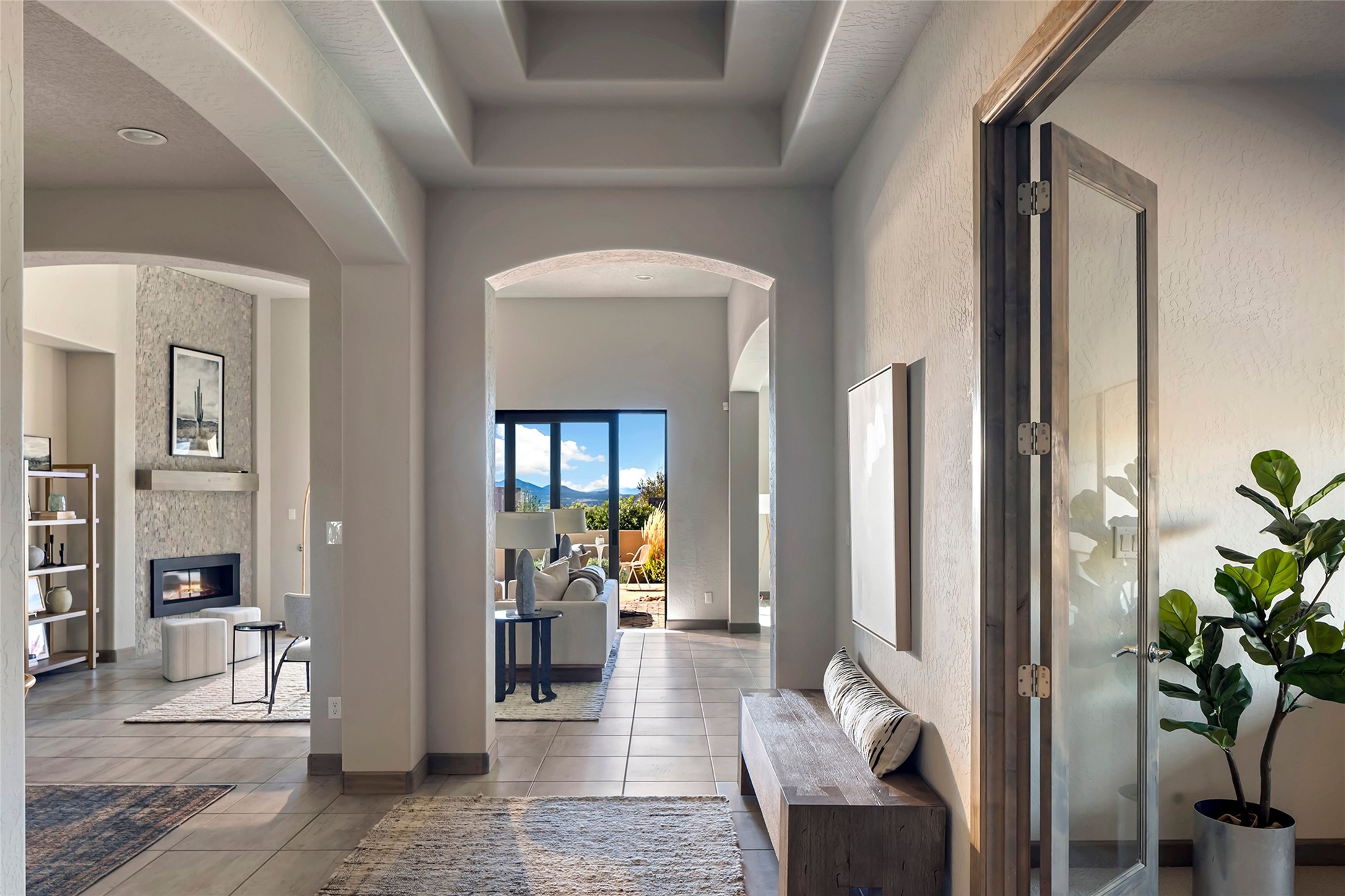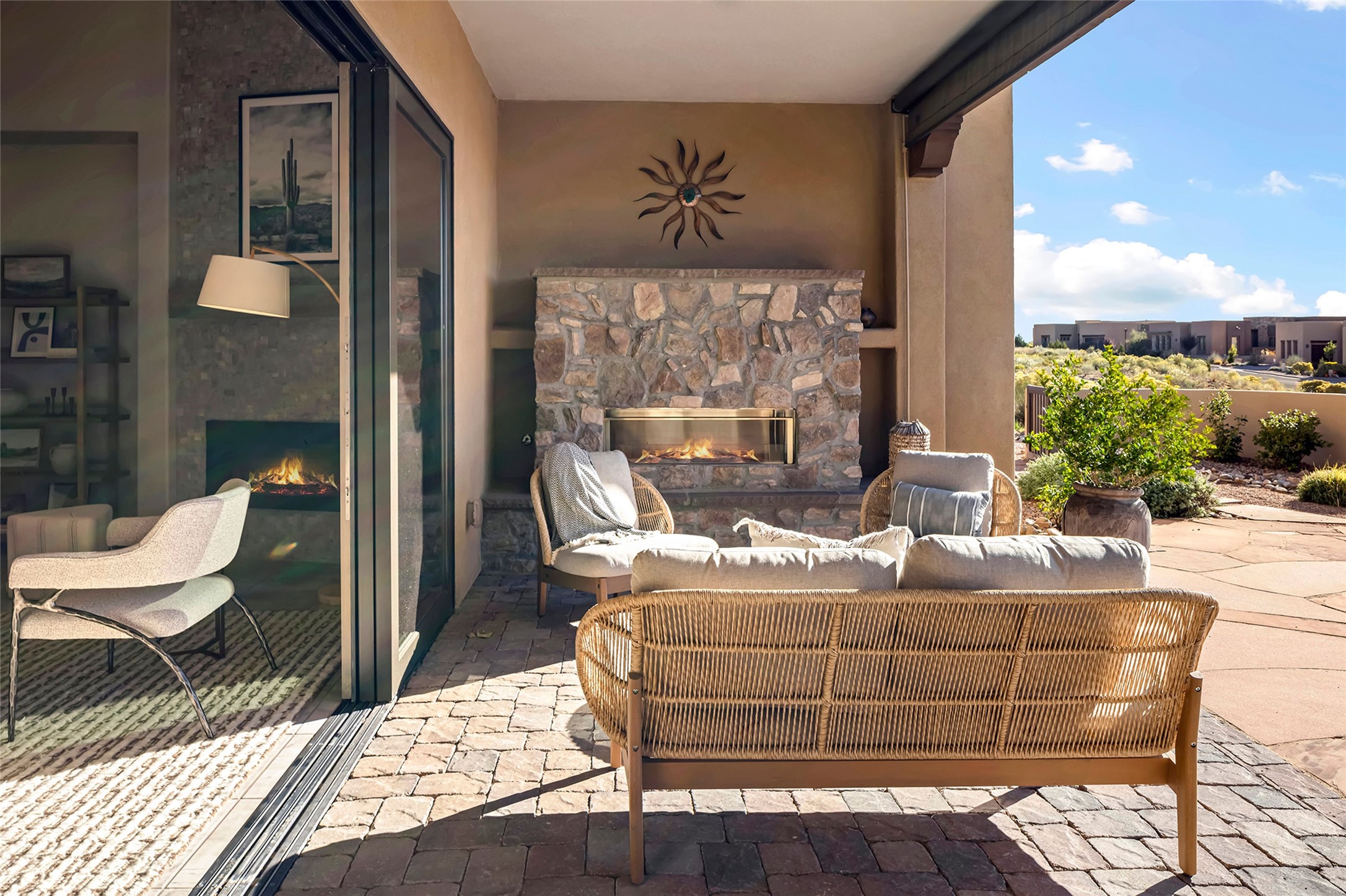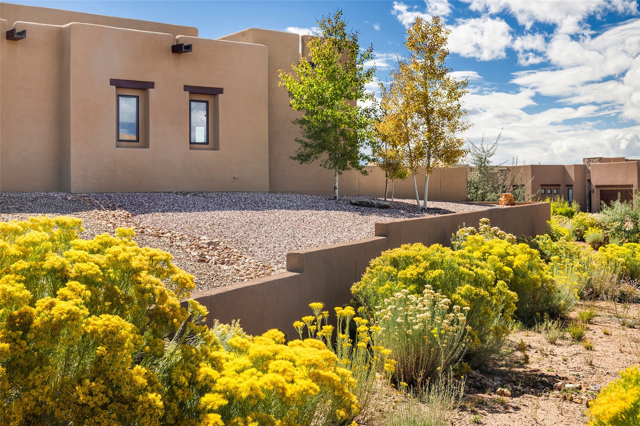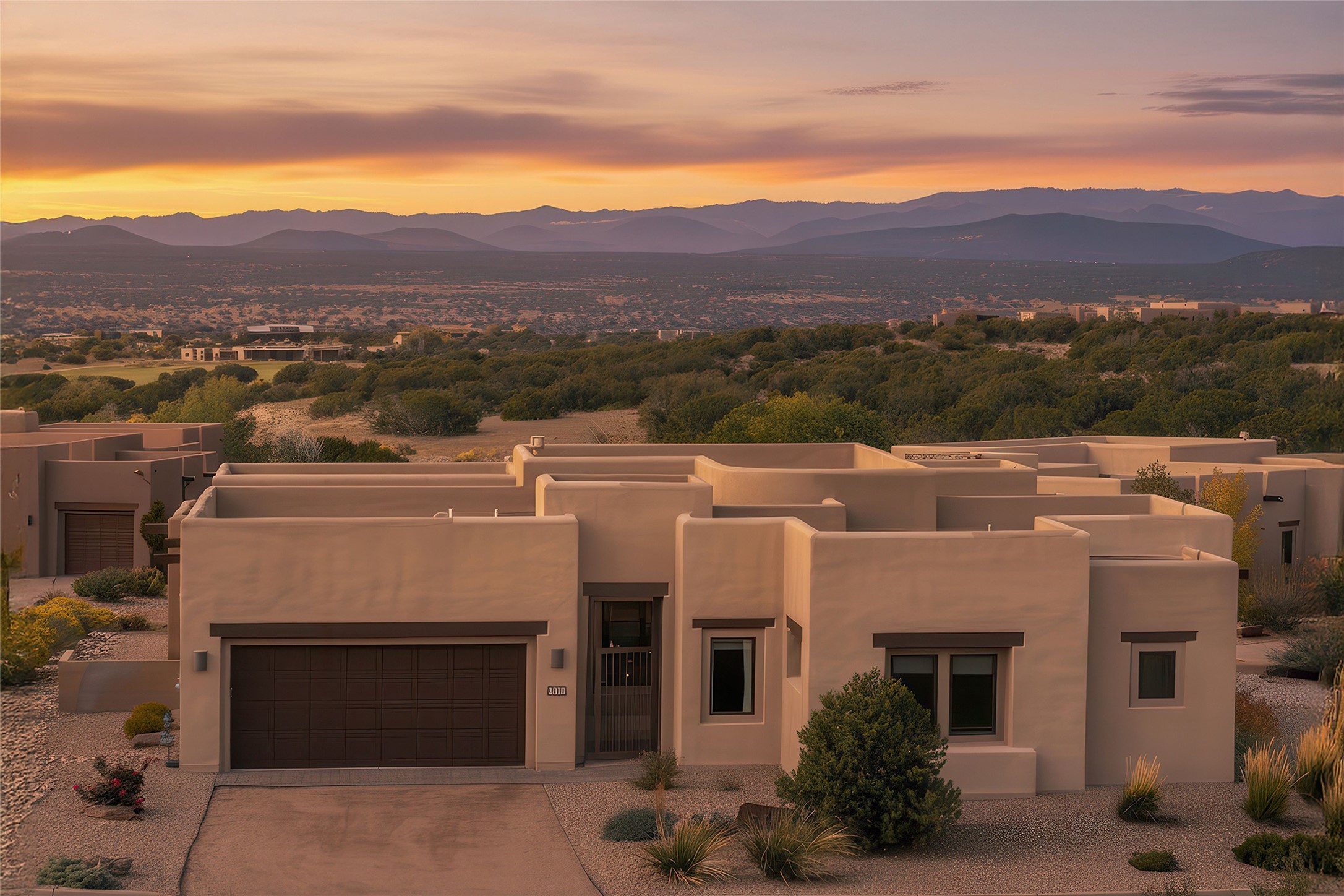 Live the Ultimate Las Campanas Lifestyle. Beautifully sited on a premier elevated corner lot, this exceptional 4-bedroom residence captures breathtaking Jemez Mountain and dramatic sunset views. Located within walking distance of The Club at Las Campanas, this home perfectly blends sophisticated modern design with the timeless essence of Santa Fe. The thoughtfully designed floor plan impresses from the moment you enter, featuring a spectacular living room ideal for both relaxed living and grand entertaining. Western views frame the space, while a modern gas fireplace with stone surround and mantle, and retractable glass doors, create a seamless indoor-outdoor living experience. The chef's island kitchen delights with a generous natural stone breakfast bar, modern appliances, and a large walk-in pantry. This culinary haven flows effortlessly into both a gracious formal dining room and a casual dining area--each with mountain views, designer lighting, and portal access for al fresco dining. The private, luxurious primary suite offers Jemez Mountain views, a cozy sitting area, and a spa-inspired bath with a spacious walk-in shower, dual vanities, and an expansive walk-in closet. Separate from the main living areas, the light-filled office (or 4th bedroom) with glass French doors provides the perfect work-from-home retreat. Two additional guest suites, each with ensuite baths, share a comfortable secondary living area or media room. The outdoor living experience is elevated with vast entertaining areas, a covered portal, an outdoor fireplace, and tranquil landscaping that enhances the home's serene ambiance. With its quality finishes, soft natural light, welcoming gated front entrance courtyard, newly installed carpet and a neutral palette throughout, this special Las Campanas home defines refined living and represents an exceptional value--move-in ready and not to be missed. The owner's Equity Golf Membership to The Club at Las Campanas is available for purchase.