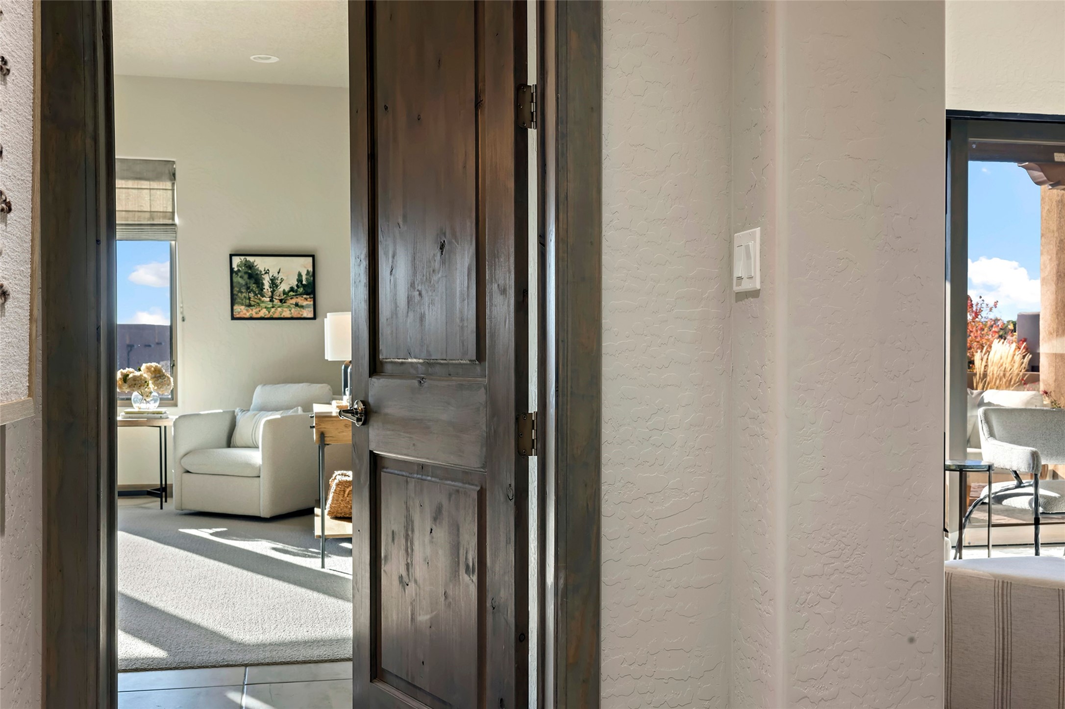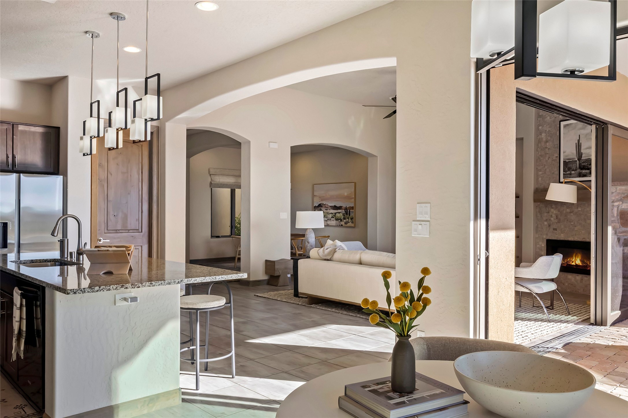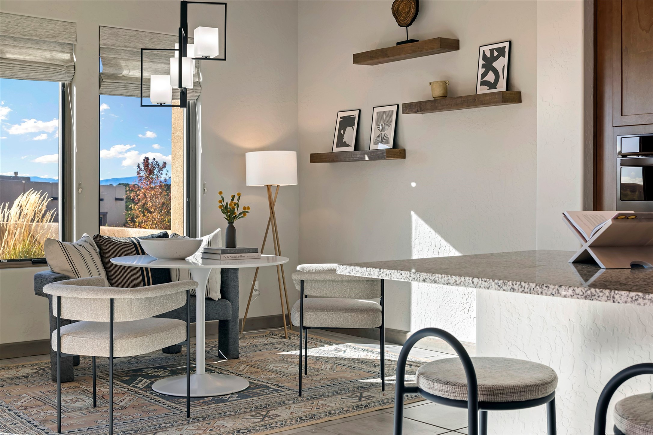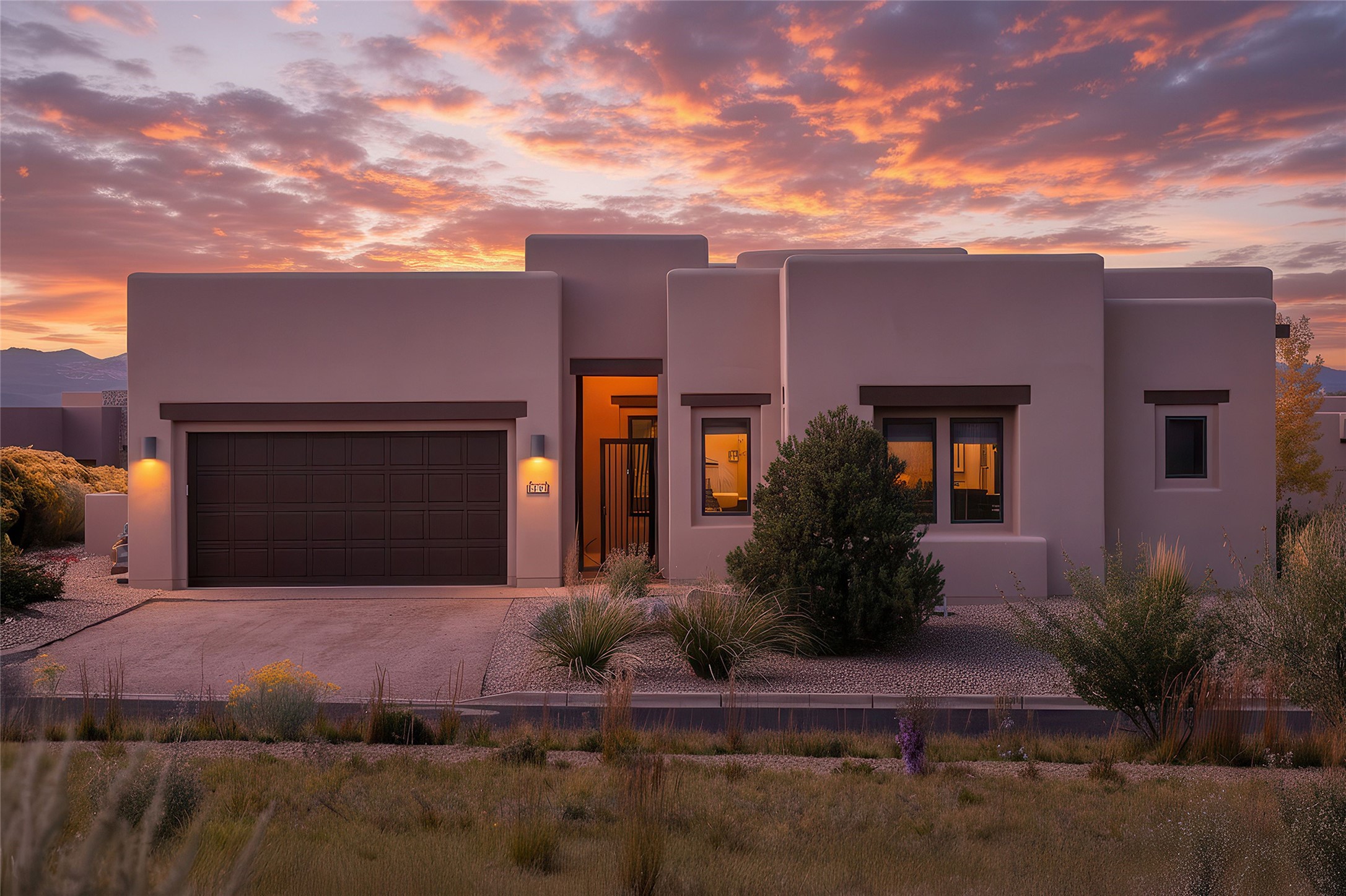 Live the Ultimate Las Campanas Lifestyle. Beautifully sited on a premier elevated corner lot, this exceptional 4-bedroom residence captures breathtaking Jemez Mountain and dramatic sunset views. Located within walking distance of The Club at Las Campanas, this home perfectly blends sophisticated modern design with the timeless essence of Santa Fe. The thoughtfully designed floor plan impresses from the moment you enter, featuring a spectacular living room ideal for both relaxed living and grand entertaining. Western views frame the space, while a modern gas fireplace with stone surround and mantle, and retractable glass doors, create a seamless indoor-outdoor living experience. The chef's island kitchen delights with a generous natural stone breakfast bar, modern appliances, and a large walk-in pantry. This culinary haven flows effortlessly into both a gracious formal dining room and a casual dining area--each with mountain views, designer lighting, and portal access for al fresco dining. The private, luxurious primary suite offers Jemez Mountain views, a cozy sitting area, and a spa-inspired bath with a spacious walk-in shower, dual vanities, and an expansive walk-in closet. Separate from the main living areas, the light-filled office (or 4th bedroom) with glass French doors provides the perfect work-from-home retreat. Two additional guest suites, each with ensuite baths, share a comfortable secondary living area or media room. The outdoor living experience is elevated with vast entertaining areas, a covered portal, an outdoor fireplace, and tranquil landscaping that enhances the home's serene ambiance. With its quality finishes, soft natural light, welcoming gated front entrance courtyard, newly installed carpet and a neutral palette throughout, this special Las Campanas home defines refined living and represents an exceptional value--move-in ready and not to be missed. The owner's Equity Golf Membership to The Club at Las Campanas is available for purchase.