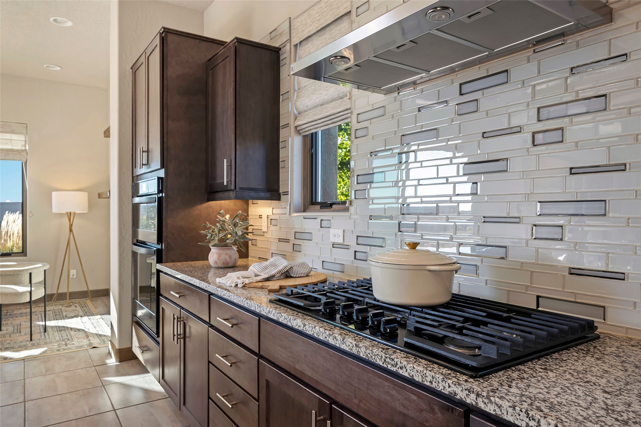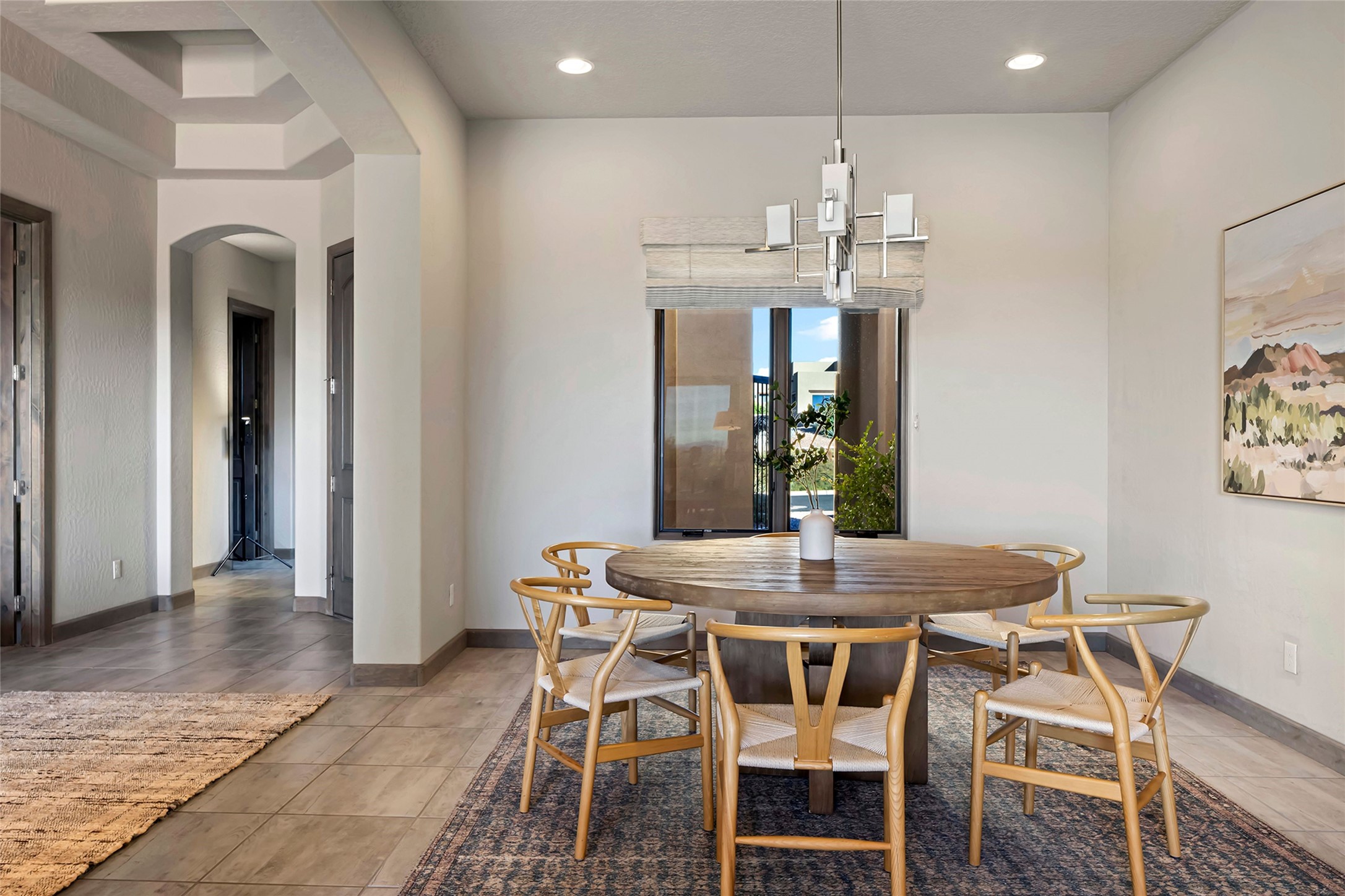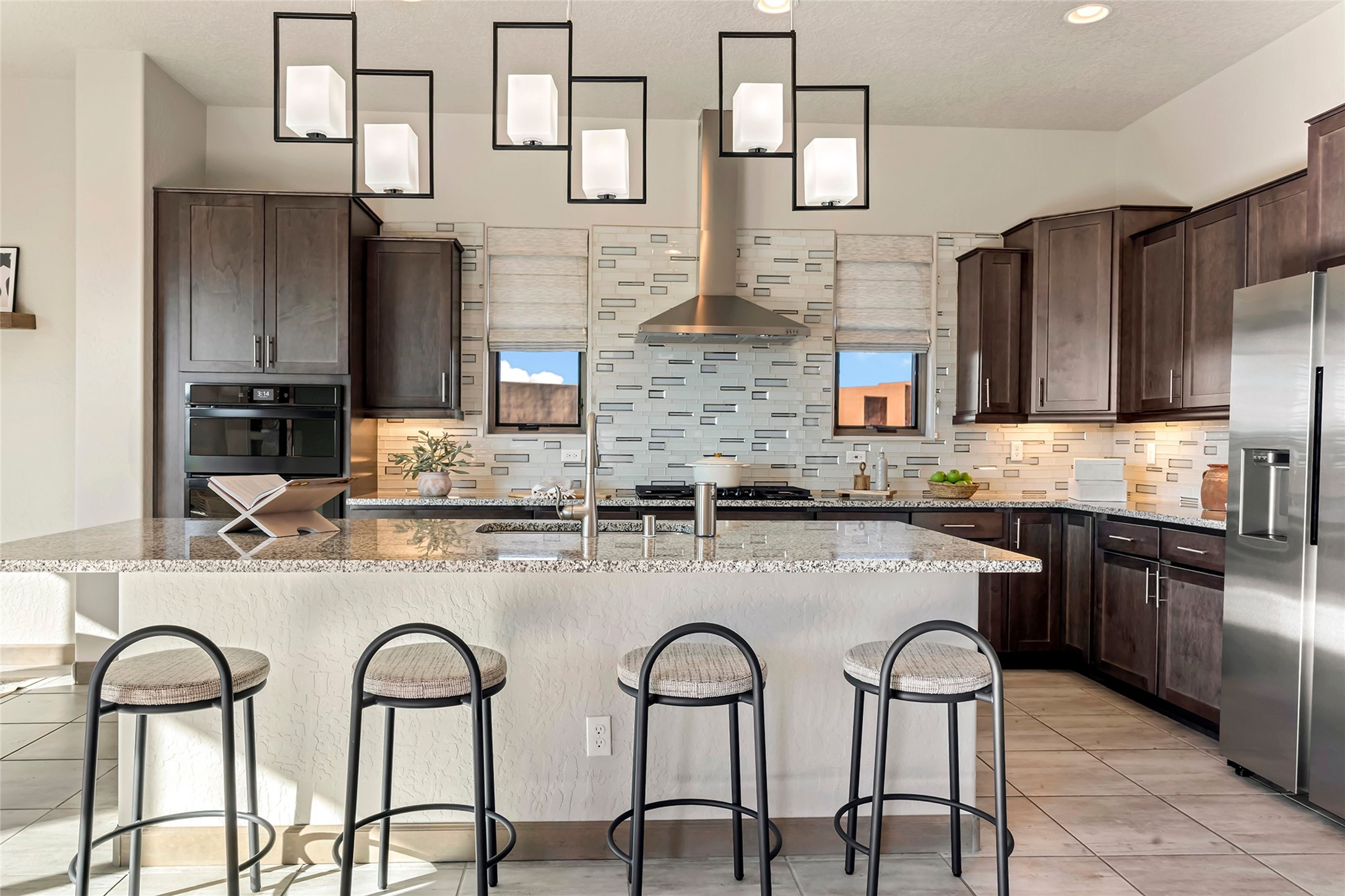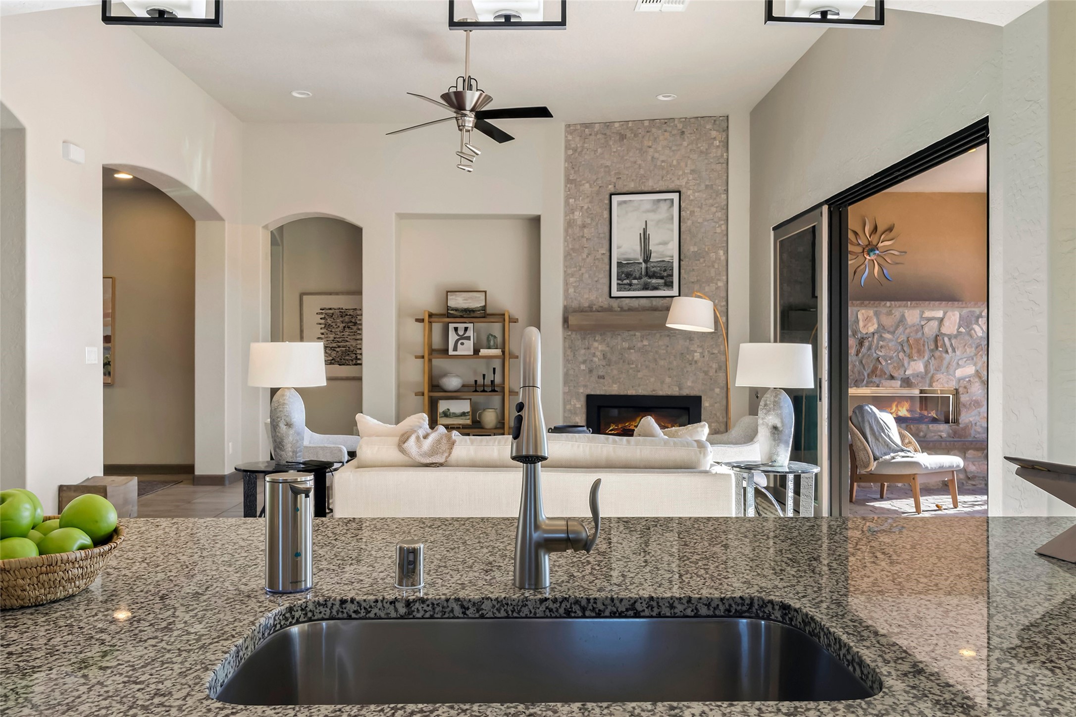 Live the Ultimate Las Campanas Lifestyle. Beautifully sited on a premier elevated corner lot, this exceptional 4-bedroom residence captures breathtaking Jemez Mountain and dramatic sunset views. Located within walking distance of The Club at Las Campanas, this home perfectly blends sophisticated modern design with the timeless essence of Santa Fe. The thoughtfully designed floor plan impresses from the moment you enter, featuring a spectacular living room ideal for both relaxed living and grand entertaining. Western views frame the space, while a modern gas fireplace with stone surround and mantle, and retractable glass doors, create a seamless indoor-outdoor living experience. The chef's island kitchen delights with a generous natural stone breakfast bar, modern appliances, and a large walk-in pantry. This culinary haven flows effortlessly into both a gracious formal dining room and a casual dining area--each with mountain views, designer lighting, and portal access for al fresco dining. The private, luxurious primary suite offers Jemez Mountain views, a cozy sitting area, and a spa-inspired bath with a spacious walk-in shower, dual vanities, and an expansive walk-in closet. Separate from the main living areas, the light-filled office (or 4th bedroom) with glass French doors provides the perfect work-from-home retreat. Two additional guest suites, each with ensuite baths, share a comfortable secondary living area or media room. The outdoor living experience is elevated with vast entertaining areas, a covered portal, an outdoor fireplace, and tranquil landscaping that enhances the home's serene ambiance. With its quality finishes, soft natural light, welcoming gated front entrance courtyard, newly installed carpet and a neutral palette throughout, this special Las Campanas home defines refined living and represents an exceptional value--move-in ready and not to be missed. The owner's Equity Golf Membership to The Club at Las Campanas is available for purchase.