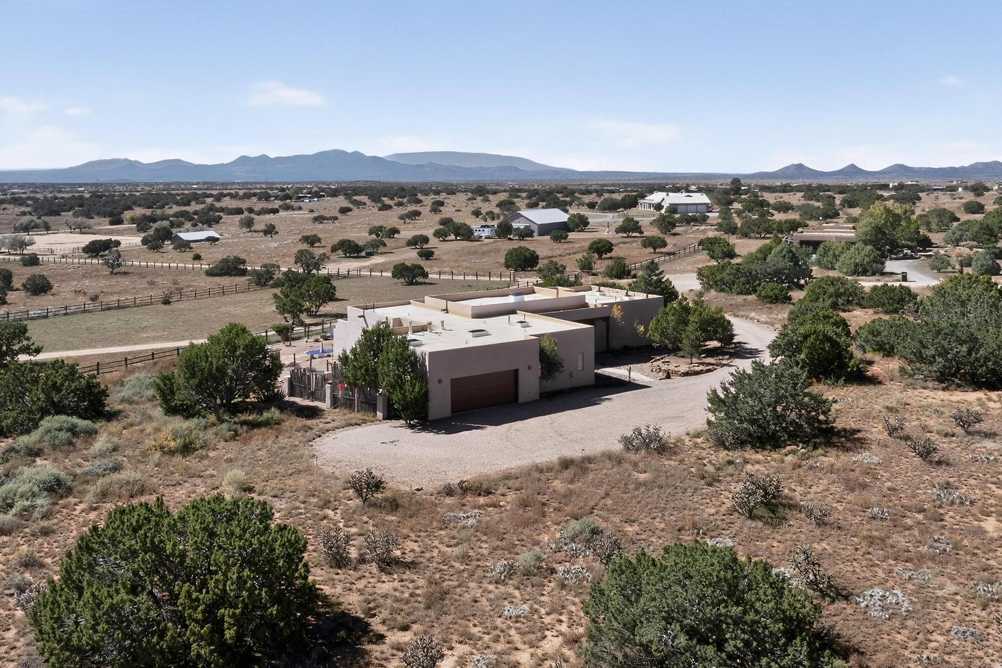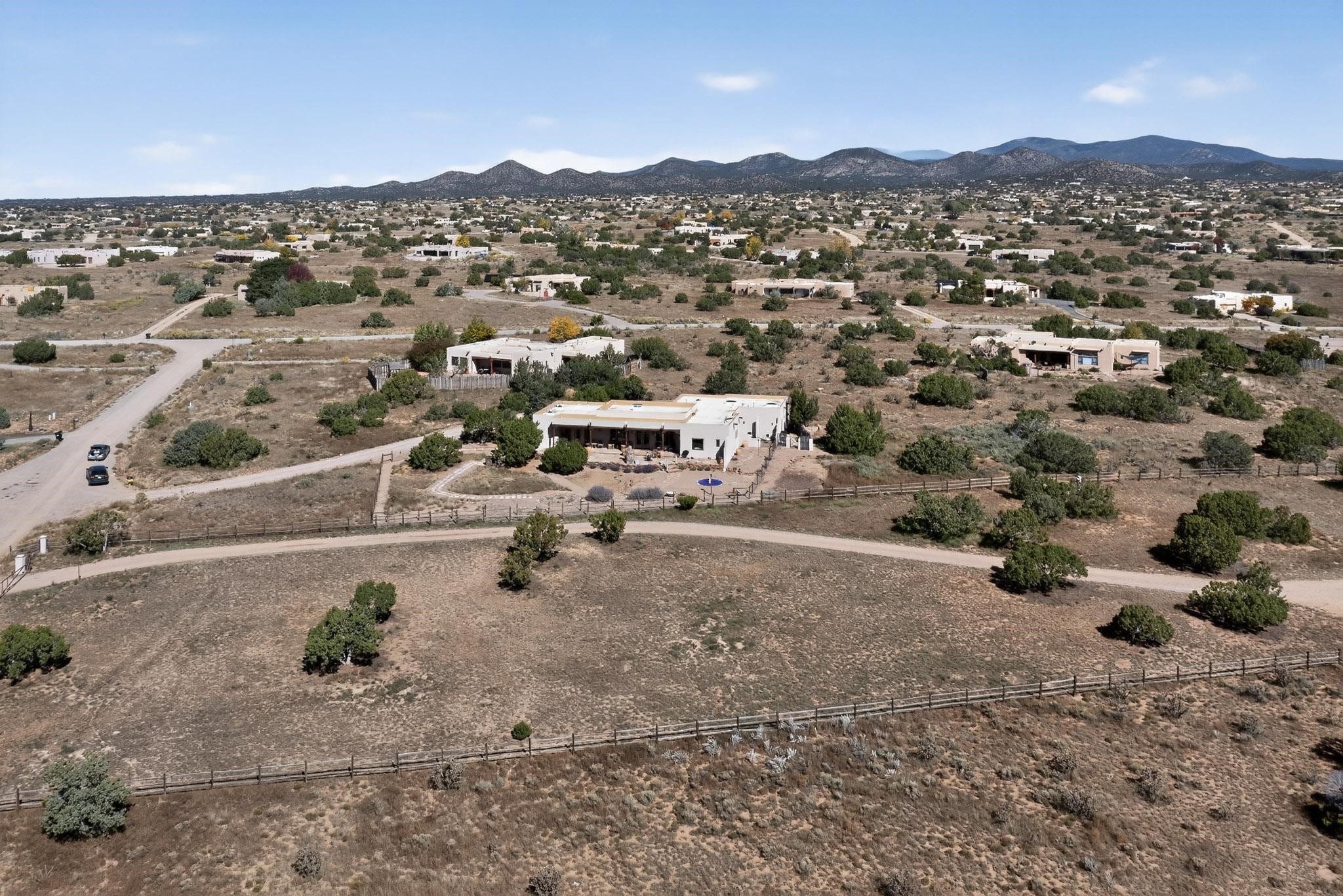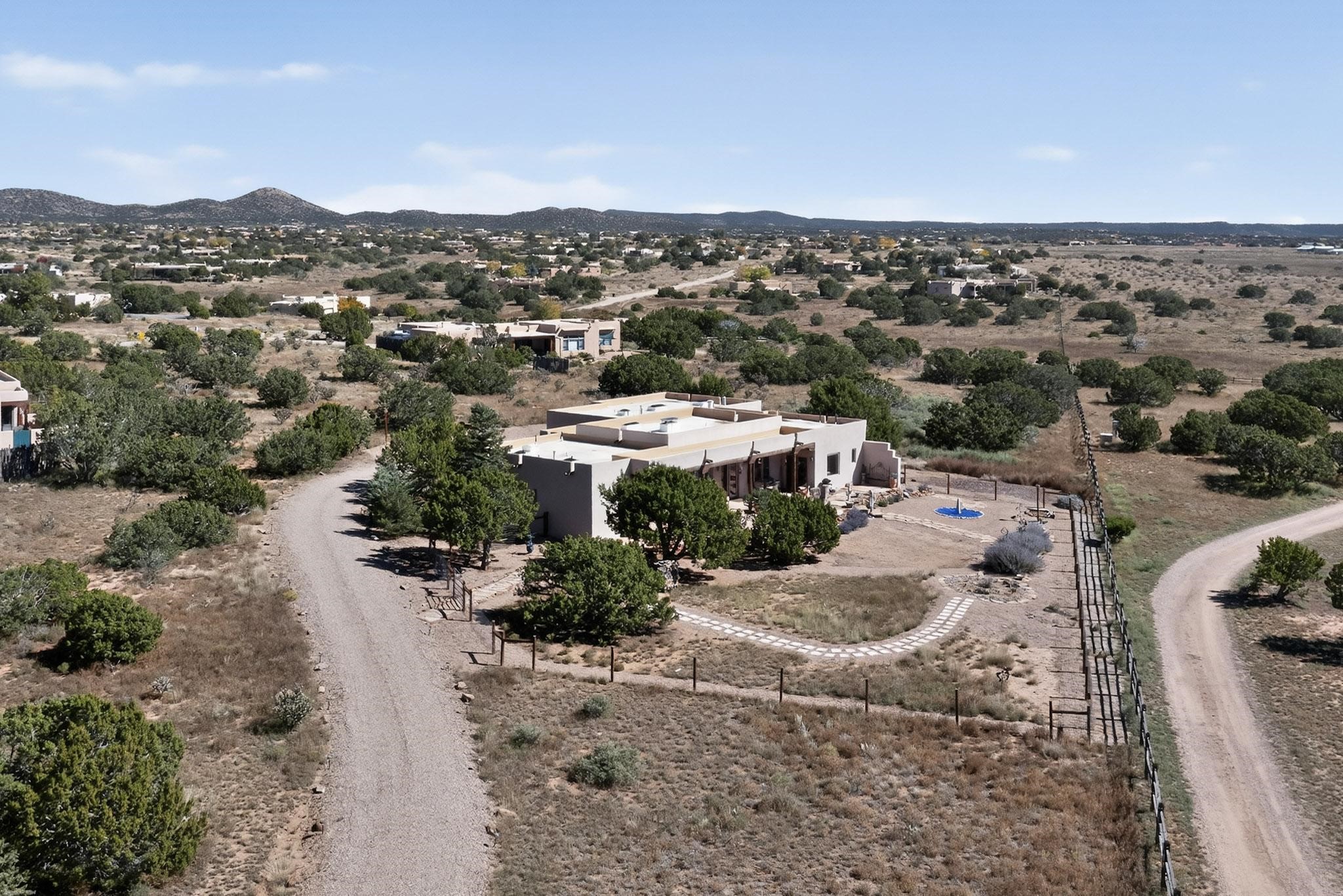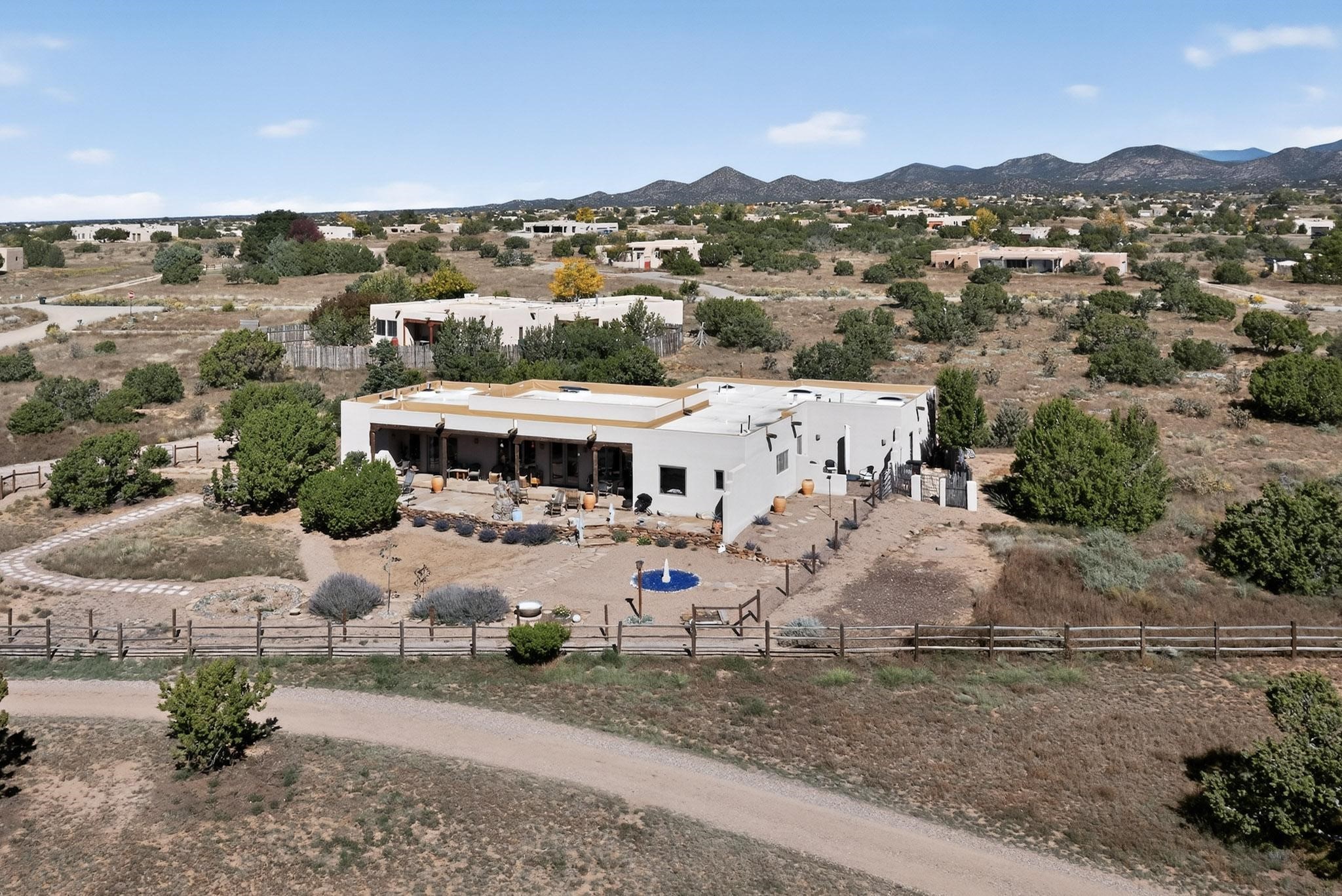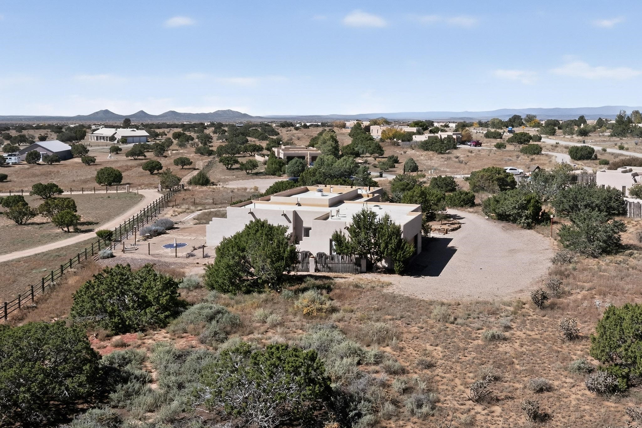 Custom designed and built spacious single level, open plan, split bedroom design in Eldorado bordering Los Caballos. Privacy and fabulous mountain and sunset views from home and portals. There are two unique back to back fireplaces, one in each room, a dramatic Chacoan style stone facing in the family room and a traditional kiva in the family room/study. The private owners suite features two separate 3/4 bath rooms, one with a tub and the other with a walk in sharable shower, plus 2 walk in closets. The laundry room is close by off the hall. The large kitchen includes a breakfast bar and cosy breakfast nook which accesses the south portal and gardens, plus there is an extra half bath for guests. There is a formal dining area with access to a private walled garden and patio. Both guest bedrooms are a good size and share a full bath between them. The oversized 2 car finished garage has plenty of guest parking. Incredible expansive night skies from spacious fenced gardens it is centered on 1 1/2 acres on the south central border of Eldorado. Easy access to all the Eldorado amenities, local shopping centers and only minutes into Santa Fe.