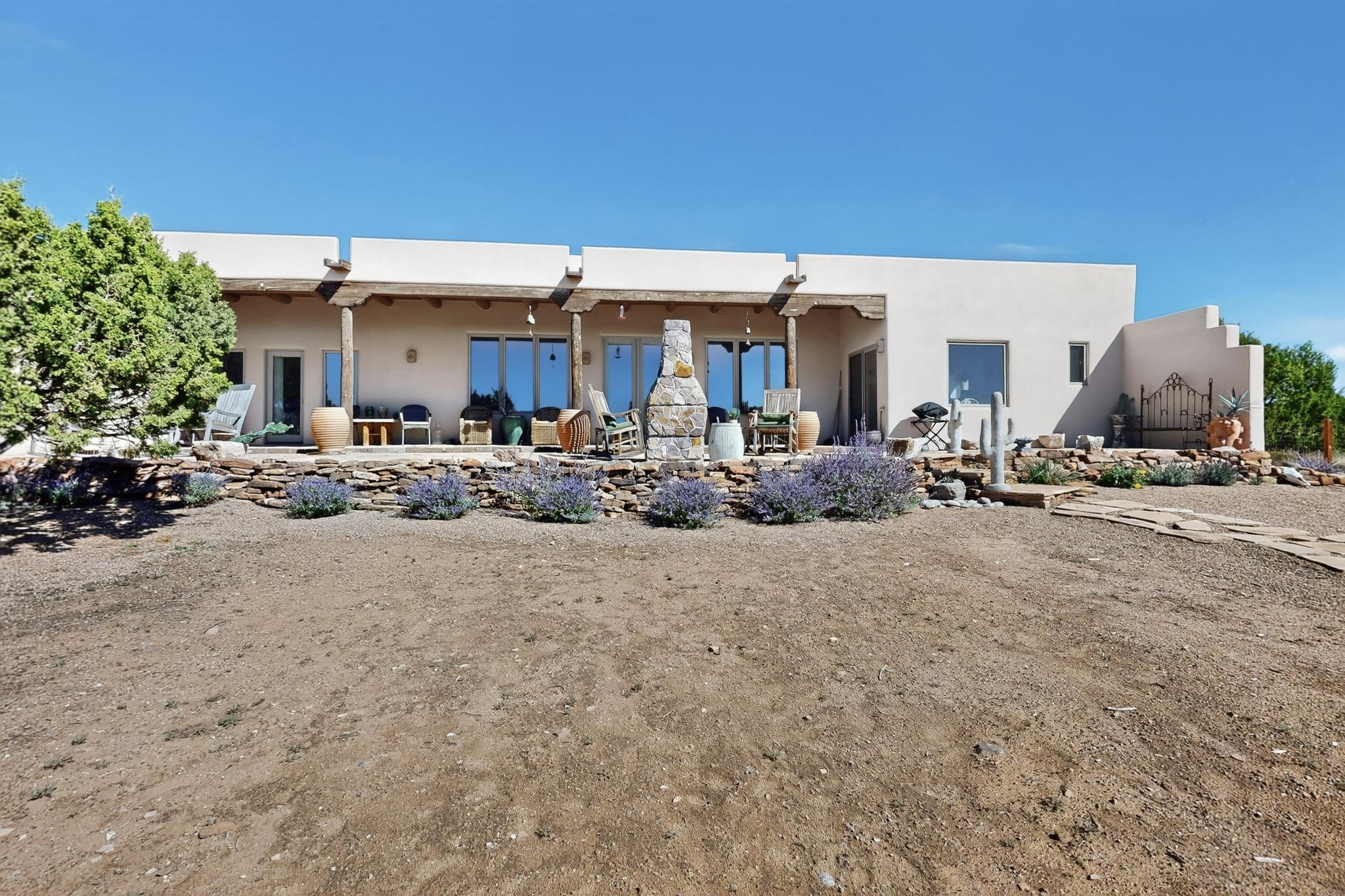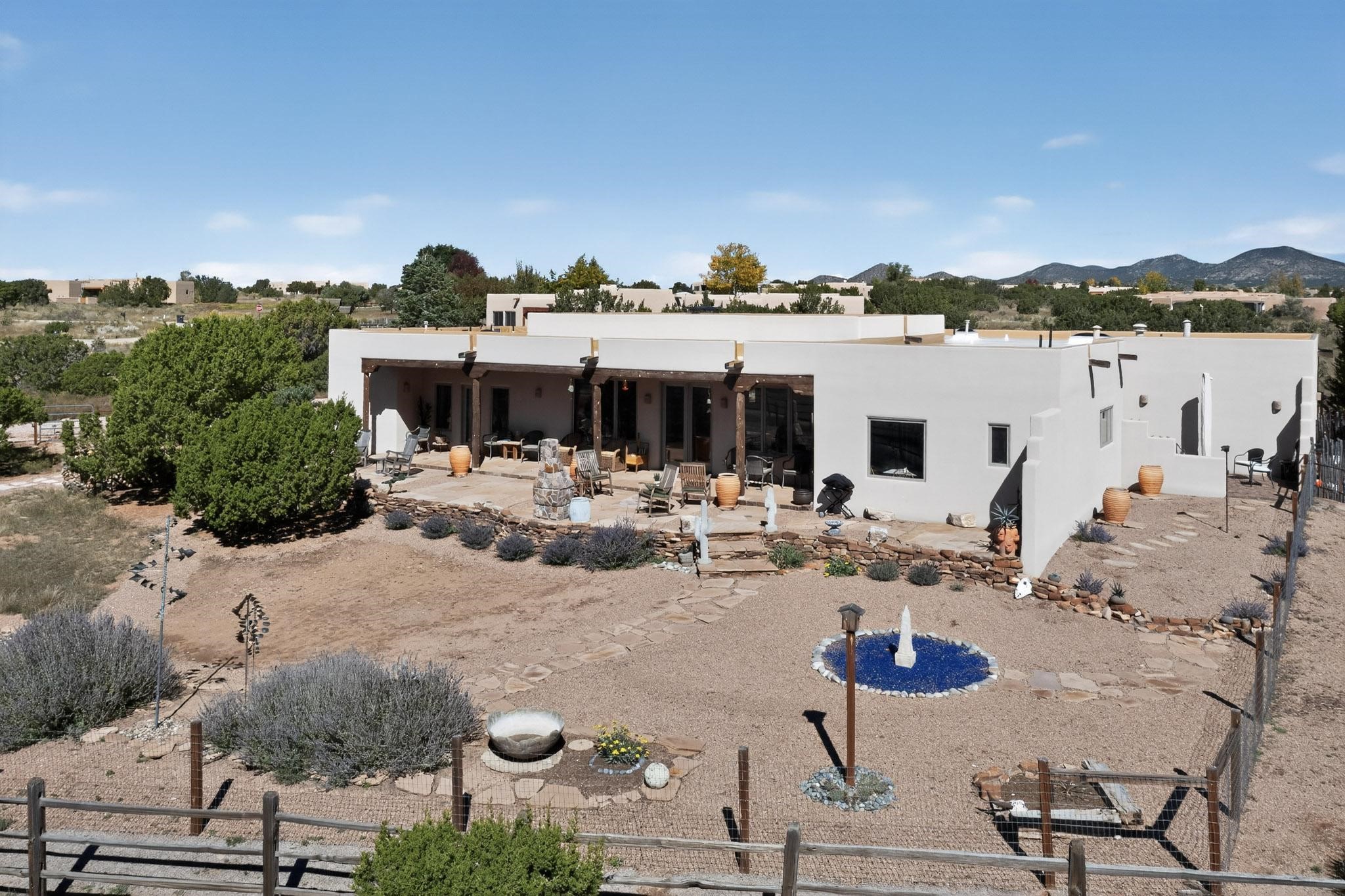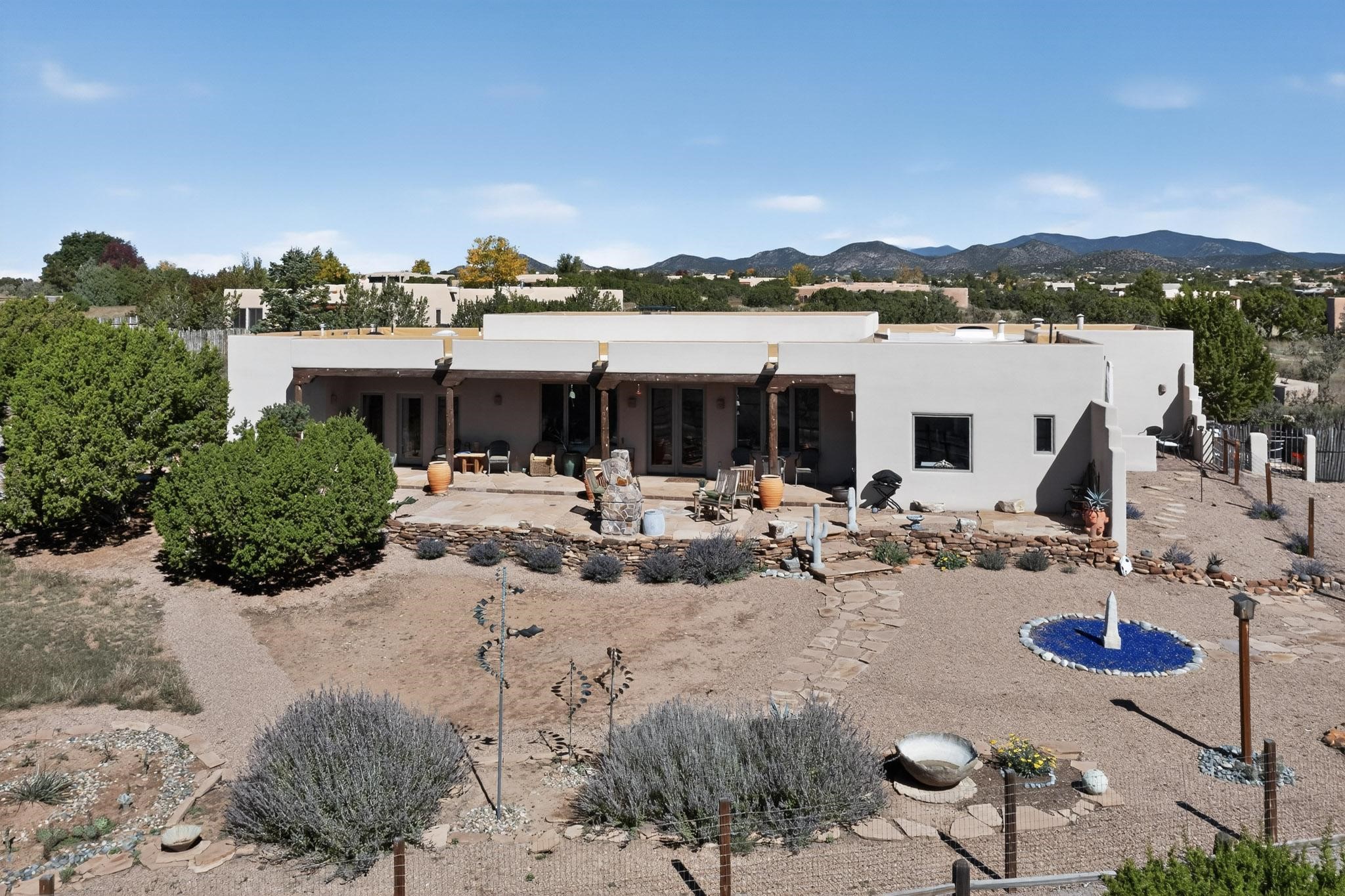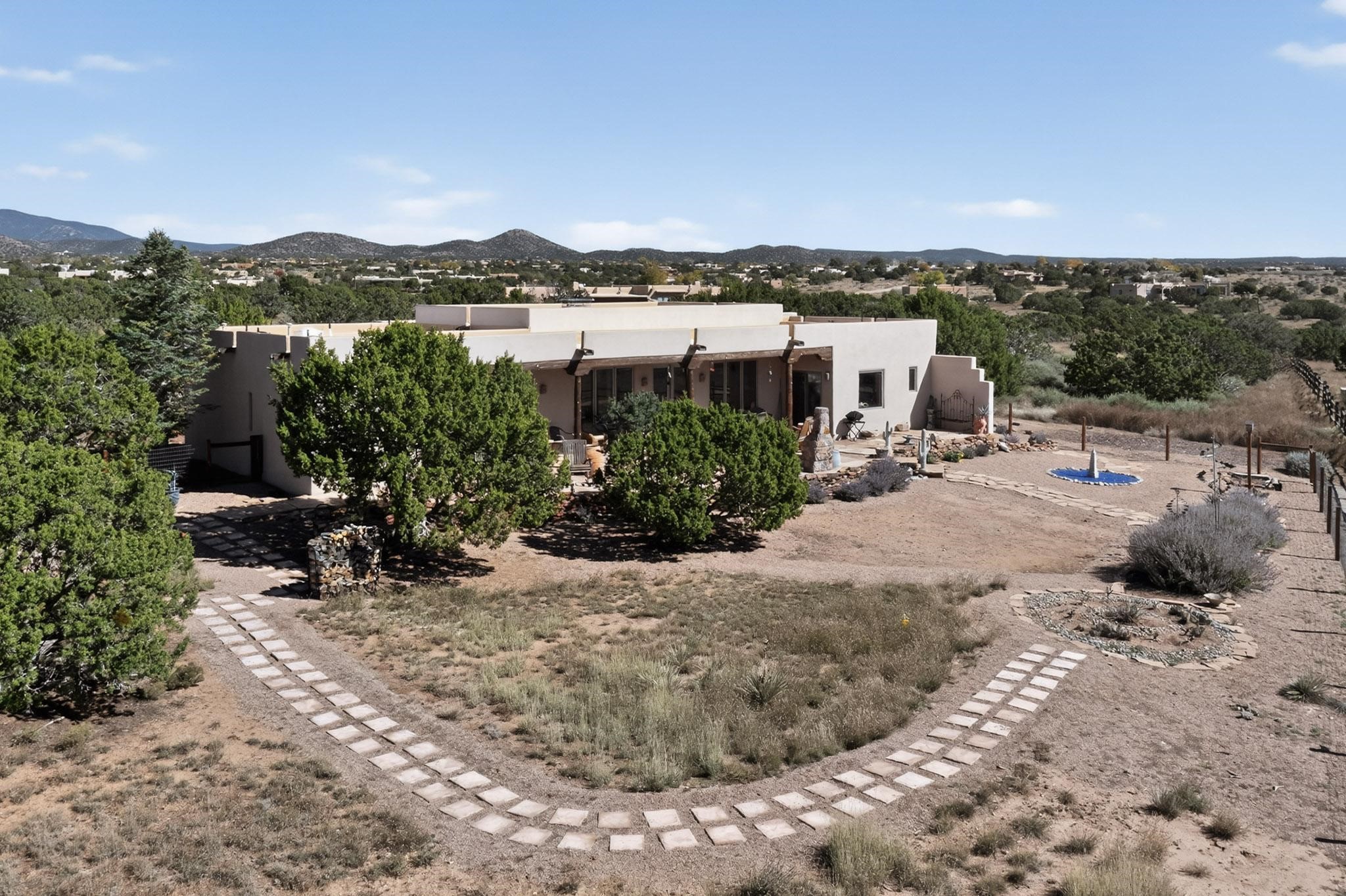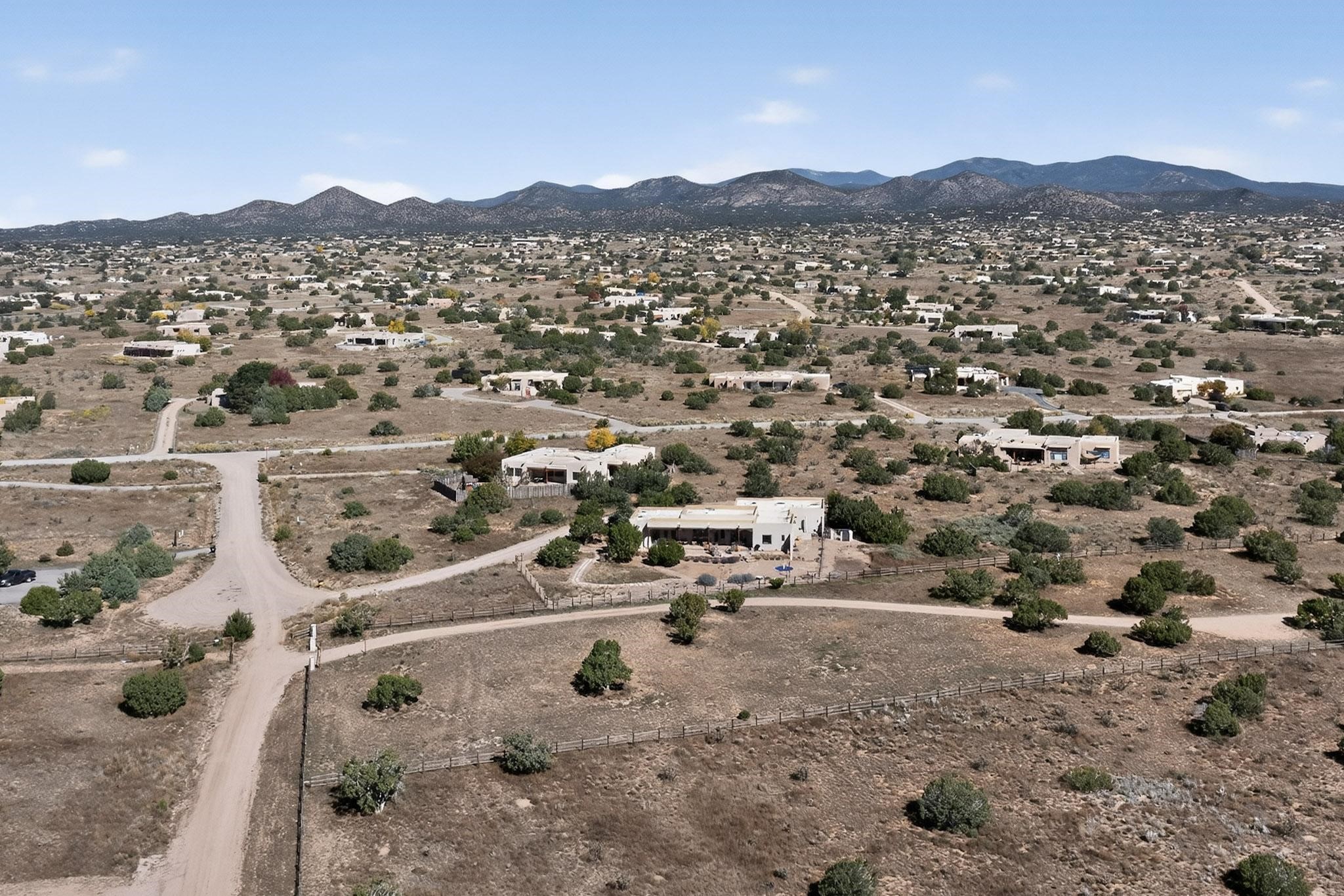 Custom designed and built spacious single level, open plan, split bedroom design in Eldorado bordering Los Caballos. Privacy and fabulous mountain and sunset views from home and portals. There are two unique back to back fireplaces, one in each room, a dramatic Chacoan style stone facing in the family room and a traditional kiva in the family room/study. The private owners suite features two separate 3/4 bath rooms, one with a tub and the other with a walk in sharable shower, plus 2 walk in closets. The laundry room is close by off the hall. The large kitchen includes a breakfast bar and cosy breakfast nook which accesses the south portal and gardens, plus there is an extra half bath for guests. There is a formal dining area with access to a private walled garden and patio. Both guest bedrooms are a good size and share a full bath between them. The oversized 2 car finished garage has plenty of guest parking. Incredible expansive night skies from spacious fenced gardens it is centered on 1 1/2 acres on the south central border of Eldorado. Easy access to all the Eldorado amenities, local shopping centers and only minutes into Santa Fe.
