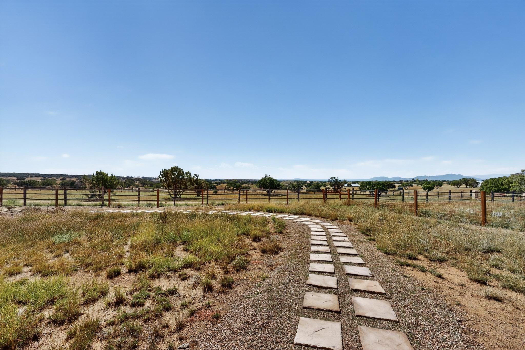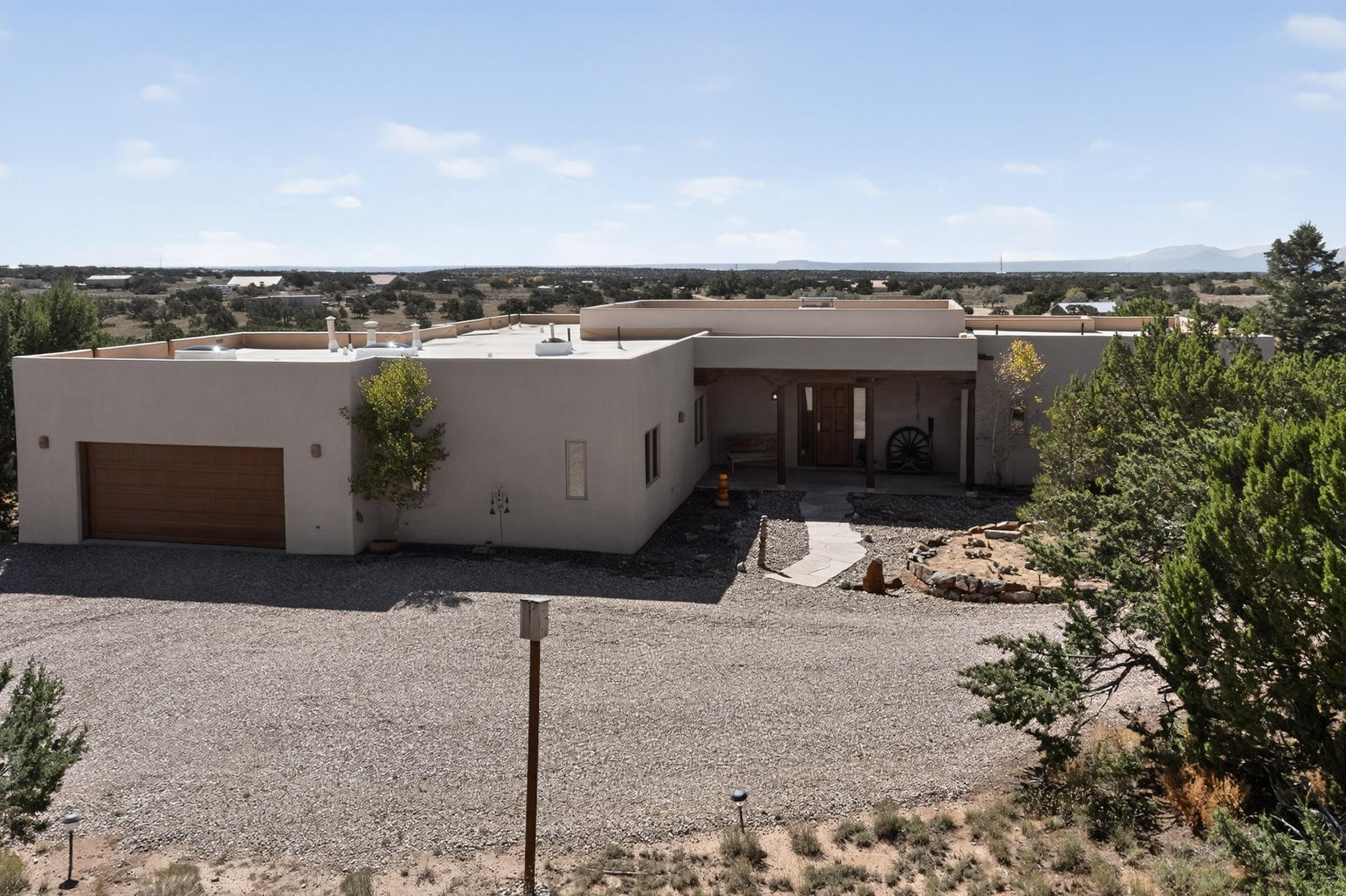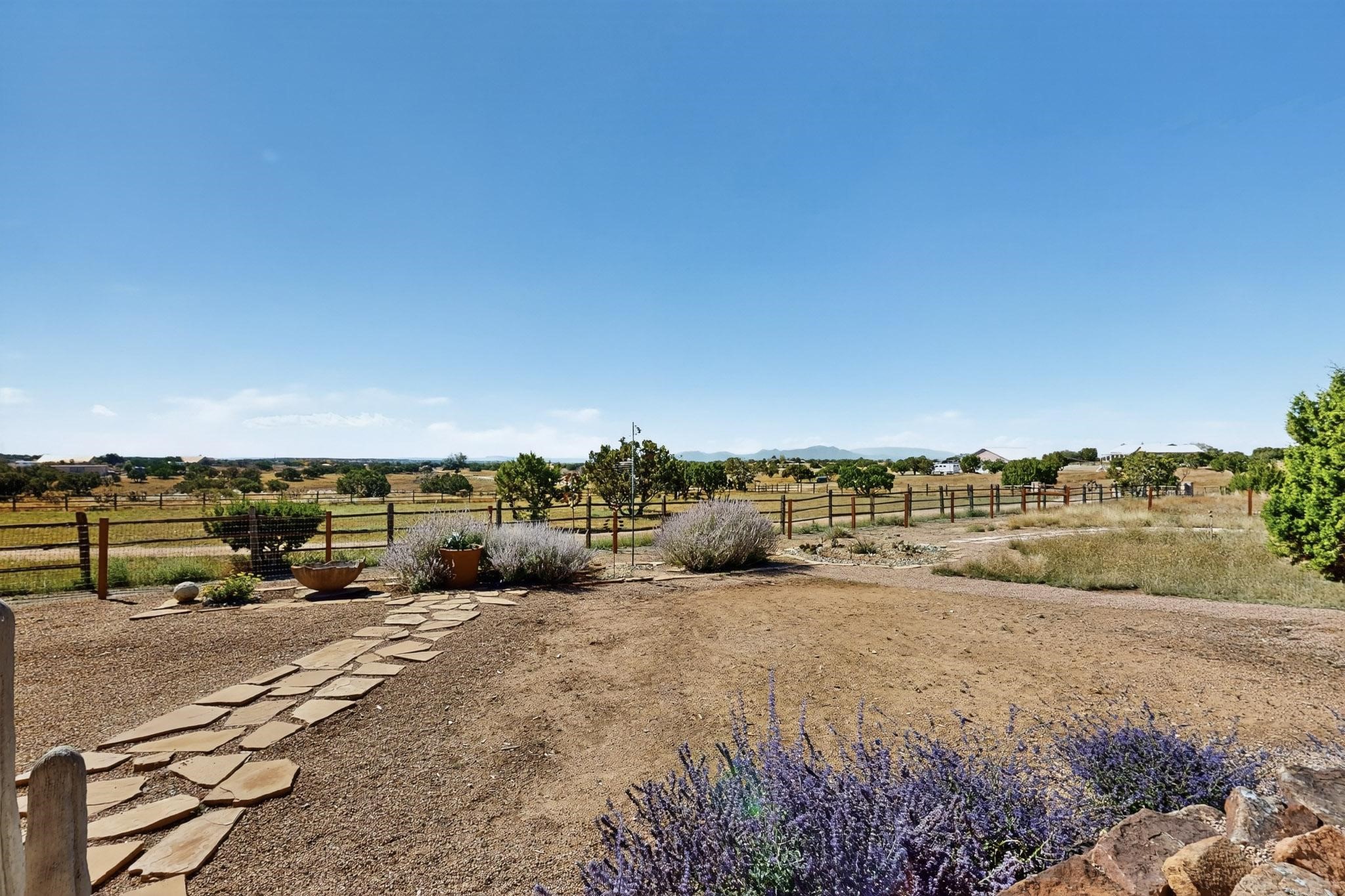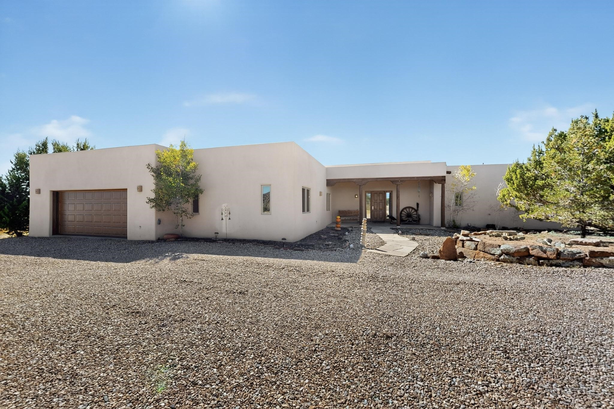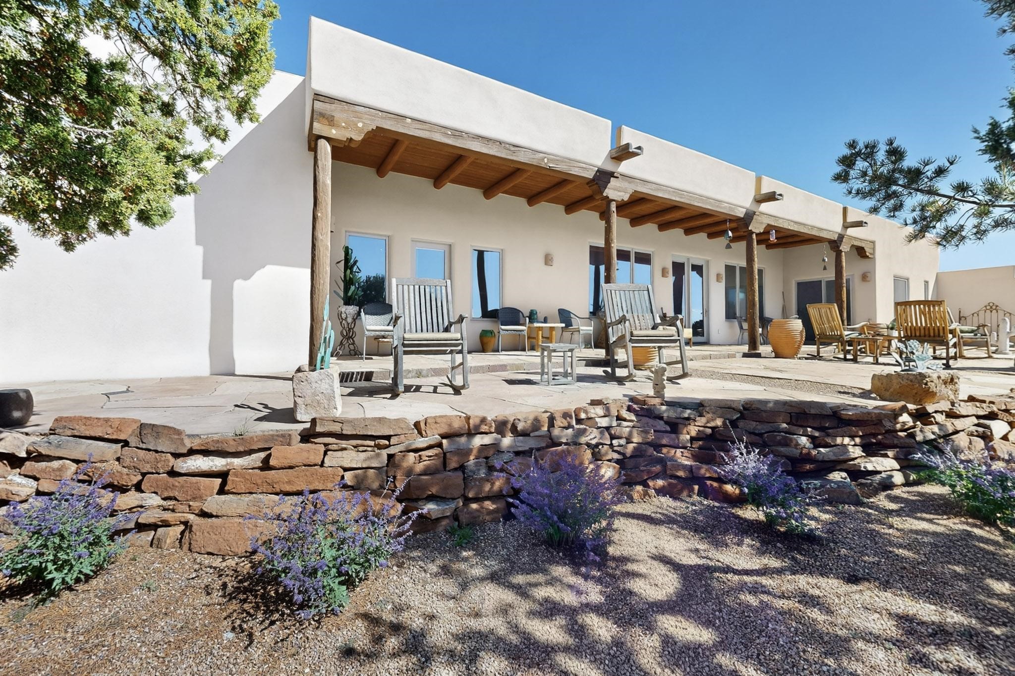 Custom designed and built spacious single level, open plan, split bedroom design in Eldorado bordering Los Caballos. Privacy and fabulous mountain and sunset views from home and portals. There are two unique back to back fireplaces, one in each room, a dramatic Chacoan style stone facing in the family room and a traditional kiva in the family room/study. The private owners suite features two separate 3/4 bath rooms, one with a tub and the other with a walk in sharable shower, plus 2 walk in closets. The laundry room is close by off the hall. The large kitchen includes a breakfast bar and cosy breakfast nook which accesses the south portal and gardens, plus there is an extra half bath for guests. There is a formal dining area with access to a private walled garden and patio. Both guest bedrooms are a good size and share a full bath between them. The oversized 2 car finished garage has plenty of guest parking. Incredible expansive night skies from spacious fenced gardens it is centered on 1 1/2 acres on the south central border of Eldorado. Easy access to all the Eldorado amenities, local shopping centers and only minutes into Santa Fe.