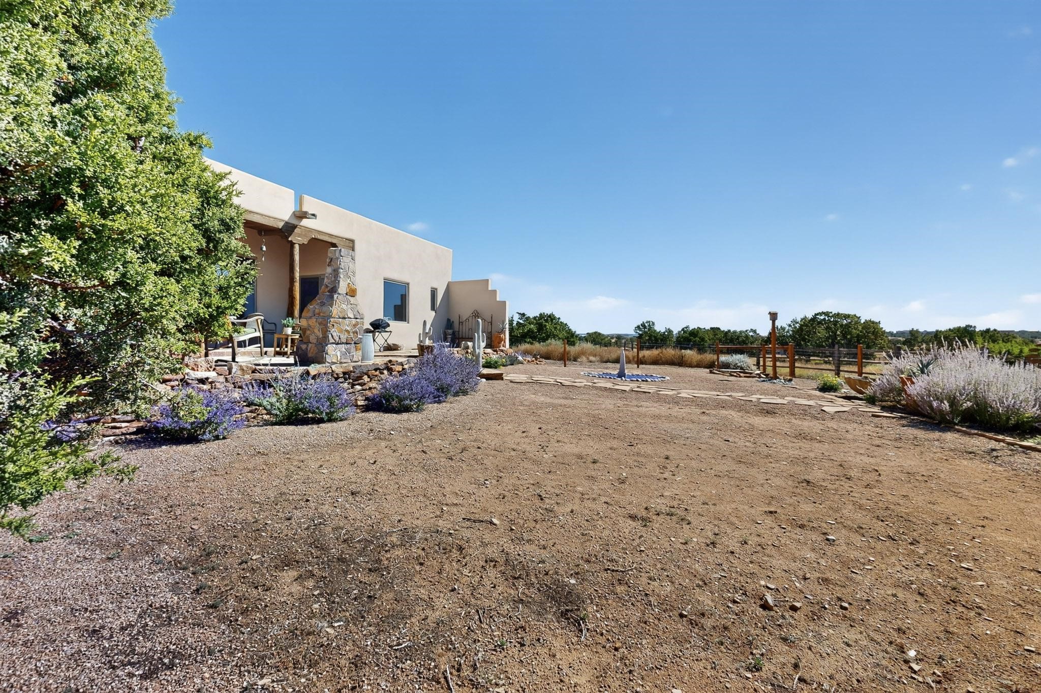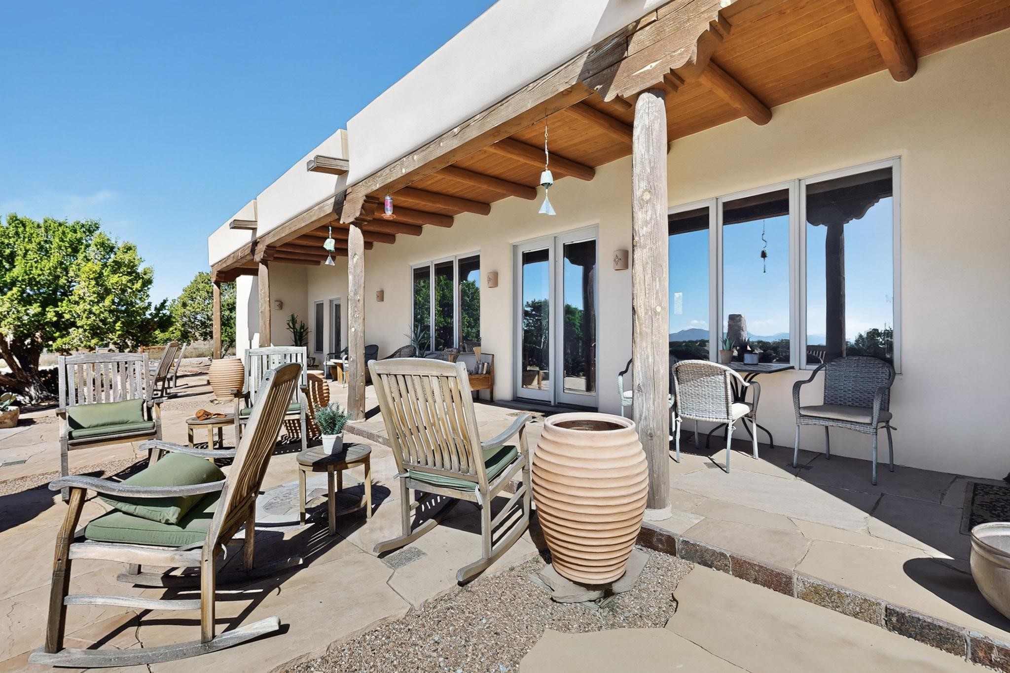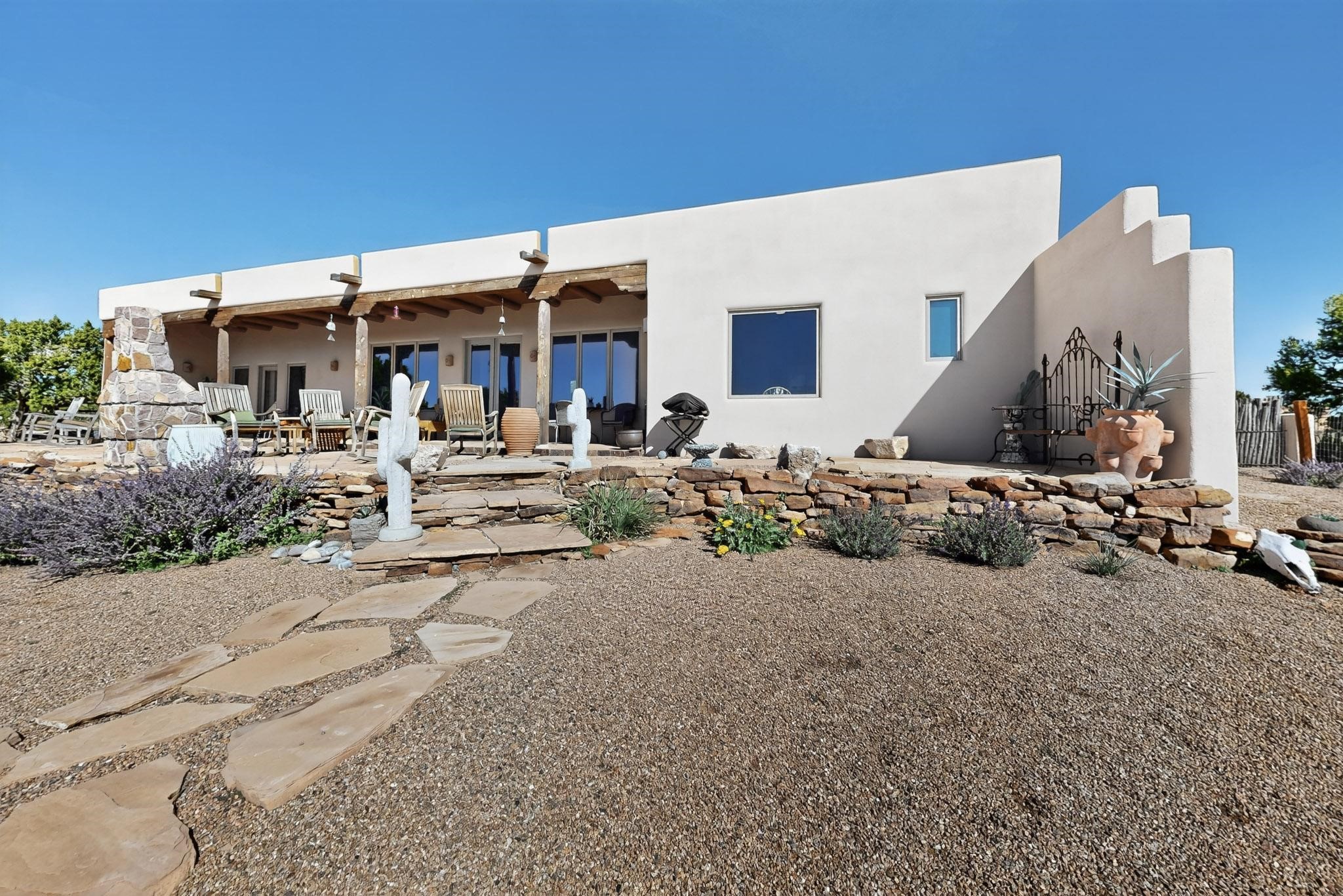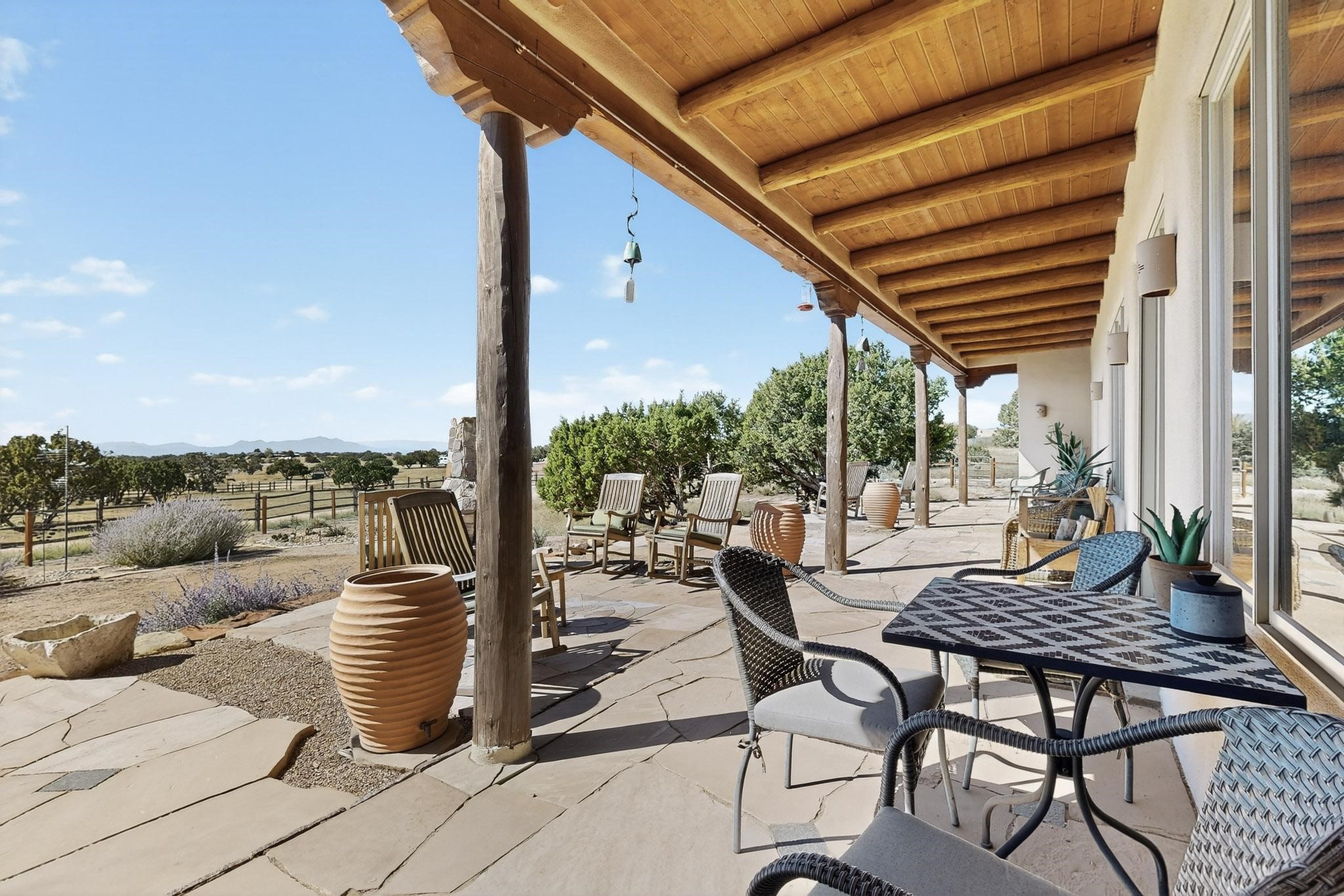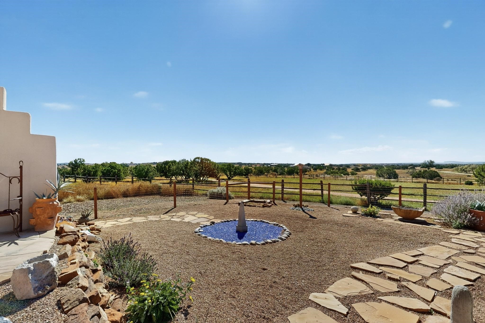 Custom designed and built spacious single level, open plan, split bedroom design in Eldorado bordering Los Caballos. Privacy and fabulous mountain and sunset views from home and portals. There are two unique back to back fireplaces, one in each room, a dramatic Chacoan style stone facing in the family room and a traditional kiva in the family room/study. The private owners suite features two separate 3/4 bath rooms, one with a tub and the other with a walk in sharable shower, plus 2 walk in closets. The laundry room is close by off the hall. The large kitchen includes a breakfast bar and cosy breakfast nook which accesses the south portal and gardens, plus there is an extra half bath for guests. There is a formal dining area with access to a private walled garden and patio. Both guest bedrooms are a good size and share a full bath between them. The oversized 2 car finished garage has plenty of guest parking. Incredible expansive night skies from spacious fenced gardens it is centered on 1 1/2 acres on the south central border of Eldorado. Easy access to all the Eldorado amenities, local shopping centers and only minutes into Santa Fe.