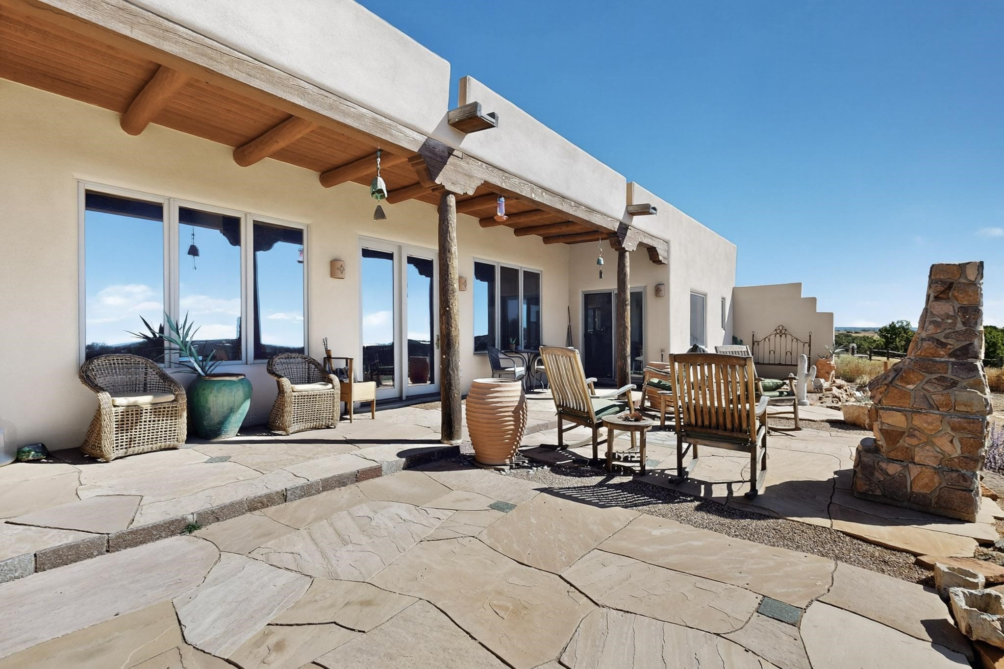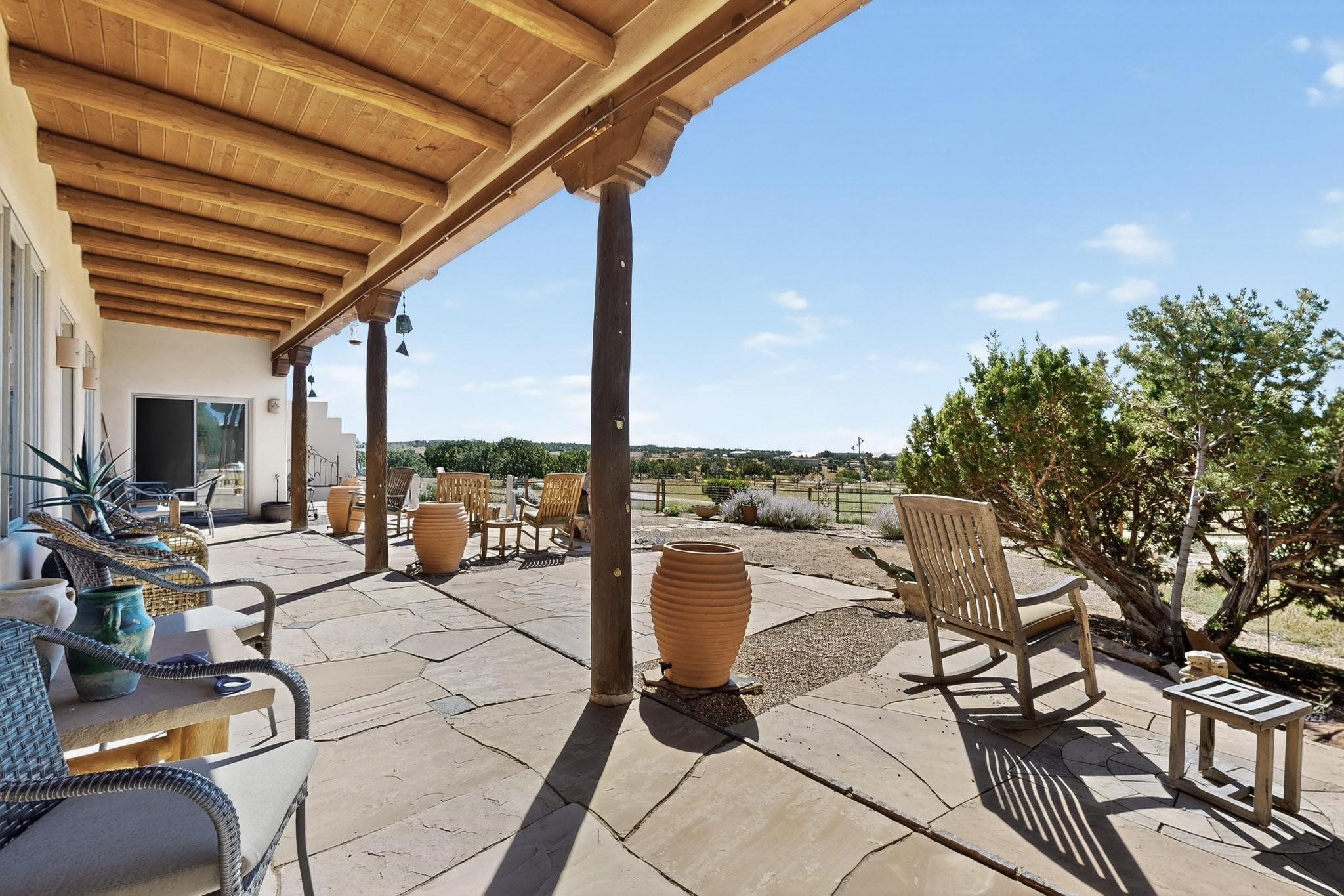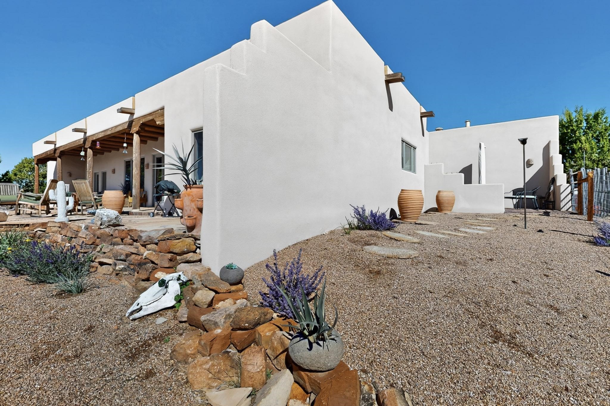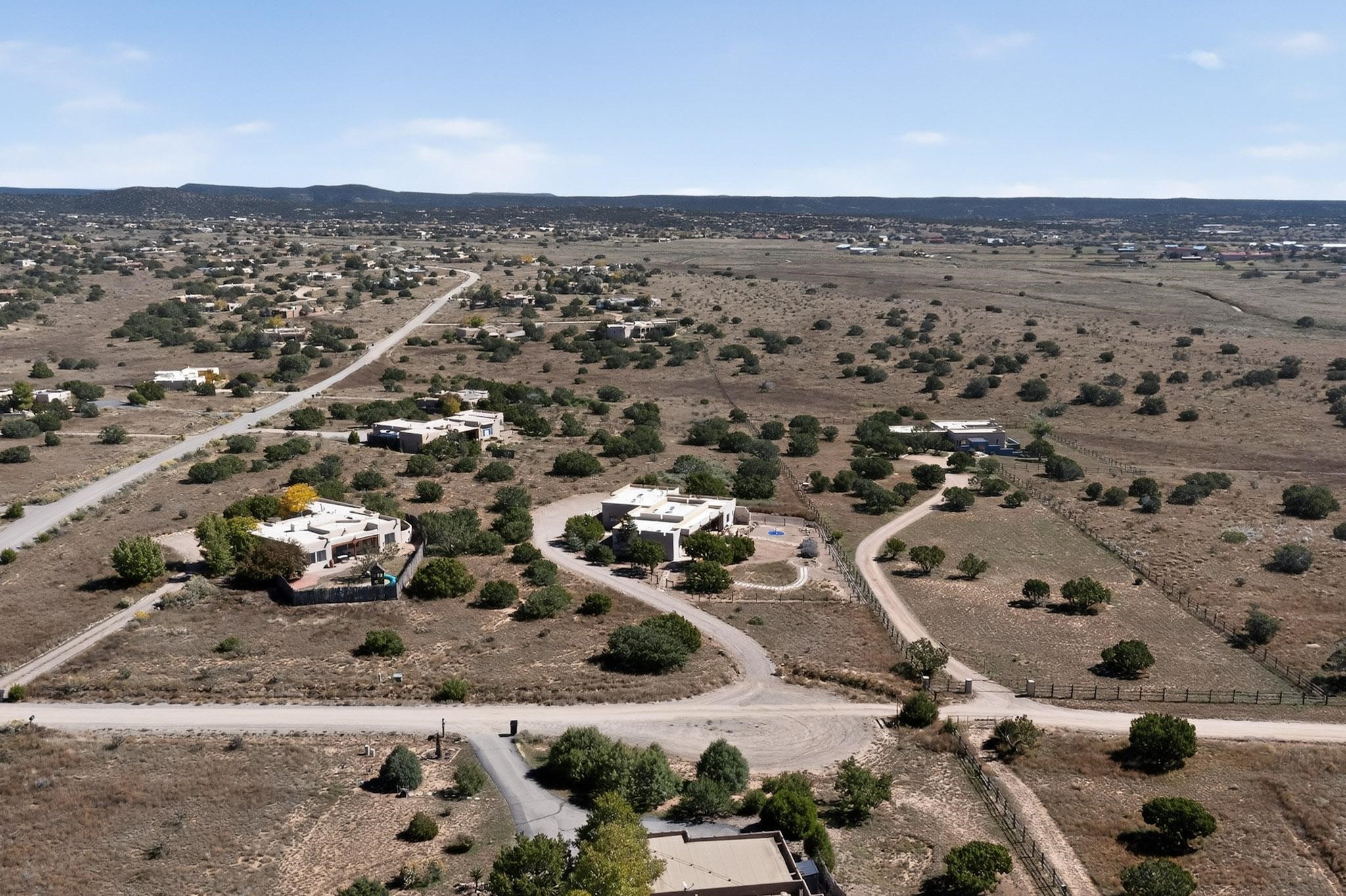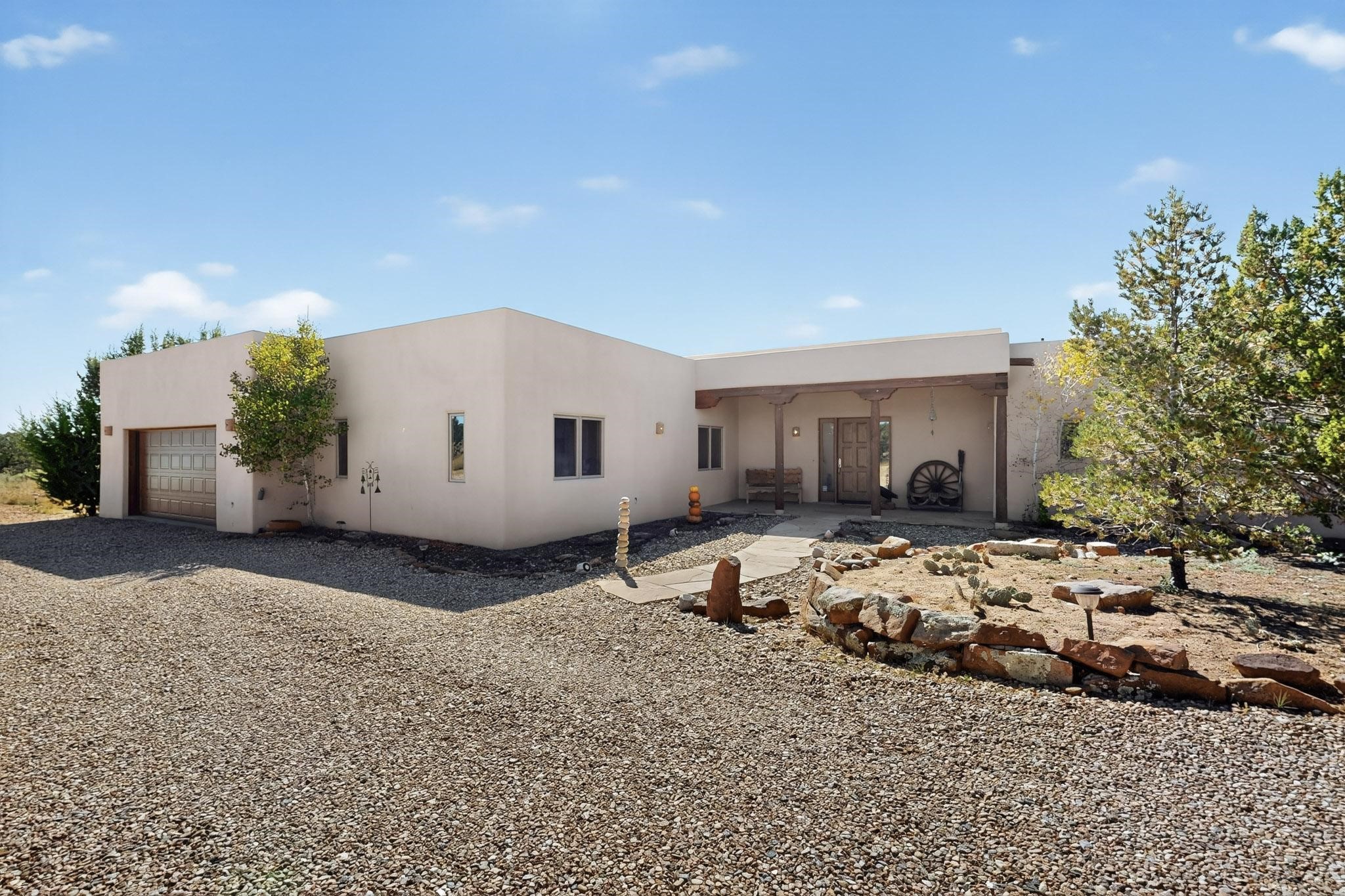 Custom designed and built spacious single level, open plan, split bedroom design in Eldorado bordering Los Caballos. Privacy and fabulous mountain and sunset views from home and portals. There are two unique back to back fireplaces, one in each room, a dramatic Chacoan style stone facing in the family room and a traditional kiva in the family room/study. The private owners suite features two separate 3/4 bath rooms, one with a tub and the other with a walk in sharable shower, plus 2 walk in closets. The laundry room is close by off the hall. The large kitchen includes a breakfast bar and cosy breakfast nook which accesses the south portal and gardens, plus there is an extra half bath for guests. There is a formal dining area with access to a private walled garden and patio. Both guest bedrooms are a good size and share a full bath between them. The oversized 2 car finished garage has plenty of guest parking. Incredible expansive night skies from spacious fenced gardens it is centered on 1 1/2 acres on the south central border of Eldorado. Easy access to all the Eldorado amenities, local shopping centers and only minutes into Santa Fe.