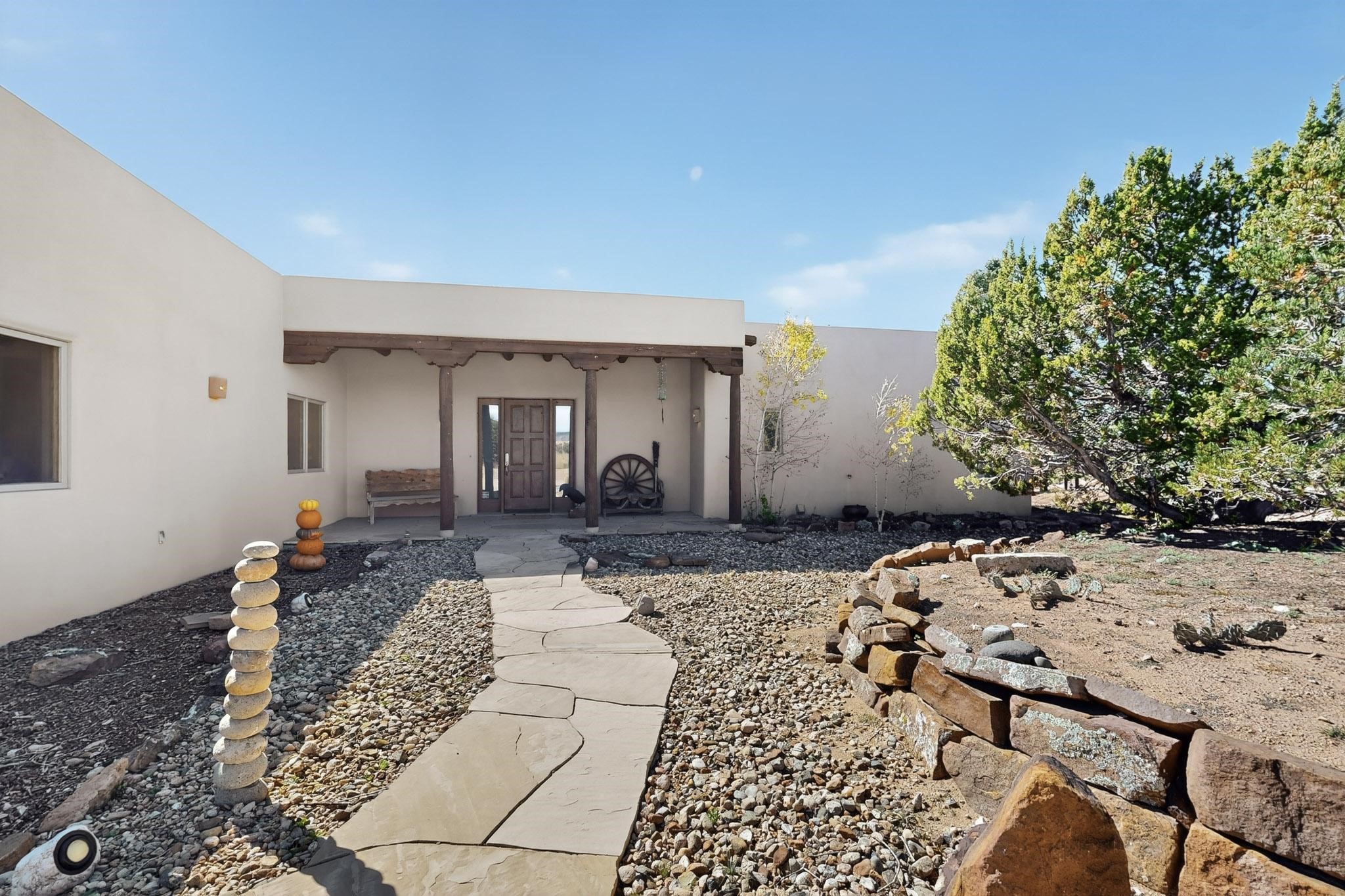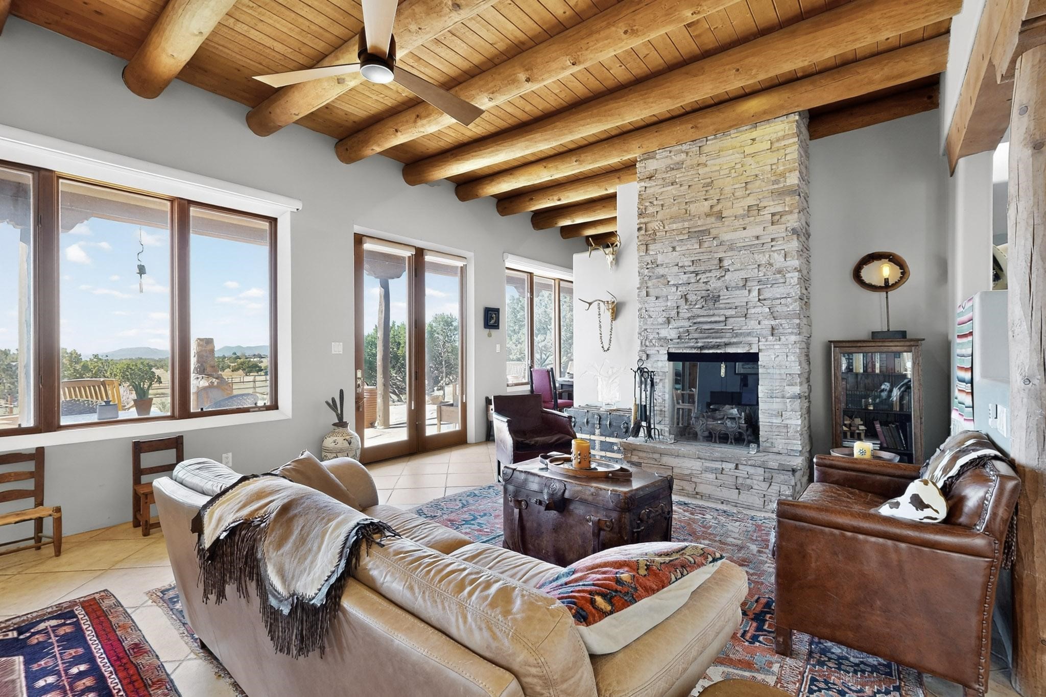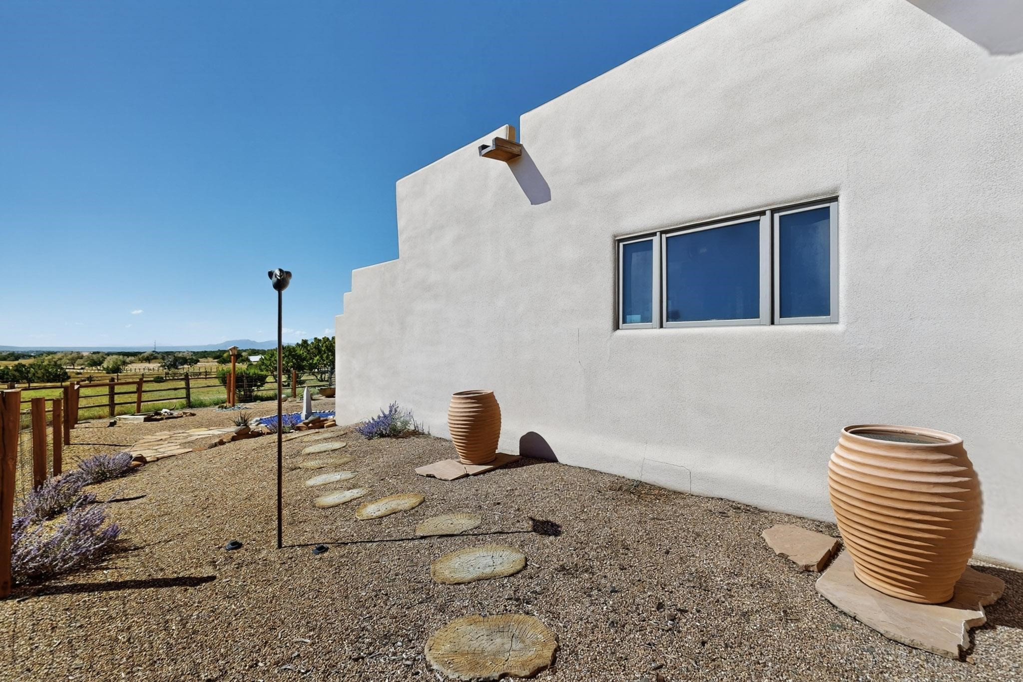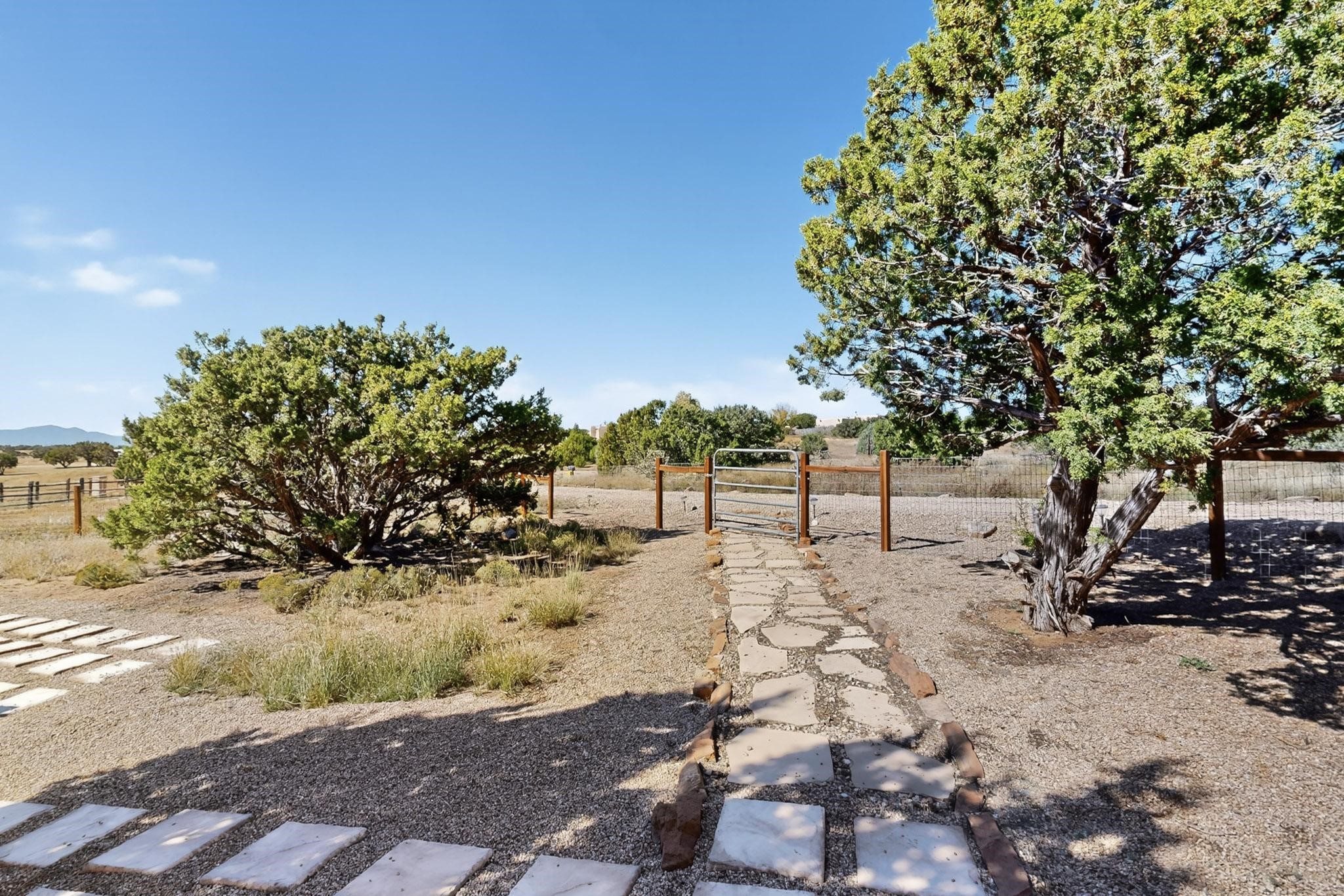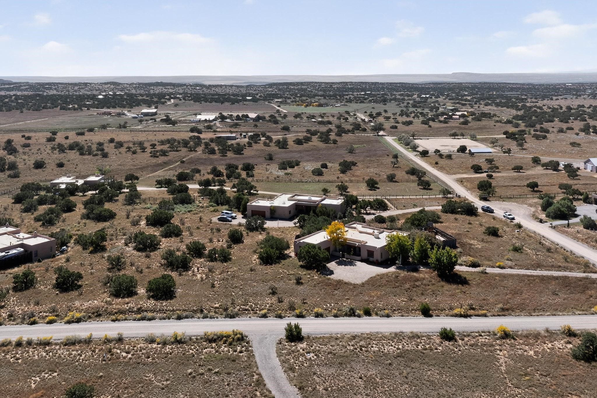 Custom designed and built spacious single level, open plan, split bedroom design in Eldorado bordering Los Caballos. Privacy and fabulous mountain and sunset views from home and portals. There are two unique back to back fireplaces, one in each room, a dramatic Chacoan style stone facing in the family room and a traditional kiva in the family room/study. The private owners suite features two separate 3/4 bath rooms, one with a tub and the other with a walk in sharable shower, plus 2 walk in closets. The laundry room is close by off the hall. The large kitchen includes a breakfast bar and cosy breakfast nook which accesses the south portal and gardens, plus there is an extra half bath for guests. There is a formal dining area with access to a private walled garden and patio. Both guest bedrooms are a good size and share a full bath between them. The oversized 2 car finished garage has plenty of guest parking. Incredible expansive night skies from spacious fenced gardens it is centered on 1 1/2 acres on the south central border of Eldorado. Easy access to all the Eldorado amenities, local shopping centers and only minutes into Santa Fe.