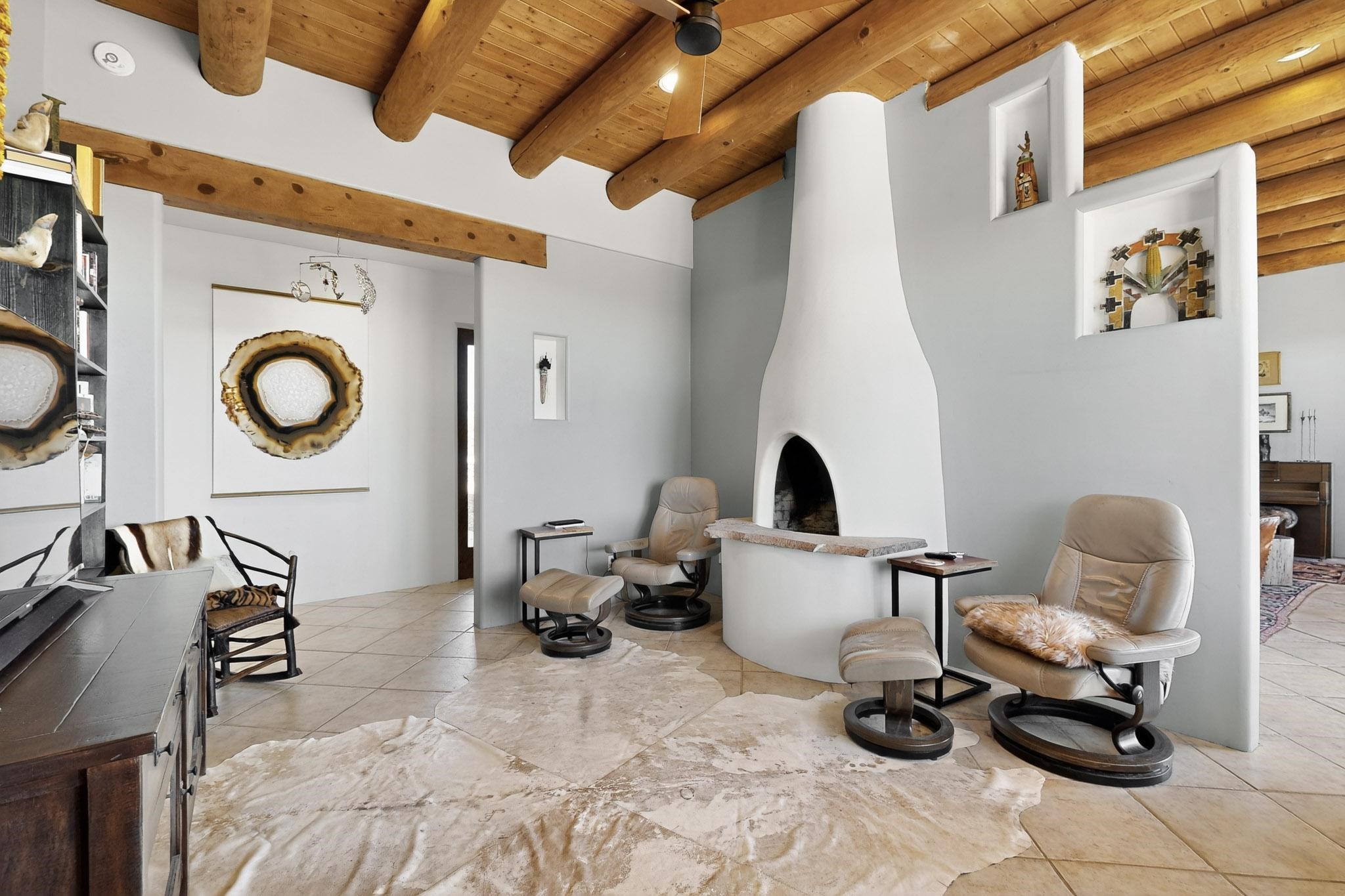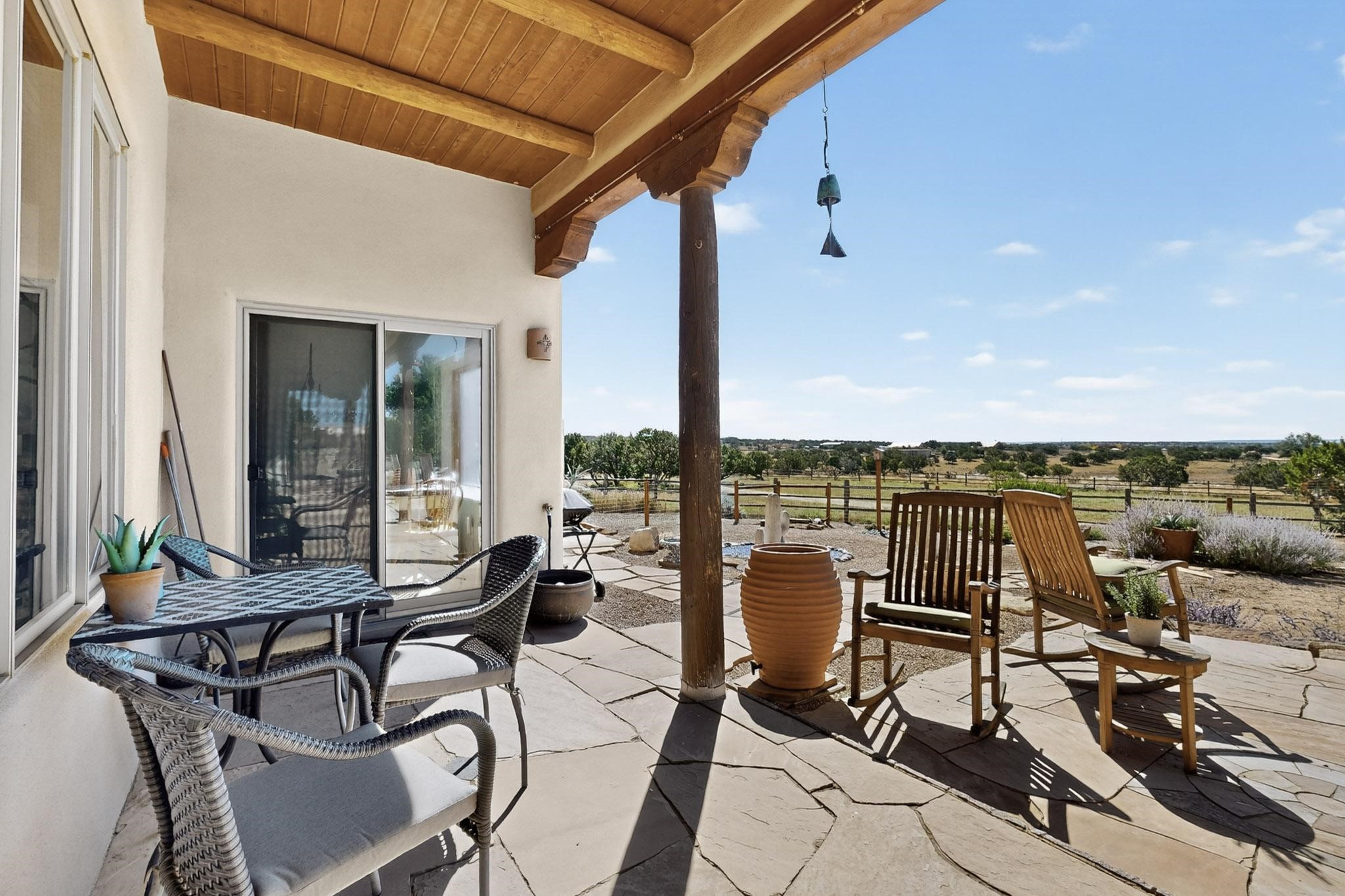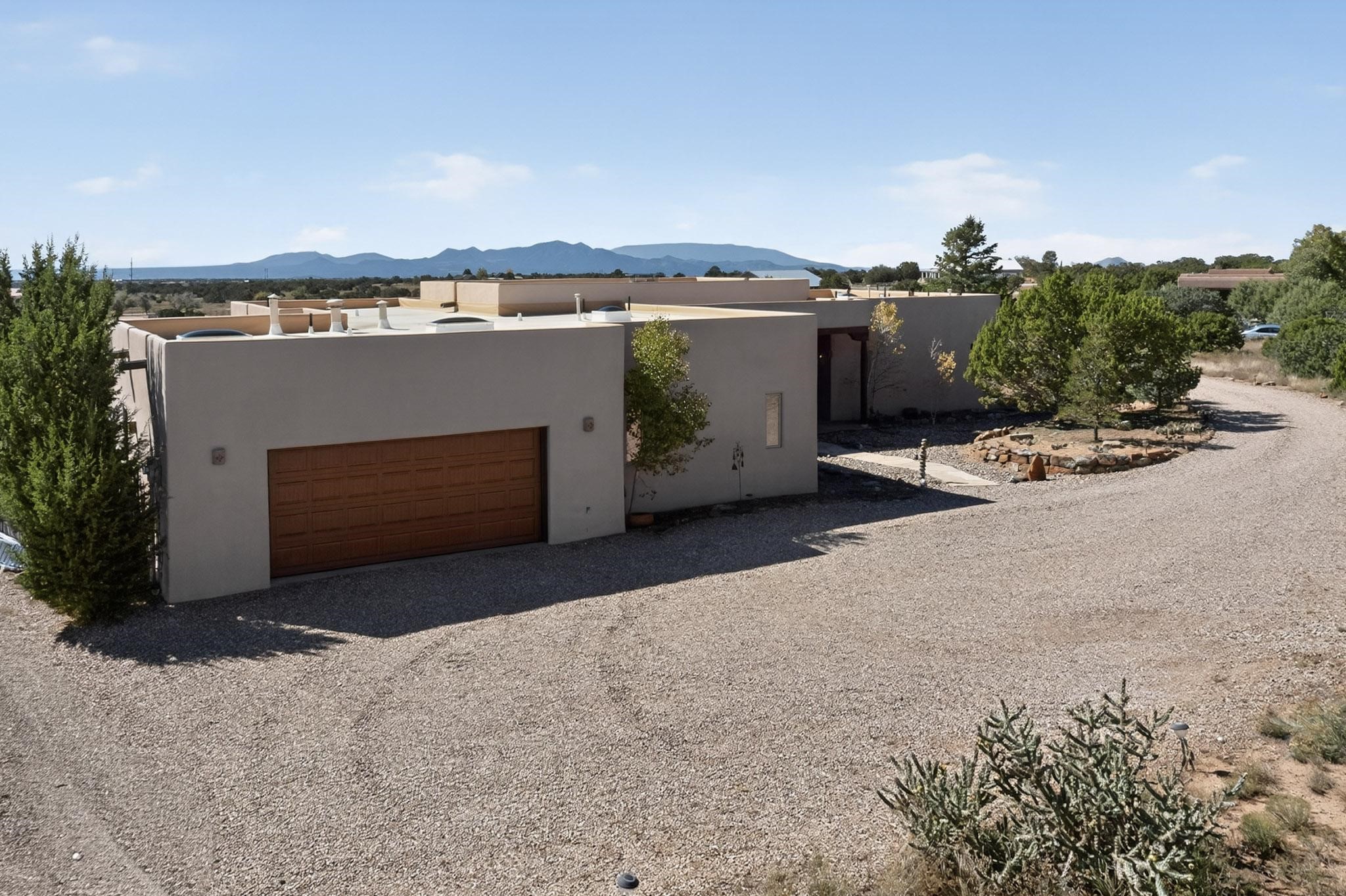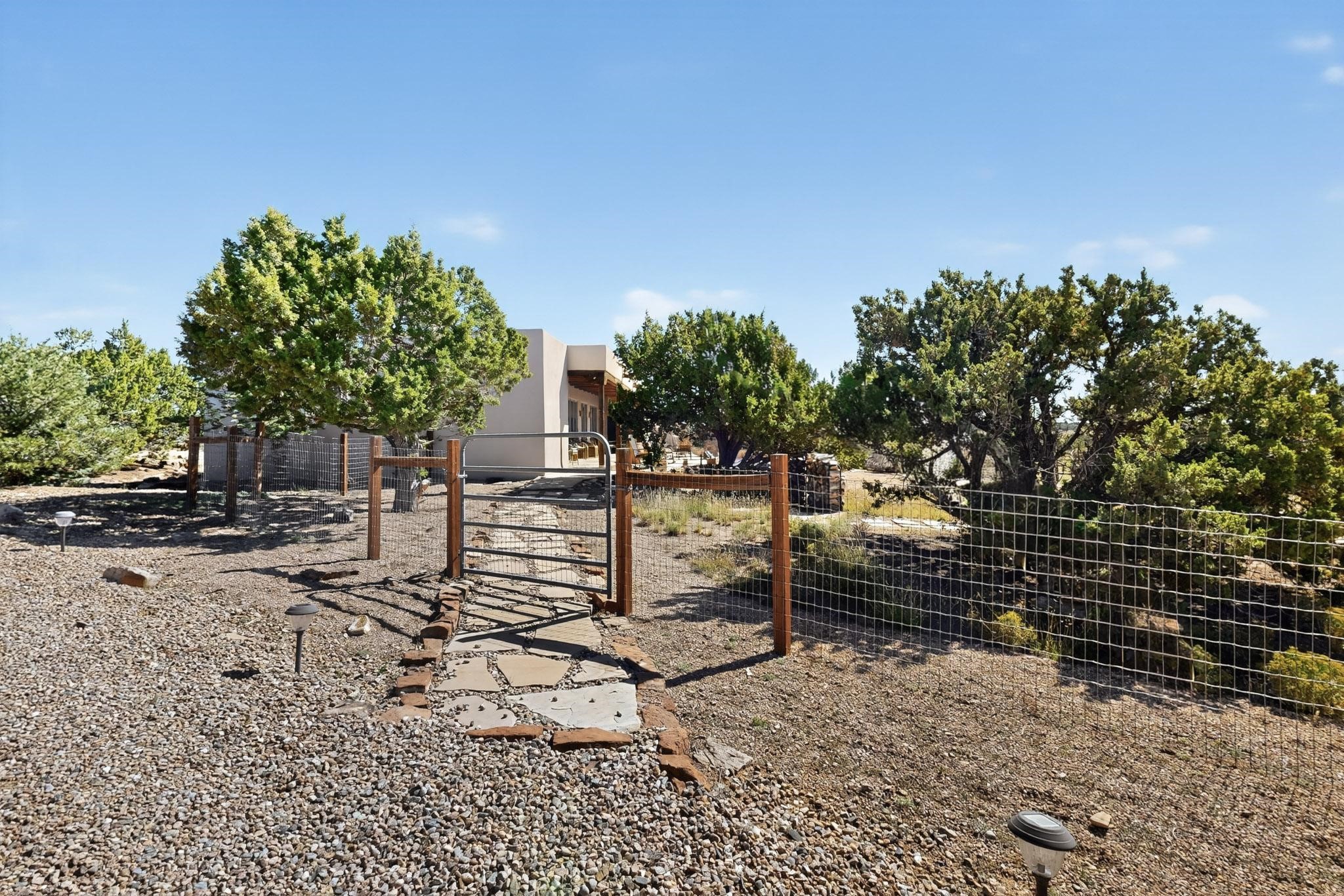Custom designed and built spacious single level, open plan, split bedroom design in Eldorado bordering Los Caballos. Privacy and fabulous mountain and sunset views from home and portals. There are two unique back to back fireplaces, one in each room, a dramatic Chacoan style stone facing in the family room and a traditional kiva in the family room/study. The private owners suite features two separate 3/4 bath rooms, one with a tub and the other with a walk in sharable shower, plus 2 walk in closets. The laundry room is close by off the hall. The large kitchen includes a breakfast bar and cosy breakfast nook which accesses the south portal and gardens, plus there is an extra half bath for guests. There is a formal dining area with access to a private walled garden and patio. Both guest bedrooms are a good size and share a full bath between them. The oversized 2 car finished garage has plenty of guest parking. Incredible expansive night skies from spacious fenced gardens it is centered on 1 1/2 acres on the south central border of Eldorado. Easy access to all the Eldorado amenities, local shopping centers and only minutes into Santa Fe.