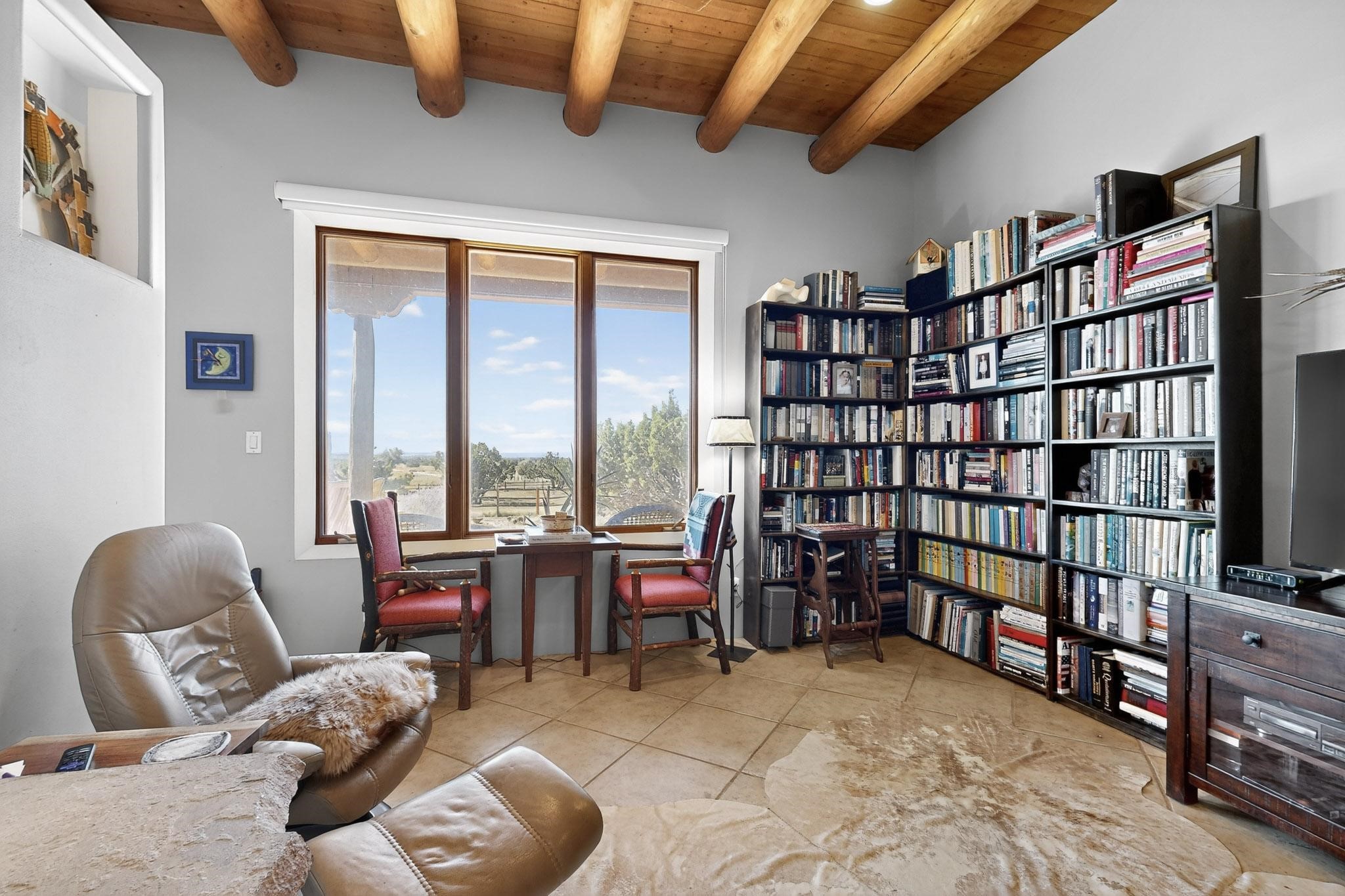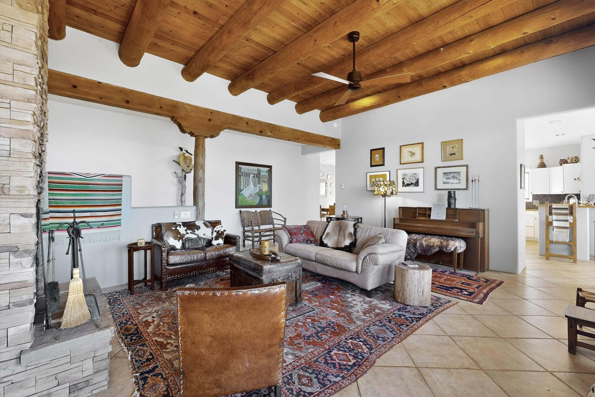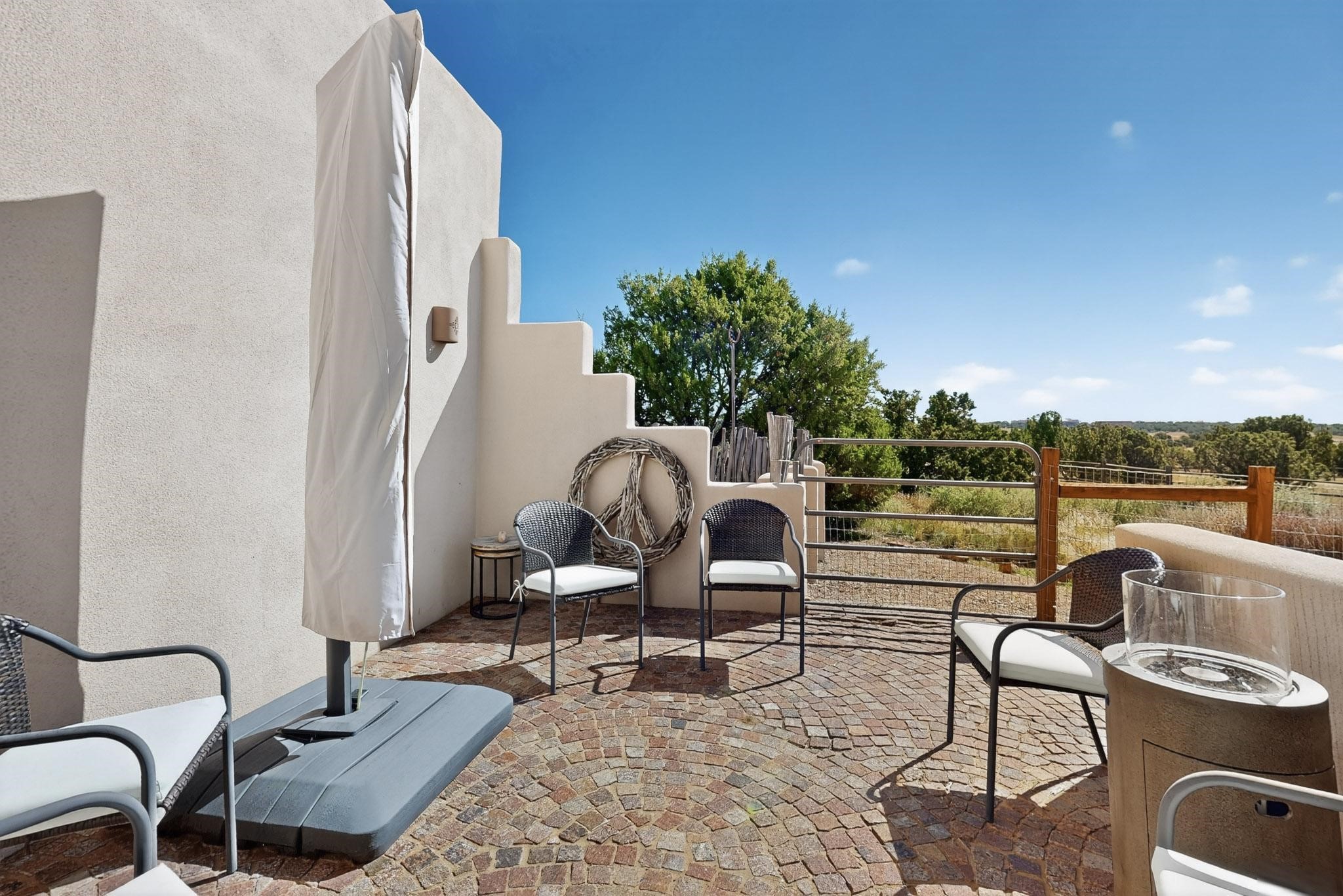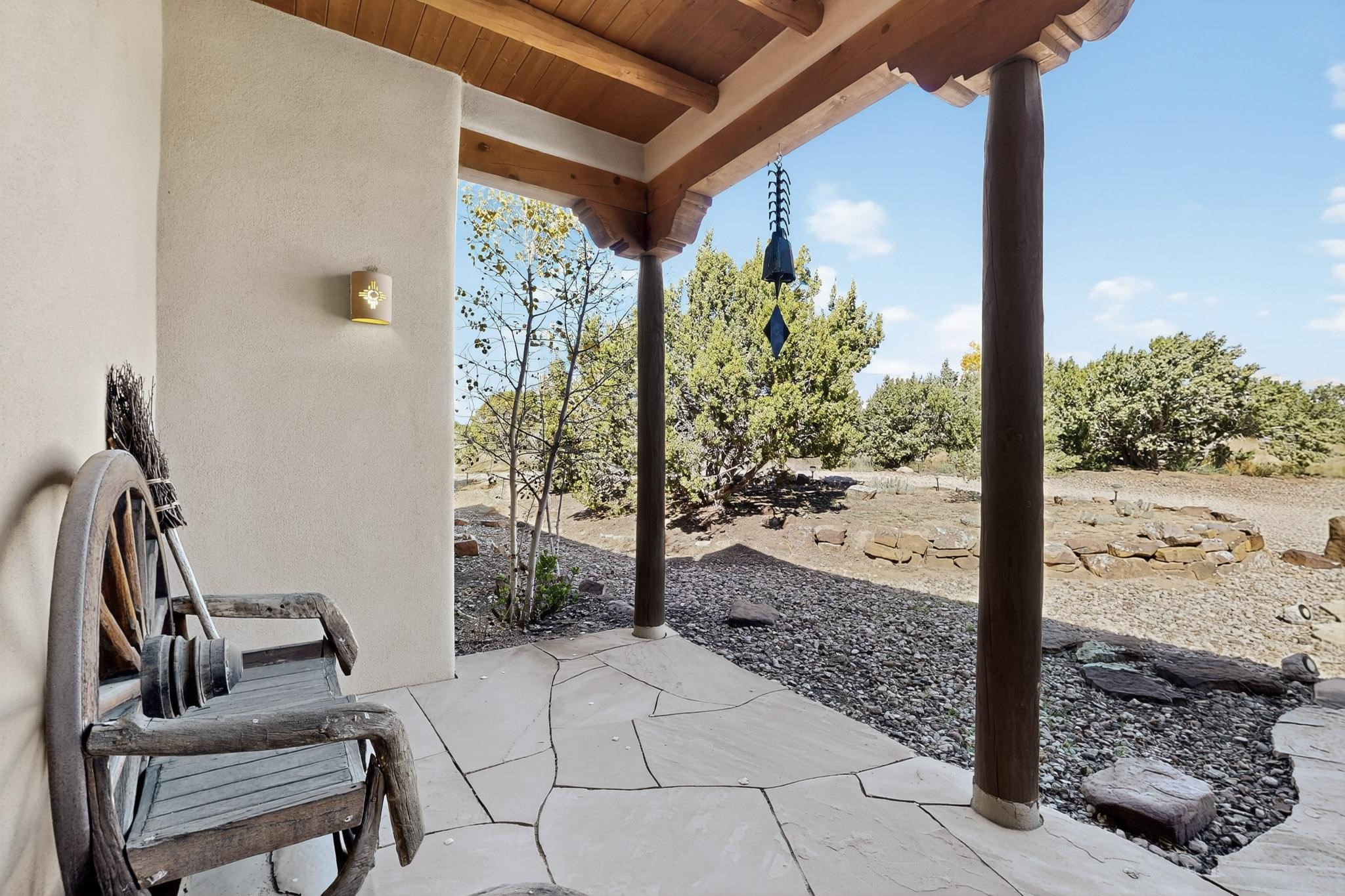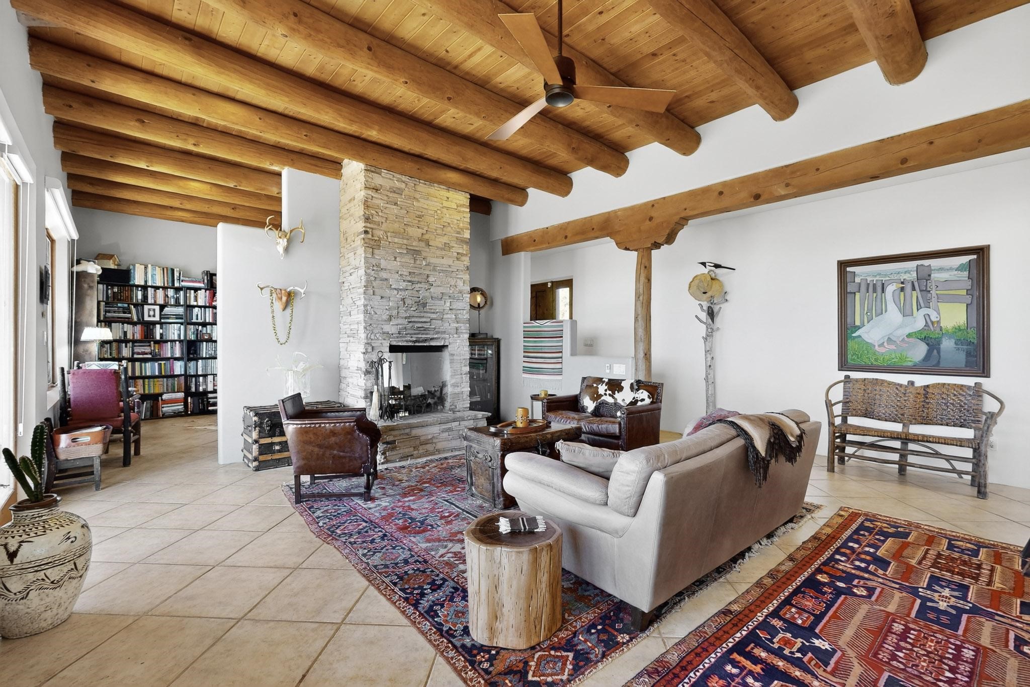Custom designed and built spacious single level, open plan, split bedroom design in Eldorado bordering Los Caballos. Privacy and fabulous mountain and sunset views from home and portals. There are two unique back to back fireplaces, one in each room, a dramatic Chacoan style stone facing in the family room and a traditional kiva in the family room/study. The private owners suite features two separate 3/4 bath rooms, one with a tub and the other with a walk in sharable shower, plus 2 walk in closets. The laundry room is close by off the hall. The large kitchen includes a breakfast bar and cosy breakfast nook which accesses the south portal and gardens, plus there is an extra half bath for guests. There is a formal dining area with access to a private walled garden and patio. Both guest bedrooms are a good size and share a full bath between them. The oversized 2 car finished garage has plenty of guest parking. Incredible expansive night skies from spacious fenced gardens it is centered on 1 1/2 acres on the south central border of Eldorado. Easy access to all the Eldorado amenities, local shopping centers and only minutes into Santa Fe.