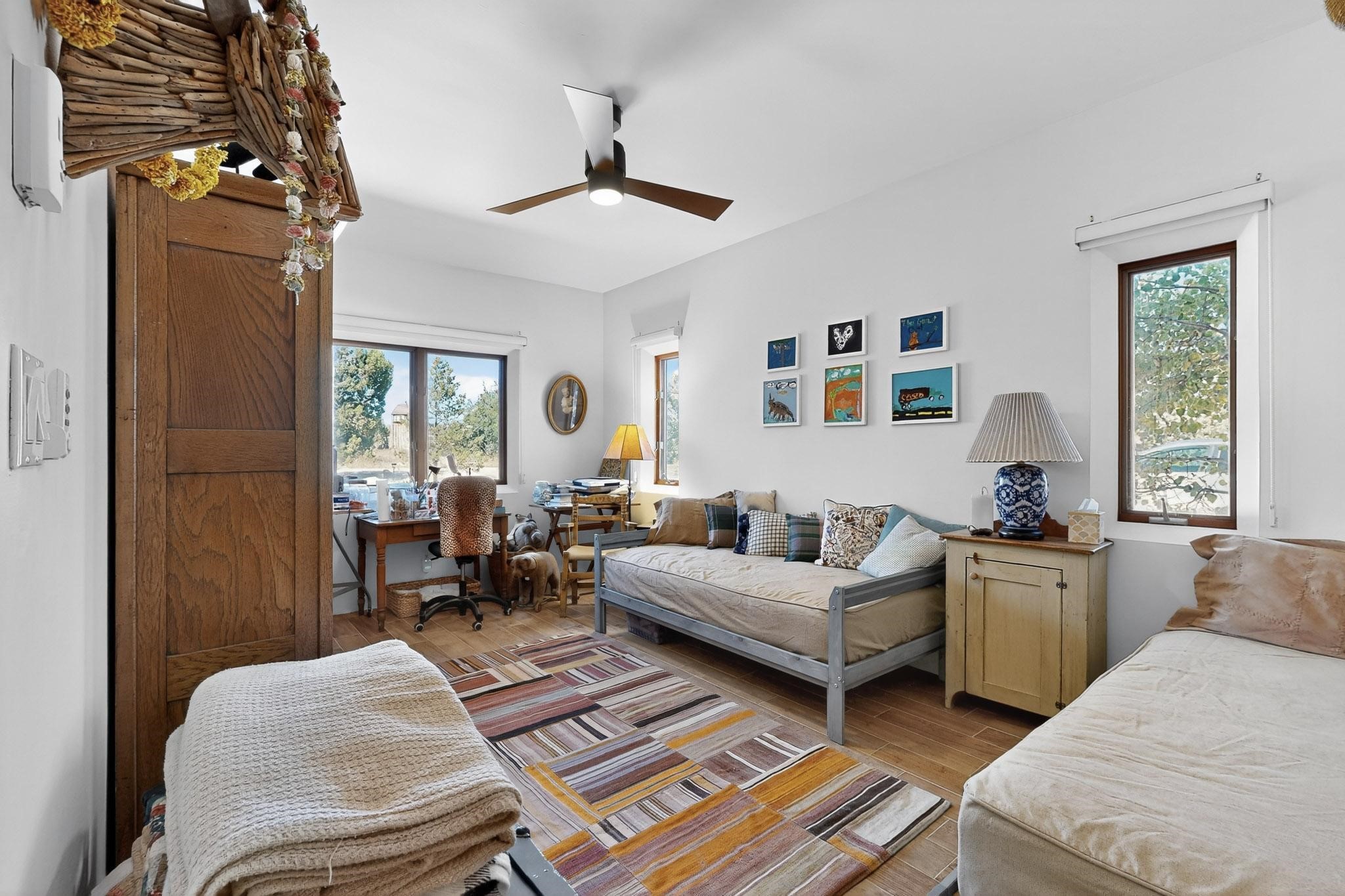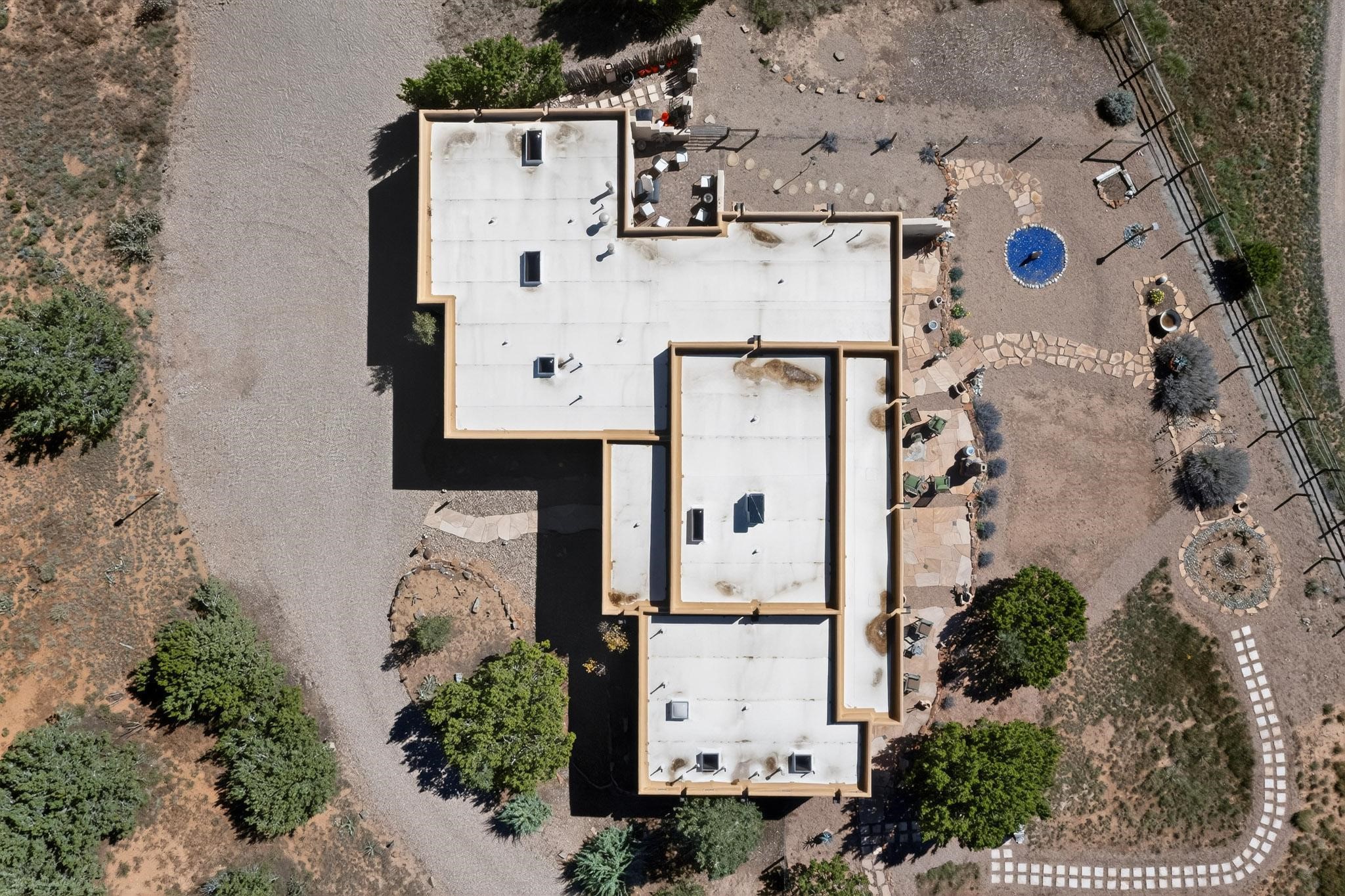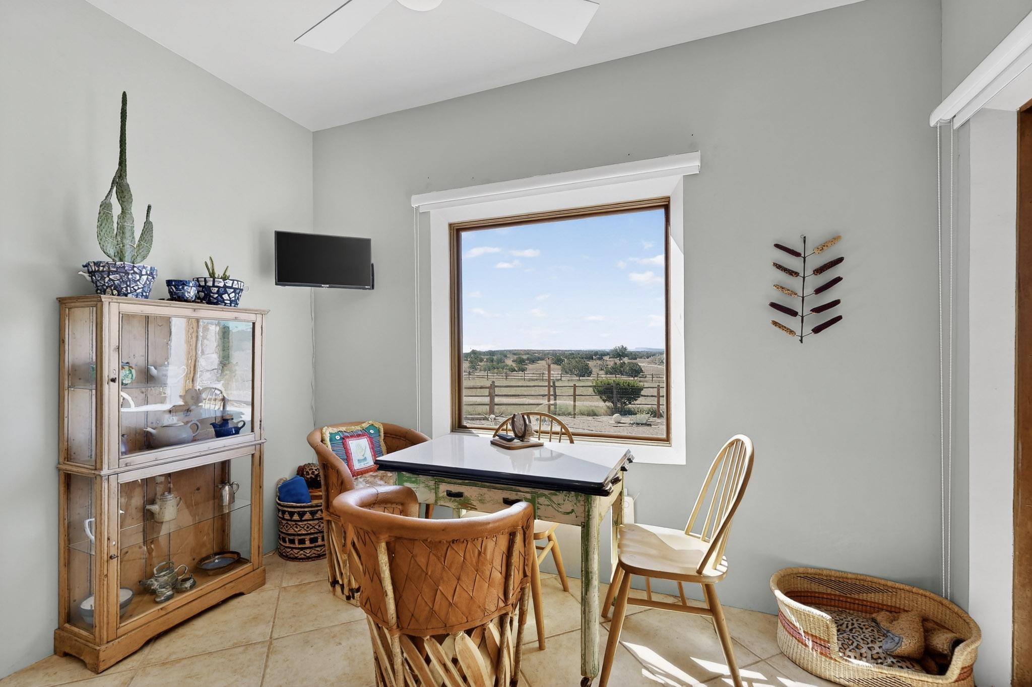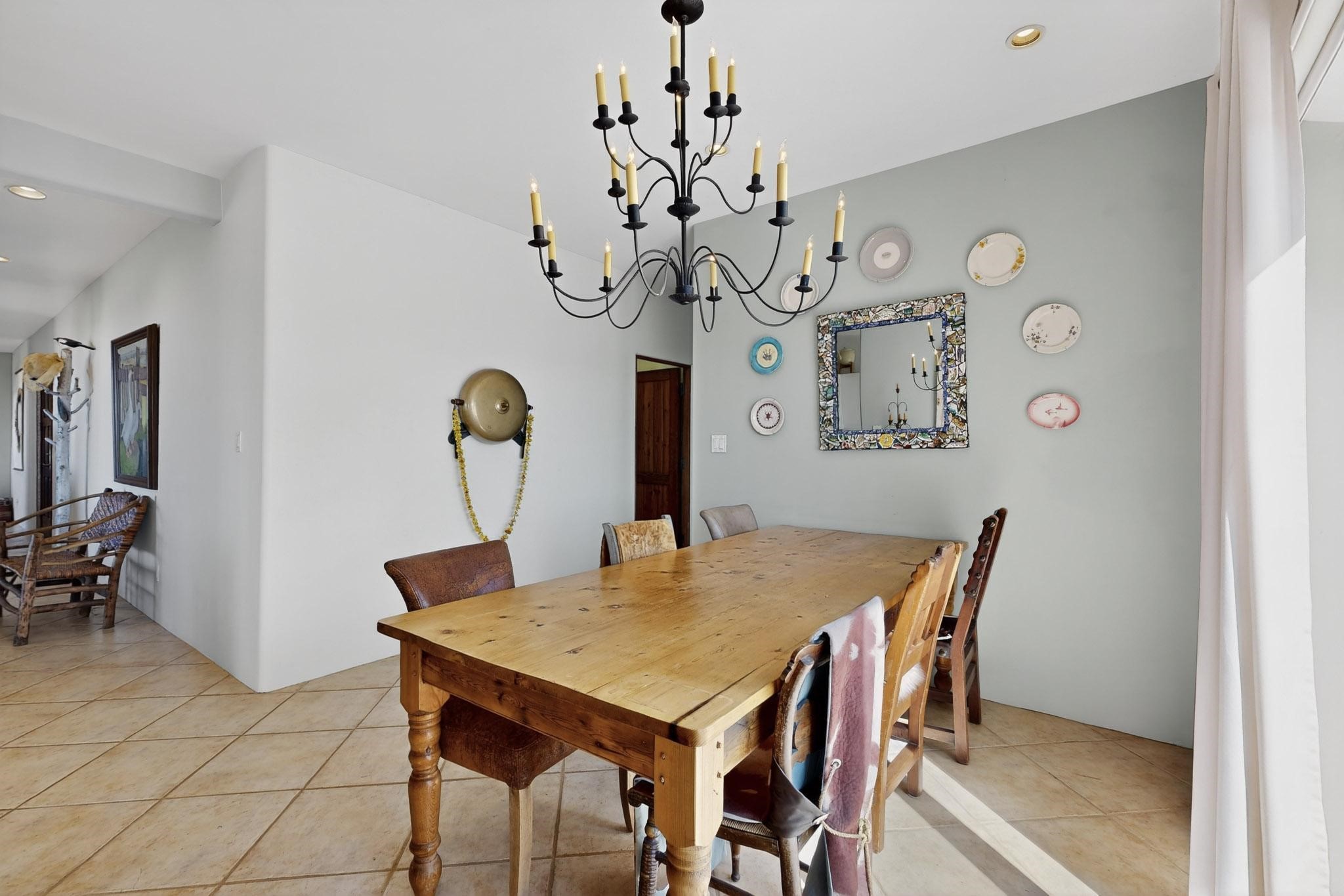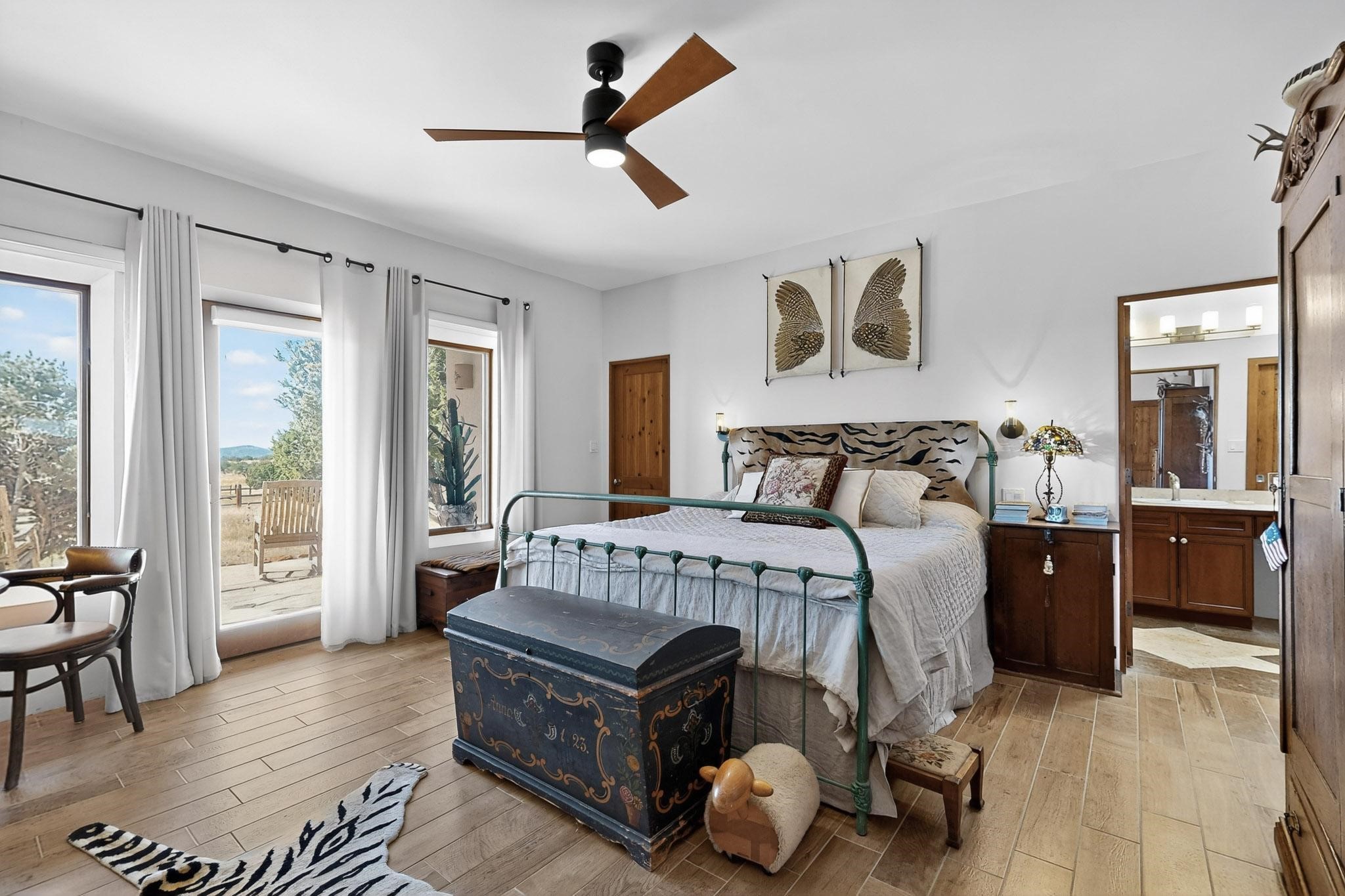 Custom designed and built spacious single level, open plan, split bedroom design in Eldorado bordering Los Caballos. Privacy and fabulous mountain and sunset views from home and portals. There are two unique back to back fireplaces, one in each room, a dramatic Chacoan style stone facing in the family room and a traditional kiva in the family room/study. The private owners suite features two separate 3/4 bath rooms, one with a tub and the other with a walk in sharable shower, plus 2 walk in closets. The laundry room is close by off the hall. The large kitchen includes a breakfast bar and cosy breakfast nook which accesses the south portal and gardens, plus there is an extra half bath for guests. There is a formal dining area with access to a private walled garden and patio. Both guest bedrooms are a good size and share a full bath between them. The oversized 2 car finished garage has plenty of guest parking. Incredible expansive night skies from spacious fenced gardens it is centered on 1 1/2 acres on the south central border of Eldorado. Easy access to all the Eldorado amenities, local shopping centers and only minutes into Santa Fe.