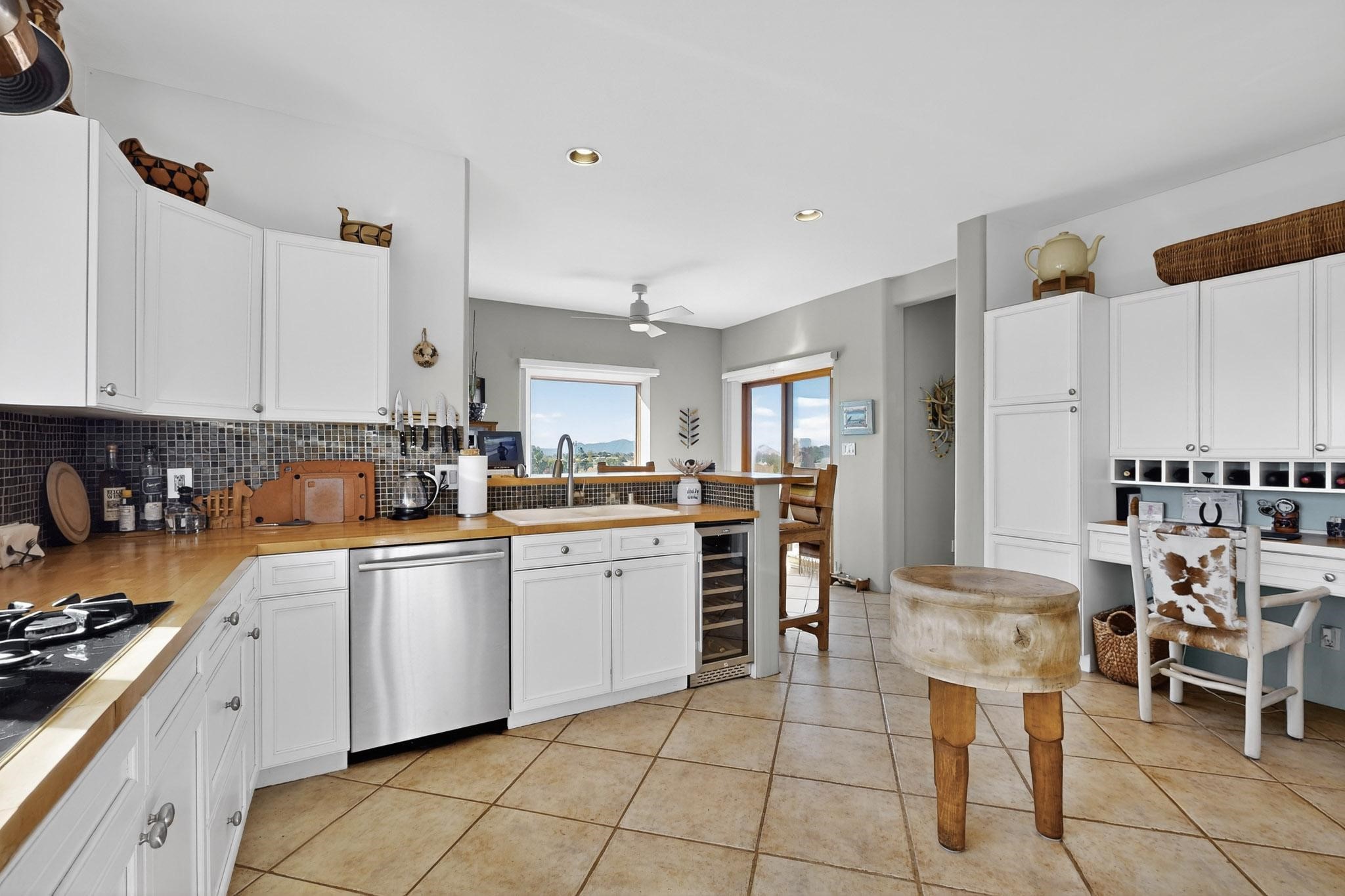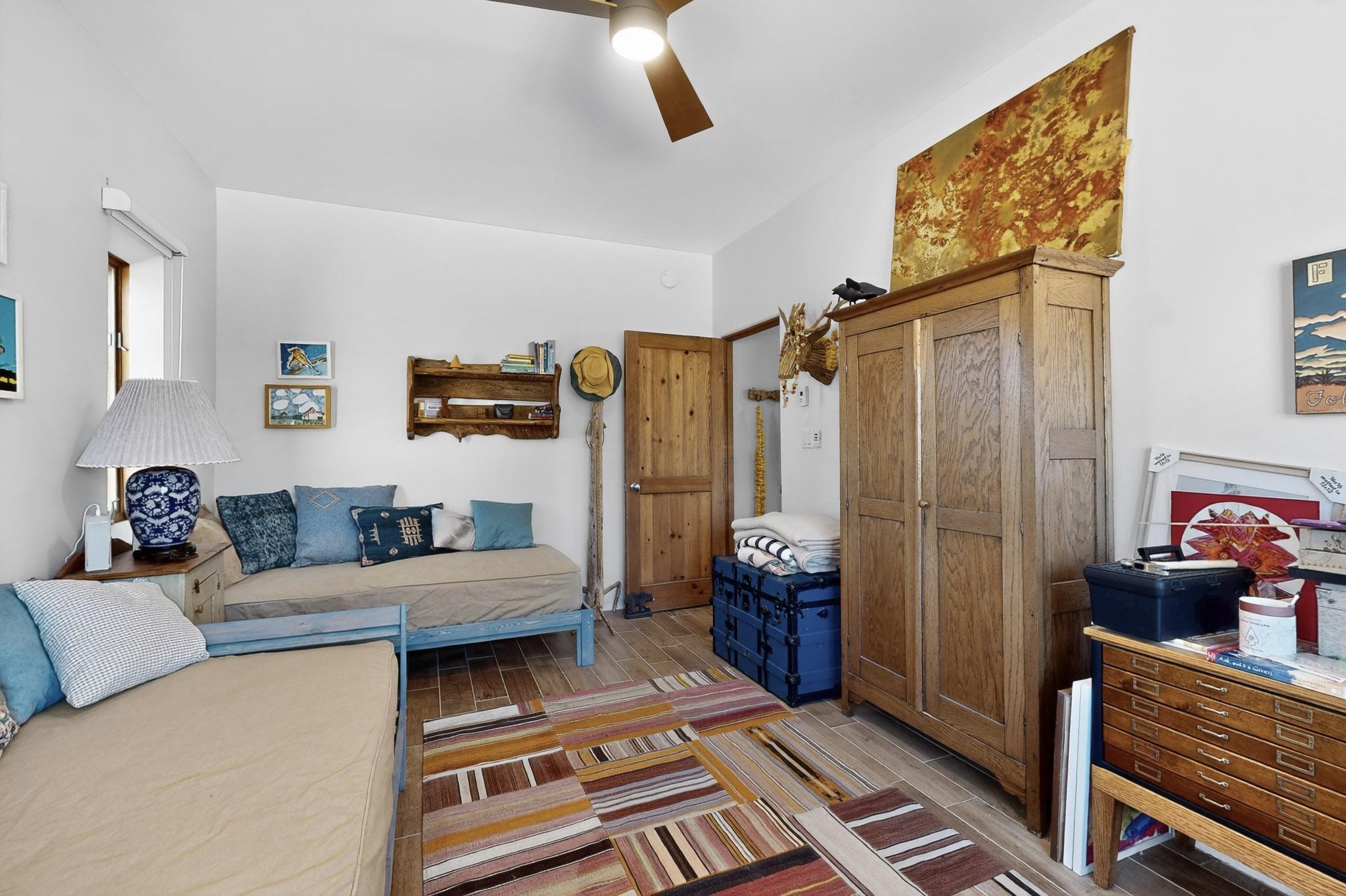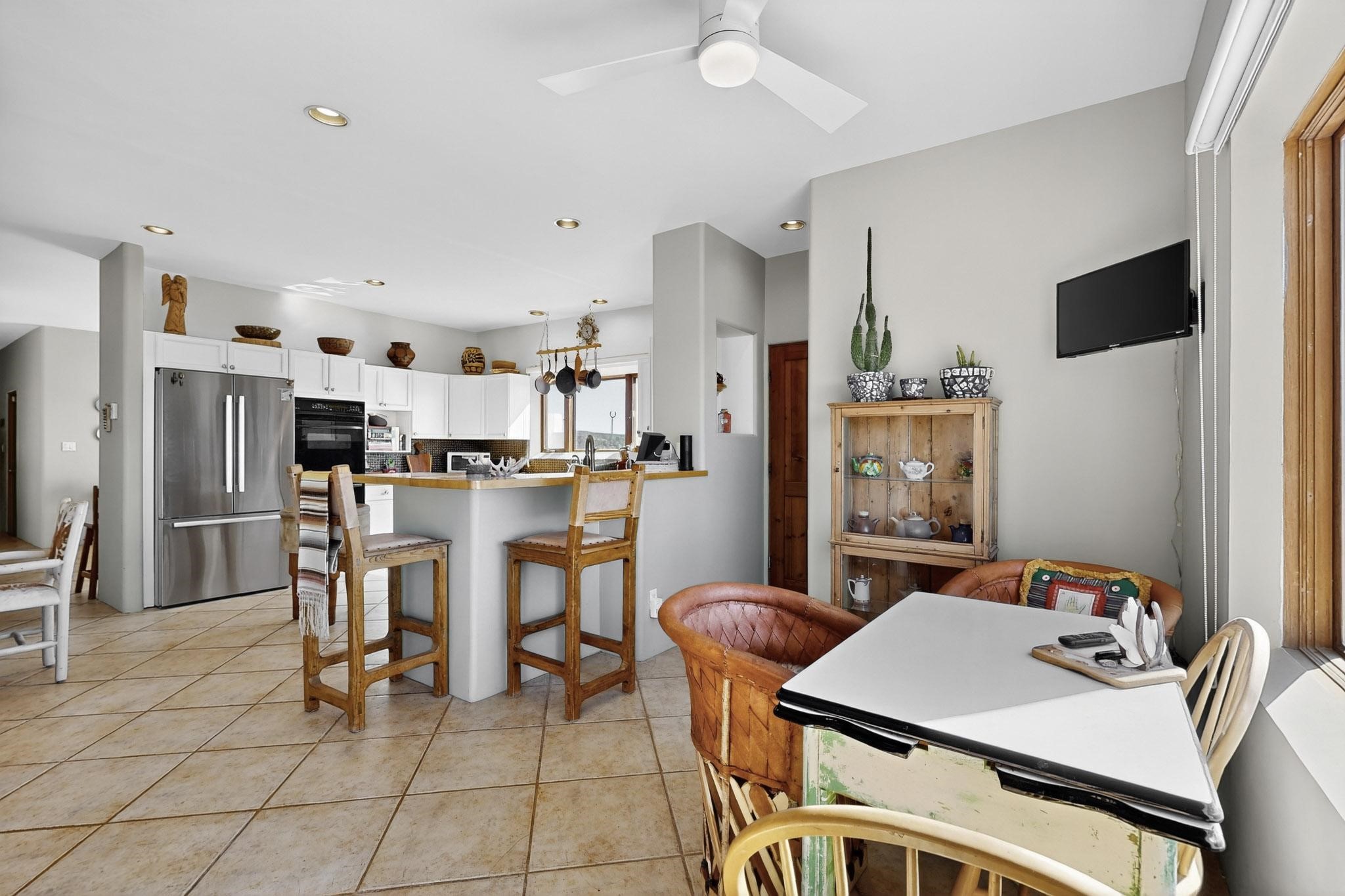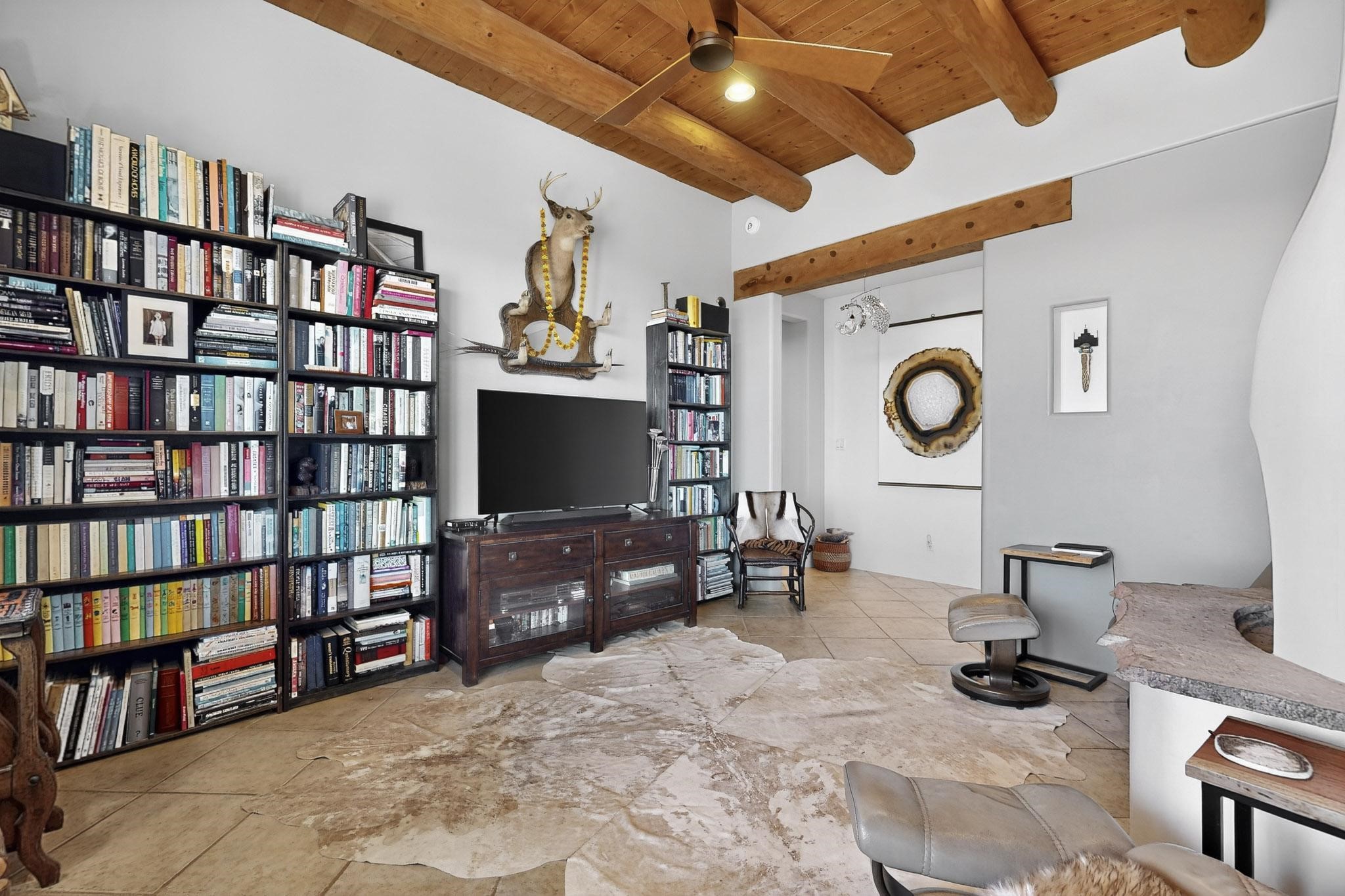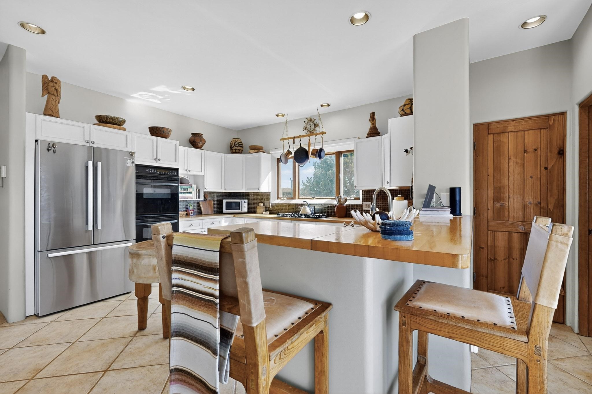 Custom designed and built spacious single level, open plan, split bedroom design in Eldorado bordering Los Caballos. Privacy and fabulous mountain and sunset views from home and portals. There are two unique back to back fireplaces, one in each room, a dramatic Chacoan style stone facing in the family room and a traditional kiva in the family room/study. The private owners suite features two separate 3/4 bath rooms, one with a tub and the other with a walk in sharable shower, plus 2 walk in closets. The laundry room is close by off the hall. The large kitchen includes a breakfast bar and cosy breakfast nook which accesses the south portal and gardens, plus there is an extra half bath for guests. There is a formal dining area with access to a private walled garden and patio. Both guest bedrooms are a good size and share a full bath between them. The oversized 2 car finished garage has plenty of guest parking. Incredible expansive night skies from spacious fenced gardens it is centered on 1 1/2 acres on the south central border of Eldorado. Easy access to all the Eldorado amenities, local shopping centers and only minutes into Santa Fe.