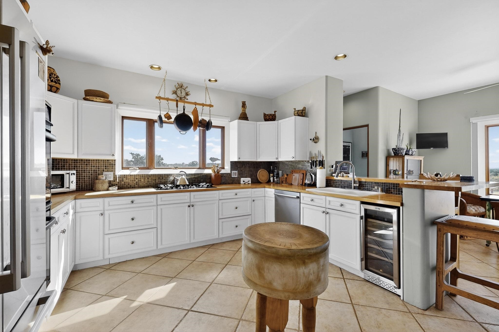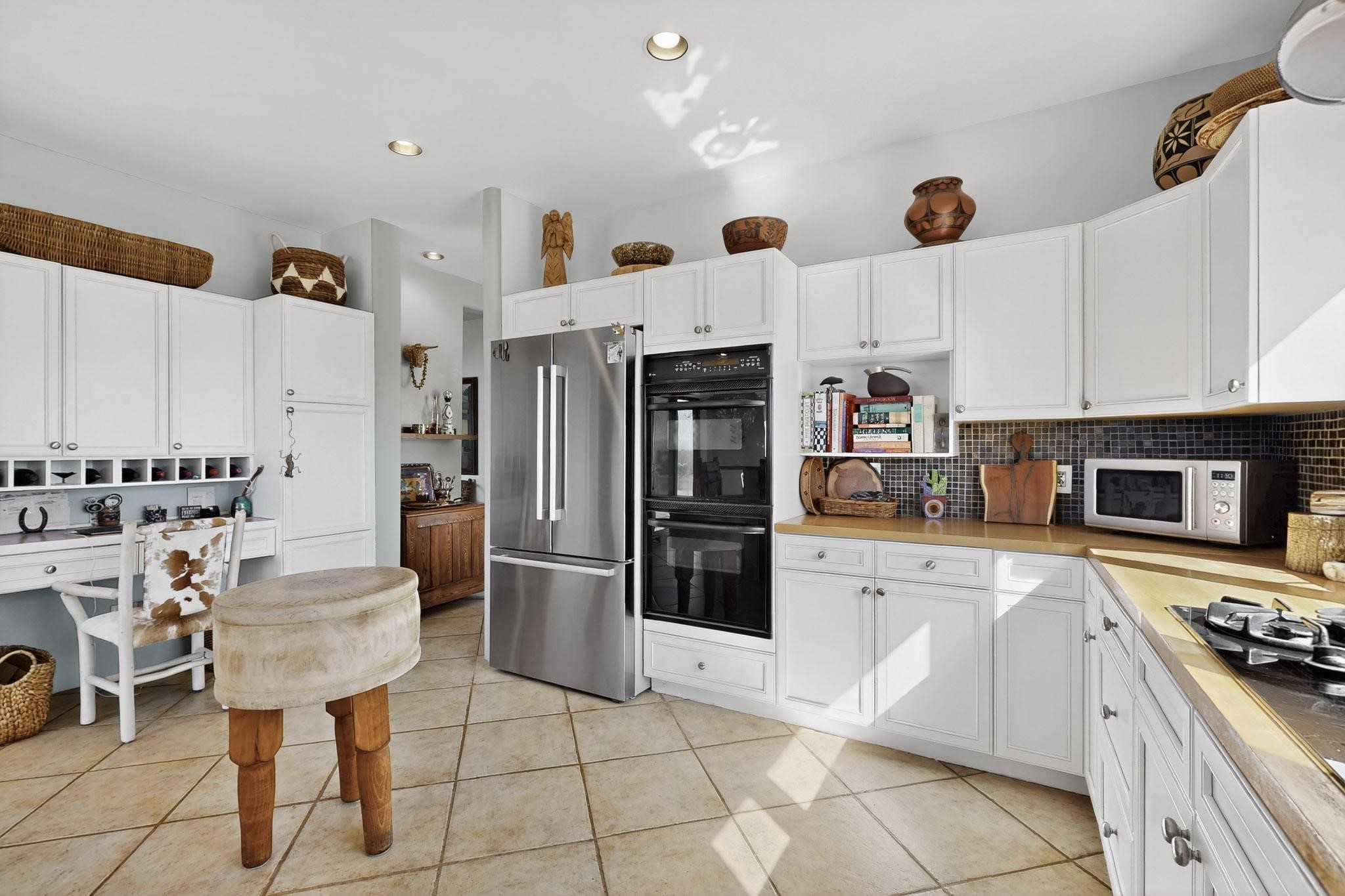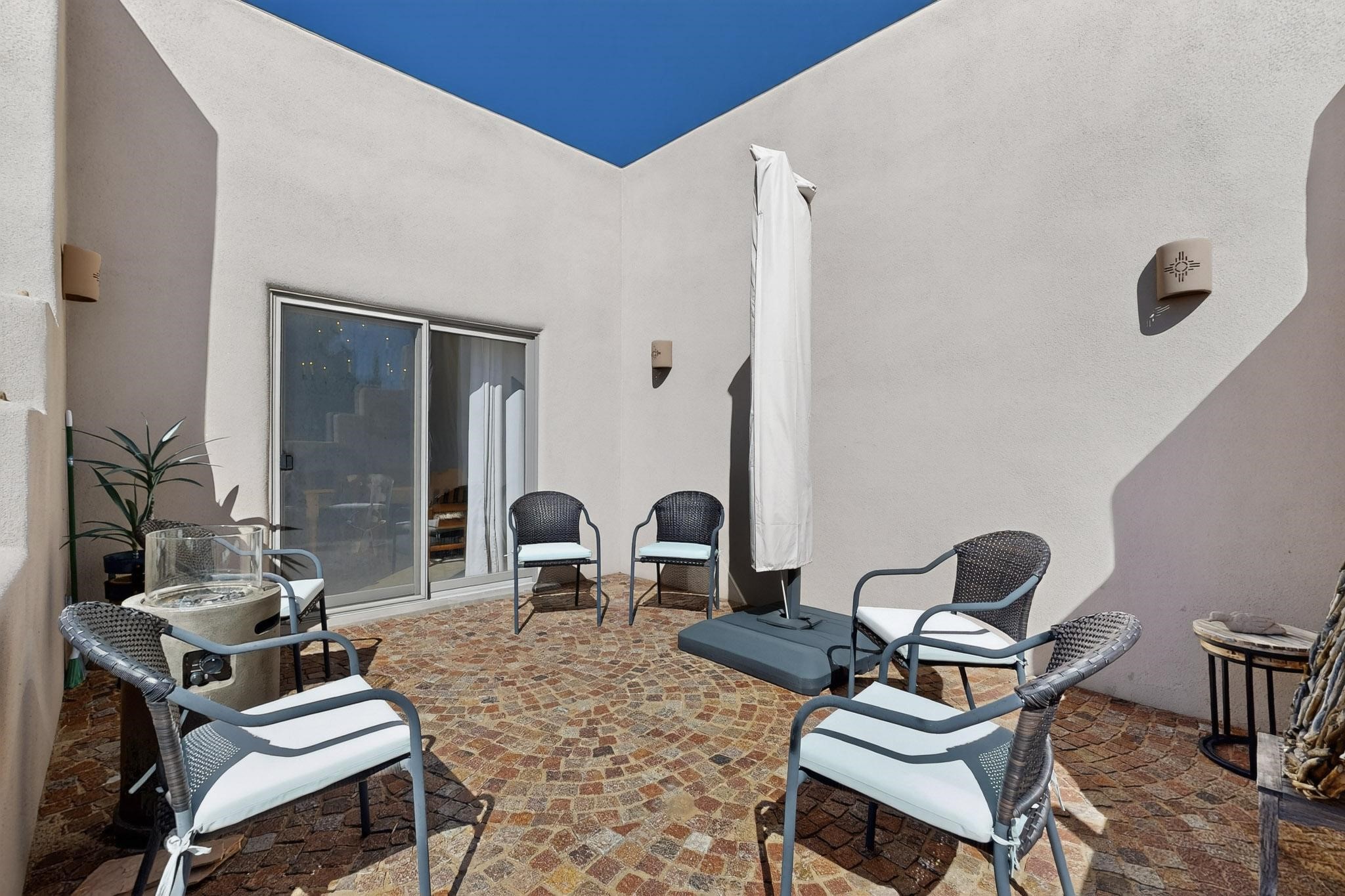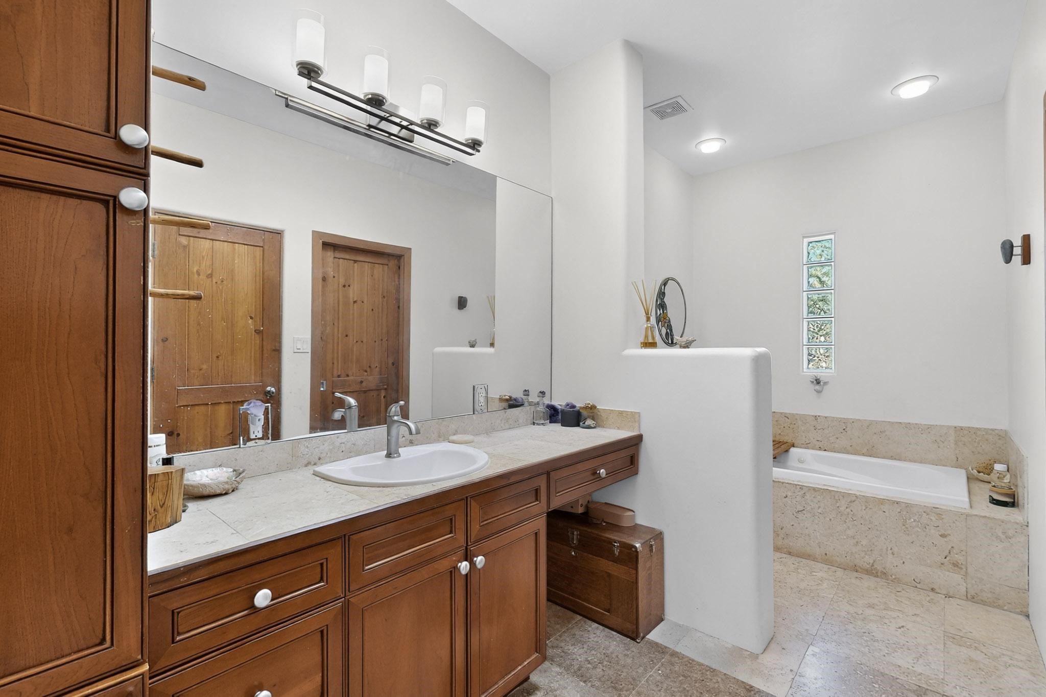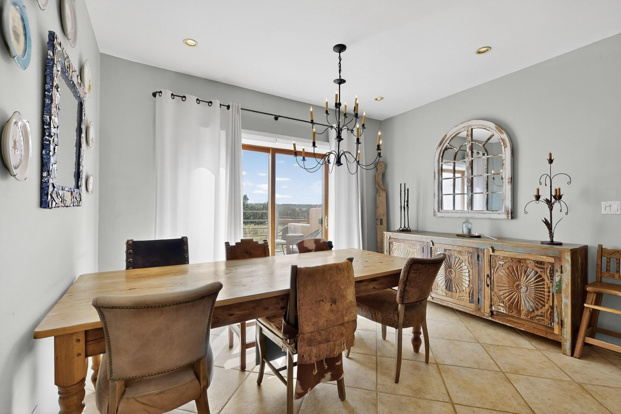 Custom designed and built spacious single level, open plan, split bedroom design in Eldorado bordering Los Caballos. Privacy and fabulous mountain and sunset views from home and portals. There are two unique back to back fireplaces, one in each room, a dramatic Chacoan style stone facing in the family room and a traditional kiva in the family room/study. The private owners suite features two separate 3/4 bath rooms, one with a tub and the other with a walk in sharable shower, plus 2 walk in closets. The laundry room is close by off the hall. The large kitchen includes a breakfast bar and cosy breakfast nook which accesses the south portal and gardens, plus there is an extra half bath for guests. There is a formal dining area with access to a private walled garden and patio. Both guest bedrooms are a good size and share a full bath between them. The oversized 2 car finished garage has plenty of guest parking. Incredible expansive night skies from spacious fenced gardens it is centered on 1 1/2 acres on the south central border of Eldorado. Easy access to all the Eldorado amenities, local shopping centers and only minutes into Santa Fe.