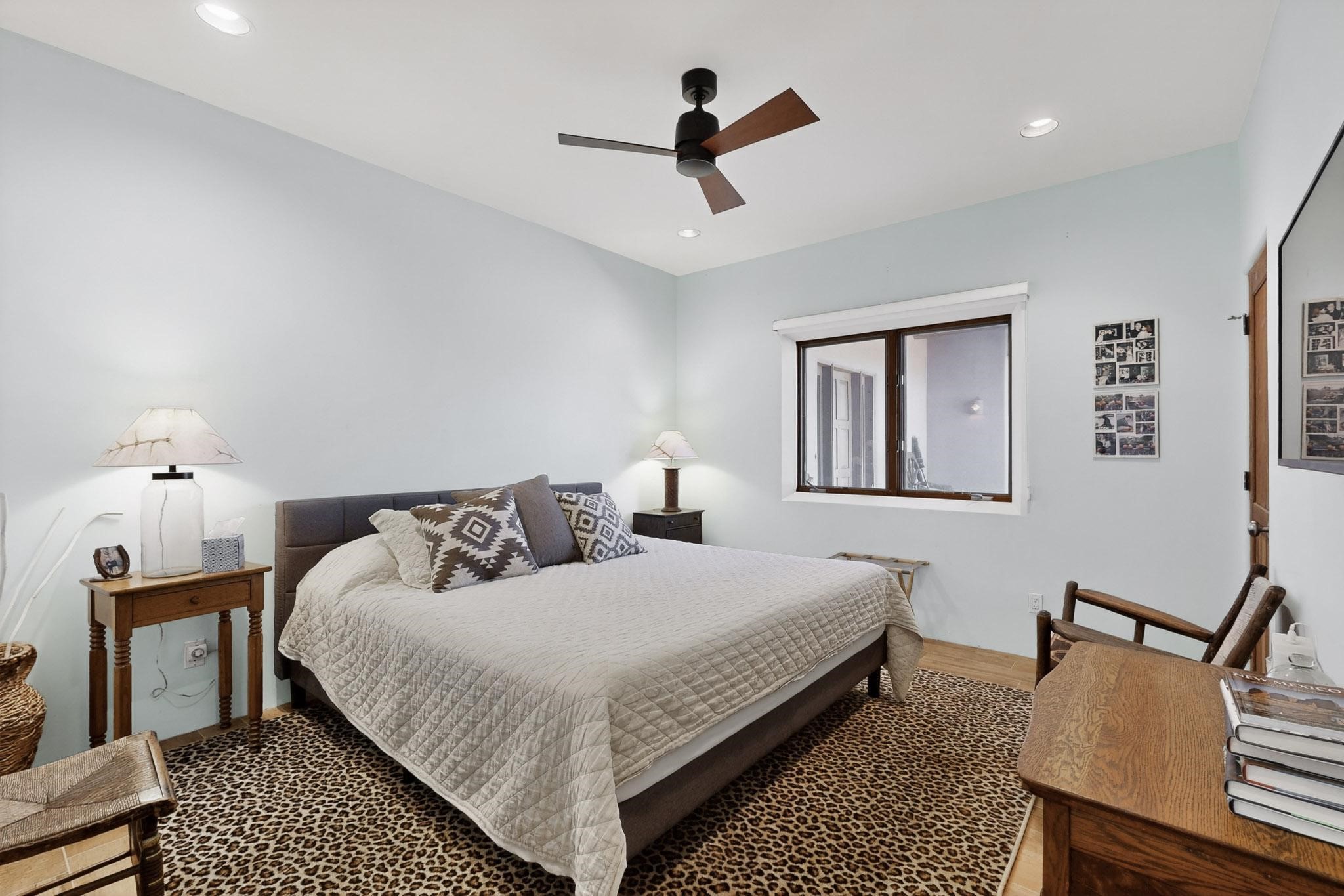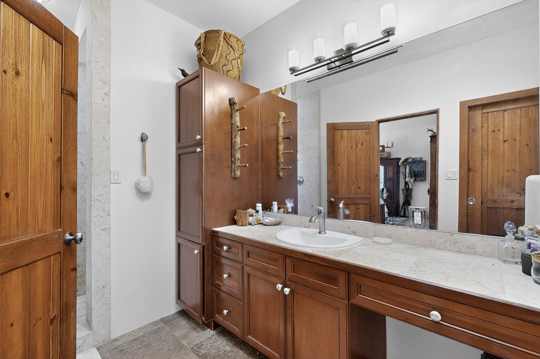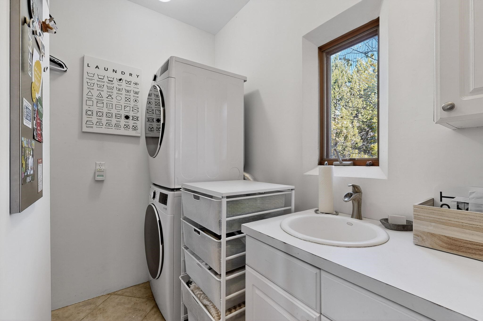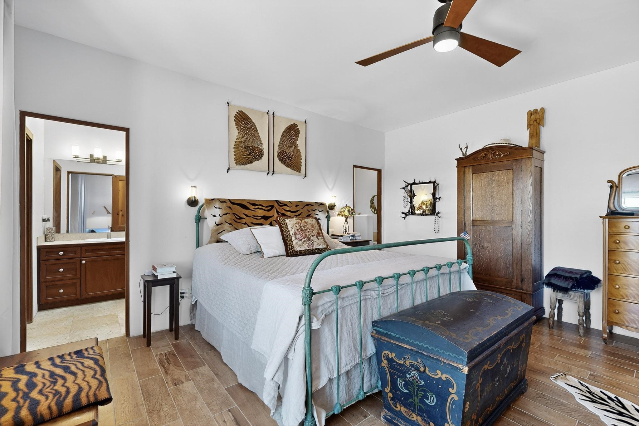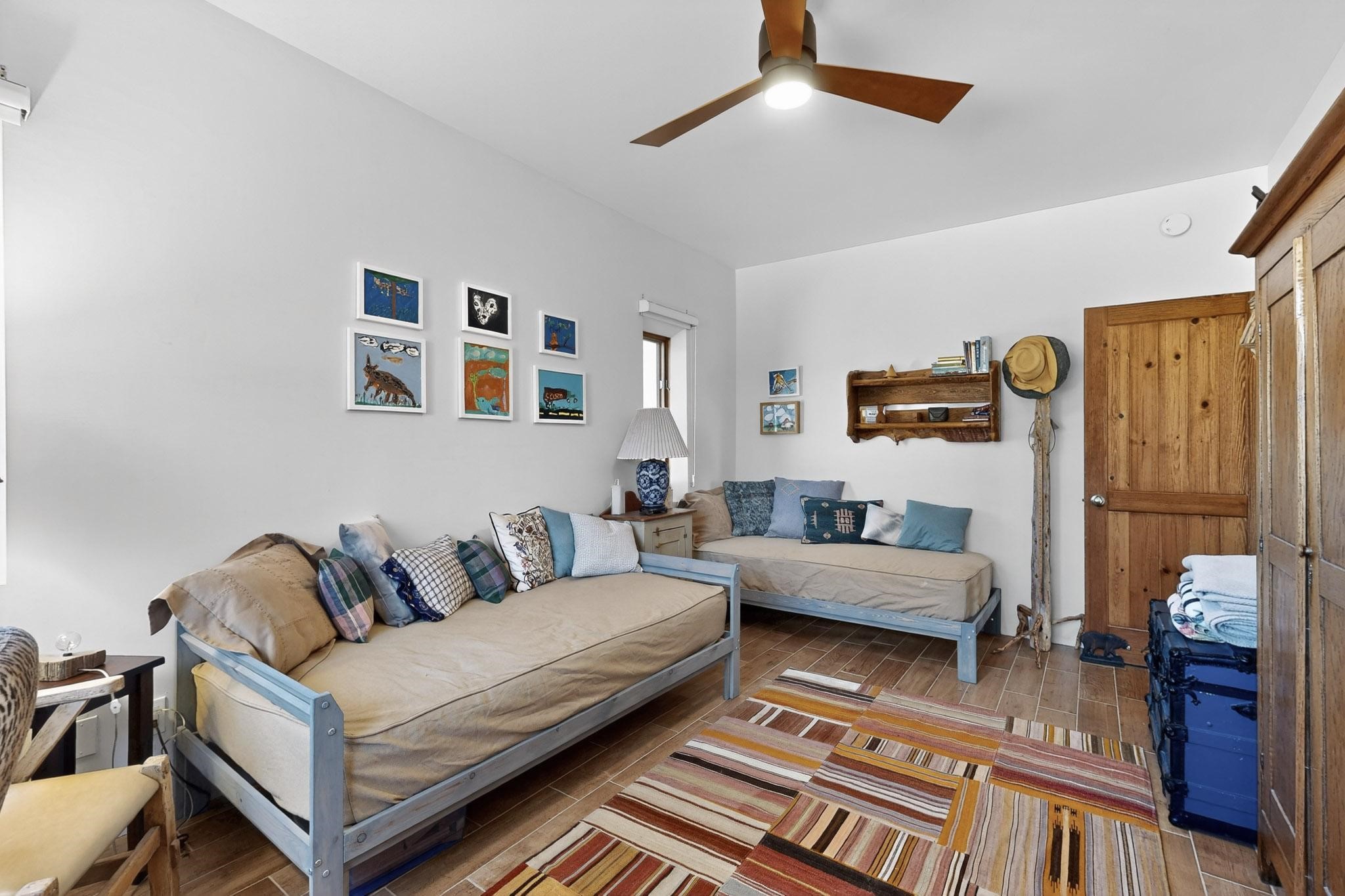 Custom designed and built spacious single level, open plan, split bedroom design in Eldorado bordering Los Caballos. Privacy and fabulous mountain and sunset views from home and portals. There are two unique back to back fireplaces, one in each room, a dramatic Chacoan style stone facing in the family room and a traditional kiva in the family room/study. The private owners suite features two separate 3/4 bath rooms, one with a tub and the other with a walk in sharable shower, plus 2 walk in closets. The laundry room is close by off the hall. The large kitchen includes a breakfast bar and cosy breakfast nook which accesses the south portal and gardens, plus there is an extra half bath for guests. There is a formal dining area with access to a private walled garden and patio. Both guest bedrooms are a good size and share a full bath between them. The oversized 2 car finished garage has plenty of guest parking. Incredible expansive night skies from spacious fenced gardens it is centered on 1 1/2 acres on the south central border of Eldorado. Easy access to all the Eldorado amenities, local shopping centers and only minutes into Santa Fe.