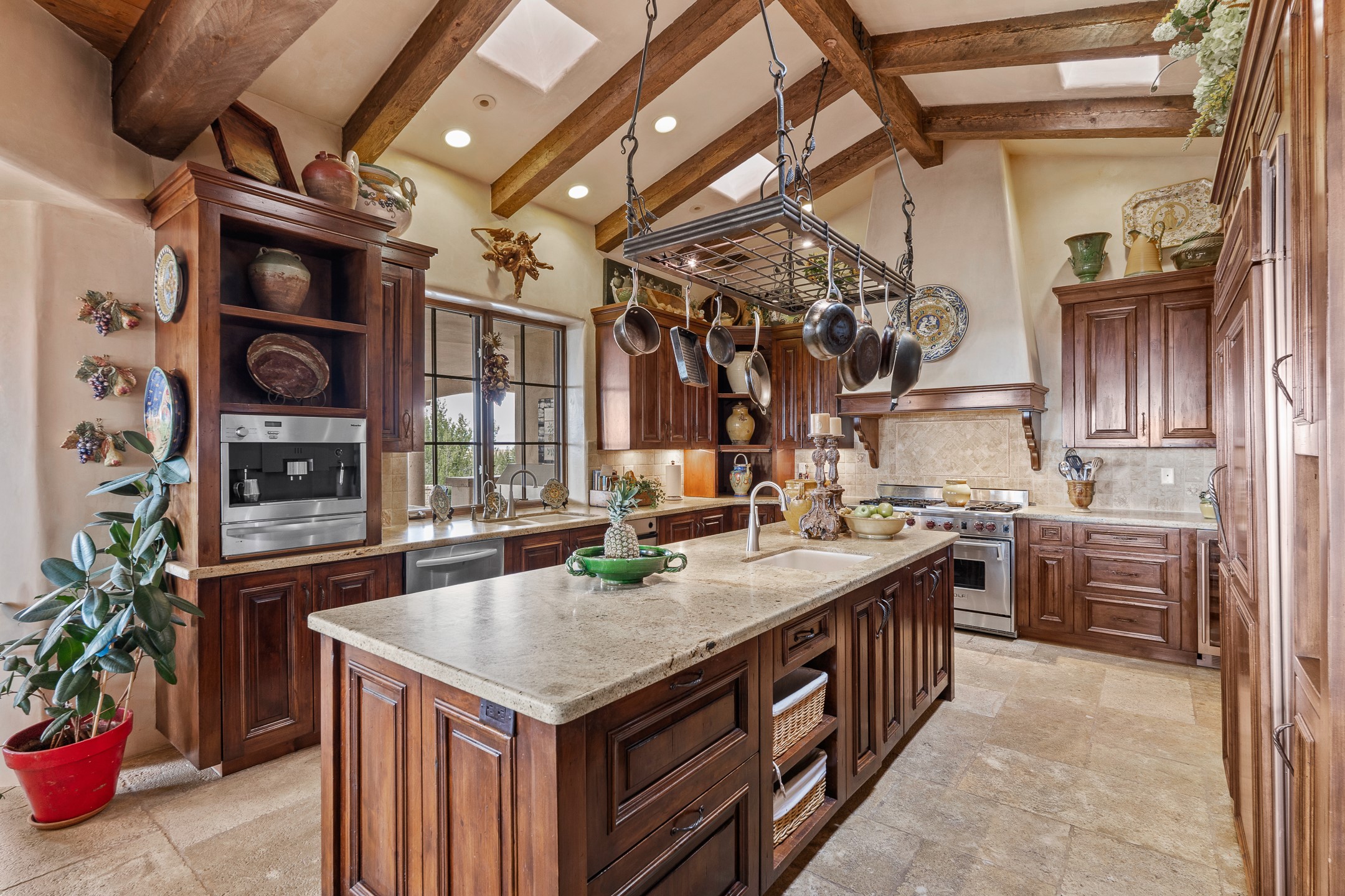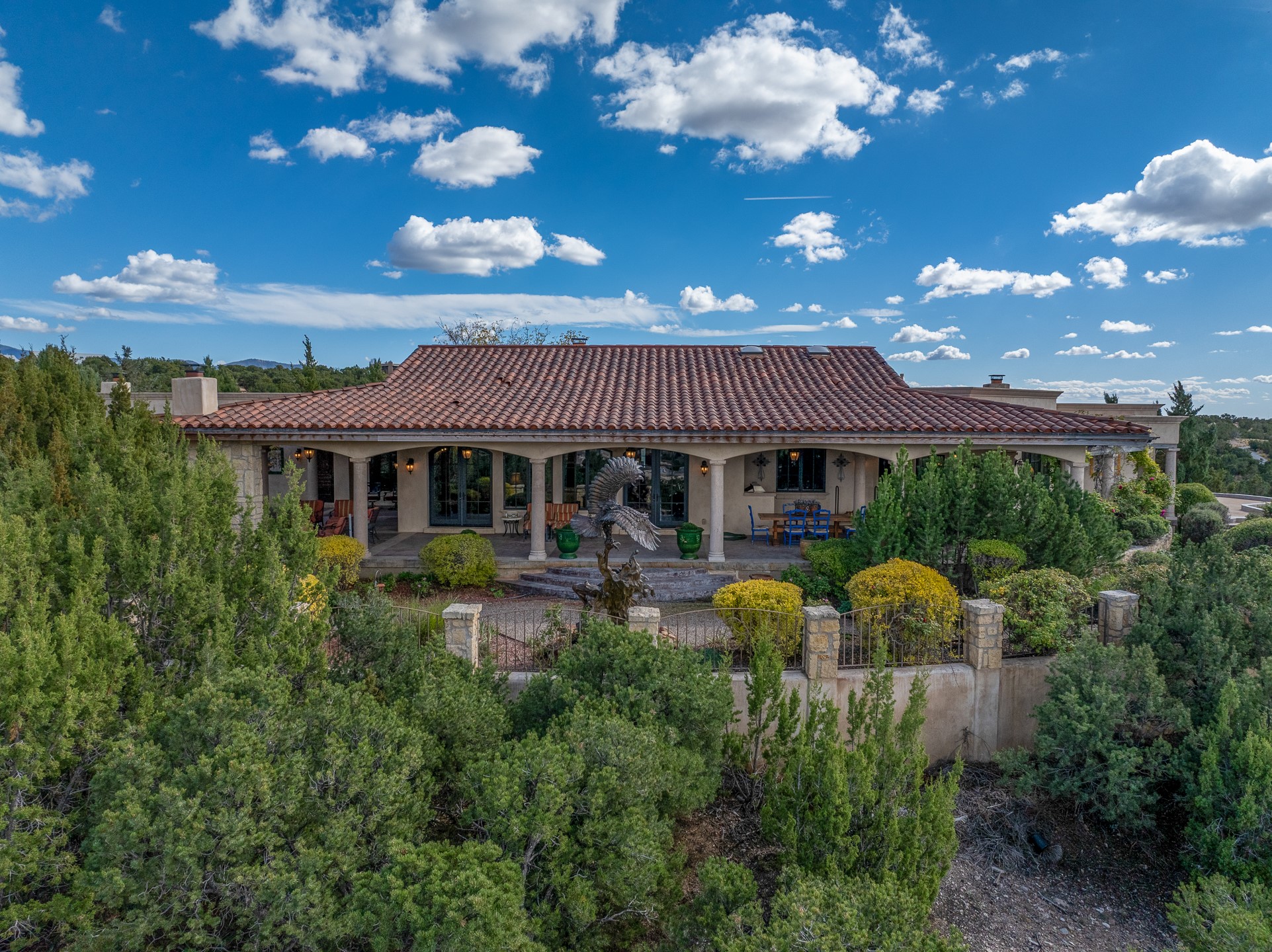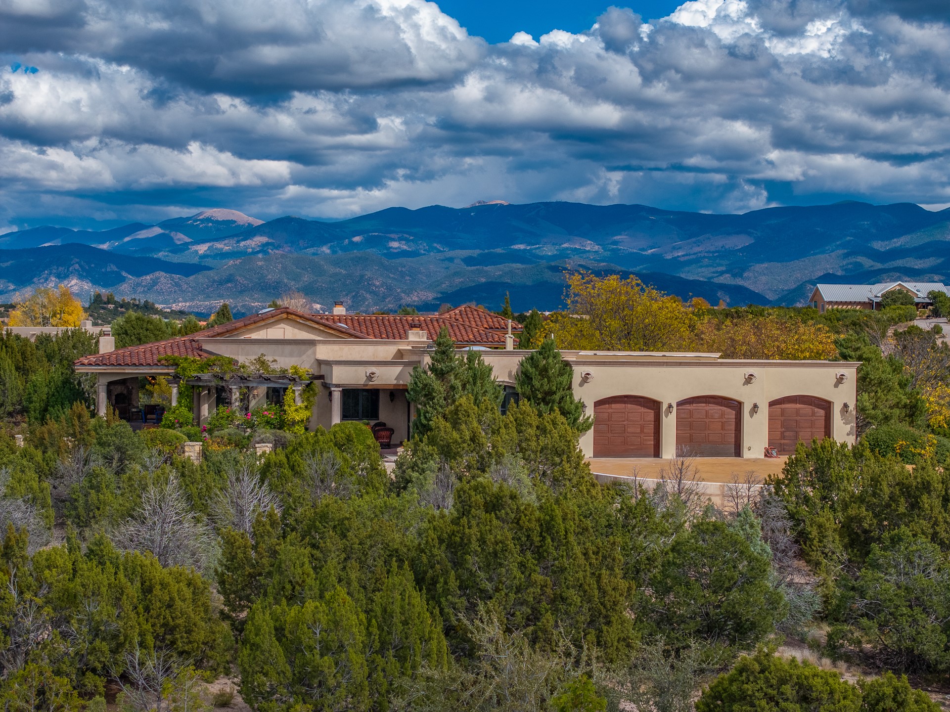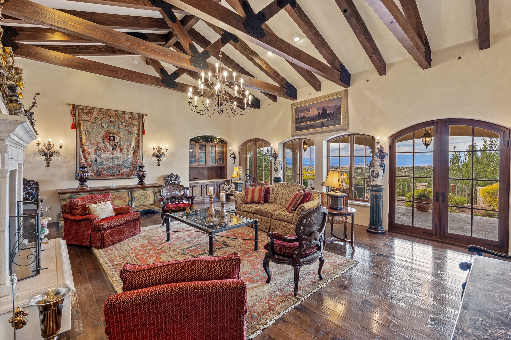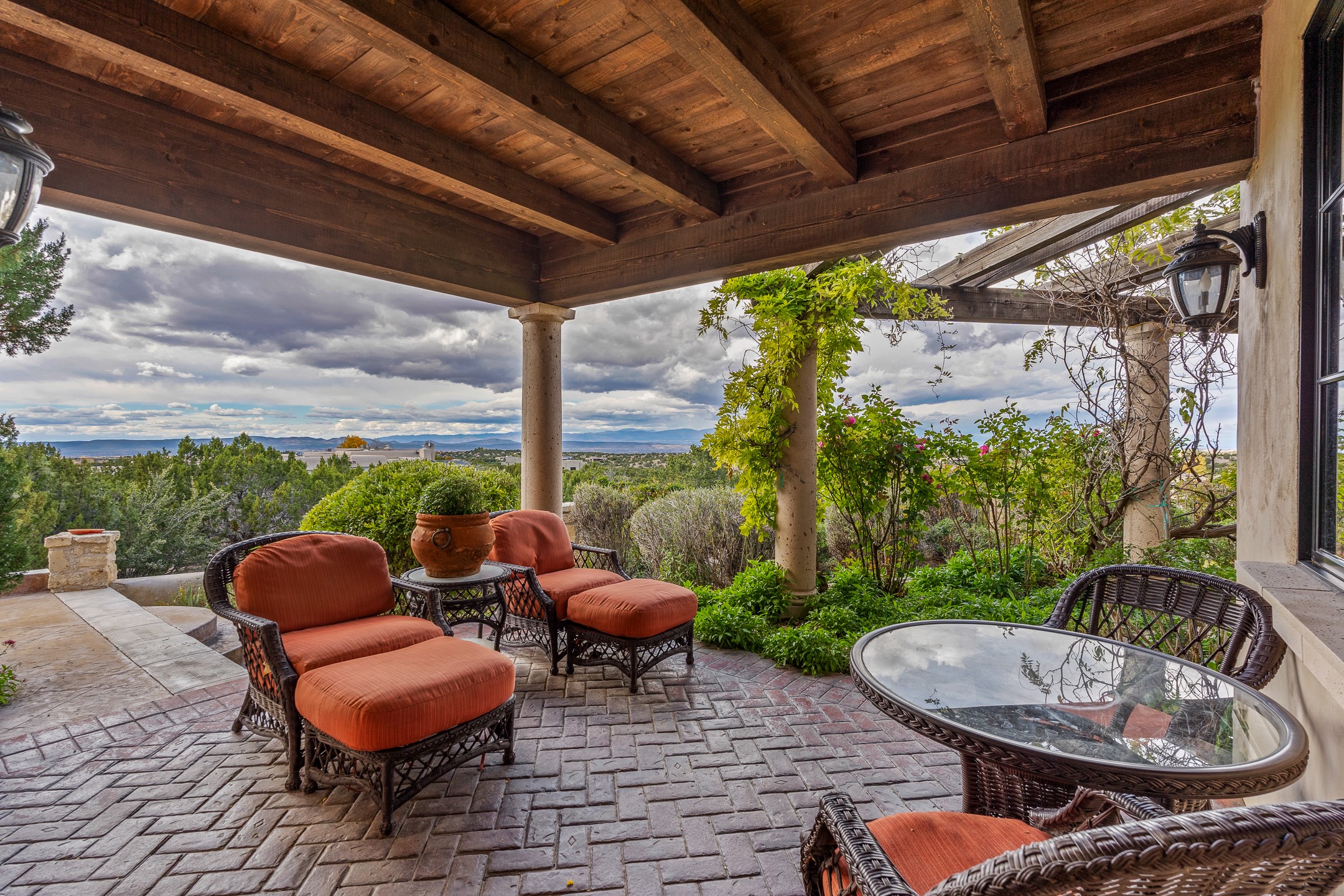 For those drawn to the romance of Italy, this extraordinary residence captures the essence of a Tuscan villa translated beautifully into the high desert landscape of Santa Fe. Nestled on 2.5 acres in the coveted Sundance Estates, this home with 4 bedrooms plus an office, 4.5 baths, and a 3-car garage offers 5,013 square feet of refined living, crafted with exquisite detail and timeless materials. Beyond stately wrought-iron gates, cupid sculptures and a stamped and colored concrete drive lead to a grand arrival with limestone walls, a graceful fountain, and hand-hewn double doors. Inside, rich walnut and travertine floors create a harmonious blend of warmth and sophistication. Diamond plaster walls, coved plaster ceilings, and rustic wood trestle beams evoke the artistry of old-world Europe, while expansive windows and French doors frame breathtaking mountain and sunset vistas. The chef's kitchen is a showpiece--adorned with alder cabinetry, granite countertops, a Wolf range, a Subzero refrigerator, a built-in Miele coffee center, and a wine cooler. Here you'll be romanced by a generous island, casual dining area, and adjoining family room with a fireplace, creating an inviting central gathering space. The kitchen and living room open to a deep covered portal designed for alfresco entertaining, featuring an outdoor kitchen, limestone fireplace, and rose garden.The east wing hosts the elegant primary suite with its own fireplace, private portal, and in-ground spa with a waterfall. The spa-like bath offers dual vanities, a soaking tub, and a large walk-in shower, while the custom closet provides both beauty and functionality. On the west side of the home, you will find 2 guest suites providing separation and privacy. There is also a handsome study with a built-in desk and shelves, and a view to the front garden and fountain. Additionally, there is a private casita with its own entrance, kitchenette, and ensuite bath offers comfort and independence for guests.