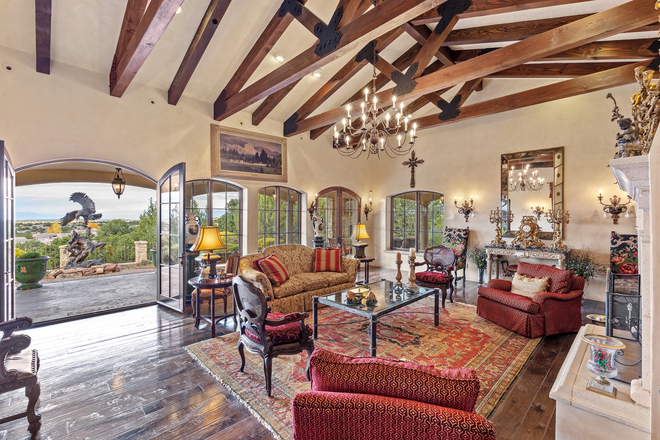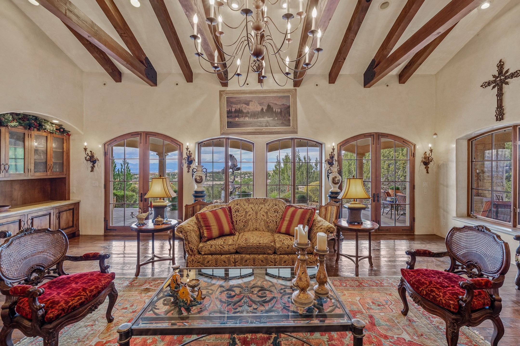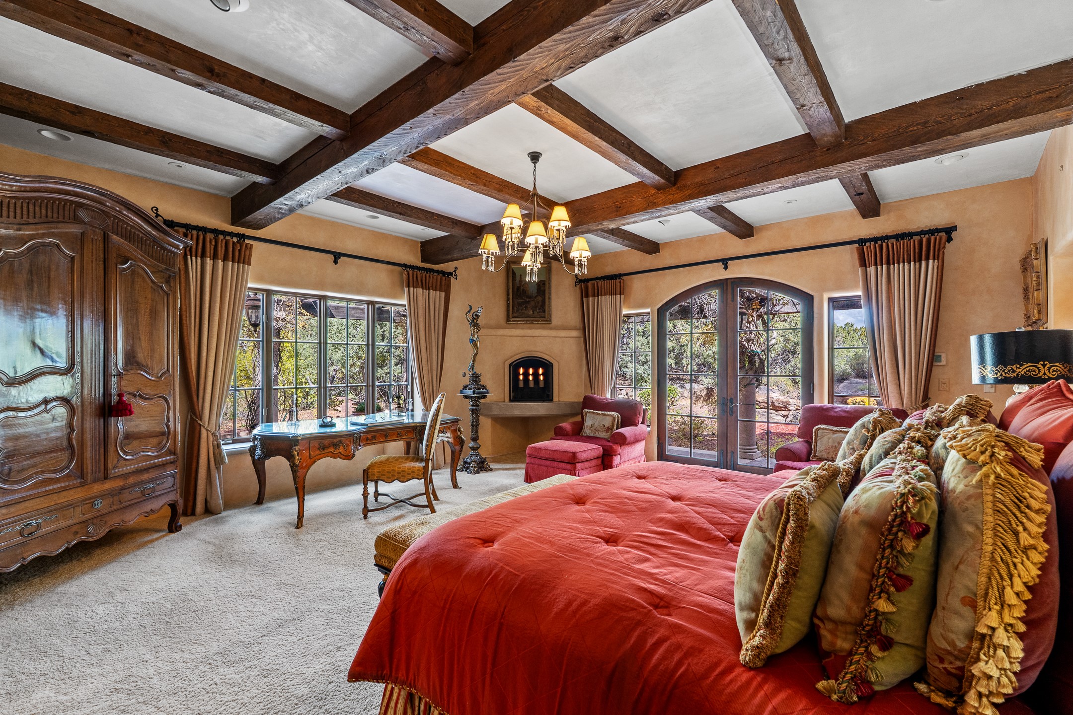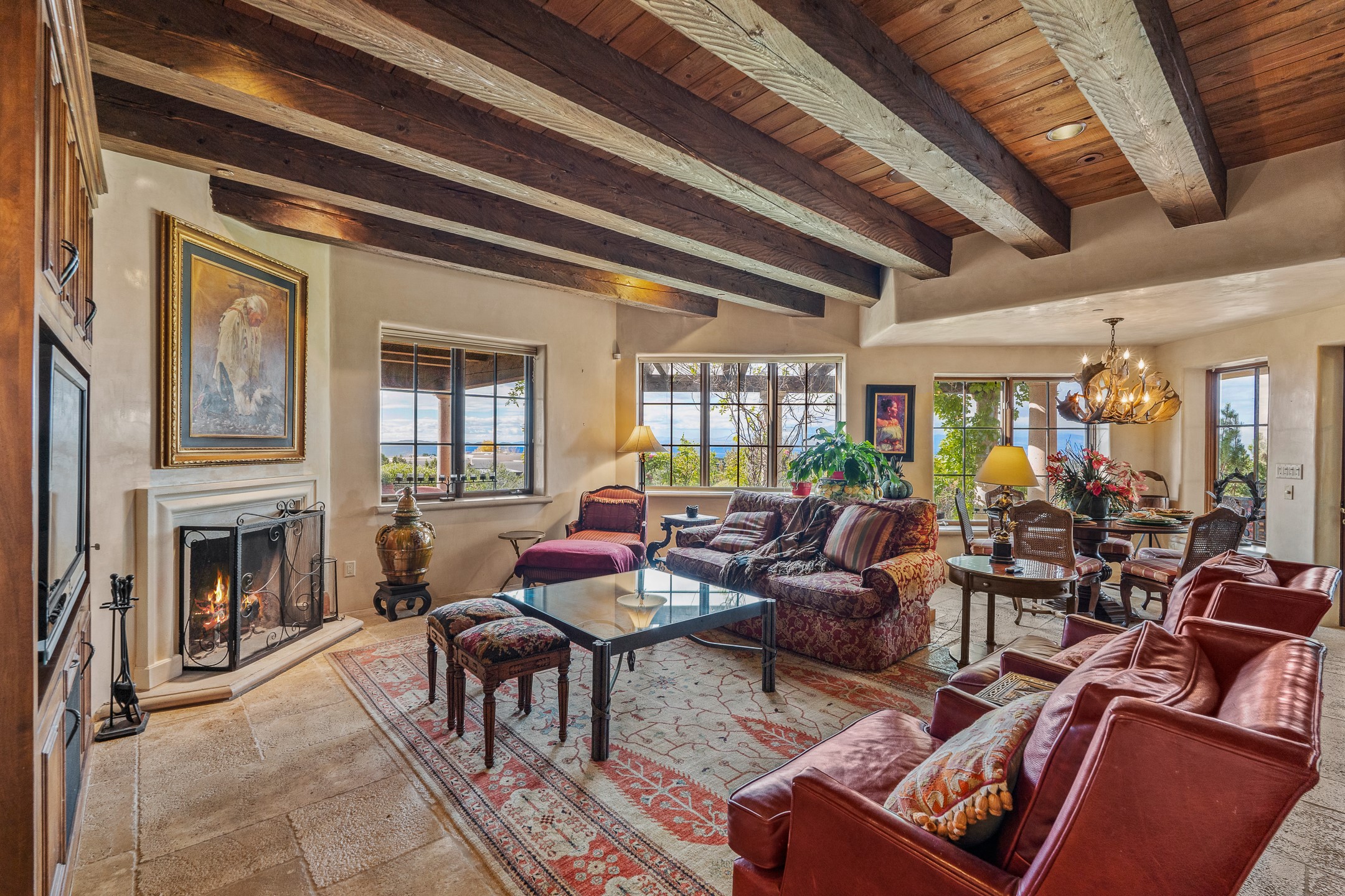 For those drawn to the romance of Italy, this extraordinary residence captures the essence of a Tuscan villa translated beautifully into the high desert landscape of Santa Fe. Nestled on 2.5 acres in the coveted Sundance Estates, this home with 4 bedrooms plus an office, 4.5 baths, and a 3-car garage offers 5,013 square feet of refined living, crafted with exquisite detail and timeless materials. Beyond stately wrought-iron gates, cupid sculptures and a stamped and colored concrete drive lead to a grand arrival with limestone walls, a graceful fountain, and hand-hewn double doors. Inside, rich walnut and travertine floors create a harmonious blend of warmth and sophistication. Diamond plaster walls, coved plaster ceilings, and rustic wood trestle beams evoke the artistry of old-world Europe, while expansive windows and French doors frame breathtaking mountain and sunset vistas. The chef's kitchen is a showpiece--adorned with alder cabinetry, granite countertops, a Wolf range, a Subzero refrigerator, a built-in Miele coffee center, and a wine cooler. Here you'll be romanced by a generous island, casual dining area, and adjoining family room with a fireplace, creating an inviting central gathering space. The kitchen and living room open to a deep covered portal designed for alfresco entertaining, featuring an outdoor kitchen, limestone fireplace, and rose garden.The east wing hosts the elegant primary suite with its own fireplace, private portal, and in-ground spa with a waterfall. The spa-like bath offers dual vanities, a soaking tub, and a large walk-in shower, while the custom closet provides both beauty and functionality. On the west side of the home, you will find 2 guest suites providing separation and privacy. There is also a handsome study with a built-in desk and shelves, and a view to the front garden and fountain. Additionally, there is a private casita with its own entrance, kitchenette, and ensuite bath offers comfort and independence for guests.