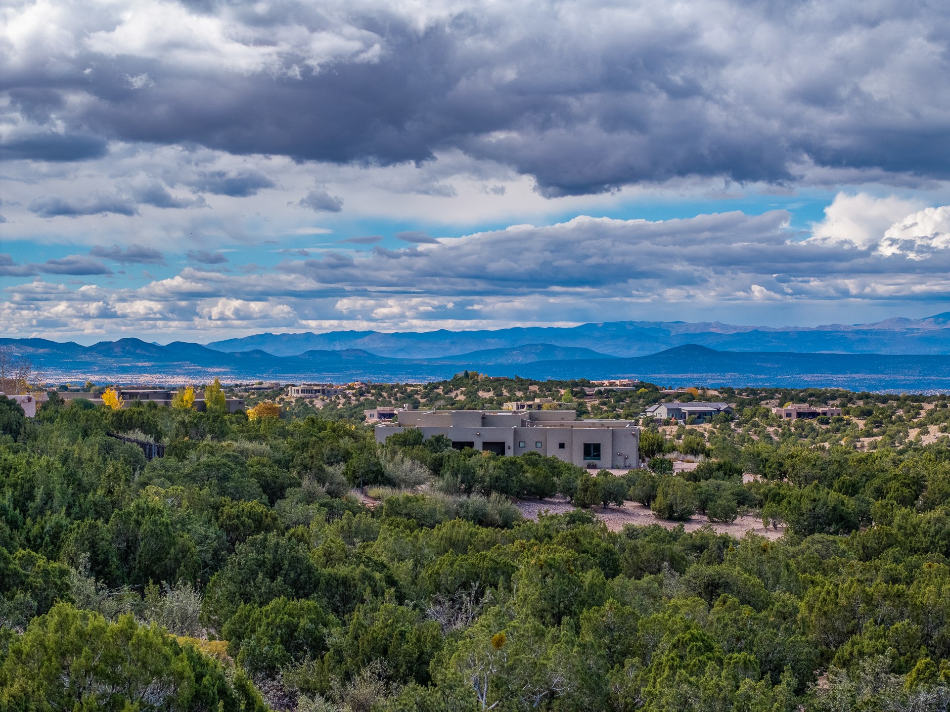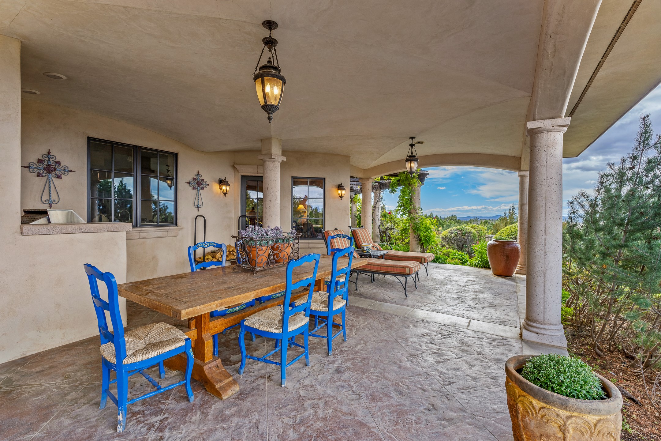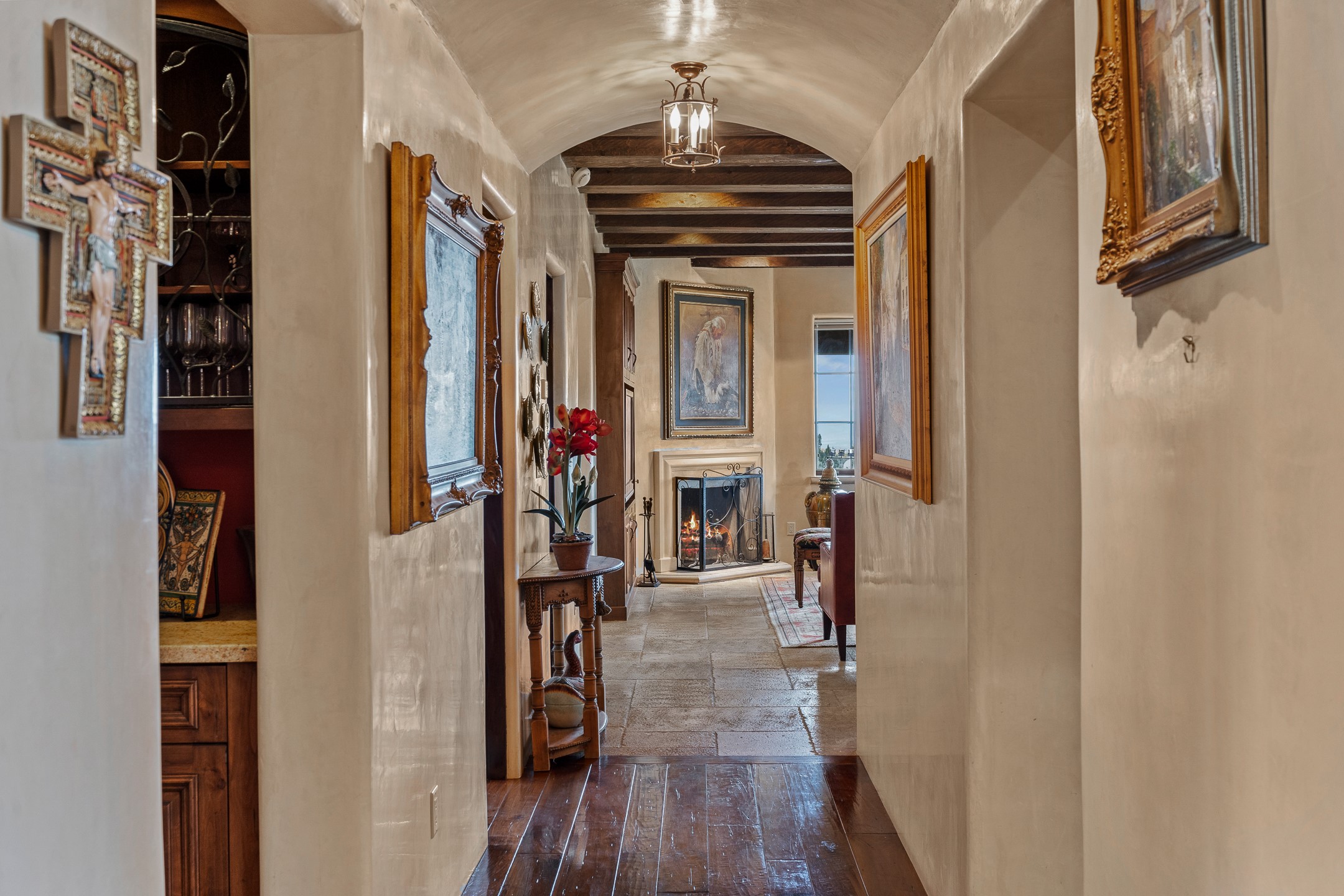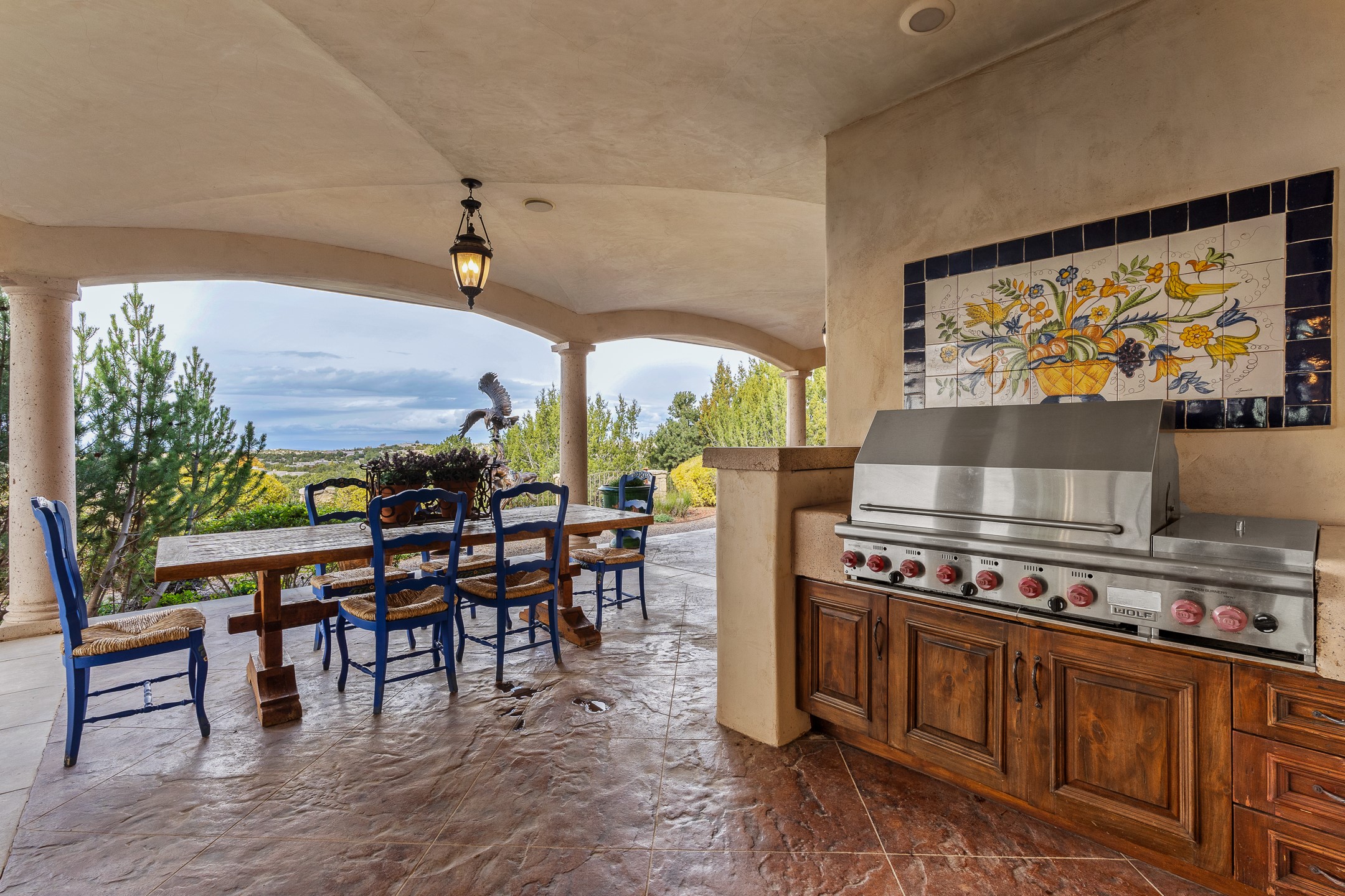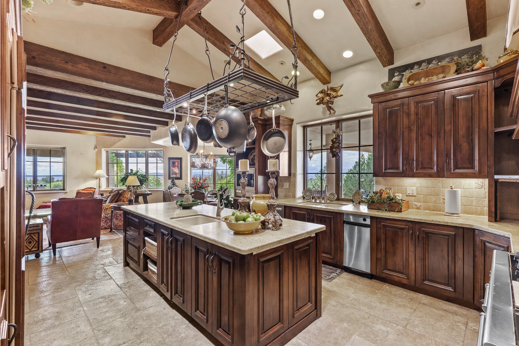 For those drawn to the romance of Italy, this extraordinary residence captures the essence of a Tuscan villa translated beautifully into the high desert landscape of Santa Fe. Nestled on 2.5 acres in the coveted Sundance Estates, this home with 4 bedrooms plus an office, 4.5 baths, and a 3-car garage offers 5,013 square feet of refined living, crafted with exquisite detail and timeless materials. Beyond stately wrought-iron gates, cupid sculptures and a stamped and colored concrete drive lead to a grand arrival with limestone walls, a graceful fountain, and hand-hewn double doors. Inside, rich walnut and travertine floors create a harmonious blend of warmth and sophistication. Diamond plaster walls, coved plaster ceilings, and rustic wood trestle beams evoke the artistry of old-world Europe, while expansive windows and French doors frame breathtaking mountain and sunset vistas. The chef's kitchen is a showpiece--adorned with alder cabinetry, granite countertops, a Wolf range, a Subzero refrigerator, a built-in Miele coffee center, and a wine cooler. Here you'll be romanced by a generous island, casual dining area, and adjoining family room with a fireplace, creating an inviting central gathering space. The kitchen and living room open to a deep covered portal designed for alfresco entertaining, featuring an outdoor kitchen, limestone fireplace, and rose garden.The east wing hosts the elegant primary suite with its own fireplace, private portal, and in-ground spa with a waterfall. The spa-like bath offers dual vanities, a soaking tub, and a large walk-in shower, while the custom closet provides both beauty and functionality. On the west side of the home, you will find 2 guest suites providing separation and privacy. There is also a handsome study with a built-in desk and shelves, and a view to the front garden and fountain. Additionally, there is a private casita with its own entrance, kitchenette, and ensuite bath offers comfort and independence for guests.