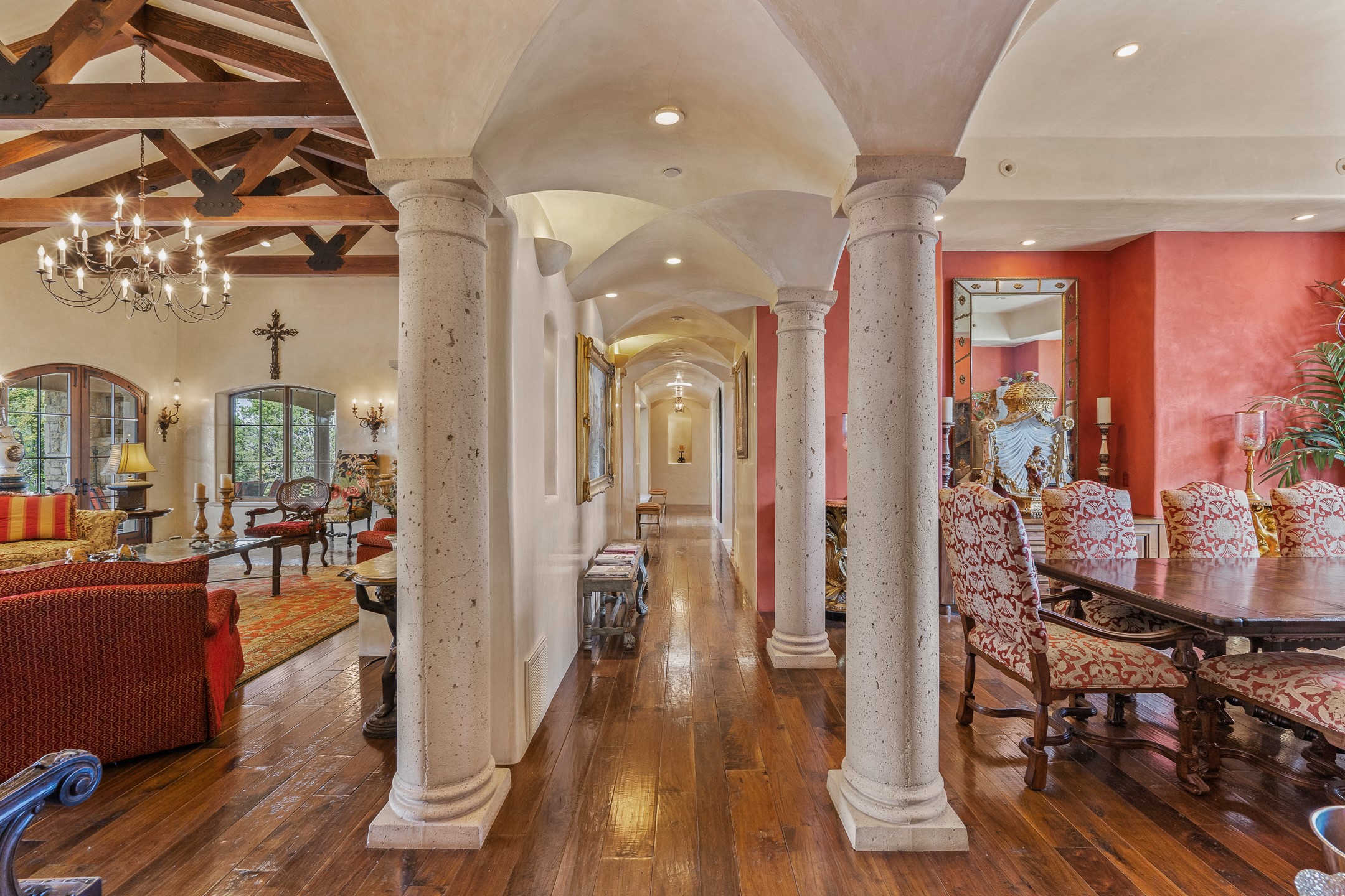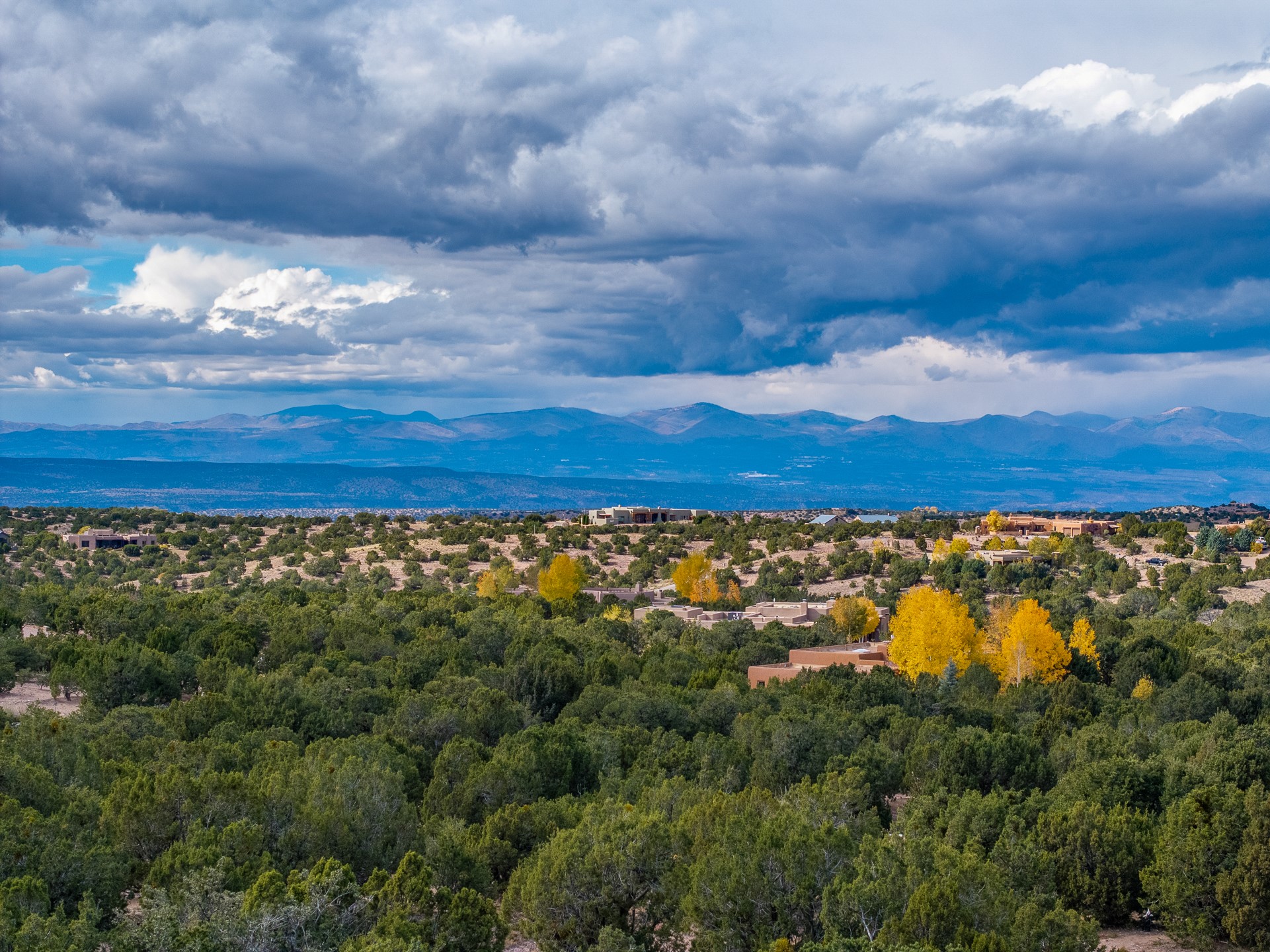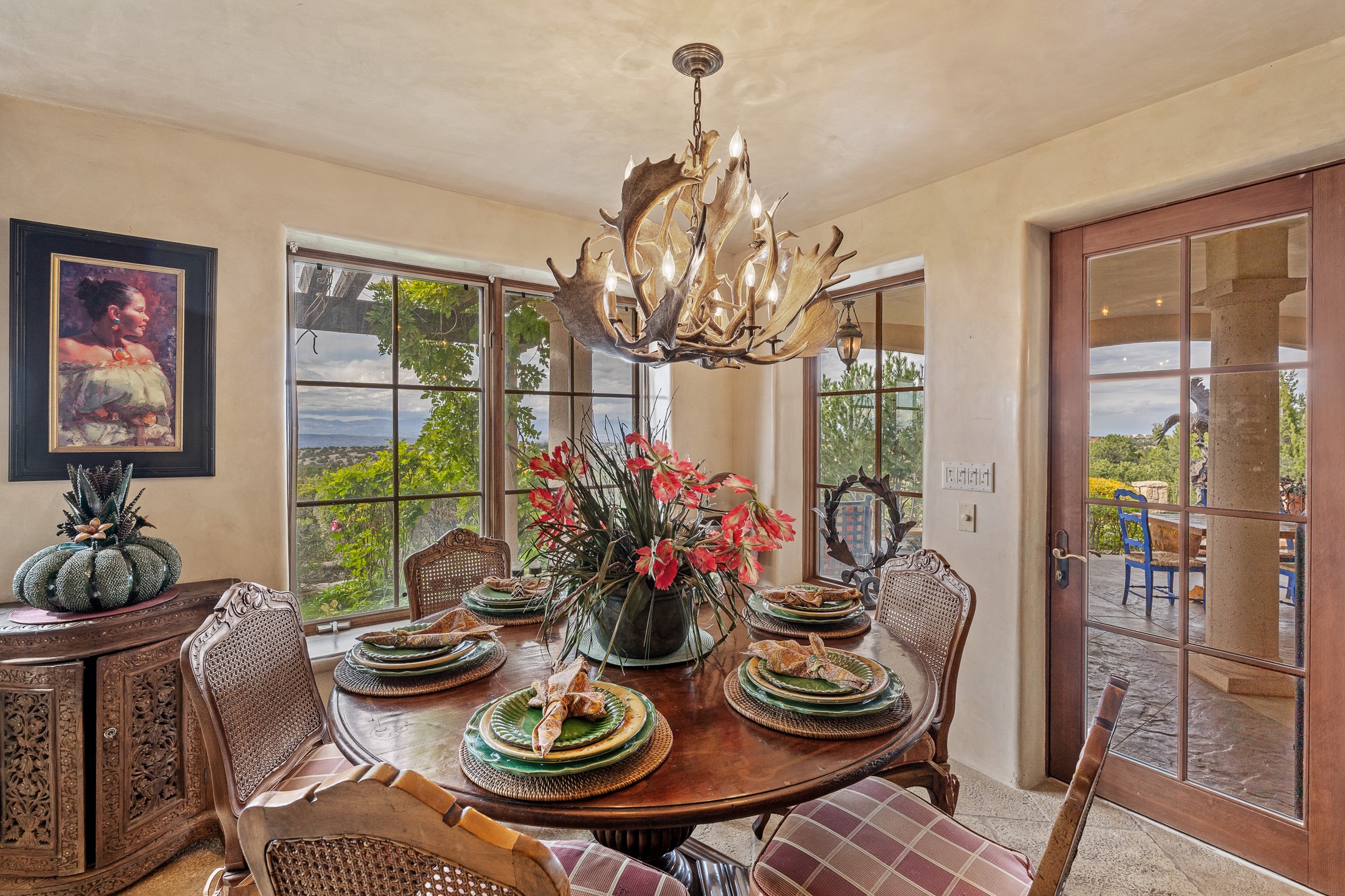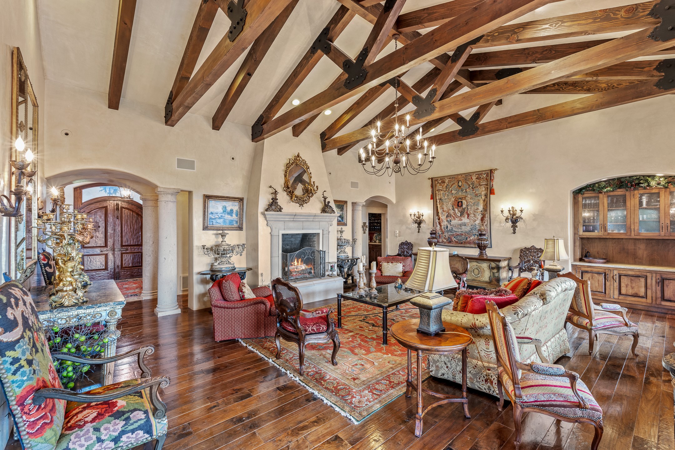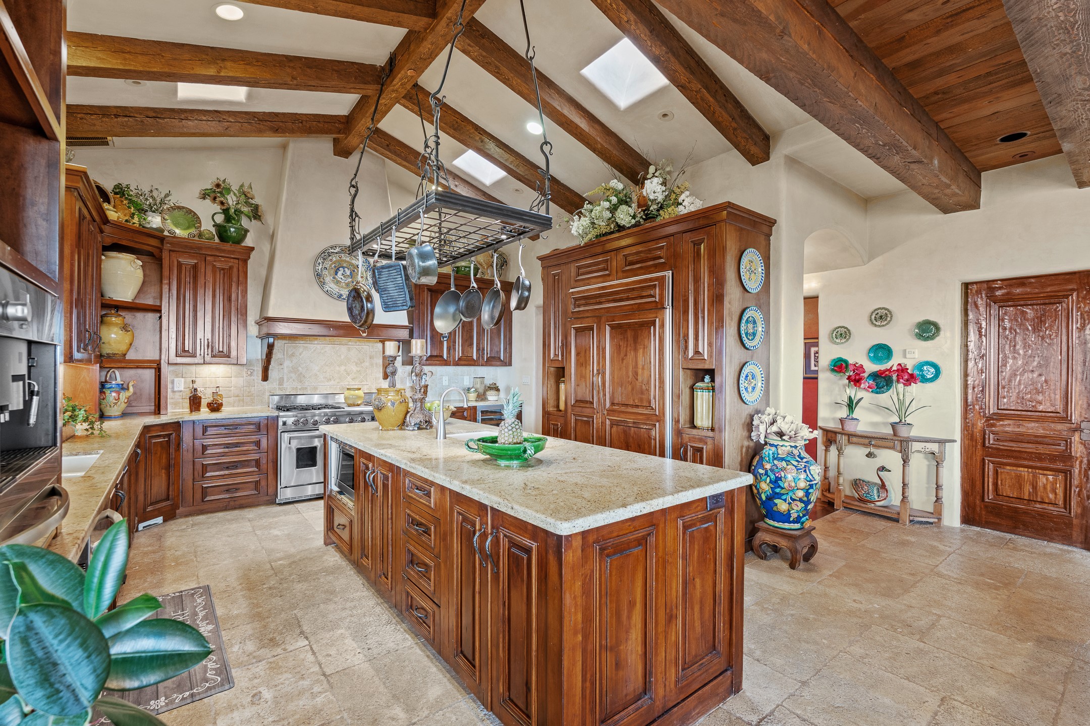 For those drawn to the romance of Italy, this extraordinary residence captures the essence of a Tuscan villa translated beautifully into the high desert landscape of Santa Fe. Nestled on 2.5 acres in the coveted Sundance Estates, this home with 4 bedrooms plus an office, 4.5 baths, and a 3-car garage offers 5,013 square feet of refined living, crafted with exquisite detail and timeless materials. Beyond stately wrought-iron gates, cupid sculptures and a stamped and colored concrete drive lead to a grand arrival with limestone walls, a graceful fountain, and hand-hewn double doors. Inside, rich walnut and travertine floors create a harmonious blend of warmth and sophistication. Diamond plaster walls, coved plaster ceilings, and rustic wood trestle beams evoke the artistry of old-world Europe, while expansive windows and French doors frame breathtaking mountain and sunset vistas. The chef's kitchen is a showpiece--adorned with alder cabinetry, granite countertops, a Wolf range, a Subzero refrigerator, a built-in Miele coffee center, and a wine cooler. Here you'll be romanced by a generous island, casual dining area, and adjoining family room with a fireplace, creating an inviting central gathering space. The kitchen and living room open to a deep covered portal designed for alfresco entertaining, featuring an outdoor kitchen, limestone fireplace, and rose garden.The east wing hosts the elegant primary suite with its own fireplace, private portal, and in-ground spa with a waterfall. The spa-like bath offers dual vanities, a soaking tub, and a large walk-in shower, while the custom closet provides both beauty and functionality. On the west side of the home, you will find 2 guest suites providing separation and privacy. There is also a handsome study with a built-in desk and shelves, and a view to the front garden and fountain. Additionally, there is a private casita with its own entrance, kitchenette, and ensuite bath offers comfort and independence for guests.