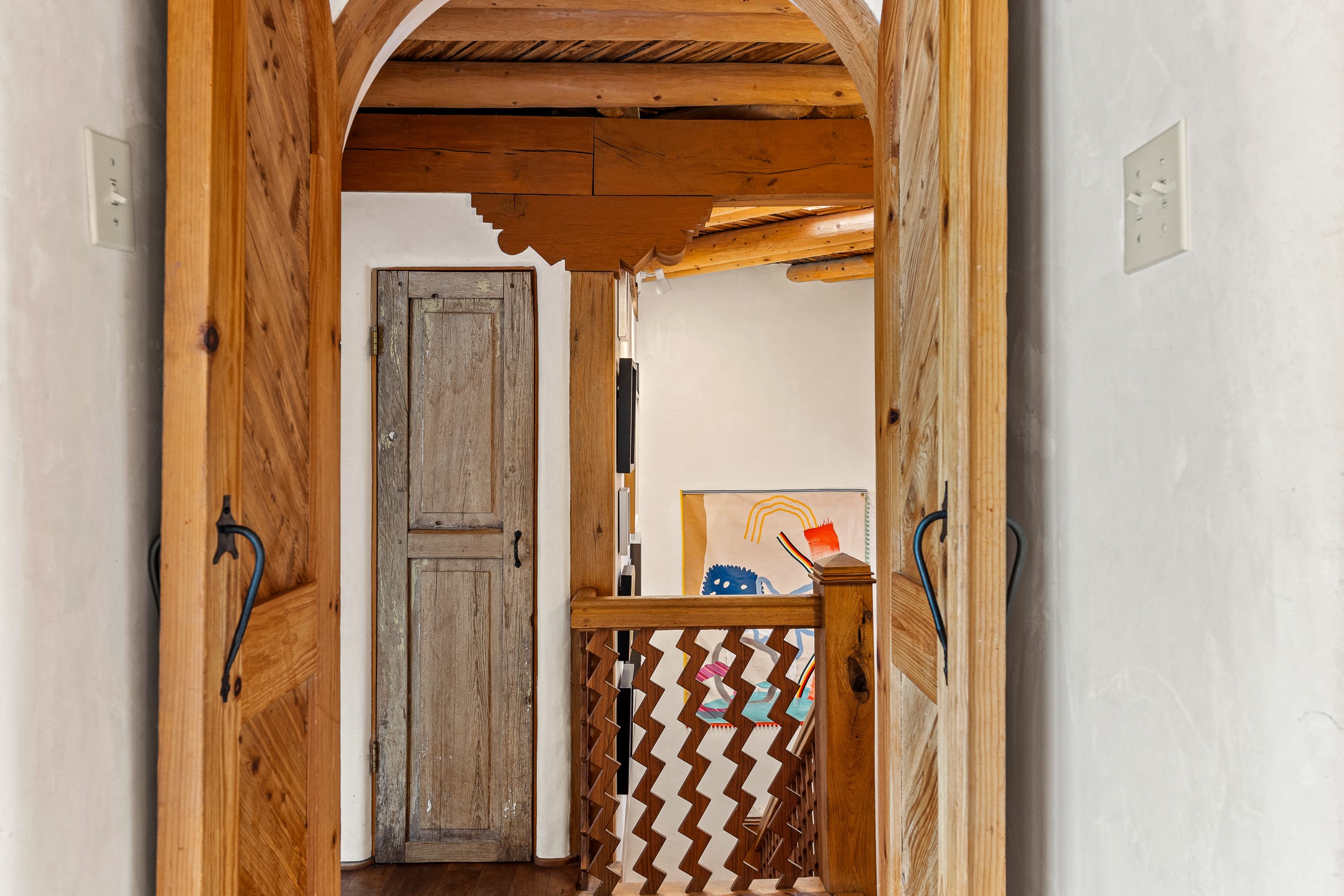 Location, location! A quick 8 minutes to Santa Fe Plaza and 5 minutes from the beloved Tesuque Village Market, this extraordinary 3,366 sq ft adobe sanctuary is nestled on .77 lush, tree-covered acre and adjacent to the seasonal Tesuque Creek. This 3 bdrm/3.5 bath residence blends soulful Santa Fe architecture built by notable local craftsmen, with regenerative land stewardship to support biodiversity. Flagstone floors, vigas, split cedar ceilings, and walls that transition organically from adobe to stone create a uniquely grounded and artistic living experience. The renovated kitchen features natural stone countertops and open dining area perfect for entertaining. Dining area opens to a covered portal with a natural gas firepit ideal for outdoor gatherings beneath the stars, rain or shine. There are two living areas: The original living room was designed for Japanese tea ceremony with glass wall that opens to views of the garden and creek side forest. The North living room features a dramatic fireplace, high ceilings, and connects to a serene ground-level primary suite with cedar lined closet, as well as a fenced garden area abundant with fruit trees and pollinator-friendly plants. The handcrafted staircase is built with no nails and leads to the upper level, where you'll find a guest suite and a second primary suite with a private deck and an infrared sauna - an immersive retreat in the treetops of Tesuque. Both have en suite bathrooms.Additional amenities include an automatic gated entry, labyrinth, private well with pristine water, EV charger, and a handcrafted workshop. There is so much more to say about this poetic property, but if you're seeking a Santa Fe home that honors nature, creativity, and intentional living, this eco-sanctuary in Tesuque is for you. Hiking access via arroyo from back yard and up the road .75 miles to the Lower Windsor Trailhead offer instant connection to the Sangre de Cristomountains and the coveted ecology of the Tesuque Valley.