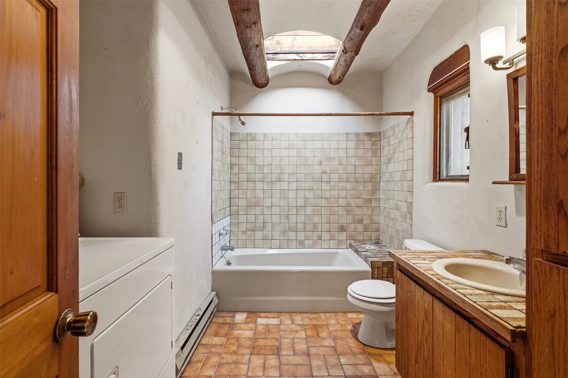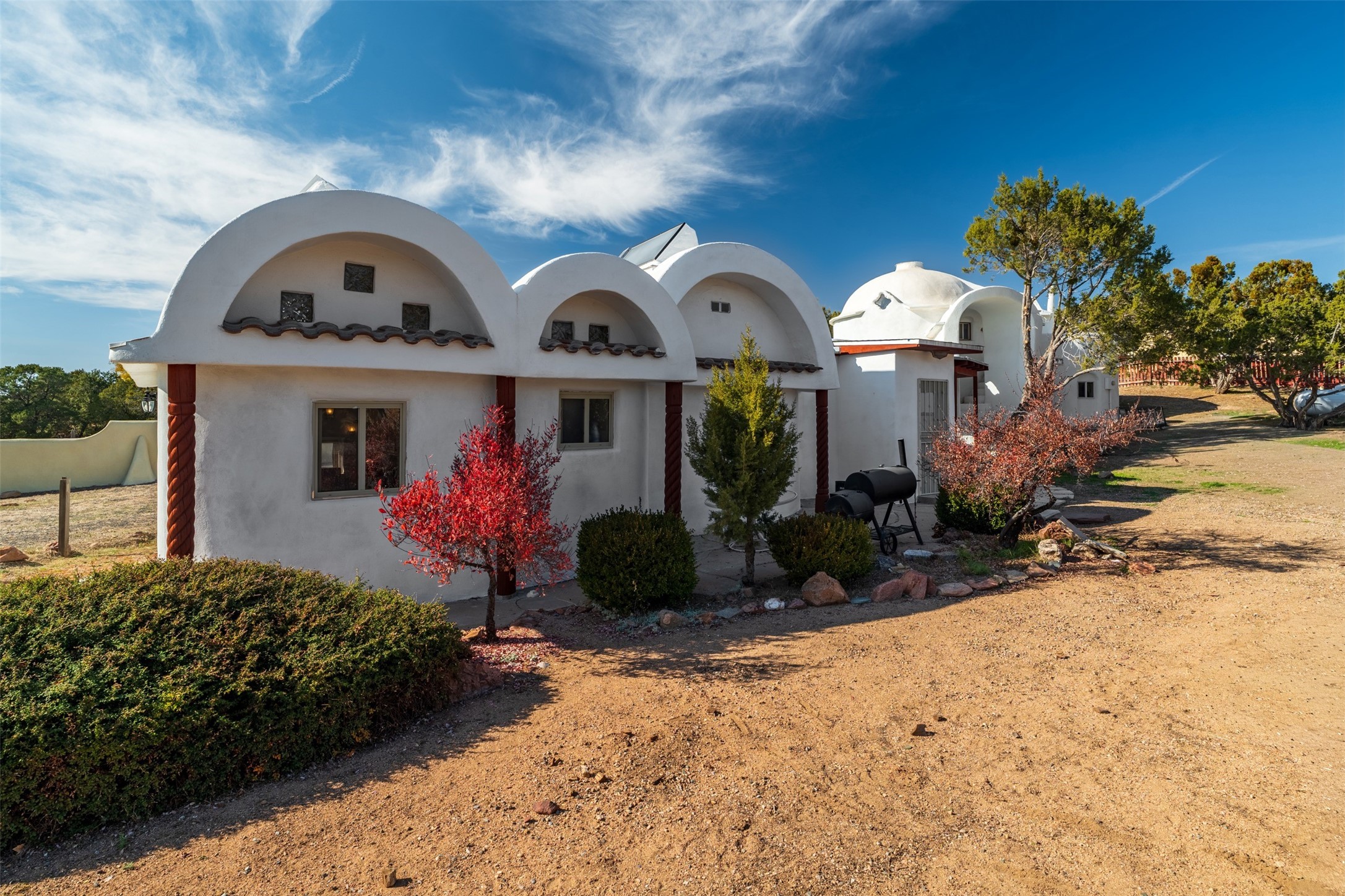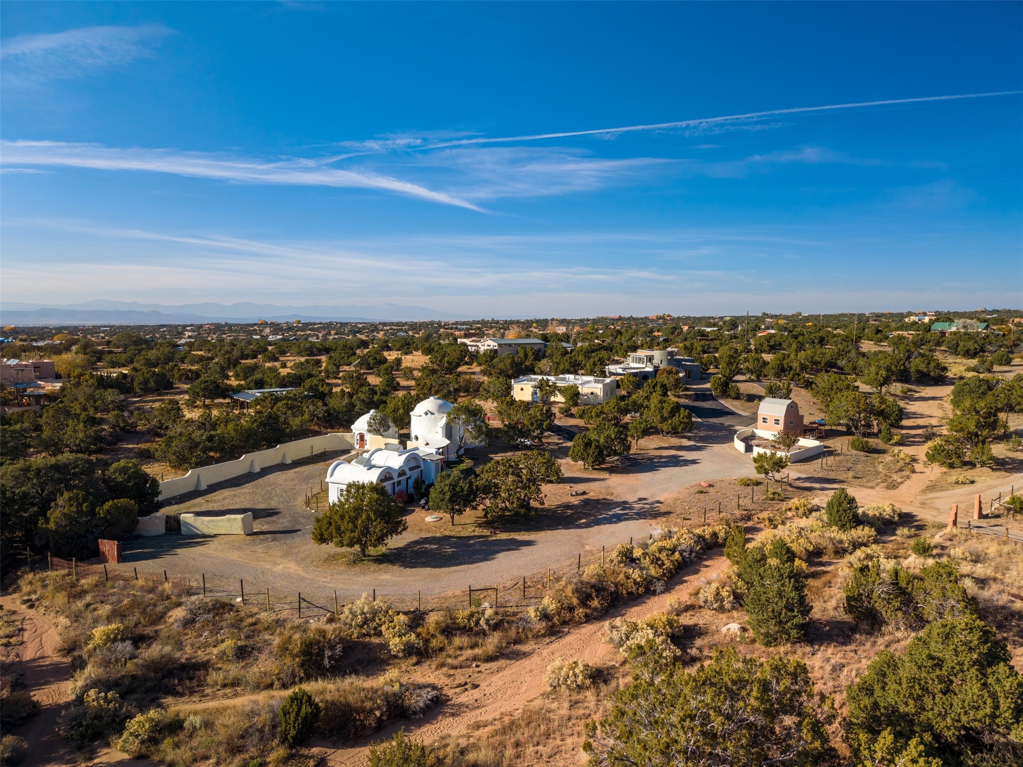 Spread across 3.8 acres, this Seton Village compound is a secluded retreat with one of a kind architectural details. Its unique character is accentuated by its beautiful location in a well-established neighborhood. This property can generously accommodate large families or groups of friends. Alternatively, it could serve as an investment asset with excellent potential for targeted updates and long-term development. The sprawling estate offers multiple structures for every possible activity. Each building is self-contained and thoughtfully located for privacy and ease of access. On the northern end of the property, the main home and adjacent guest house contain 6 bedrooms/5 baths and numerous living/gathering spaces. The second story of the main house provides panoramic views of the surrounding valley. Features include a kiva fireplace, wood stove, refinished flagstone and brick floors, handcarved vigas, coved ceilings, several mini-splits and multiple washers and dryers. Additionally, a finished basement provides ample space for storage. On the southern side of the property, three dome-roofed structures provide a distinct contrast. These Spanish/Moorish styled buildings can easily accommodate multiple guests or provide plentiful space for hobbies or projects. These buildings are currently configured with 1 bedroom and 3 baths. Finally, a small but picturesque converted well house is a blank slate, allowing for further opportunities. The property's infrastructure is well-maintained with updated roofing and stucco, along with a private well, two septic systems, and abundant parking. The landscaping is a lovely balance of open spaces interspersed between native plants and grassy areas. This 6400 square foot compound offers an unparalleled opportunity to easily invest or put down roots in a sought-after area.