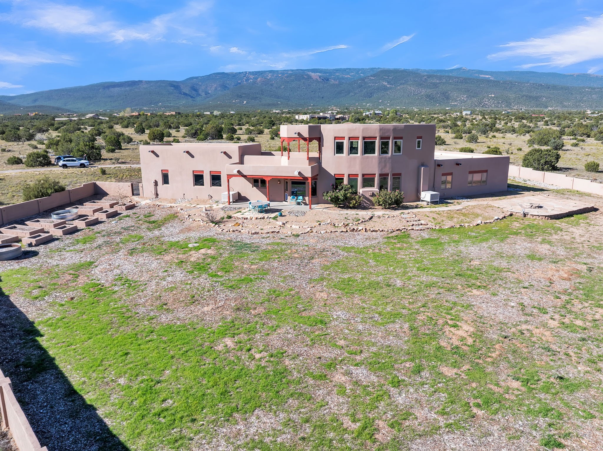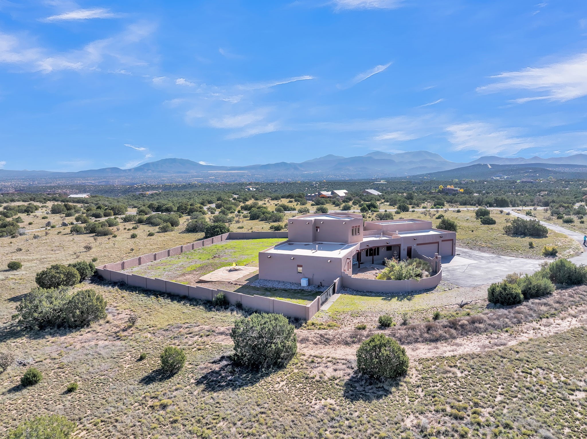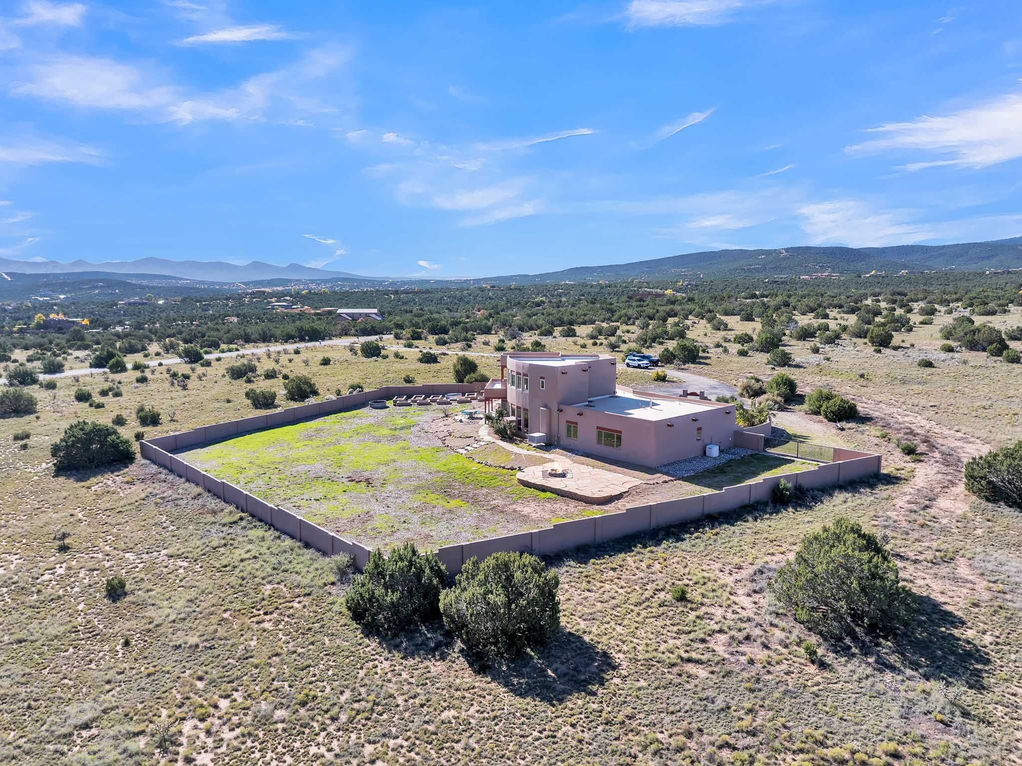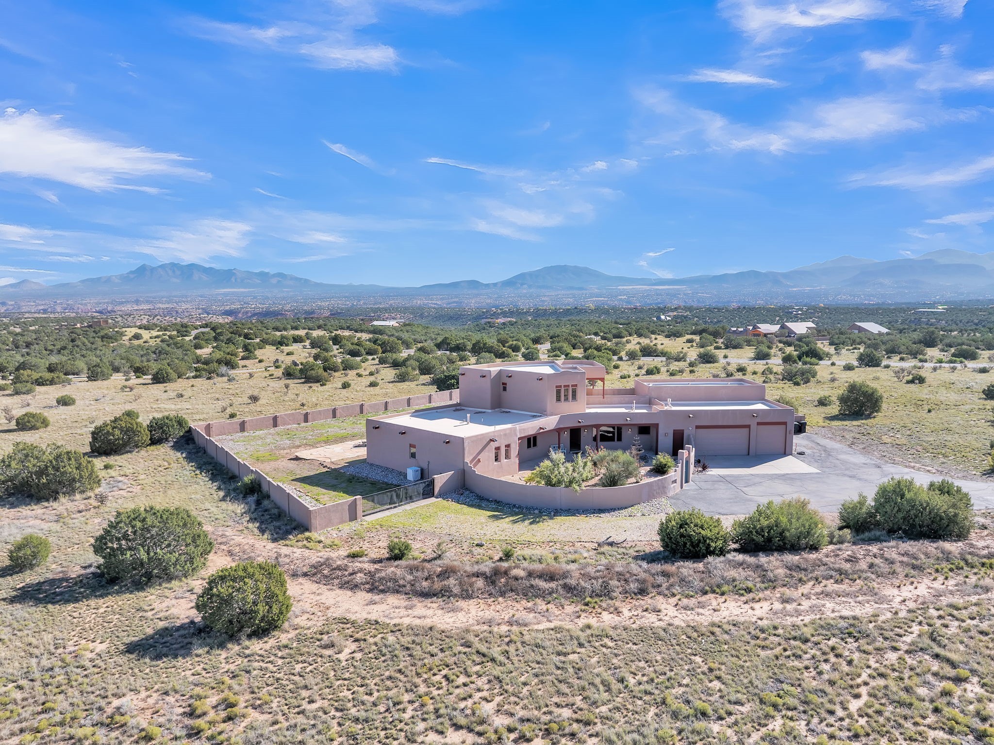 Welcome to 5 La Aguapa, Sandia Park, NM Experience luxury rural living in San Pedro Creek Estates! This custom 4,000+ sq ft home on 10.57 acres offers breathtaking views of five mountain ranges. Featuring 4 bedrooms, 4 baths, and two primary suites, this home combines comfort and elegance. The great room with soaring ceilings, a gas log fireplace, and panoramic views. The gourmet kitchen includes granite countertops, a built-in gas stove, pantry, and access to a workshop and three-car garage. Enjoy radiant heat, travertine tile flooring, a large utility room, and a walled backyard with access to Golden Open Space Los Duendes Trail. This is luxury rural living within reach.Situated on 10.57 acres in the prestigious San Pedro Creek Estates, this impressive 4,000+ square foot home offers refined comfort, privacy, and spectacular views of five separate mountain ranges. Featuring 4 bedroomsincluding two primary suites and 4 bathrooms, this thoughtfully designed home blends elegance with everyday functionality. The spacious great room showcases a gas log fireplace and sweeping views for miles, creating a warm and inviting central gathering space. The downstairs primary suite features a large walk-in closet and a generously sized bathroom, while the upstairs primary suite includes a private balcony the perfect spot to take in the serene landscape. Enjoy cooking in the large kitchen, complete with granite countertops, a built-in gas stove, ample cabinetry, a nice-sized pantry, and access to a spacious workshop and three-car garage perfect for hobbies, projects, or extra storage. The home is equipped with efficient radiant heat and features travertine tile throughout the downstairs, adding both beauty and functionality. A spacious utility room includes a sink and plenty of storage. Outside, you'll find a large walled-in backyard, ideal for relaxing, entertaining, or pets. The property also includes private gate access (key fob provided) to the Golden Open Space Los Duendes Trail, offering opportunities for hiking, biking, and horseback riding. Ideally located, this home is just 32 miles from Albuquerque, offering all the amenities of city living, 21 miles from Madrid, known for its artistic charm, and 50 miles from Santa Fe, celebrated for its rich culture and dining.POVEvery window frames a different view five mountain ranges that change colors with the seasons. It's peaceful, quiet, and filled with natural light. Mornings start with coffee on the balcony, and evenings end by the fire watching the sunset roll across the hills. There's room to breathe, create, and enjoy life at a slower pace yet you're still close enough to everything you need. It's truly the best of both worlds.