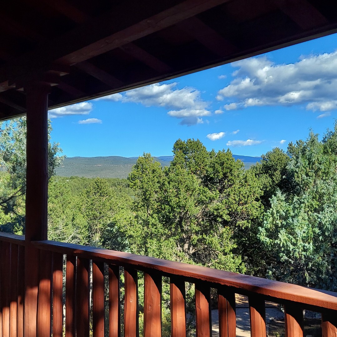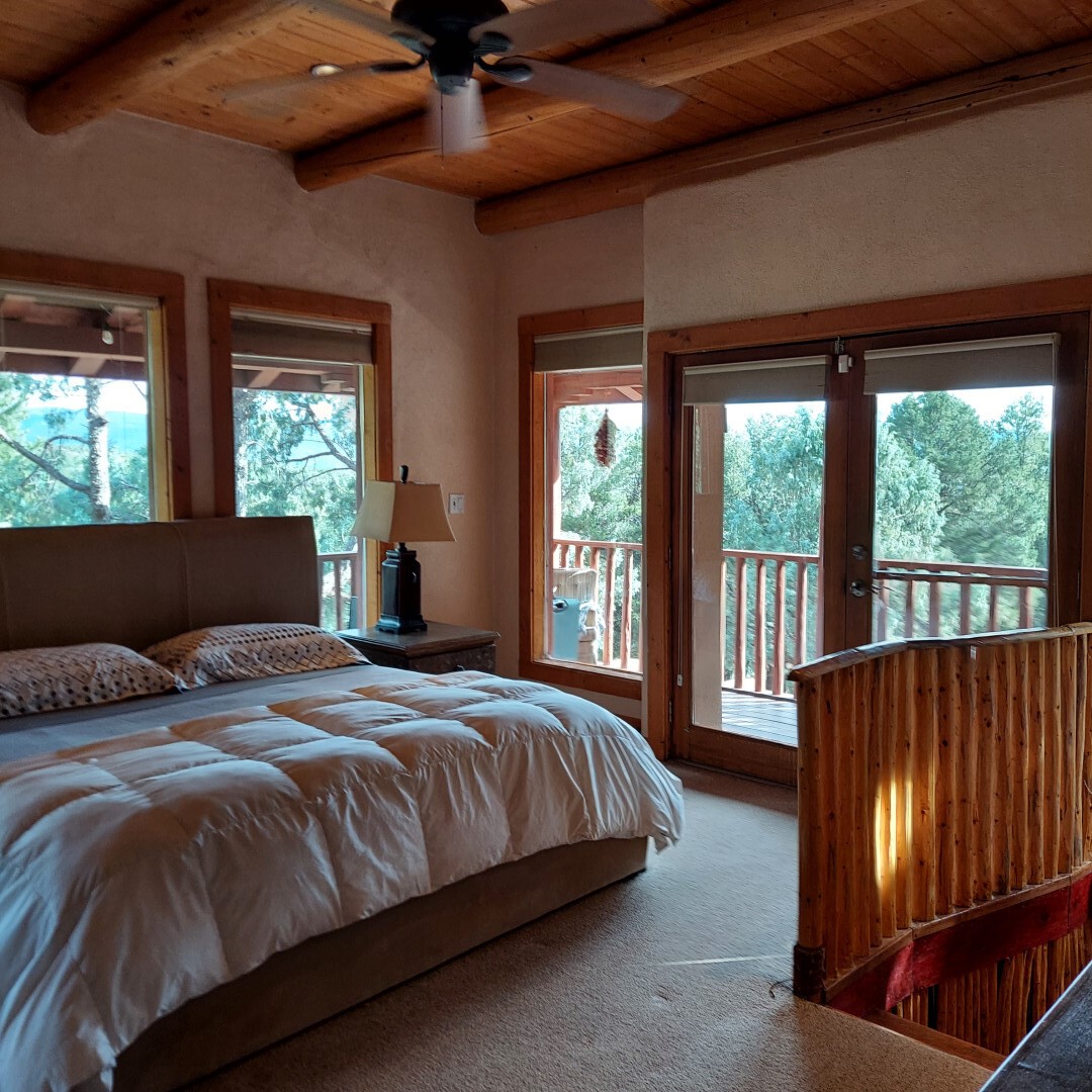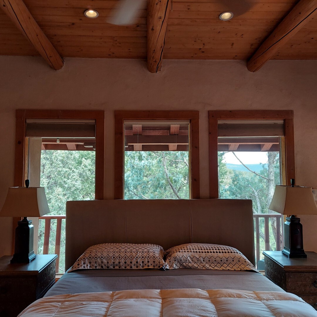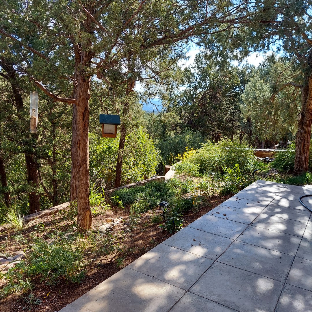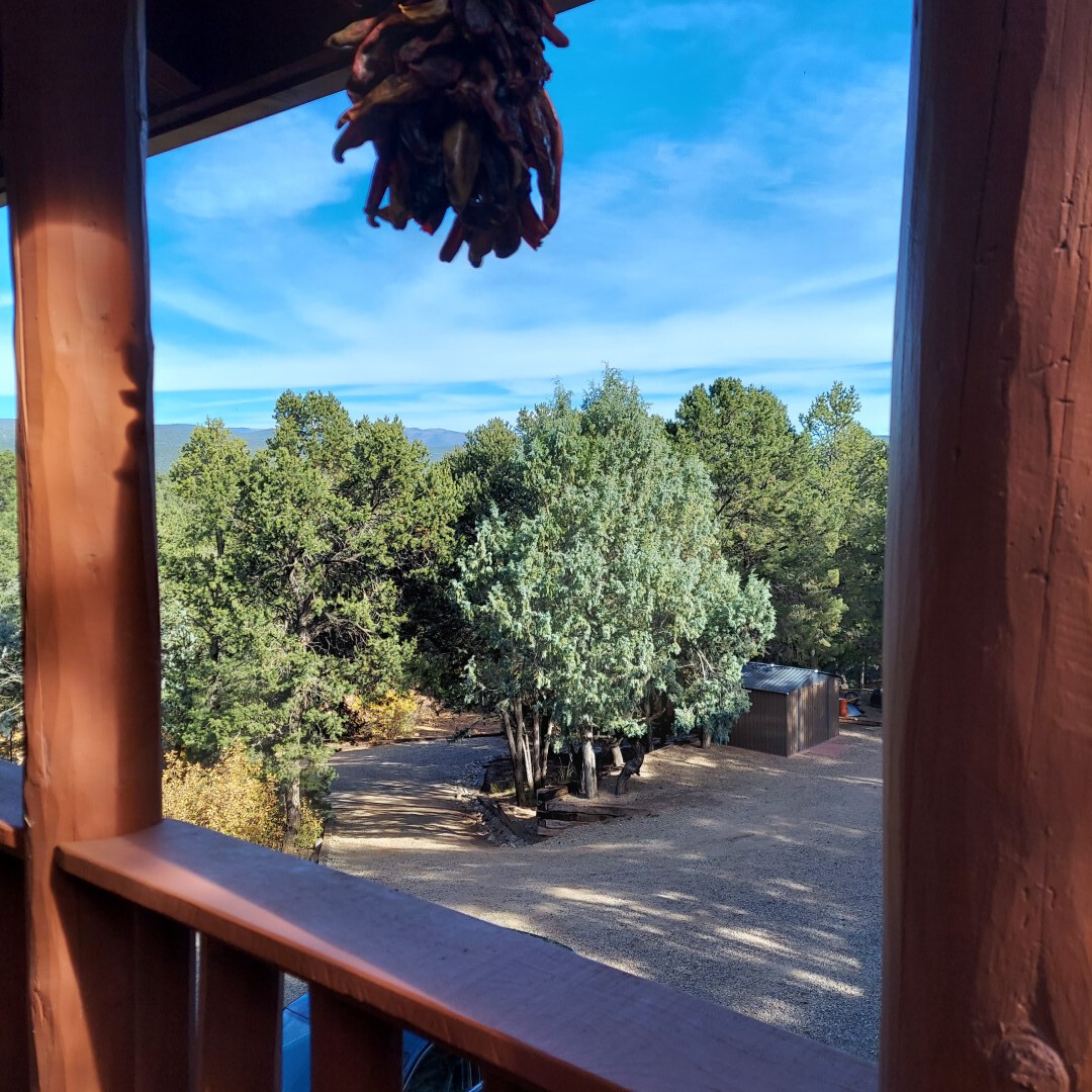 This stunning mission-style home is graced with incredible forest & mountain views along with close proximity to Santa Fe, & the Pecos Wilderness area recreation. The two bedrooms, two bathrooms, den/library, & two living room areas contribute to the spacious interior area of nearly 2,300 sq. ft. The beautiful exterior features multiple patios & gardens, all with drip systems, stone walls, & a mountainside terraced garden complete with solar lighting. Homeowners have made ongoing upgrades to this property during their 13 years here. During the past four years alone, the following enhancements have been made at a cost exceeding $120,000: Kitchen remodeling with GE Cafe appliances, soft-close doors with manypull-outs, a ventless, black glass range hood, recessed & pendant lighting, & white cabinets accented with Salt Cedar twigs; Primary bathroom remodeling with new lighting, custom Mexican tile work throughout, new enlarged window, upgraded fixtures, & custom shower; New (2023) Propanel roof; Two heat/AC pumps; His/hers shoe cabinets in the walk-in primary closet; Latilla privacy fencing around the back yard & coyote fencing around the new side yard patio; Demolition of former 2nd story deck; The wraparound deck was redesigned & rebuilt with maintenance-free composite wood flooring. A roof was added, & a custom gate & bridge now connect the deck to the mountainside for easy access to the Pinon Ridge neighborhood hiking trails. This two-story property sits on a generous forested 1.25 acres providing beauty & privacy. Two outdoor stairways give access to the large lower yard & raised bed garden. An 8' x 10' shed is newly installed. River rock streams divert monsoon rains away from the house & driveway & enhance the lovely landscaping. Every window & door features dual-cellular top-down, bottom-up energy efficient blinds. Only 20 minutes to Santa Fe, this exquisite home provides peace, charm, & convenience in a splendid setting. 2.25% assumable VA loan