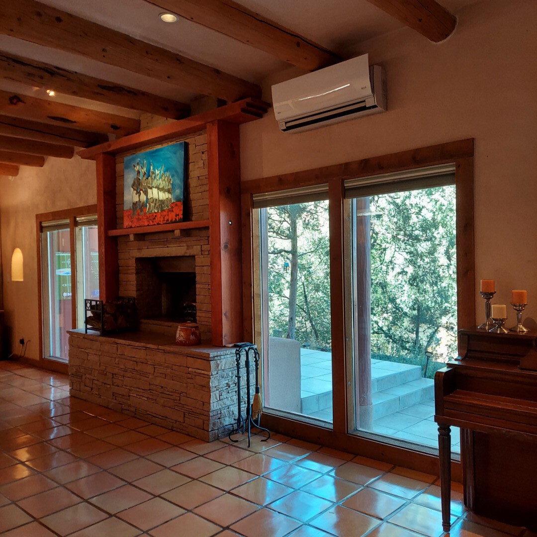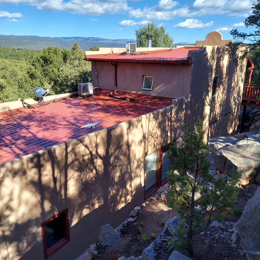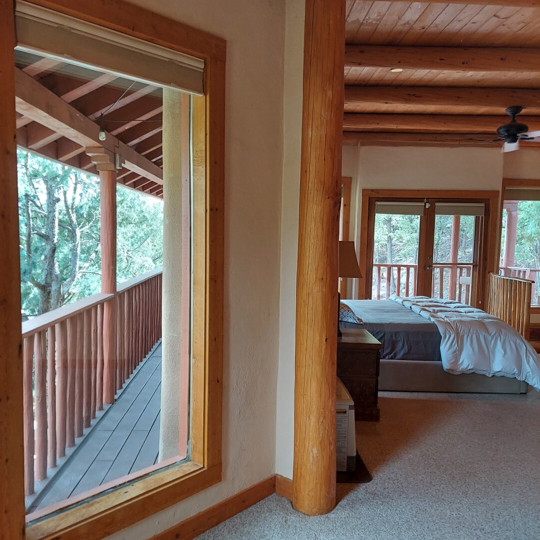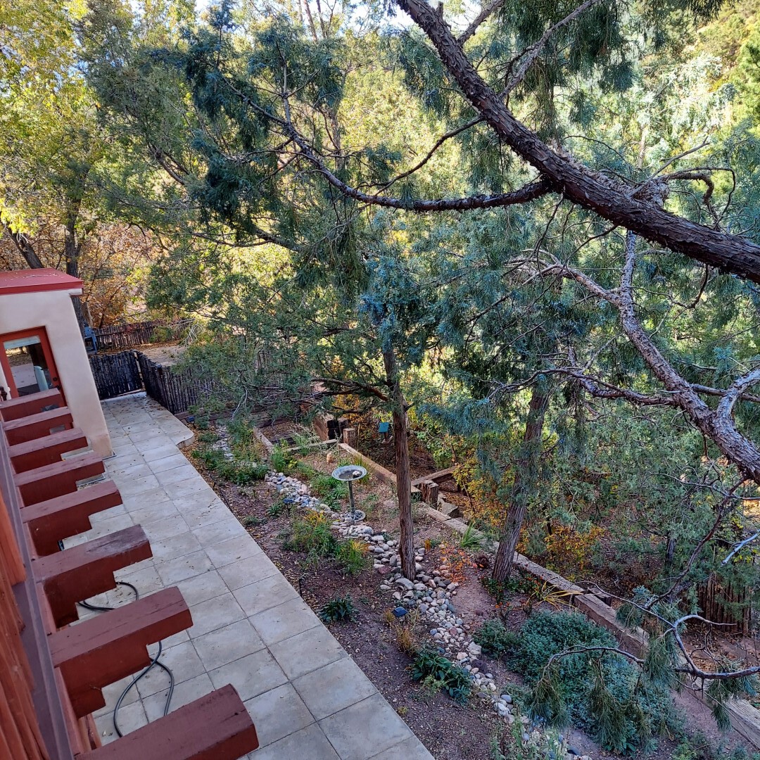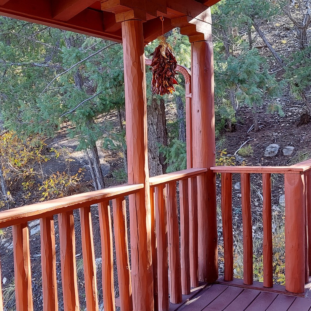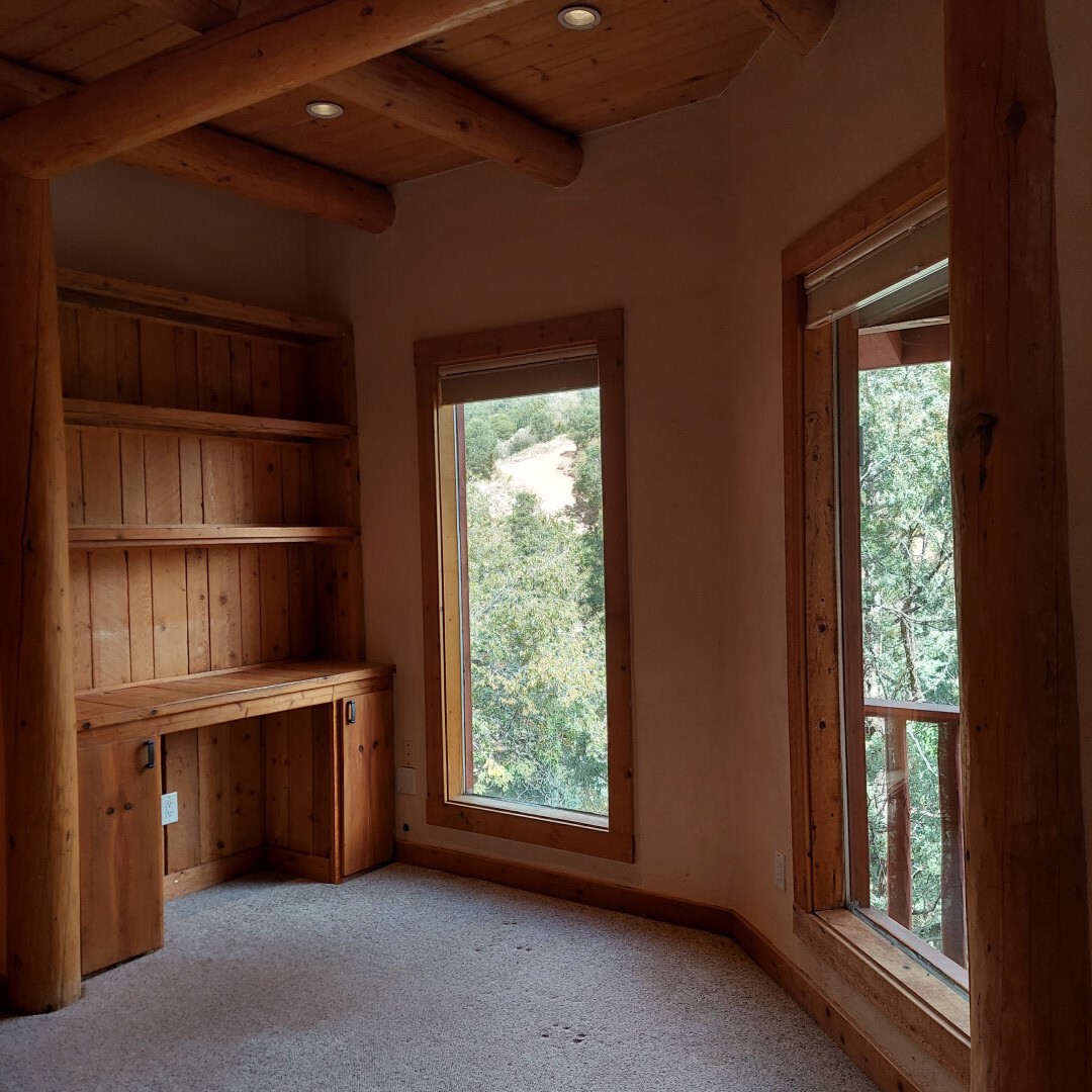 This stunning mission-style home is graced with incredible forest & mountain views along with close proximity to Santa Fe, & the Pecos Wilderness area recreation. The two bedrooms, two bathrooms, den/library, & two living room areas contribute to the spacious interior area of nearly 2,300 sq. ft. The beautiful exterior features multiple patios & gardens, all with drip systems, stone walls, & a mountainside terraced garden complete with solar lighting. Homeowners have made ongoing upgrades to this property during their 13 years here. During the past four years alone, the following enhancements have been made at a cost exceeding $120,000: Kitchen remodeling with GE Cafe appliances, soft-close doors with manypull-outs, a ventless, black glass range hood, recessed & pendant lighting, & white cabinets accented with Salt Cedar twigs; Primary bathroom remodeling with new lighting, custom Mexican tile work throughout, new enlarged window, upgraded fixtures, & custom shower; New (2023) Propanel roof; Two heat/AC pumps; His/hers shoe cabinets in the walk-in primary closet; Latilla privacy fencing around the back yard & coyote fencing around the new side yard patio; Demolition of former 2nd story deck; The wraparound deck was redesigned & rebuilt with maintenance-free composite wood flooring. A roof was added, & a custom gate & bridge now connect the deck to the mountainside for easy access to the Pinon Ridge neighborhood hiking trails. This two-story property sits on a generous forested 1.25 acres providing beauty & privacy. Two outdoor stairways give access to the large lower yard & raised bed garden. An 8' x 10' shed is newly installed. River rock streams divert monsoon rains away from the house & driveway & enhance the lovely landscaping. Every window & door features dual-cellular top-down, bottom-up energy efficient blinds. Only 20 minutes to Santa Fe, this exquisite home provides peace, charm, & convenience in a splendid setting. 2.25% assumable VA loan