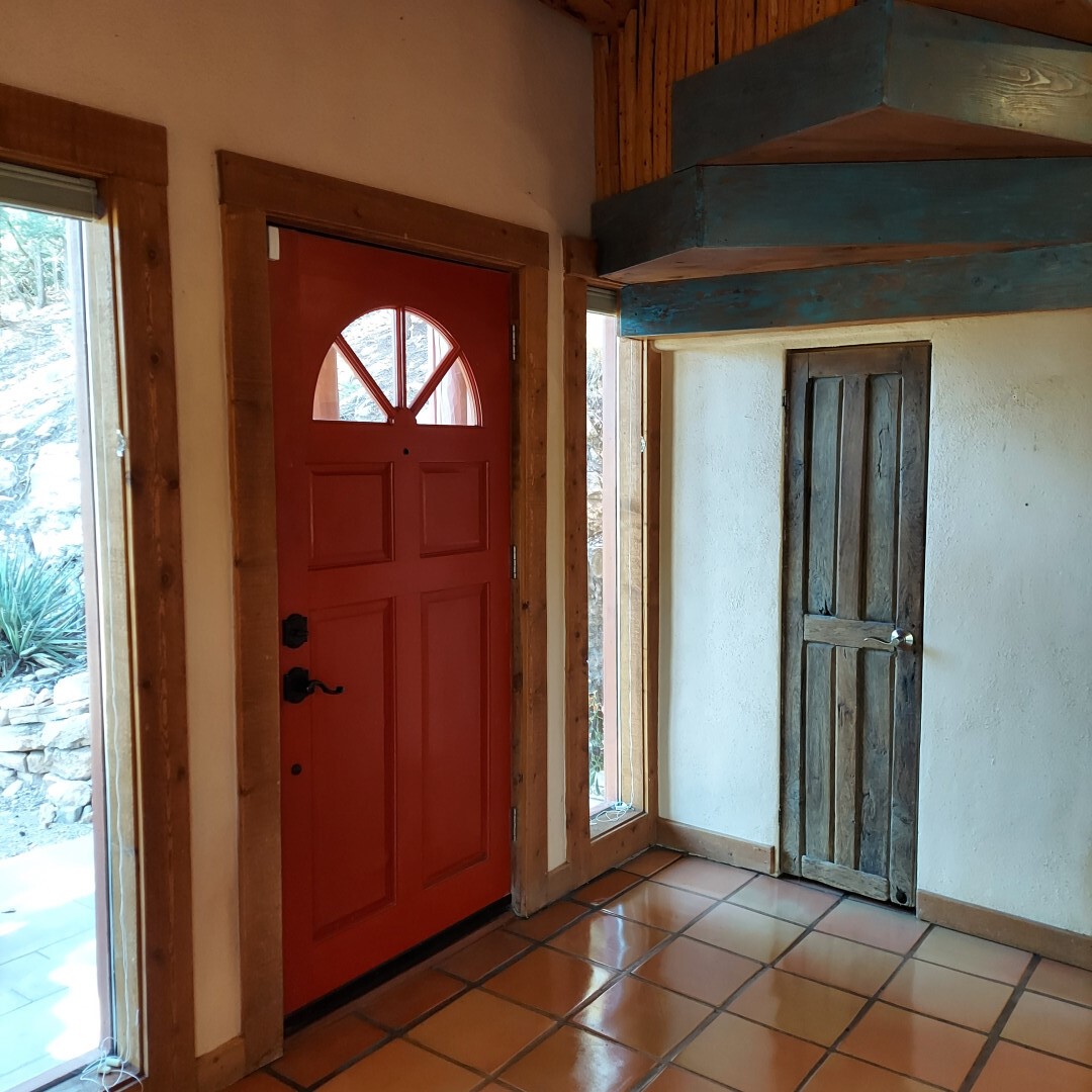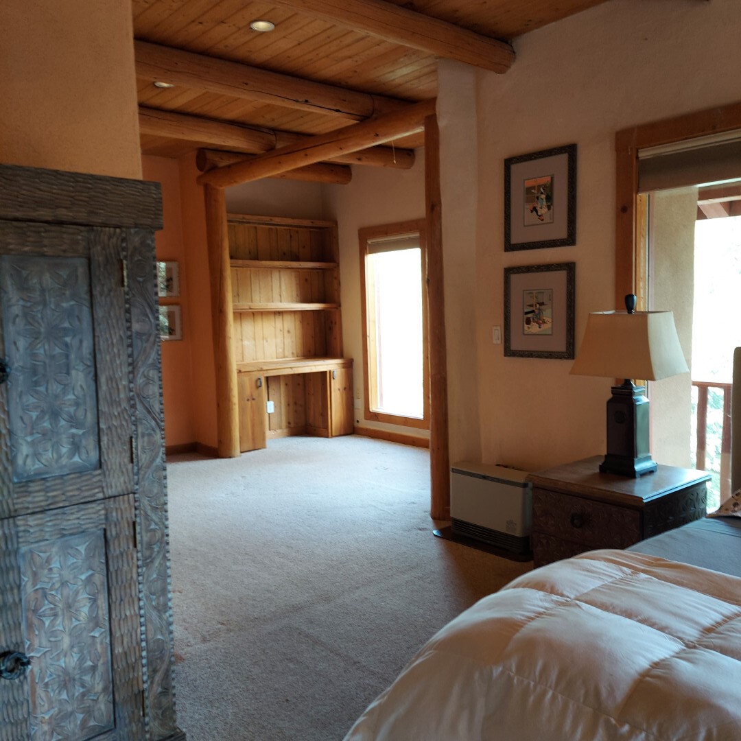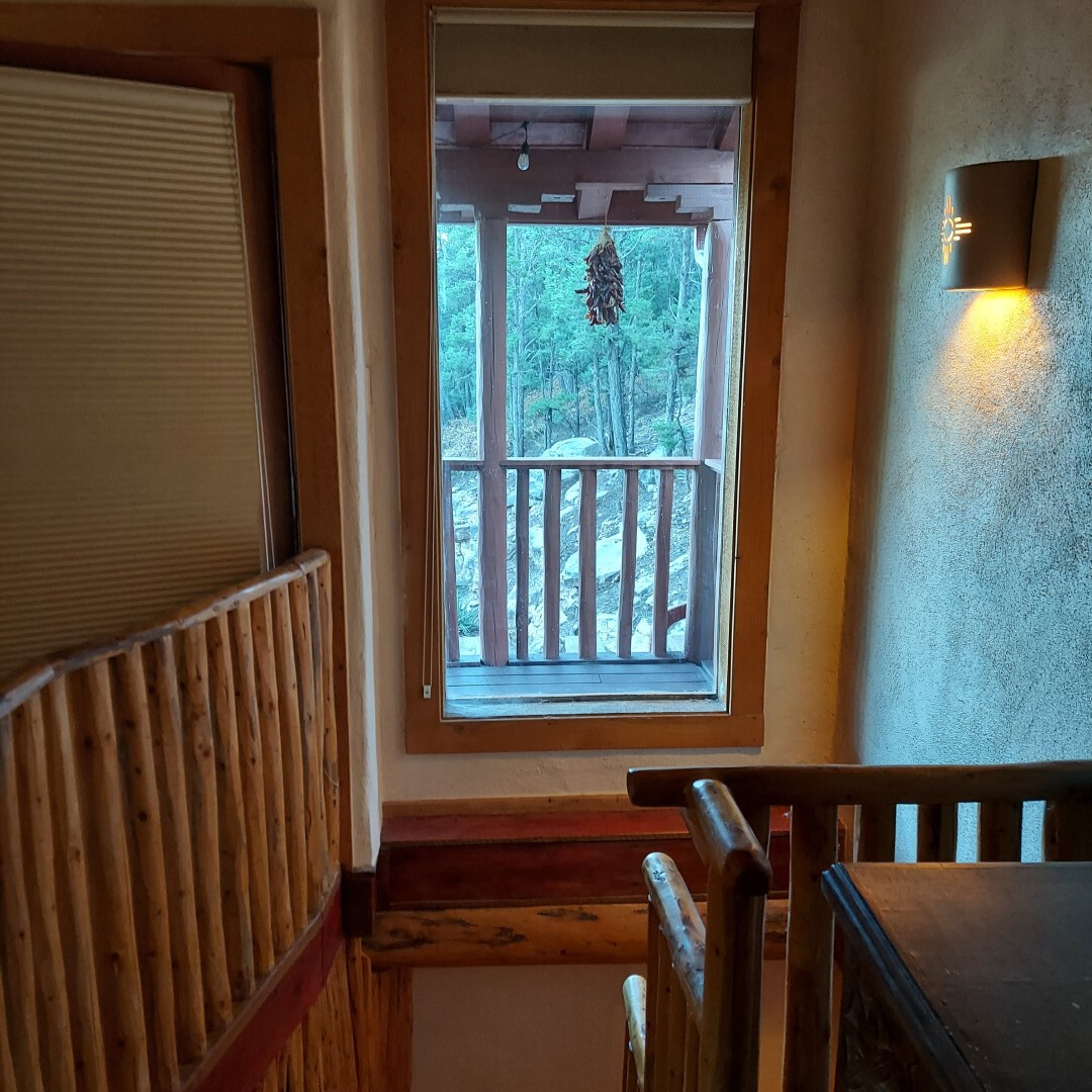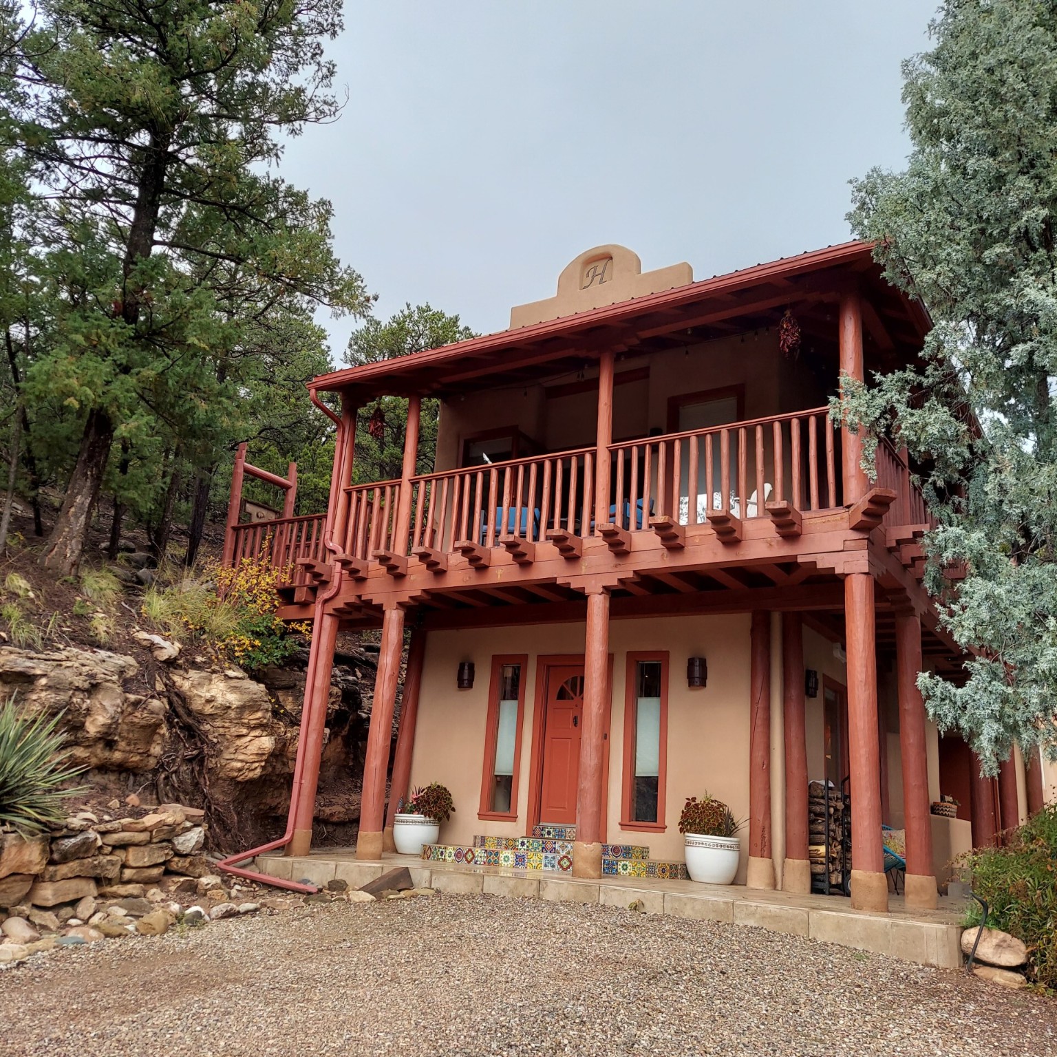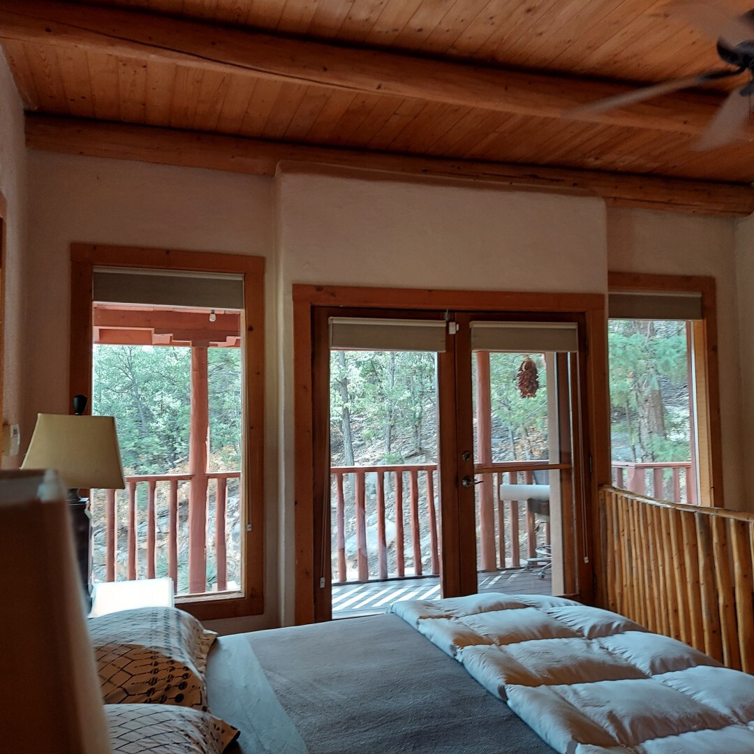 This stunning mission-style home is graced with incredible forest & mountain views along with close proximity to Santa Fe, & the Pecos Wilderness area recreation. The two bedrooms, two bathrooms, den/library, & two living room areas contribute to the spacious interior area of nearly 2,300 sq. ft. The beautiful exterior features multiple patios & gardens, all with drip systems, stone walls, & a mountainside terraced garden complete with solar lighting. Homeowners have made ongoing upgrades to this property during their 13 years here. During the past four years alone, the following enhancements have been made at a cost exceeding $120,000: Kitchen remodeling with GE Cafe appliances, soft-close doors with manypull-outs, a ventless, black glass range hood, recessed & pendant lighting, & white cabinets accented with Salt Cedar twigs; Primary bathroom remodeling with new lighting, custom Mexican tile work throughout, new enlarged window, upgraded fixtures, & custom shower; New (2023) Propanel roof; Two heat/AC pumps; His/hers shoe cabinets in the walk-in primary closet; Latilla privacy fencing around the back yard & coyote fencing around the new side yard patio; Demolition of former 2nd story deck; The wraparound deck was redesigned & rebuilt with maintenance-free composite wood flooring. A roof was added, & a custom gate & bridge now connect the deck to the mountainside for easy access to the Pinon Ridge neighborhood hiking trails. This two-story property sits on a generous forested 1.25 acres providing beauty & privacy. Two outdoor stairways give access to the large lower yard & raised bed garden. An 8' x 10' shed is newly installed. River rock streams divert monsoon rains away from the house & driveway & enhance the lovely landscaping. Every window & door features dual-cellular top-down, bottom-up energy efficient blinds. Only 20 minutes to Santa Fe, this exquisite home provides peace, charm, & convenience in a splendid setting. 2.25% assumable VA loan