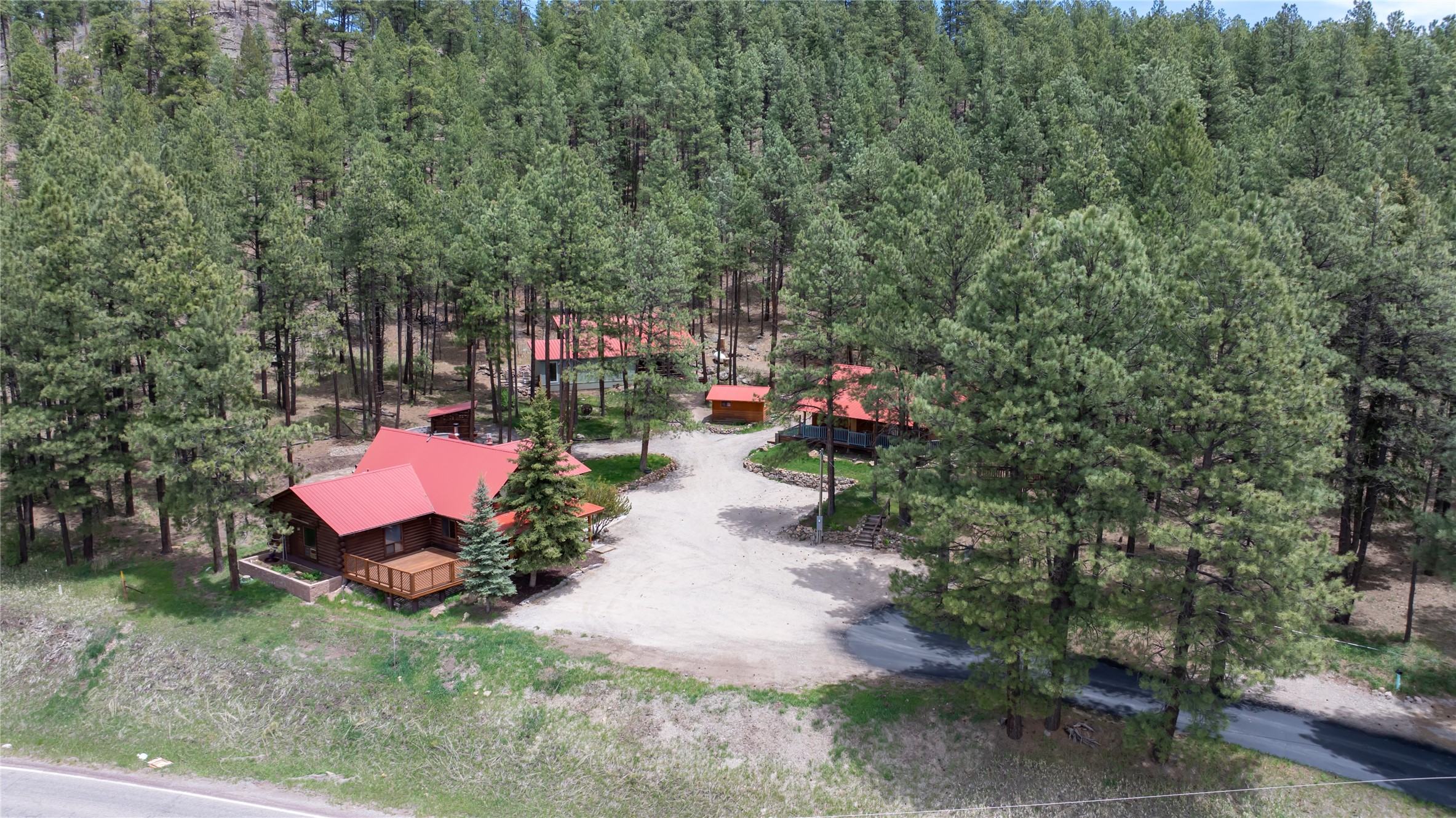 Situated on 3.08 acres encompassing two lots, this former Bed and Breakfast offers endless potential as a home or business venture. The main house has 1868 sq feet of lovely living space with an open-concept great room that showcases beautiful flagstone floors, natural log walls, knotty-pine ceilings and a wall of windows framing the breathtaking views of the Jemez Mountains. The two additional cabins provide potential business opportunities, studio workspaces or a family retreat. The 16X20 garage provides ample space for vehicles and storage. The property borders Santa Fe National Forest, where you can enjoy the Hot Springs, Valles Caldera, Bandelier, Hiking, Skiing and Mountain Biking. Only 45 minutes to Los Alamos, 1.5 hours to Albuquerque and 1.25 hours to Santa Fe.